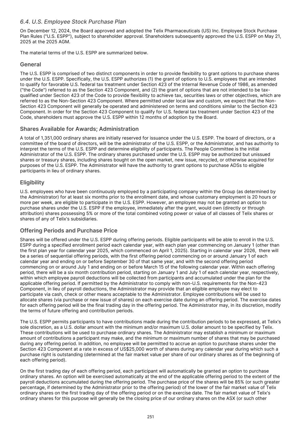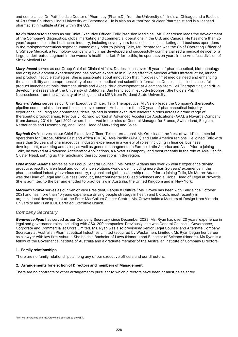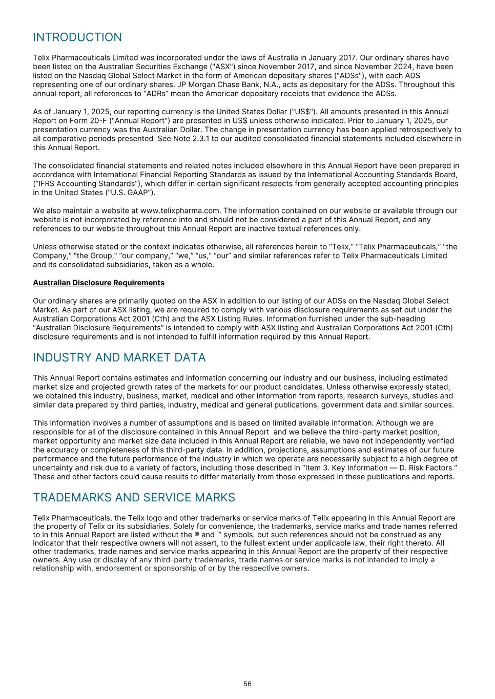 INTRODUCTION Telix Pharmaceuticals Limited was incorporated under the laws of Australia in January 2017. Our ordinary shares have been listed on the Australian Securities Exchange ("ASX") since November 2017, and since November 2024, have been listed on the Nasdaq Global Select Market in the form of American depositary shares ("ADSs"), with each ADS representing one of our ordinary shares. JP Morgan Chase Bank, N.A., acts as depositary for the ADSs. Throughout this annual report, all references to “ADRs” mean the American depositary receipts that evidence the ADSs. As of January 1, 2025, our reporting currency is the United States Dollar ("US$"). All amounts presented in this Annual Report on Form 20-F ("Annual Report") are presented in US$ unless otherwise indicated. Prior to January 1, 2025, our presentation currency was the Australian Dollar. The change in presentation currency has been applied retrospectively to all comparative periods presented See Note 2.3.1 to our audited consolidated financial statements included elsewhere in this Annual Report. The consolidated financial statements and related notes included elsewhere in this Annual Report have been prepared in accordance with International Financial Reporting Standards as issued by the International Accounting Standards Board, (“IFRS Accounting Standards”), which differ in certain significant respects from generally accepted accounting principles in the United States ("U.S. GAAP"). We also maintain a website at www.telixpharma.com. The information contained on our website or available through our website is not incorporated by reference into and should not be considered a part of this Annual Report, and any references to our website throughout this Annual Report are inactive textual references only. Unless otherwise stated or the context indicates otherwise, all references herein to “Telix,” “Telix Pharmaceuticals,” "the Company,” "the Group," “our company,” “we,” “us,” “our” and similar references refer to Telix Pharmaceuticals Limited and its consolidated subsidiaries, taken as a whole. Australian Disclosure Requirements Our ordinary shares are primarily quoted on the ASX in addition to our listing of our ADSs on the Nasdaq Global Select Market. As part of our ASX listing, we are required to comply with various disclosure requirements as set out under the Australian Corporations Act 2001 (Cth) and the ASX Listing Rules. Information furnished under the sub-heading “Australian Disclosure Requirements” is intended to comply with ASX listing and Australian Corporations Act 2001 (Cth) disclosure requirements and is not intended to fulfill information required by this Annual Report. INDUSTRY AND MARKET DATA This Annual Report contains estimates and information concerning our industry and our business, including estimated market size and projected growth rates of the markets for our product candidates. Unless otherwise expressly stated, we obtained this industry, business, market, medical and other information from reports, research surveys, studies and similar data prepared by third parties, industry, medical and general publications, government data and similar sources. This information involves a number of assumptions and is based on limited available information. Although we are responsible for all of the disclosure contained in this Annual Report and we believe the third-party market position, market opportunity and market size data included in this Annual Report are reliable, we have not independently verified the accuracy or completeness of this third-party data. In addition, projections, assumptions and estimates of our future performance and the future performance of the industry in which we operate are necessarily subject to a high degree of uncertainty and risk due to a variety of factors, including those described in “Item 3. Key Information — D. Risk Factors.” These and other factors could cause results to differ materially from those expressed in these publications and reports. TRADEMARKS AND SERVICE MARKS Telix Pharmaceuticals, the Telix logo and other trademarks or service marks of Telix appearing in this Annual Report are the property of Telix or its subsidiaries. Solely for convenience, the trademarks, service marks and trade names referred to in this Annual Report are listed without the ® and ™ symbols, but such references should not be construed as any indicator that their respective owners will not assert, to the fullest extent under applicable law, their right thereto. All other trademarks, trade names and service marks appearing in this Annual Report are the property of their respective owners. Any use or display of any third-party trademarks, trade names or service marks is not intended to imply a relationship with, endorsement or sponsorship of or by the respective owners. 56