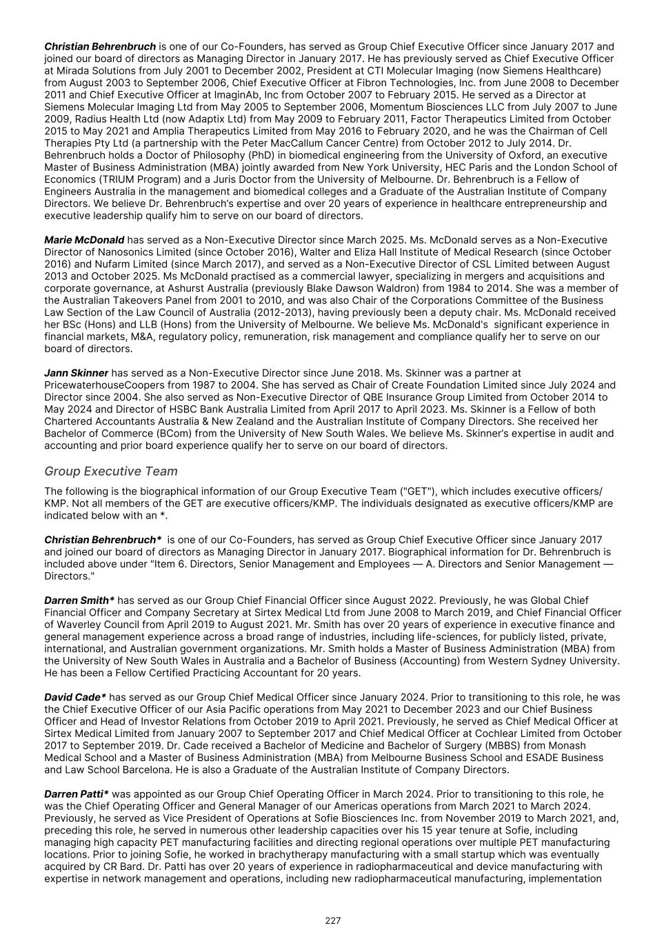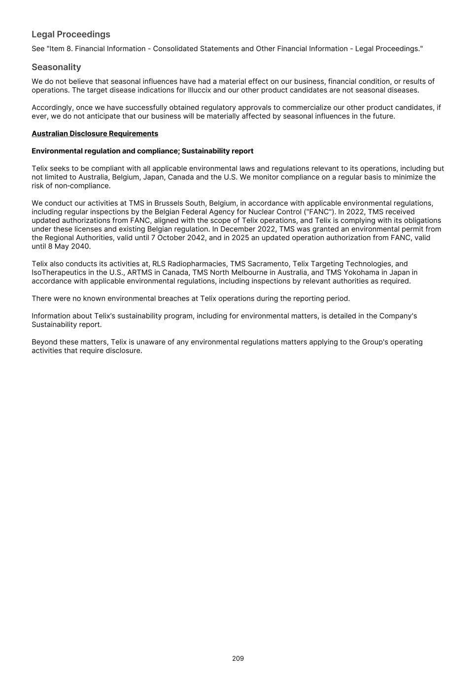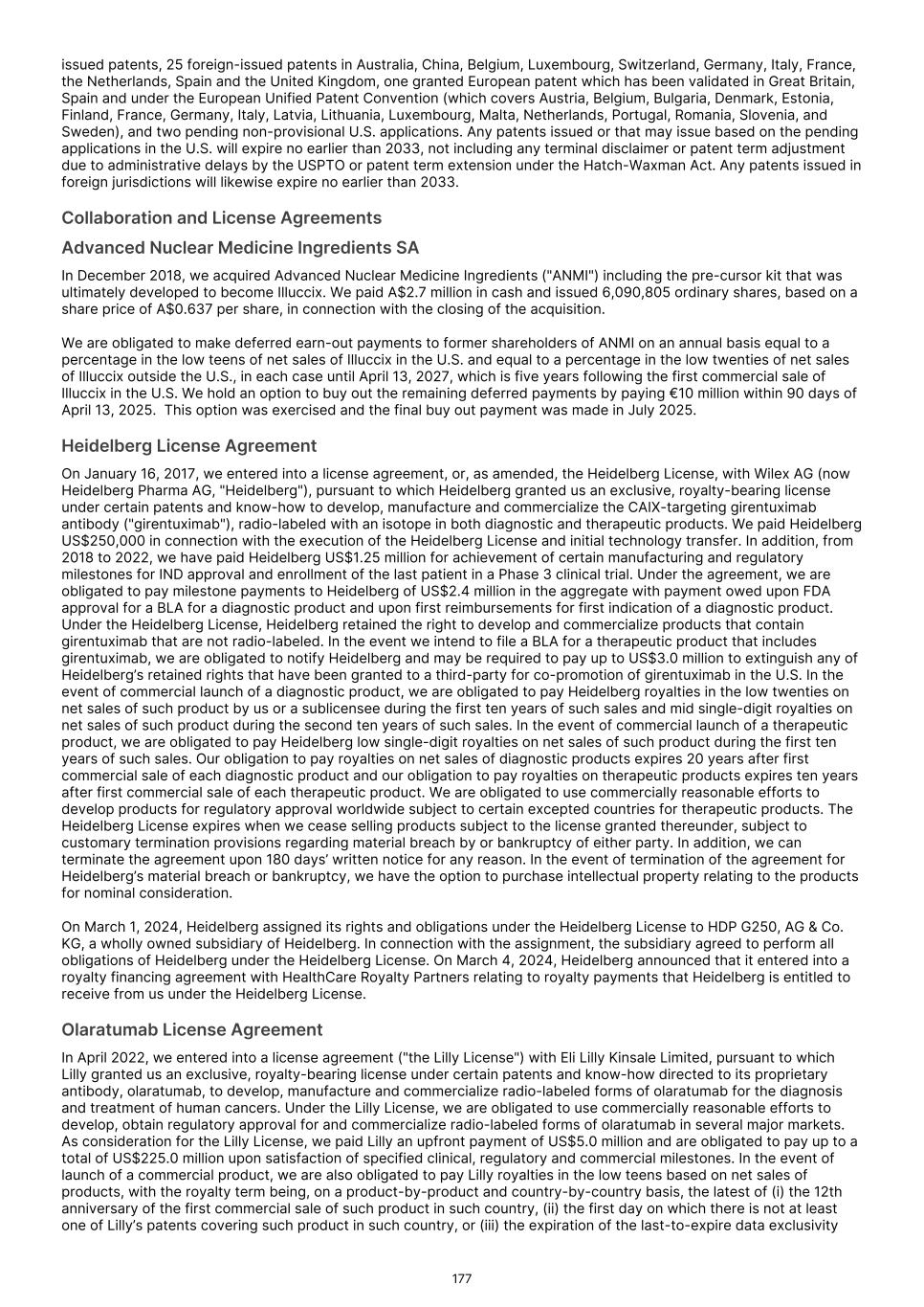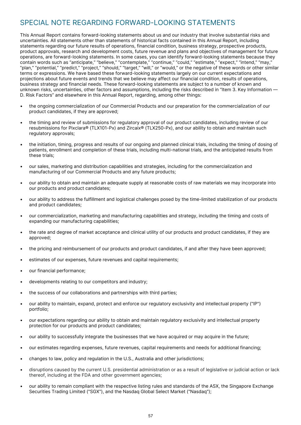 SPECIAL NOTE REGARDING FORWARD-LOOKING STATEMENTS This Annual Report contains forward-looking statements about us and our industry that involve substantial risks and uncertainties. All statements other than statements of historical facts contained in this Annual Report, including statements regarding our future results of operations, financial condition, business strategy, prospective products, product approvals, research and development costs, future revenue and plans and objectives of management for future operations, are forward-looking statements. In some cases, you can identify forward-looking statements because they contain words such as “anticipate,” “believe,” “contemplate,” “continue,” “could,” “estimate,” “expect,” “intend,” “may,” “plan,” “potential,” “predict,” “project,” “should,” “target,” “will,” or “would,” or the negative of these words or other similar terms or expressions. We have based these forward-looking statements largely on our current expectations and projections about future events and trends that we believe may affect our financial condition, results of operations, business strategy and financial needs. These forward-looking statements are subject to a number of known and unknown risks, uncertainties, other factors and assumptions, including the risks described in “Item 3. Key Information — D. Risk Factors” and elsewhere in this Annual Report, regarding, among other things: • the ongoing commercialization of our Commercial Products and our preparation for the commercialization of our product candidates, if they are approved; • the timing and review of submissions for regulatory approval of our product candidates, including review of our resubmissions for Pixclara® (TLX101-Px) and Zircaix® (TLX250-Px), and our ability to obtain and maintain such regulatory approvals; • the initiation, timing, progress and results of our ongoing and planned clinical trials, including the timing of dosing of patients, enrollment and completion of these trials, including multi-national trials, and the anticipated results from these trials; • our sales, marketing and distribution capabilities and strategies, including for the commercialization and manufacturing of our Commercial Products and any future products; • our ability to obtain and maintain an adequate supply at reasonable costs of raw materials we may incorporate into our products and product candidates; • our ability to address the fulfillment and logistical challenges posed by the time-limited stabilization of our products and product candidates; • our commercialization, marketing and manufacturing capabilities and strategy, including the timing and costs of expanding our manufacturing capabilities; • the rate and degree of market acceptance and clinical utility of our products and product candidates, if they are approved; • the pricing and reimbursement of our products and product candidates, if and after they have been approved; • estimates of our expenses, future revenues and capital requirements; • our financial performance; • developments relating to our competitors and industry; • the success of our collaborations and partnerships with third parties; • our ability to maintain, expand, protect and enforce our regulatory exclusivity and intellectual property ("IP") portfolio; • our expectations regarding our ability to obtain and maintain regulatory exclusivity and intellectual property protection for our products and product candidates; • our ability to successfully integrate the businesses that we have acquired or may acquire in the future; • our estimates regarding expenses, future revenues, capital requirements and needs for additional financing; • changes to law, policy and regulation in the U.S., Australia and other jurisdictions; • disruptions caused by the current U.S. presidential administration or as a result of legislative or judicial action or lack thereof, including at the FDA and other government agencies; • our ability to remain compliant with the respective listing rules and standards of the ASX, the Singapore Exchange Securities Trading Limited ("SGX"), and the Nasdaq Global Select Market ("Nasdaq"); 57
