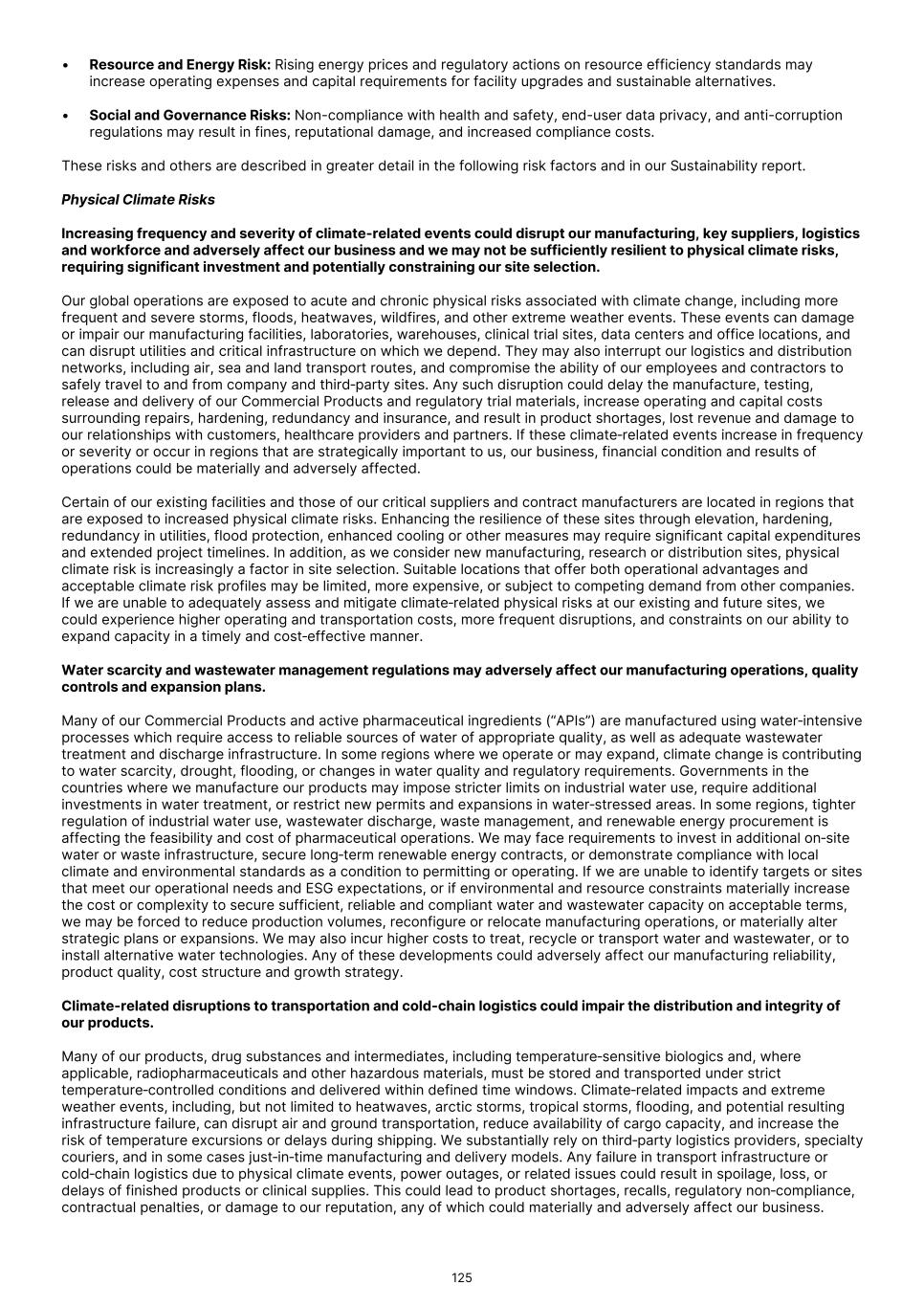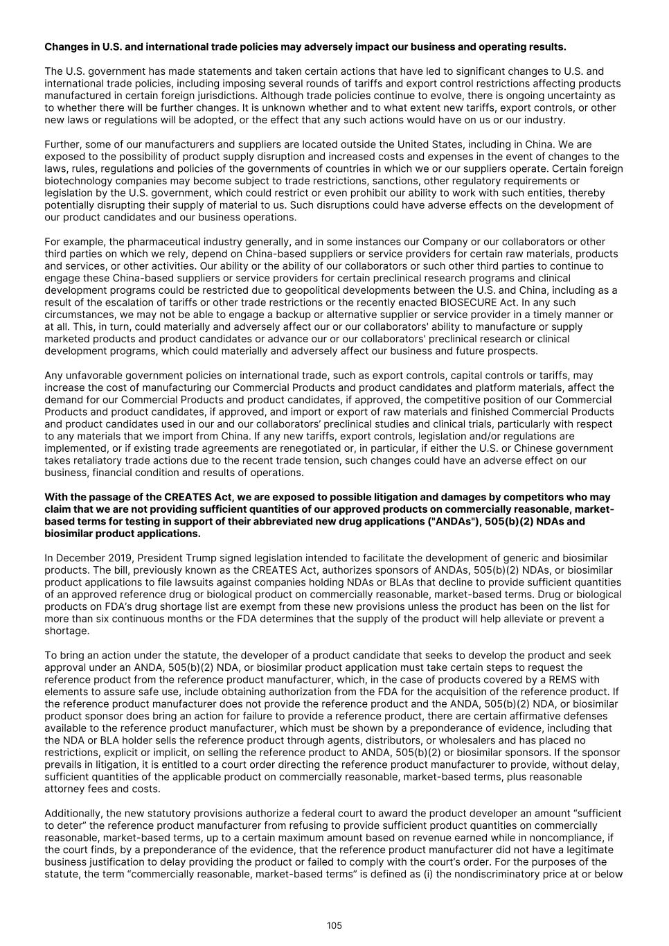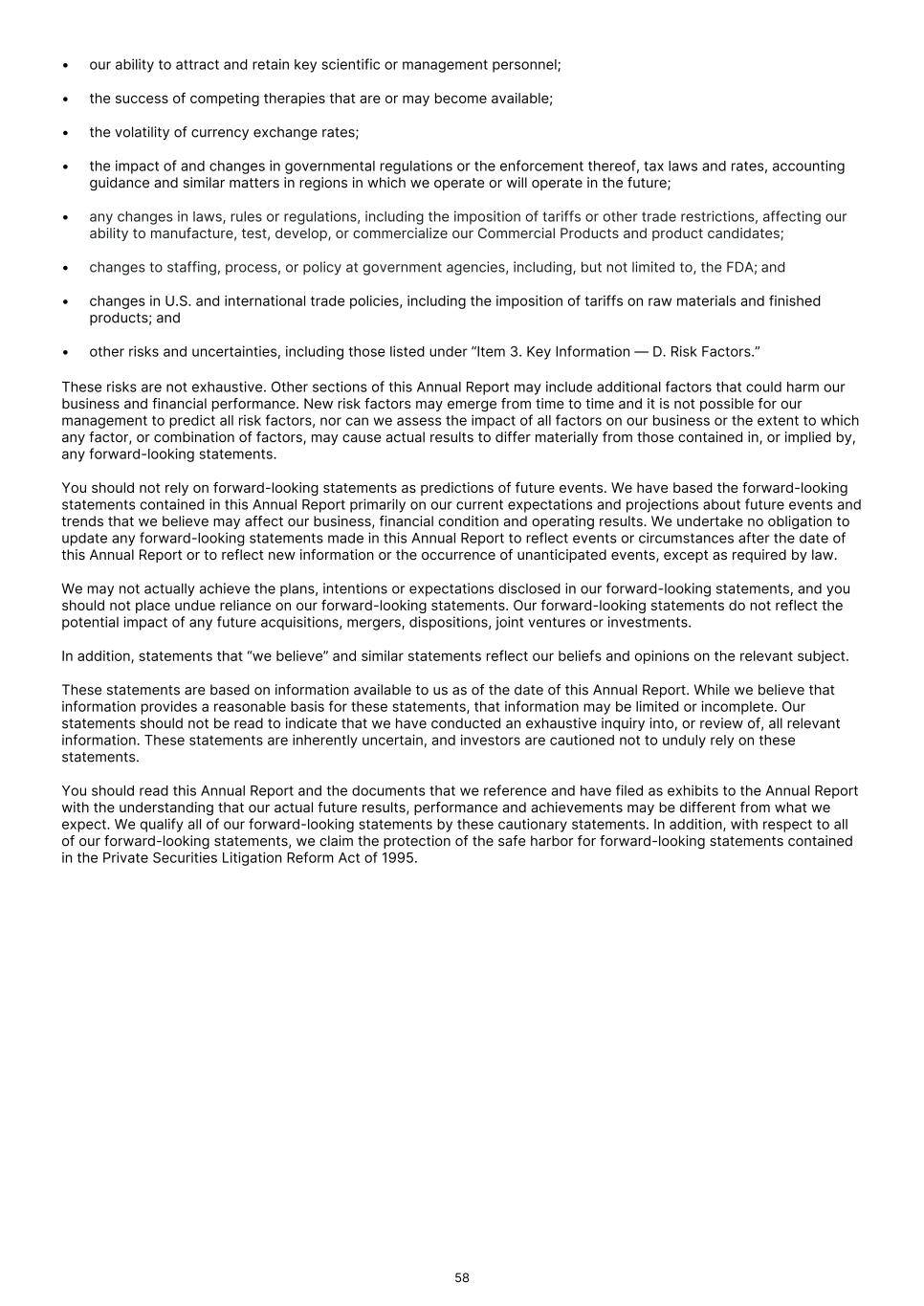• our ability to attract and retain key scientific or management personnel; • the success of competing therapies that are or may become available; • the volatility of currency exchange rates; • the impact of and changes in governmental regulations or the enforcement thereof, tax laws and rates, accounting guidance and similar matters in regions in which we operate or will operate in the future; • any changes in laws, rules or regulations, including the imposition of tariffs or other trade restrictions, affecting our ability to manufacture, test, develop, or commercialize our Commercial Products and product candidates; • changes to staffing, process, or policy at government agencies, including, but not limited to, the FDA; and • changes in U.S. and international trade policies, including the imposition of tariffs on raw materials and finished products; and • other risks and uncertainties, including those listed under “Item 3. Key Information — D. Risk Factors.” These risks are not exhaustive. Other sections of this Annual Report may include additional factors that could harm our business and financial performance. New risk factors may emerge from time to time and it is not possible for our management to predict all risk factors, nor can we assess the impact of all factors on our business or the extent to which any factor, or combination of factors, may cause actual results to differ materially from those contained in, or implied by, any forward-looking statements. You should not rely on forward-looking statements as predictions of future events. We have based the forward-looking statements contained in this Annual Report primarily on our current expectations and projections about future events and trends that we believe may affect our business, financial condition and operating results. We undertake no obligation to update any forward-looking statements made in this Annual Report to reflect events or circumstances after the date of this Annual Report or to reflect new information or the occurrence of unanticipated events, except as required by law. We may not actually achieve the plans, intentions or expectations disclosed in our forward-looking statements, and you should not place undue reliance on our forward-looking statements. Our forward-looking statements do not reflect the potential impact of any future acquisitions, mergers, dispositions, joint ventures or investments. In addition, statements that “we believe” and similar statements reflect our beliefs and opinions on the relevant subject. These statements are based on information available to us as of the date of this Annual Report. While we believe that information provides a reasonable basis for these statements, that information may be limited or incomplete. Our statements should not be read to indicate that we have conducted an exhaustive inquiry into, or review of, all relevant information. These statements are inherently uncertain, and investors are cautioned not to unduly rely on these statements. You should read this Annual Report and the documents that we reference and have filed as exhibits to the Annual Report with the understanding that our actual future results, performance and achievements may be different from what we expect. We qualify all of our forward-looking statements by these cautionary statements. In addition, with respect to all of our forward-looking statements, we claim the protection of the safe harbor for forward-looking statements contained in the Private Securities Litigation Reform Act of 1995. 58