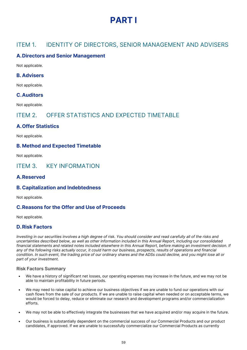 PART I ITEM 1. IDENTITY OF DIRECTORS, SENIOR MANAGEMENT AND ADVISERS A.Directors and Senior Management Not applicable. B. Advisers Not applicable. C.Auditors Not applicable. ITEM 2. OFFER STATISTICS AND EXPECTED TIMETABLE A.Offer Statistics Not applicable. B. Method and Expected Timetable Not applicable. ITEM 3. KEY INFORMATION A.Reserved B. Capitalization and Indebtedness Not applicable. C.Reasons for the Offer and Use of Proceeds Not applicable. D.Risk Factors Investing in our securities involves a high degree of risk. You should consider and read carefully all of the risks and uncertainties described below, as well as other information included in this Annual Report, including our consolidated financial statements and related notes included elsewhere in this Annual Report, before making an investment decision. If any of the following risks actually occur, it could harm our business, prospects, results of operations and financial condition. In such event, the trading price of our ordinary shares and the ADSs could decline, and you might lose all or part of your investment. Risk Factors Summary • We have a history of significant net losses, our operating expenses may increase in the future, and we may not be able to maintain profitability in future periods. • We may need to raise capital to achieve our business objectives if we are unable to fund our operations with our cash flows from the sale of our products. If we are unable to raise capital when needed or on acceptable terms, we would be forced to delay, reduce or eliminate our research and development programs and/or commercialization efforts. • We may not be able to effectively integrate the businesses that we have acquired and/or may acquire in the future. • Our business is substantially dependent on the commercial success of our Commercial Products and our product candidates, if approved. If we are unable to successfully commercialize our Commercial Products as currently 59