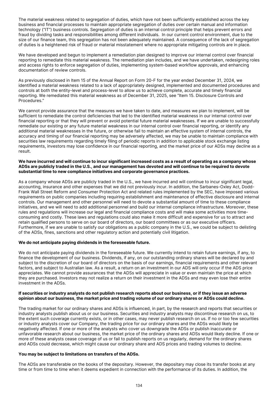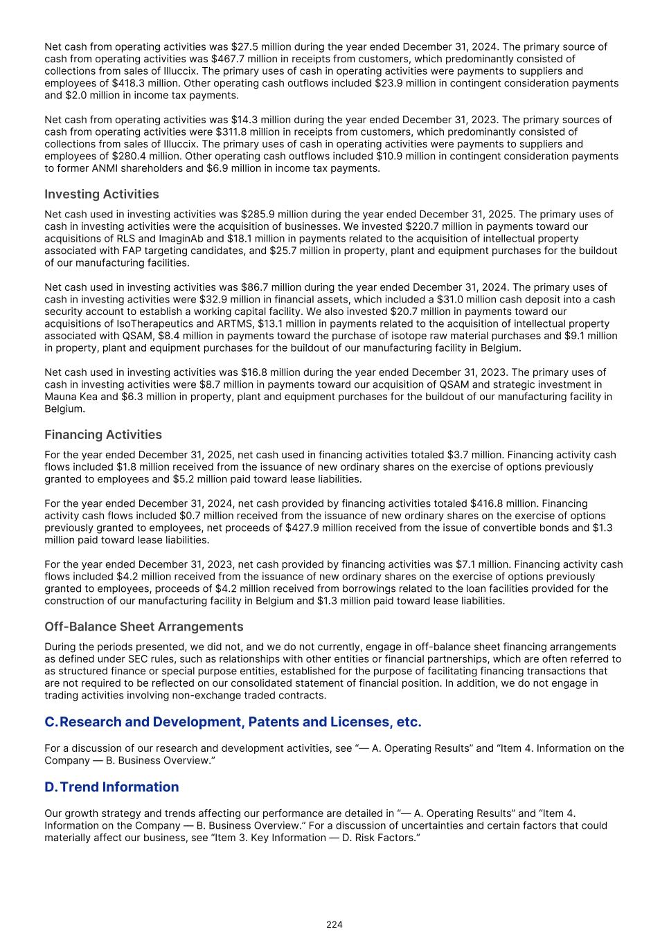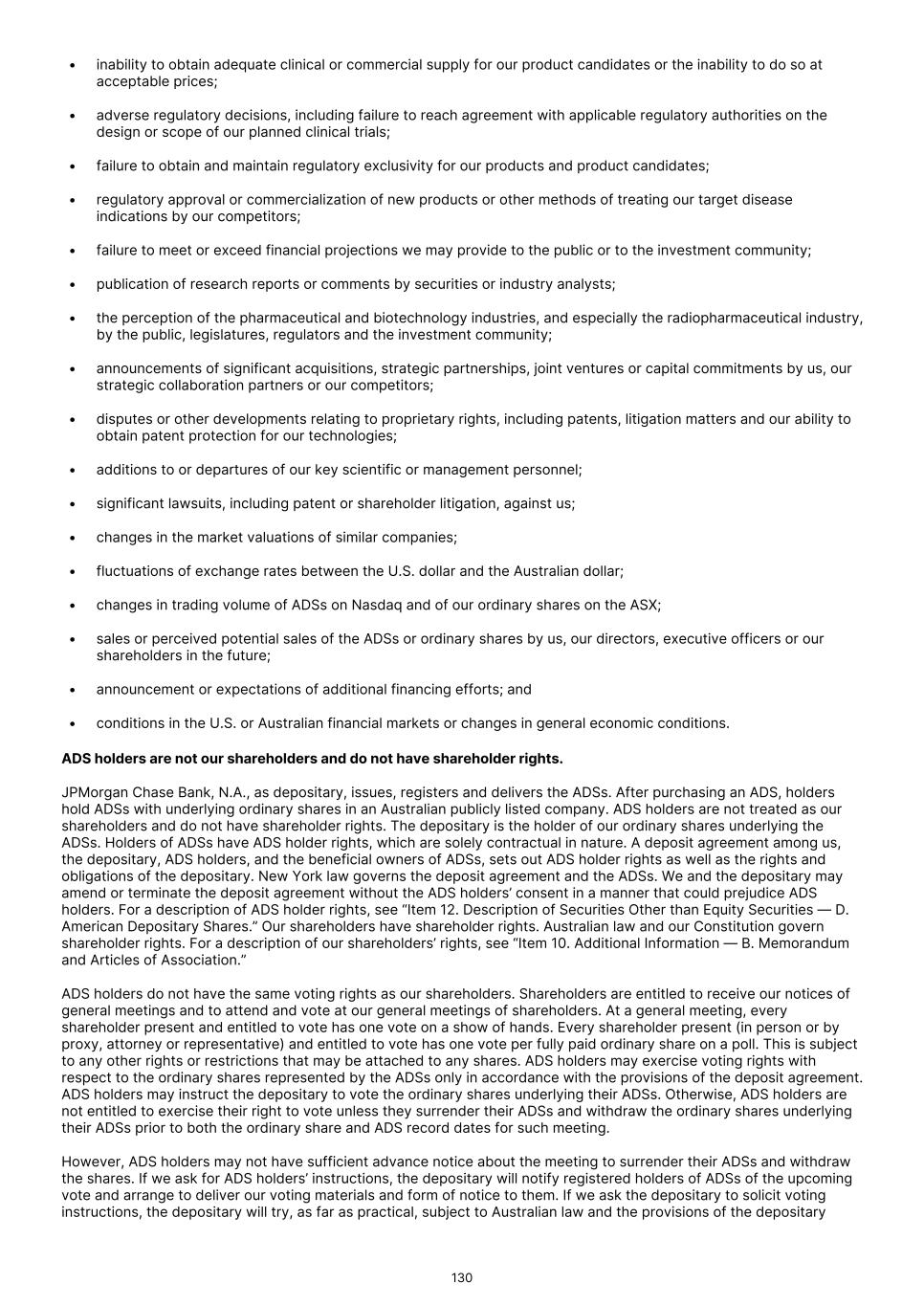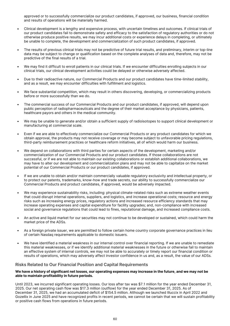 approved or to successfully commercialize our product candidates, if approved, our business, financial condition and results of operations will be materially harmed. • Clinical development is a lengthy and expensive process, with uncertain timelines and outcomes. If clinical trials of our product candidates fail to demonstrate safety and efficacy to the satisfaction of regulatory authorities or do not otherwise produce positive results, we may incur additional costs or experience delays in completing, or ultimately be unable to complete, the development and commercialization of such product candidates, if approved. • The results of previous clinical trials may not be predictive of future trial results, and preliminary, interim or top-line data may be subject to change or qualification based on the complete analyses of data and, therefore, may not be predictive of the final results of a trial. • We may find it difficult to enroll patients in our clinical trials. If we encounter difficulties enrolling subjects in our clinical trials, our clinical development activities could be delayed or otherwise adversely affected. • Due to their radioactive nature, our Commercial Products and our product candidates have time-limited stability, and as a result, we may encounter difficulties with fulfillment and logistics. • We face substantial competition, which may result in others discovering, developing, or commercializing products before or more successfully than we do. • The commercial success of our Commercial Products and our product candidates, if approved, will depend upon public perception of radiopharmaceuticals and the degree of their market acceptance by physicians, patients, healthcare payors and others in the medical community. • We may be unable to generate and/or obtain a sufficient supply of radioisotopes to support clinical development or manufacturing at commercial scale. • Even if we are able to effectively commercialize our Commercial Products or any product candidates for which we obtain approval, the products may not receive coverage or may become subject to unfavorable pricing regulations, third-party reimbursement practices or healthcare reform initiatives, all of which would harm our business. • We depend on collaborations with third parties for certain aspects of the development, marketing and/or commercialization of our Commercial Products and our product candidates. If those collaborations are not successful, or if we are not able to maintain our existing collaborations or establish additional collaborations, we may have to alter our development and commercialization plans and may not be able to capitalize on the market potential of our Commercial Products or our product candidates, if approved. • If we are unable to obtain and/or maintain commercially valuable regulatory exclusivity and intellectual property, or to protect our patents, trademarks, know-how and trade secrets, our ability to successfully commercialize our Commercial Products and product candidates, if approved, would be adversely impacted. • We may experience sustainability risks, including: physical climate-related risks such as extreme weather events that could disrupt internal operations, suppliers, and logistics, and increase operational costs; resource and energy risks such as increasing energy prices, regulatory actions and increased resource efficiency standards that may increase operating expenses and capital expenditure for facility upgrades; and, non-compliance with increased social and governance regulations that could lead to fines, reputational damage, and increased compliance costs. • An active and liquid market for our securities may not continue to be developed or sustained, which could harm the market price of the ADSs. • As a foreign private issuer, we are permitted to follow certain home country corporate governance practices in lieu of certain Nasdaq requirements applicable to domestic issuers. • We have identified a material weakness in our internal control over financial reporting. If we are unable to remediate this material weaknesses, or if we identify additional material weaknesses in the future or otherwise fail to maintain an effective system of internal controls, we may not be able to accurately or timely report our financial condition or results of operations, which may adversely affect investor confidence in us and, as a result, the value of our ADSs. Risks Related to Our Financial Position and Capital Requirements We have a history of significant net losses, our operating expenses may increase in the future, and we may not be able to maintain profitability in future periods. Until 2023, we incurred significant operating losses. Our loss after tax was $7.1 million for the year ended December 31, 2025. Our net operating cash flow was $17.3 million (outflow) for the year ended December 31, 2025. As of December 31, 2025, we had an accumulated deficit of $154.5 million. Although we launched Illuccix in April 2022 and Gozellix in June 2025 and have recognized profits in recent periods, we cannot be certain that we will sustain profitability or positive cash flows from operations in future periods. 60