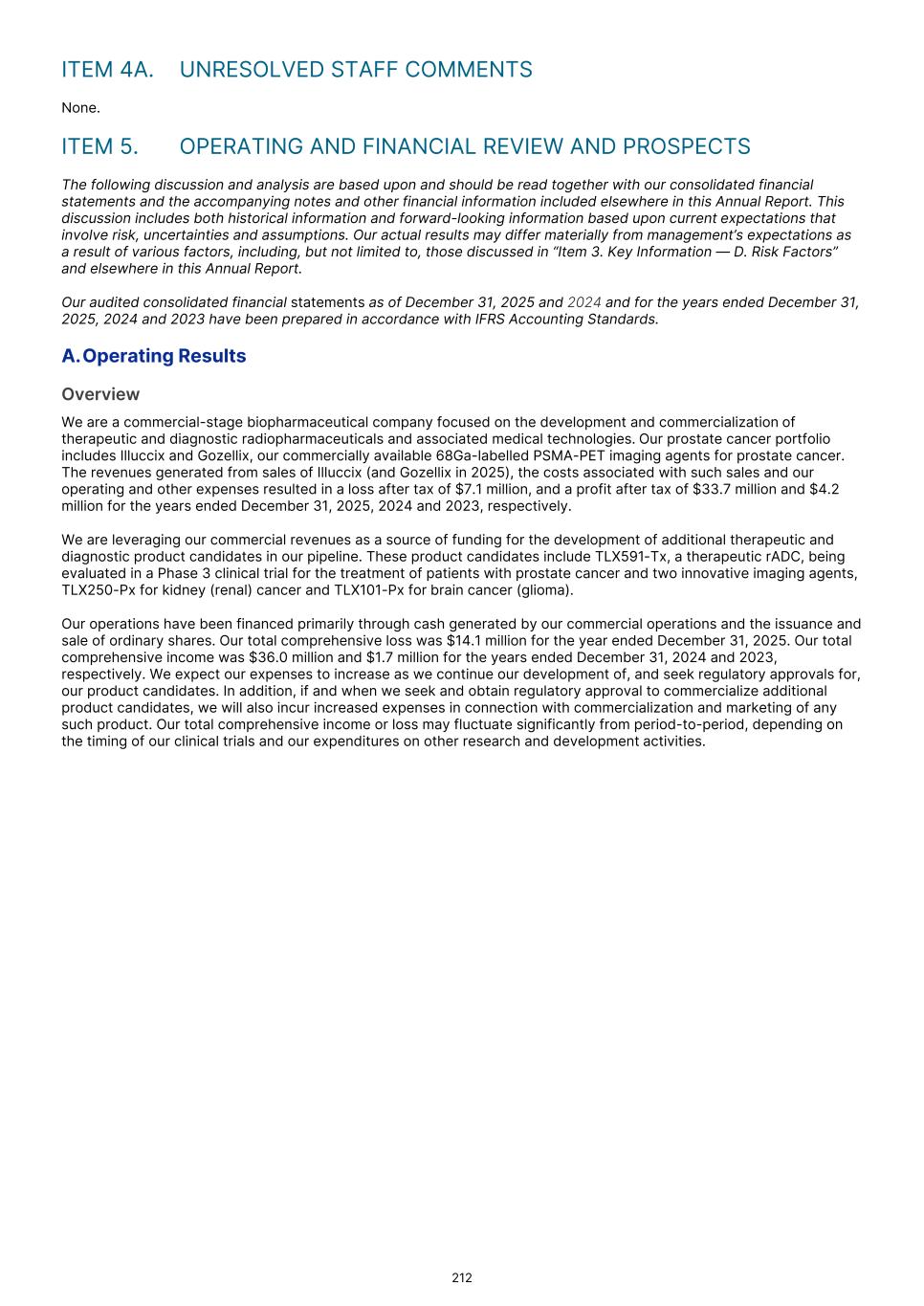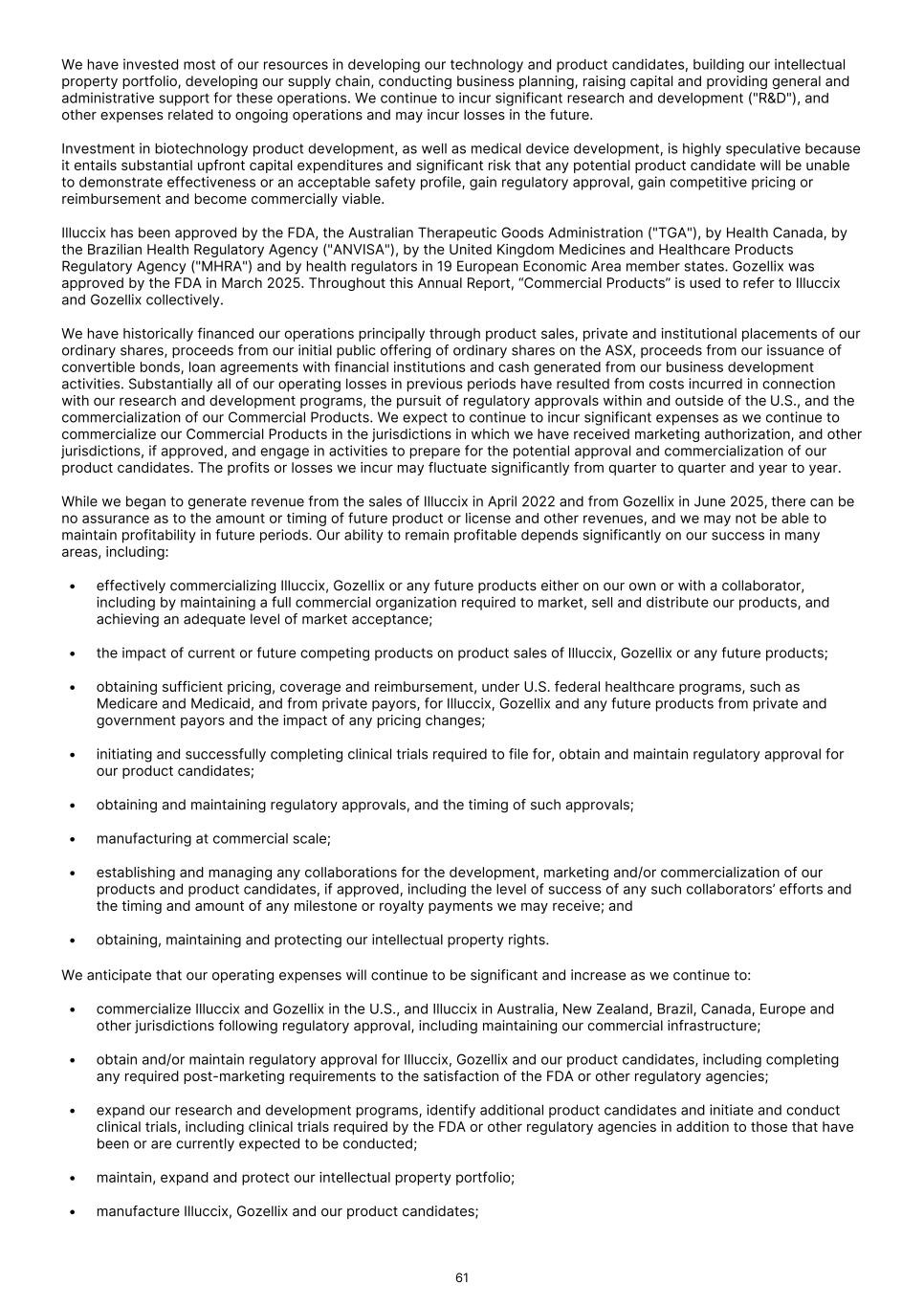 We have invested most of our resources in developing our technology and product candidates, building our intellectual property portfolio, developing our supply chain, conducting business planning, raising capital and providing general and administrative support for these operations. We continue to incur significant research and development ("R&D"), and other expenses related to ongoing operations and may incur losses in the future. Investment in biotechnology product development, as well as medical device development, is highly speculative because it entails substantial upfront capital expenditures and significant risk that any potential product candidate will be unable to demonstrate effectiveness or an acceptable safety profile, gain regulatory approval, gain competitive pricing or reimbursement and become commercially viable. Illuccix has been approved by the FDA, the Australian Therapeutic Goods Administration ("TGA"), by Health Canada, by the Brazilian Health Regulatory Agency ("ANVISA"), by the United Kingdom Medicines and Healthcare Products Regulatory Agency ("MHRA") and by health regulators in 19 European Economic Area member states. Gozellix was approved by the FDA in March 2025. Throughout this Annual Report, “Commercial Products” is used to refer to Illuccix and Gozellix collectively. We have historically financed our operations principally through product sales, private and institutional placements of our ordinary shares, proceeds from our initial public offering of ordinary shares on the ASX, proceeds from our issuance of convertible bonds, loan agreements with financial institutions and cash generated from our business development activities. Substantially all of our operating losses in previous periods have resulted from costs incurred in connection with our research and development programs, the pursuit of regulatory approvals within and outside of the U.S., and the commercialization of our Commercial Products. We expect to continue to incur significant expenses as we continue to commercialize our Commercial Products in the jurisdictions in which we have received marketing authorization, and other jurisdictions, if approved, and engage in activities to prepare for the potential approval and commercialization of our product candidates. The profits or losses we incur may fluctuate significantly from quarter to quarter and year to year. While we began to generate revenue from the sales of Illuccix in April 2022 and from Gozellix in June 2025, there can be no assurance as to the amount or timing of future product or license and other revenues, and we may not be able to maintain profitability in future periods. Our ability to remain profitable depends significantly on our success in many areas, including: • effectively commercializing Illuccix, Gozellix or any future products either on our own or with a collaborator, including by maintaining a full commercial organization required to market, sell and distribute our products, and achieving an adequate level of market acceptance; • the impact of current or future competing products on product sales of Illuccix, Gozellix or any future products; • obtaining sufficient pricing, coverage and reimbursement, under U.S. federal healthcare programs, such as Medicare and Medicaid, and from private payors, for Illuccix, Gozellix and any future products from private and government payors and the impact of any pricing changes; • initiating and successfully completing clinical trials required to file for, obtain and maintain regulatory approval for our product candidates; • obtaining and maintaining regulatory approvals, and the timing of such approvals; • manufacturing at commercial scale; • establishing and managing any collaborations for the development, marketing and/or commercialization of our products and product candidates, if approved, including the level of success of any such collaborators’ efforts and the timing and amount of any milestone or royalty payments we may receive; and • obtaining, maintaining and protecting our intellectual property rights. We anticipate that our operating expenses will continue to be significant and increase as we continue to: • commercialize Illuccix and Gozellix in the U.S., and Illuccix in Australia, New Zealand, Brazil, Canada, Europe and other jurisdictions following regulatory approval, including maintaining our commercial infrastructure; • obtain and/or maintain regulatory approval for Illuccix, Gozellix and our product candidates, including completing any required post-marketing requirements to the satisfaction of the FDA or other regulatory agencies; • expand our research and development programs, identify additional product candidates and initiate and conduct clinical trials, including clinical trials required by the FDA or other regulatory agencies in addition to those that have been or are currently expected to be conducted; • maintain, expand and protect our intellectual property portfolio; • manufacture Illuccix, Gozellix and our product candidates; 61