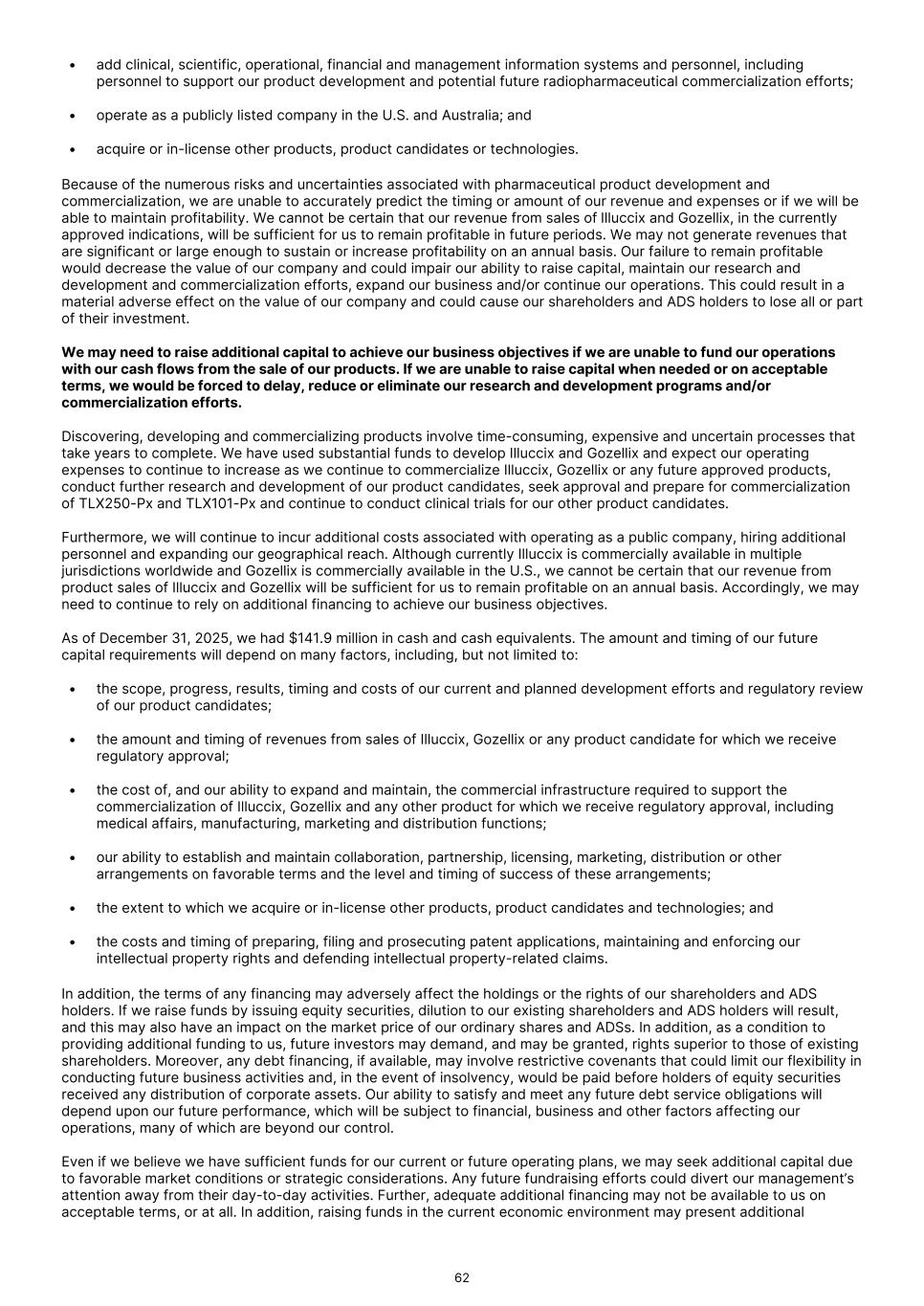 • add clinical, scientific, operational, financial and management information systems and personnel, including personnel to support our product development and potential future radiopharmaceutical commercialization efforts; • operate as a publicly listed company in the U.S. and Australia; and • acquire or in-license other products, product candidates or technologies. Because of the numerous risks and uncertainties associated with pharmaceutical product development and commercialization, we are unable to accurately predict the timing or amount of our revenue and expenses or if we will be able to maintain profitability. We cannot be certain that our revenue from sales of Illuccix and Gozellix, in the currently approved indications, will be sufficient for us to remain profitable in future periods. We may not generate revenues that are significant or large enough to sustain or increase profitability on an annual basis. Our failure to remain profitable would decrease the value of our company and could impair our ability to raise capital, maintain our research and development and commercialization efforts, expand our business and/or continue our operations. This could result in a material adverse effect on the value of our company and could cause our shareholders and ADS holders to lose all or part of their investment. We may need to raise additional capital to achieve our business objectives if we are unable to fund our operations with our cash flows from the sale of our products. If we are unable to raise capital when needed or on acceptable terms, we would be forced to delay, reduce or eliminate our research and development programs and/or commercialization efforts. Discovering, developing and commercializing products involve time-consuming, expensive and uncertain processes that take years to complete. We have used substantial funds to develop Illuccix and Gozellix and expect our operating expenses to continue to increase as we continue to commercialize Illuccix, Gozellix or any future approved products, conduct further research and development of our product candidates, seek approval and prepare for commercialization of TLX250-Px and TLX101-Px and continue to conduct clinical trials for our other product candidates. Furthermore, we will continue to incur additional costs associated with operating as a public company, hiring additional personnel and expanding our geographical reach. Although currently Illuccix is commercially available in multiple jurisdictions worldwide and Gozellix is commercially available in the U.S., we cannot be certain that our revenue from product sales of Illuccix and Gozellix will be sufficient for us to remain profitable on an annual basis. Accordingly, we may need to continue to rely on additional financing to achieve our business objectives. As of December 31, 2025, we had $141.9 million in cash and cash equivalents. The amount and timing of our future capital requirements will depend on many factors, including, but not limited to: • the scope, progress, results, timing and costs of our current and planned development efforts and regulatory review of our product candidates; • the amount and timing of revenues from sales of Illuccix, Gozellix or any product candidate for which we receive regulatory approval; • the cost of, and our ability to expand and maintain, the commercial infrastructure required to support the commercialization of Illuccix, Gozellix and any other product for which we receive regulatory approval, including medical affairs, manufacturing, marketing and distribution functions; • our ability to establish and maintain collaboration, partnership, licensing, marketing, distribution or other arrangements on favorable terms and the level and timing of success of these arrangements; • the extent to which we acquire or in-license other products, product candidates and technologies; and • the costs and timing of preparing, filing and prosecuting patent applications, maintaining and enforcing our intellectual property rights and defending intellectual property-related claims. In addition, the terms of any financing may adversely affect the holdings or the rights of our shareholders and ADS holders. If we raise funds by issuing equity securities, dilution to our existing shareholders and ADS holders will result, and this may also have an impact on the market price of our ordinary shares and ADSs. In addition, as a condition to providing additional funding to us, future investors may demand, and may be granted, rights superior to those of existing shareholders. Moreover, any debt financing, if available, may involve restrictive covenants that could limit our flexibility in conducting future business activities and, in the event of insolvency, would be paid before holders of equity securities received any distribution of corporate assets. Our ability to satisfy and meet any future debt service obligations will depend upon our future performance, which will be subject to financial, business and other factors affecting our operations, many of which are beyond our control. Even if we believe we have sufficient funds for our current or future operating plans, we may seek additional capital due to favorable market conditions or strategic considerations. Any future fundraising efforts could divert our management’s attention away from their day-to-day activities. Further, adequate additional financing may not be available to us on acceptable terms, or at all. In addition, raising funds in the current economic environment may present additional 62