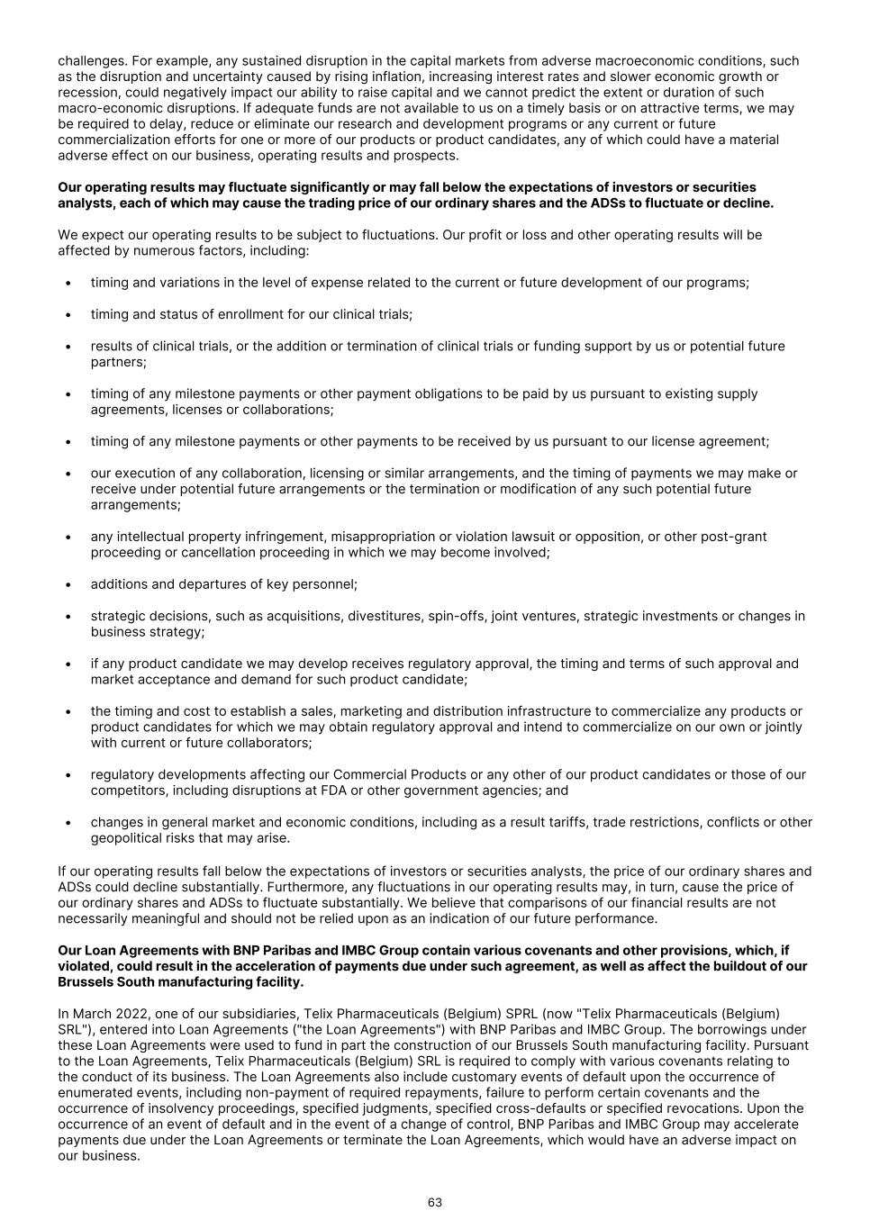 challenges. For example, any sustained disruption in the capital markets from adverse macroeconomic conditions, such as the disruption and uncertainty caused by rising inflation, increasing interest rates and slower economic growth or recession, could negatively impact our ability to raise capital and we cannot predict the extent or duration of such macro-economic disruptions. If adequate funds are not available to us on a timely basis or on attractive terms, we may be required to delay, reduce or eliminate our research and development programs or any current or future commercialization efforts for one or more of our products or product candidates, any of which could have a material adverse effect on our business, operating results and prospects. Our operating results may fluctuate significantly or may fall below the expectations of investors or securities analysts, each of which may cause the trading price of our ordinary shares and the ADSs to fluctuate or decline. We expect our operating results to be subject to fluctuations. Our profit or loss and other operating results will be affected by numerous factors, including: • timing and variations in the level of expense related to the current or future development of our programs; • timing and status of enrollment for our clinical trials; • results of clinical trials, or the addition or termination of clinical trials or funding support by us or potential future partners; • timing of any milestone payments or other payment obligations to be paid by us pursuant to existing supply agreements, licenses or collaborations; • timing of any milestone payments or other payments to be received by us pursuant to our license agreement; • our execution of any collaboration, licensing or similar arrangements, and the timing of payments we may make or receive under potential future arrangements or the termination or modification of any such potential future arrangements; • any intellectual property infringement, misappropriation or violation lawsuit or opposition, or other post-grant proceeding or cancellation proceeding in which we may become involved; • additions and departures of key personnel; • strategic decisions, such as acquisitions, divestitures, spin-offs, joint ventures, strategic investments or changes in business strategy; • if any product candidate we may develop receives regulatory approval, the timing and terms of such approval and market acceptance and demand for such product candidate; • the timing and cost to establish a sales, marketing and distribution infrastructure to commercialize any products or product candidates for which we may obtain regulatory approval and intend to commercialize on our own or jointly with current or future collaborators; • regulatory developments affecting our Commercial Products or any other of our product candidates or those of our competitors, including disruptions at FDA or other government agencies; and • changes in general market and economic conditions, including as a result tariffs, trade restrictions, conflicts or other geopolitical risks that may arise. If our operating results fall below the expectations of investors or securities analysts, the price of our ordinary shares and ADSs could decline substantially. Furthermore, any fluctuations in our operating results may, in turn, cause the price of our ordinary shares and ADSs to fluctuate substantially. We believe that comparisons of our financial results are not necessarily meaningful and should not be relied upon as an indication of our future performance. Our Loan Agreements with BNP Paribas and IMBC Group contain various covenants and other provisions, which, if violated, could result in the acceleration of payments due under such agreement, as well as affect the buildout of our Brussels South manufacturing facility. In March 2022, one of our subsidiaries, Telix Pharmaceuticals (Belgium) SPRL (now "Telix Pharmaceuticals (Belgium) SRL"), entered into Loan Agreements ("the Loan Agreements") with BNP Paribas and IMBC Group. The borrowings under these Loan Agreements were used to fund in part the construction of our Brussels South manufacturing facility. Pursuant to the Loan Agreements, Telix Pharmaceuticals (Belgium) SRL is required to comply with various covenants relating to the conduct of its business. The Loan Agreements also include customary events of default upon the occurrence of enumerated events, including non-payment of required repayments, failure to perform certain covenants and the occurrence of insolvency proceedings, specified judgments, specified cross-defaults or specified revocations. Upon the occurrence of an event of default and in the event of a change of control, BNP Paribas and IMBC Group may accelerate payments due under the Loan Agreements or terminate the Loan Agreements, which would have an adverse impact on our business. 63