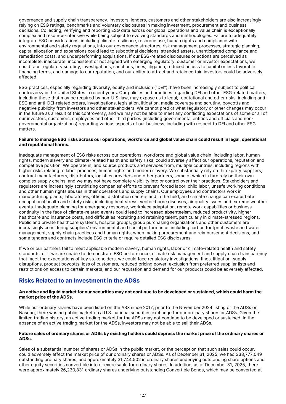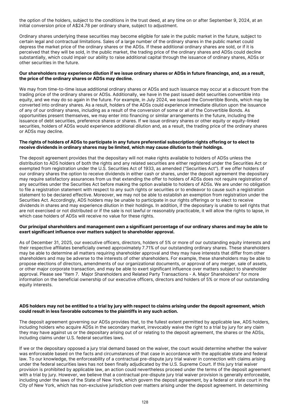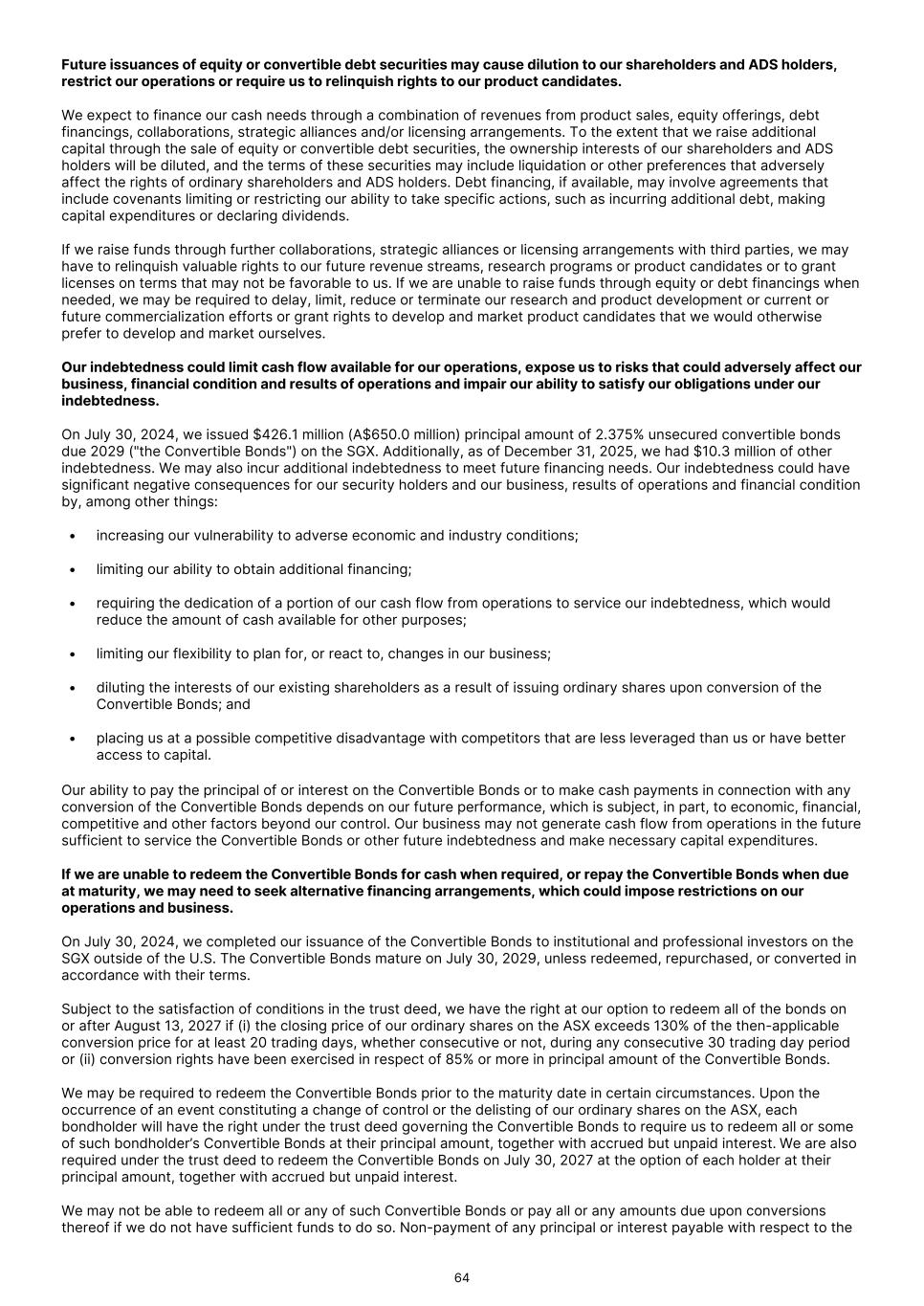 Future issuances of equity or convertible debt securities may cause dilution to our shareholders and ADS holders, restrict our operations or require us to relinquish rights to our product candidates. We expect to finance our cash needs through a combination of revenues from product sales, equity offerings, debt financings, collaborations, strategic alliances and/or licensing arrangements. To the extent that we raise additional capital through the sale of equity or convertible debt securities, the ownership interests of our shareholders and ADS holders will be diluted, and the terms of these securities may include liquidation or other preferences that adversely affect the rights of ordinary shareholders and ADS holders. Debt financing, if available, may involve agreements that include covenants limiting or restricting our ability to take specific actions, such as incurring additional debt, making capital expenditures or declaring dividends. If we raise funds through further collaborations, strategic alliances or licensing arrangements with third parties, we may have to relinquish valuable rights to our future revenue streams, research programs or product candidates or to grant licenses on terms that may not be favorable to us. If we are unable to raise funds through equity or debt financings when needed, we may be required to delay, limit, reduce or terminate our research and product development or current or future commercialization efforts or grant rights to develop and market product candidates that we would otherwise prefer to develop and market ourselves. Our indebtedness could limit cash flow available for our operations, expose us to risks that could adversely affect our business, financial condition and results of operations and impair our ability to satisfy our obligations under our indebtedness. On July 30, 2024, we issued $426.1 million (A$650.0 million) principal amount of 2.375% unsecured convertible bonds due 2029 ("the Convertible Bonds") on the SGX. Additionally, as of December 31, 2025, we had $10.3 million of other indebtedness. We may also incur additional indebtedness to meet future financing needs. Our indebtedness could have significant negative consequences for our security holders and our business, results of operations and financial condition by, among other things: • increasing our vulnerability to adverse economic and industry conditions; • limiting our ability to obtain additional financing; • requiring the dedication of a portion of our cash flow from operations to service our indebtedness, which would reduce the amount of cash available for other purposes; • limiting our flexibility to plan for, or react to, changes in our business; • diluting the interests of our existing shareholders as a result of issuing ordinary shares upon conversion of the Convertible Bonds; and • placing us at a possible competitive disadvantage with competitors that are less leveraged than us or have better access to capital. Our ability to pay the principal of or interest on the Convertible Bonds or to make cash payments in connection with any conversion of the Convertible Bonds depends on our future performance, which is subject, in part, to economic, financial, competitive and other factors beyond our control. Our business may not generate cash flow from operations in the future sufficient to service the Convertible Bonds or other future indebtedness and make necessary capital expenditures. If we are unable to redeem the Convertible Bonds for cash when required, or repay the Convertible Bonds when due at maturity, we may need to seek alternative financing arrangements, which could impose restrictions on our operations and business. On July 30, 2024, we completed our issuance of the Convertible Bonds to institutional and professional investors on the SGX outside of the U.S. The Convertible Bonds mature on July 30, 2029, unless redeemed, repurchased, or converted in accordance with their terms. Subject to the satisfaction of conditions in the trust deed, we have the right at our option to redeem all of the bonds on or after August 13, 2027 if (i) the closing price of our ordinary shares on the ASX exceeds 130% of the then-applicable conversion price for at least 20 trading days, whether consecutive or not, during any consecutive 30 trading day period or (ii) conversion rights have been exercised in respect of 85% or more in principal amount of the Convertible Bonds. We may be required to redeem the Convertible Bonds prior to the maturity date in certain circumstances. Upon the occurrence of an event constituting a change of control or the delisting of our ordinary shares on the ASX, each bondholder will have the right under the trust deed governing the Convertible Bonds to require us to redeem all or some of such bondholder’s Convertible Bonds at their principal amount, together with accrued but unpaid interest. We are also required under the trust deed to redeem the Convertible Bonds on July 30, 2027 at the option of each holder at their principal amount, together with accrued but unpaid interest. We may not be able to redeem all or any of such Convertible Bonds or pay all or any amounts due upon conversions thereof if we do not have sufficient funds to do so. Non-payment of any principal or interest payable with respect to the 64