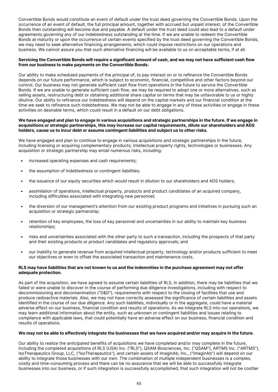 Convertible Bonds would constitute an event of default under the trust deed governing the Convertible Bonds. Upon the occurrence of an event of default, the full principal amount, together with accrued but unpaid interest, of the Convertible Bonds then outstanding will become due and payable. A default under the trust deed could also lead to a default under agreements governing any of our indebtedness outstanding at the time. If we are unable to redeem the Convertible Bonds at maturity or upon the occurrence of certain events specified by the trust deed governing the Convertible Bonds, we may need to seek alternative financing arrangements, which could impose restrictions on our operations and business. We cannot assure you that such alternative financing will be available to us on acceptable terms, if at all. Servicing the Convertible Bonds will require a significant amount of cash, and we may not have sufficient cash flow from our business to make payments on the Convertible Bonds. Our ability to make scheduled payments of the principal of, to pay interest on or to refinance the Convertible Bonds depends on our future performance, which is subject to economic, financial, competitive and other factors beyond our control. Our business may not generate sufficient cash flow from operations in the future to service the Convertible Bonds. If we are unable to generate sufficient cash flow, we may be required to adopt one or more alternatives, such as selling assets, restructuring debt or obtaining additional share capital on terms that may be unfavorable to us or highly dilutive. Our ability to refinance our indebtedness will depend on the capital markets and our financial condition at the time we seek to refinance such indebtedness. We may not be able to engage in any of these activities or engage in these activities on desirable terms, which could result in a default on our debt obligations. We have engaged and plan to engage in various acquisitions and strategic partnerships in the future. If we engage in acquisitions or strategic partnerships, this may increase our capital requirements, dilute our shareholders and ADS holders, cause us to incur debt or assume contingent liabilities and subject us to other risks. We have engaged and plan to continue to engage in various acquisitions and strategic partnerships in the future, including licensing or acquiring complementary products, intellectual property rights, technologies or businesses. Any acquisition or strategic partnership may entail numerous risks, including: • increased operating expenses and cash requirements; • the assumption of indebtedness or contingent liabilities; • the issuance of our equity securities which would result in dilution to our shareholders and ADS holders; • assimilation of operations, intellectual property, products and product candidates of an acquired company, including difficulties associated with integrating new personnel; • the diversion of our management’s attention from our existing product programs and initiatives in pursuing such an acquisition or strategic partnership; • retention of key employees, the loss of key personnel and uncertainties in our ability to maintain key business relationships; • risks and uncertainties associated with the other party to such a transaction, including the prospects of that party and their existing products or product candidates and regulatory approvals; and • our inability to generate revenue from acquired intellectual property, technology and/or products sufficient to meet our objectives or even to offset the associated transaction and maintenance costs. RLS may have liabilities that are not known to us and the indemnities in the purchase agreement may not offer adequate protection. As part of the acquisition, we have agreed to assume certain liabilities of RLS. In addition, there may be liabilities that we failed or were unable to discover in the course of performing due diligence investigations, including with respect to decommissioning and decontamination ("D&D"), requirements with respect to the closing of facilities that use and produce radioactive materials. Also, we may not have correctly assessed the significance of certain liabilities and assets identified in the course of our due diligence. Any such liabilities, individually or in the aggregate, could have a material adverse effect on our business, financial condition and results of operations. As we integrate RLS into our operations, we may learn additional information about the entity, such as unknown or contingent liabilities and issues relating to compliance with applicable laws, that could potentially have an adverse effect on our business, financial condition and results of operations. We may not be able to effectively integrate the businesses that we have acquired and/or may acquire in the future. Our ability to realize the anticipated benefits of acquisitions we have completed and/or may complete in the future, including the completed acquisitions of RLS (USA) Inc. ("RLS"), QSAM Biosciences, Inc. ("QSAM"), ARTMS Inc. ("ARTMS"), IsoTherapeutics Group, LLC, ("IsoTherapeutics"), and certain assets of ImaginAb, Inc., ("ImaginAb") will depend on our ability to integrate those businesses with our own. The combination of multiple independent businesses is a complex, costly and time-consuming process and there can be no assurance that we will be able to successfully integrate businesses into our business, or if such integration is successfully accomplished, that such integration will not be costlier 65