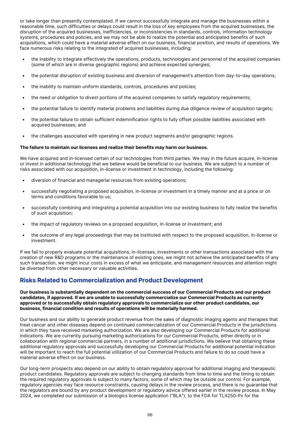 or take longer than presently contemplated. If we cannot successfully integrate and manage the businesses within a reasonable time, such difficulties or delays could result in the loss of key employees from the acquired businesses, the disruption of the acquired businesses, inefficiencies, or inconsistencies in standards, controls, information technology systems, procedures and policies, and we may not be able to realize the potential and anticipated benefits of such acquisitions, which could have a material adverse effect on our business, financial position, and results of operations. We face numerous risks relating to the integrated of acquired businesses, including: • the inability to integrate effectively the operations, products, technologies and personnel of the acquired companies (some of which are in diverse geographic regions) and achieve expected synergies; • the potential disruption of existing business and diversion of management’s attention from day-to-day operations; • the inability to maintain uniform standards, controls, procedures and policies; • the need or obligation to divest portions of the acquired companies to satisfy regulatory requirements; • the potential failure to identify material problems and liabilities during due diligence review of acquisition targets; • the potential failure to obtain sufficient indemnification rights to fully offset possible liabilities associated with acquired businesses; and • the challenges associated with operating in new product segments and/or geographic regions. The failure to maintain our licenses and realize their benefits may harm our business. We have acquired and in-licensed certain of our technologies from third parties. We may in the future acquire, in-license or invest in additional technology that we believe would be beneficial to our business. We are subject to a number of risks associated with our acquisition, in-license or investment in technology, including the following: • diversion of financial and managerial resources from existing operations; • successfully negotiating a proposed acquisition, in-license or investment in a timely manner and at a price or on terms and conditions favorable to us; • successfully combining and integrating a potential acquisition into our existing business to fully realize the benefits of such acquisition; • the impact of regulatory reviews on a proposed acquisition, in-license or investment; and • the outcome of any legal proceedings that may be instituted with respect to the proposed acquisition, in-license or investment. If we fail to properly evaluate potential acquisitions, in-licenses, investments or other transactions associated with the creation of new R&D programs or the maintenance of existing ones, we might not achieve the anticipated benefits of any such transaction, we might incur costs in excess of what we anticipate, and management resources and attention might be diverted from other necessary or valuable activities. Risks Related to Commercialization and Product Development Our business is substantially dependent on the commercial success of our Commercial Products and our product candidates, if approved. If we are unable to successfully commercialize our Commercial Products as currently approved or to successfully obtain regulatory approvals to commercialize our other product candidates, our business, financial condition and results of operations will be materially harmed. Our business and our ability to generate product revenue from the sales of diagnostic imaging agents and therapies that treat cancer and other diseases depend on continued commercialization of our Commercial Products in the jurisdictions in which they have received marketing authorization. We are also developing our Commercial Products for additional indications. We are currently pursuing marketing authorizations for our Commercial Products, either directly or in collaboration with regional commercial partners, in a number of additional jurisdictions. We believe that obtaining these additional regulatory approvals and successfully developing our Commercial Products for additional potential indication will be important to reach the full potential utilization of our Commercial Products and failure to do so could have a material adverse effect on our business. Our long-term prospects also depend on our ability to obtain regulatory approval for additional imaging and therapeutic product candidates. Regulatory approvals are subject to changing standards from time to time and the timing to obtain the required regulatory approvals is subject to many factors, some of which may be outside our control. For example, regulatory agencies may face resource constraints, causing delays in the review process, and there is no guarantee that the regulators are bound by any product development or regulatory advice offered earlier in the review process. In May 2024, we completed our submission of a biologics license application ("BLA"), to the FDA for TLX250-Px for the 66