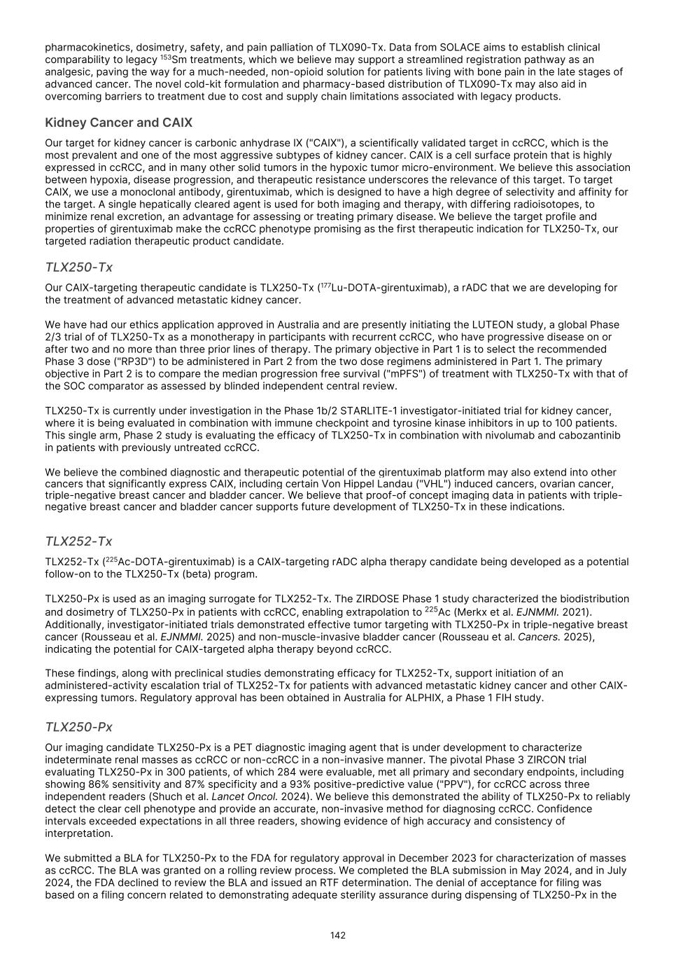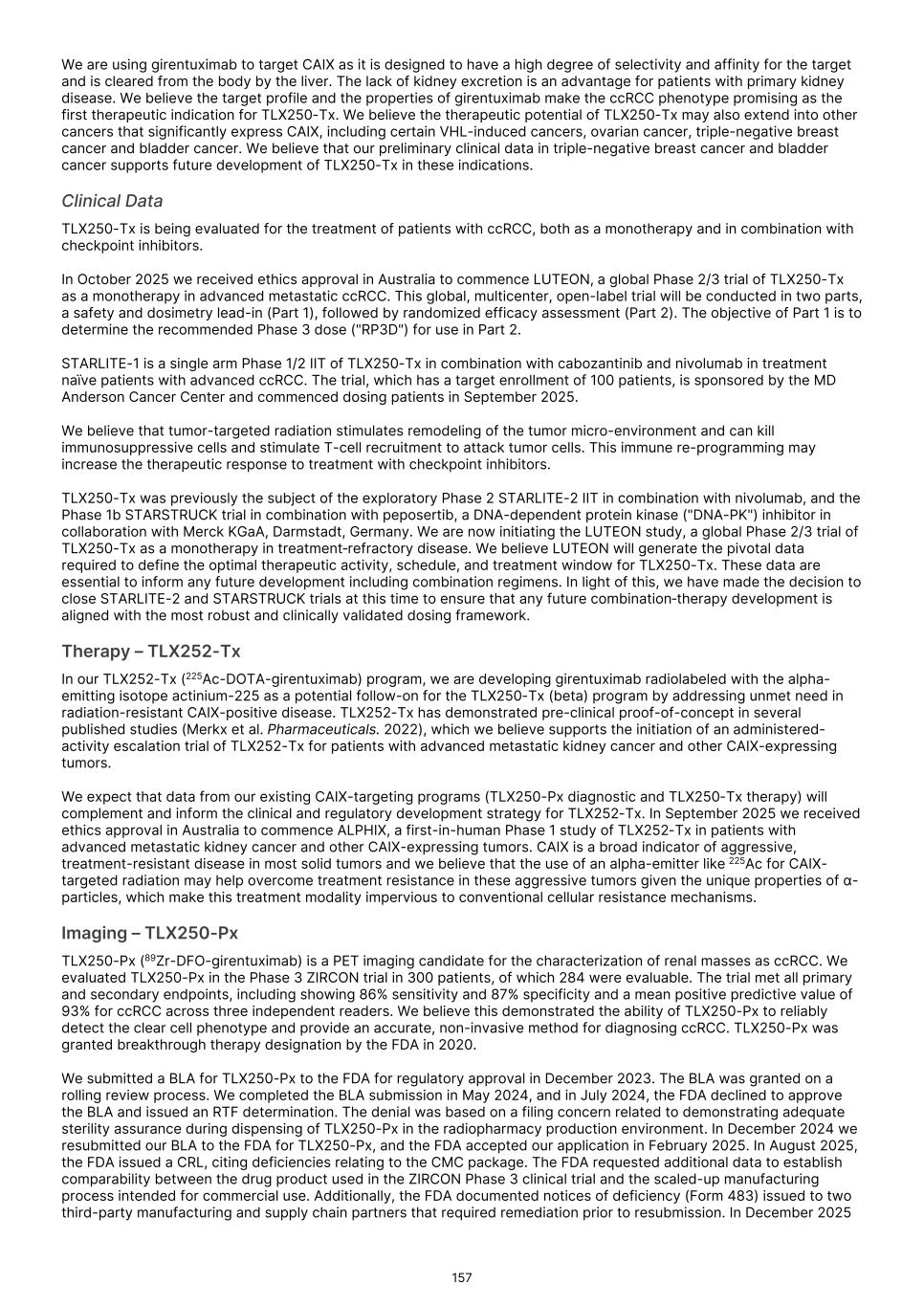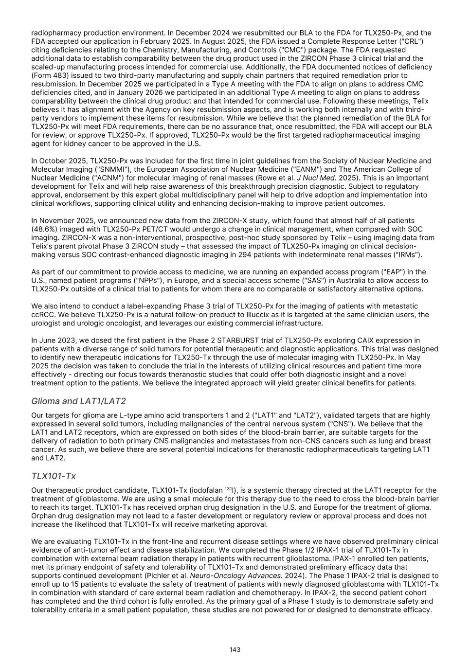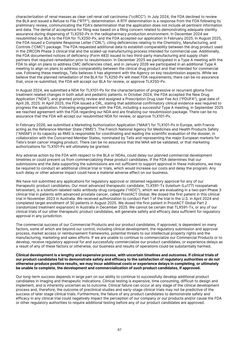 characterization of renal masses as clear cell renal cell carcinoma ("ccRCC"). In July 2024, the FDA declined to review the BLA and issued a Refuse to File ("RTF"), determination. A RTF determination is a response from the FDA following its preliminary review, communicating the FDA’s determination that the application does not include all pertinent information and data. The denial of acceptance for filing was based on a filing concern related to demonstrating adequate sterility assurance during dispensing of TLX250-Px in the radiopharmacy production environment. In December 2024 we resubmitted our BLA to the FDA for TLX250-Px, and the FDA accepted our application in February 2025. In August 2025, the FDA issued a Complete Response Letter ("CRL"), citing deficiencies relating to the Chemistry, Manufacturing, and Controls ("CMC") package. The FDA requested additional data to establish comparability between the drug product used in the ZIRCON Phase 3 clinical trial and the scaled-up manufacturing process intended for commercial use. Additionally, the FDA documented notices of deficiency (Form 483) issued to two third-party manufacturing and supply chain partners that required remediation prior to resubmission. In December 2025 we participated in a Type A meeting with the FDA to align on plans to address CMC deficiencies cited, and in January 2026 we participated in an additional Type A meeting to align on plans to address comparability between the clinical drug product and that intended for commercial use. Following these meetings, Telix believes it has alignment with the Agency on key resubmission aspects. While we believe that the planned remediation of the BLA for TLX250-Px will meet FDA requirements, there can be no assurance that, once re-submitted, the FDA will accept our BLA for review, or approve TLX250-Px. In August 2024, we submitted a NDA for TLX101-Px for the characterization of progressive or recurrent glioma from treatment related changes in both adult and pediatric patients. In October 2024, the FDA accepted the New Drug Application ("NDA"), and granted priority review and assigned a Prescription Drug User Fee Act ("PDUFA"), goal date of April 26, 2025. In April 2025, the FDA issued a CRL, stating that additional confirmatory clinical evidence was required to progress the application. Following engagement with the FDA, including a successful Type A meeting, in September 2025 we reached agreement with the FDA regarding our NDA and are finalizing our resubmission package. There can be no assurance that the FDA will accept our resubmitted NDA for review, or approve TLX101-Px. In February 2026, we submitted a Marketing Authorization Application ("MAA") for TLX101-Px in Europe, with France acting as the Reference Member State ("RMS"). The French National Agency for Medicines and Health Products Safety ("ANSM") in its capacity as RMS is responsible for coordinating and leading the scientific evaluation of the dossier, in collaboration with the Concerned Member States, nominated by Telix and representing the major European markets for Telix’s brain cancer imaging product. There can be no assurance that the MAA will be validated, or that marketing authorizations for TLX101‑Px will ultimately be granted. Any adverse action by the FDA with respect to the BLA or NDAs, could delay our planned commercial development timelines or could prevent us from commercializing these product candidates. If the FDA determines that our submissions and the data supporting the submissions are not sufficient to support approval in these indications, we may be required to conduct an additional clinical trial or trials, which would increase our costs and delay the program. Any such delay or other adverse impact could have a material adverse effect on our business. We have not submitted any applications for regulatory approval or obtained regulatory approval for any of our therapeutic product candidates. Our most advanced therapeutic candidate, TLX591-Tx (lutetium (Lu177) rosopatamab tetraxetan), is a lutetium-labeled radio antibody-drug conjugate ("rADC"), which we are evaluating in a two-part Phase 3 clinical trial in patients with advanced prostate cancer, called ProstACT Global. We dosed the first patient in this clinical trial in November 2023 in Australia. We received authorization to conduct Part 1 of the trial in the U.S. in April 2024 and completed target enrollment of 30 patients in August 2025. We dosed the first patient in ProstACT Global Part 2 (randomized treatment expansion) in Australia in December 2025. We cannot be certain that TLX591-Tx, or any of our clinical trials of our other therapeutic product candidates, will generate safety and efficacy data sufficient for regulatory approval in any jurisdiction. The commercial success of our Commercial Products and our product candidates, if approved, is dependent on many factors, some of which are beyond our control, including clinical development, the regulatory submission and approval process, market access or reimbursement frameworks, potential threats to our intellectual property rights and the manufacturing, marketing and sales efforts. If we are unable to continue to commercialize our Commercial Products or to develop, receive regulatory approval for and successfully commercialize our product candidates, or experience delays as a result of any of these factors or otherwise, our business and results of operations could be substantially harmed. Clinical development is a lengthy and expensive process, with uncertain timelines and outcomes. If clinical trials of our product candidates fail to demonstrate safety and efficacy to the satisfaction of regulatory authorities or do not otherwise produce positive results, we may incur additional costs or experience delays in completing, or ultimately be unable to complete, the development and commercialization of such product candidates, if approved. Our long-term success depends in large part on