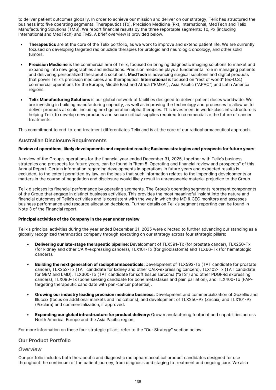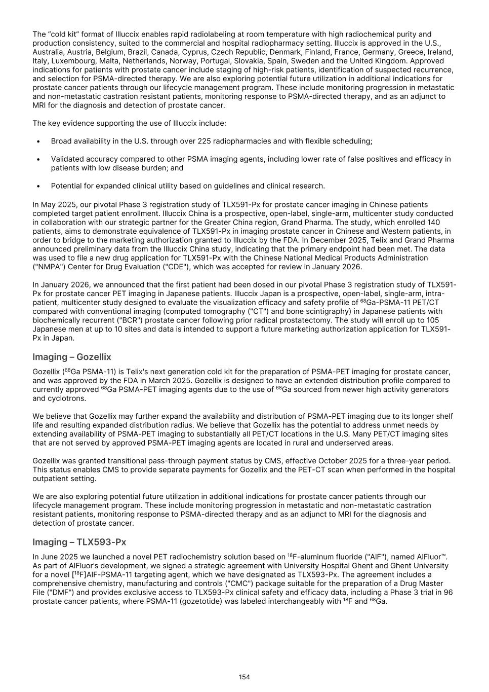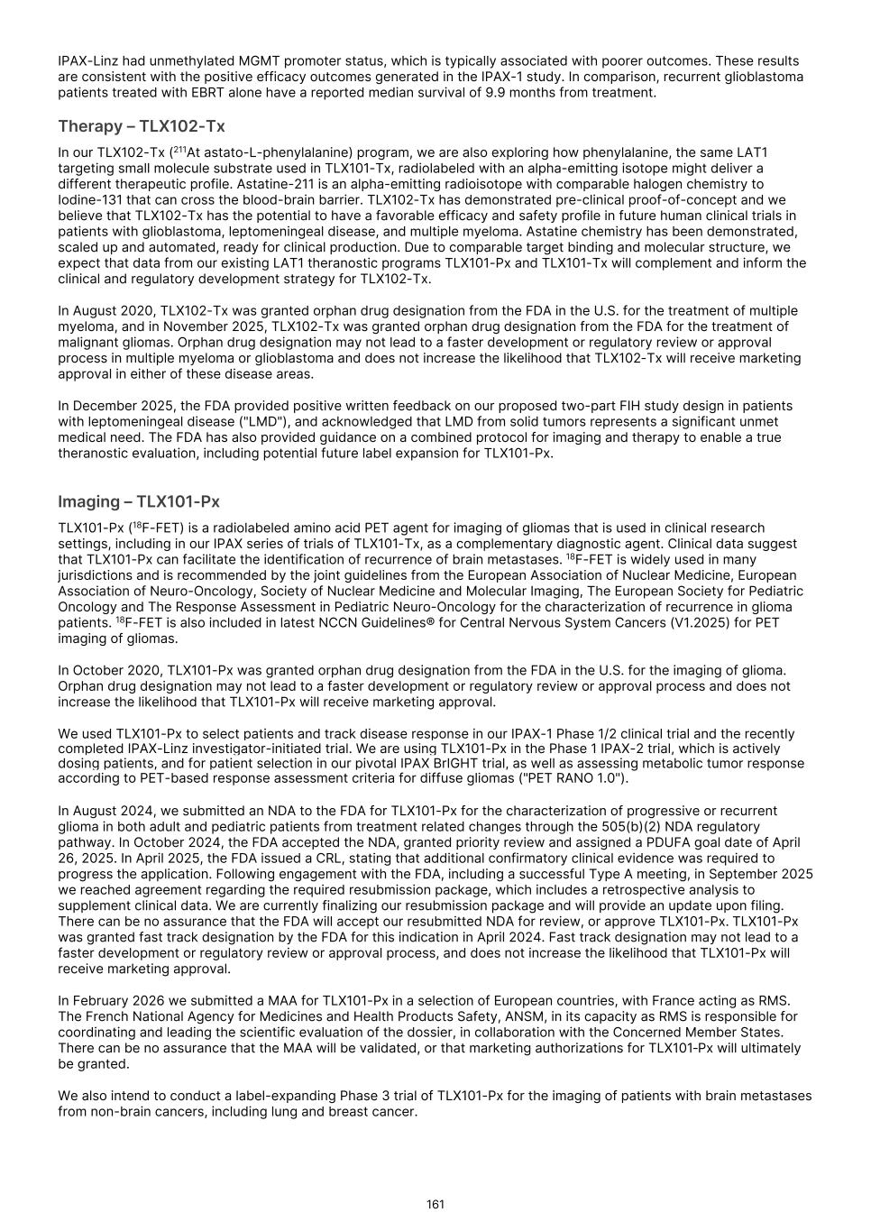 characterization of renal masses as clear cell renal cell carcinoma ("ccRCC"). In July 2024, the FDA declined to review the BLA and issued a Refuse to File ("RTF"), determination. A RTF determination is a response from the FDA following its preliminary review, communicating the FDA’s determination that the application does not include all pertinent information and data. The denial of acceptance for filing was based on a filing concern related to demonstrating adequate sterility assurance during dispensing of TLX250-Px in the radiopharmacy production environment. In December 2024 we resubmitted our BLA to the FDA for TLX250-Px, and the FDA accepted our application in February 2025. In August 2025, the FDA issued a Complete Response Letter ("CRL"), citing deficiencies relating to the Chemistry, Manufacturing, and Controls ("CMC") package. The FDA requested additional data to establish comparability between the drug product used in the ZIRCON Phase 3 clinical trial and the scaled-up manufacturing process intended for commercial use. Additionally, the FDA documented notices of deficiency (Form 483) issued to two third-party manufacturing and supply chain partners that required remediation prior to resubmission. In December 2025 we participated in a Type A meeting with the FDA to align on plans to address CMC deficiencies cited, and in January 2026 we participated in an additional Type A meeting to align on plans to address comparability between the clinical drug product and that intended for commercial use. Following these meetings, Telix believes it has alignment with the Agency on key resubmission aspects. While we believe that the planned remediation of the BLA for TLX250-Px will meet FDA requirements, there can be no assurance that, once re-submitted, the FDA will accept our BLA for review, or approve TLX250-Px. In August 2024, we submitted a NDA for TLX101-Px for the characterization of progressive or recurrent glioma from treatment related changes in both adult and pediatric patients. In October 2024, the FDA accepted the New Drug Application ("NDA"), and granted priority review and assigned a Prescription Drug User Fee Act ("PDUFA"), goal date of April 26, 2025. In April 2025, the FDA issued a CRL, stating that additional confirmatory clinical evidence was required to progress the application. Following engagement with the FDA, including a successful Type A meeting, in September 2025 we reached agreement with the FDA regarding our NDA and are finalizing our resubmission package. There can be no assurance that the FDA will accept our resubmitted NDA for review, or approve TLX101-Px. In February 2026, we submitted a Marketing Authorization Application ("MAA") for TLX101-Px in Europe, with France acting as the Reference Member State ("RMS"). The French National Agency for Medicines and Health Products Safety ("ANSM") in its capacity as RMS is responsible for coordinating and leading the scientific evaluation of the dossier, in collaboration with the Concerned Member States, nominated by Telix and representing the major European markets for Telix’s brain cancer imaging product. There can be no assurance that the MAA will be validated, or that marketing authorizations for TLX101‑Px will ultimately be granted. Any adverse action by the FDA with respect to the BLA or NDAs, could delay our planned commercial development timelines or could prevent us from commercializing these product candidates. If the FDA determines that our submissions and the data supporting the submissions are not sufficient to support approval in these indications, we may be required to conduct an additional clinical trial or trials, which would increase our costs and delay the program. Any such delay or other adverse impact could have a material adverse effect on our business. We have not submitted any applications for regulatory approval or obtained regulatory approval for any of our therapeutic product candidates. Our most advanced therapeutic candidate, TLX591-Tx (lutetium (Lu177) rosopatamab tetraxetan), is a lutetium-labeled radio antibody-drug conjugate ("rADC"), which we are evaluating in a two-part Phase 3 clinical trial in patients with advanced prostate cancer, called ProstACT Global. We dosed the first patient in this clinical trial in November 2023 in Australia. We received authorization to conduct Part 1 of the trial in the U.S. in April 2024 and completed target enrollment of 30 patients in August 2025. We dosed the first patient in ProstACT Global Part 2 (randomized treatment expansion) in Australia in December 2025. We cannot be certain that TLX591-Tx, or any of our clinical trials of our other therapeutic product candidates, will generate safety and efficacy data sufficient for regulatory approval in any jurisdiction. The commercial success of our Commercial Products and our product candidates, if approved, is dependent on many factors, some of which are beyond our control, including clinical development, the regulatory submission and approval process, market access or reimbursement frameworks, potential threats to our intellectual property rights and the manufacturing, marketing and sales efforts. If we are unable to continue to commercialize our Commercial Products or to develop, receive regulatory approval for and successfully commercialize our product candidates, or experience delays as a result of any of these factors or otherwise, our business and results of operations could be substantially harmed. Clinical development is a lengthy and expensive process, with uncertain timelines and outcomes. If clinical trials of our product candidates fail to demonstrate safety and efficacy to the satisfaction of regulatory authorities or do not otherwise produce positive results, we may incur additional costs or experience delays in completing, or ultimately be unable to complete, the development and commercialization of such product candidates, if approved. Our long-term success depends in large part on