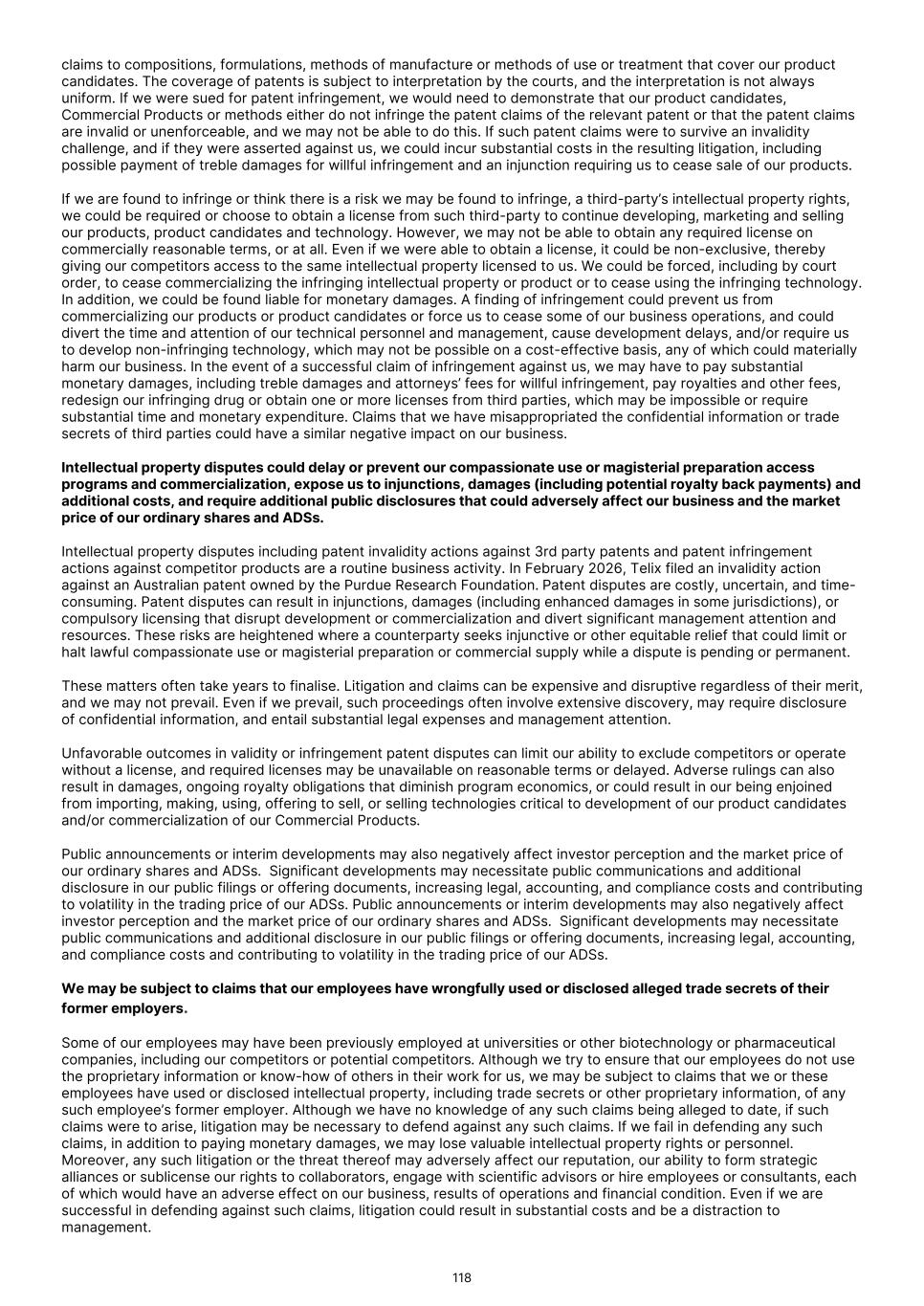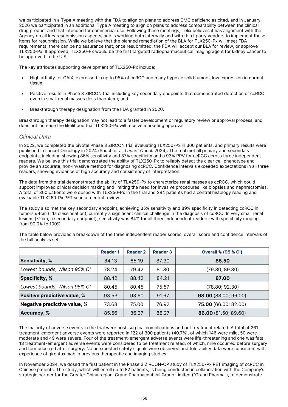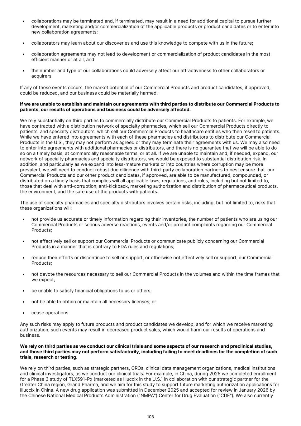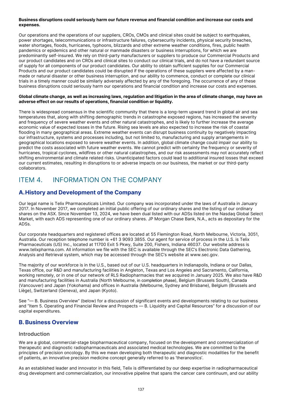 characterization of renal masses as clear cell renal cell carcinoma ("ccRCC"). In July 2024, the FDA declined to review the BLA and issued a Refuse to File ("RTF"), determination. A RTF determination is a response from the FDA following its preliminary review, communicating the FDA’s determination that the application does not include all pertinent information and data. The denial of acceptance for filing was based on a filing concern related to demonstrating adequate sterility assurance during dispensing of TLX250-Px in the radiopharmacy production environment. In December 2024 we resubmitted our BLA to the FDA for TLX250-Px, and the FDA accepted our application in February 2025. In August 2025, the FDA issued a Complete Response Letter ("CRL"), citing deficiencies relating to the Chemistry, Manufacturing, and Controls ("CMC") package. The FDA requested additional data to establish comparability between the drug product used in the ZIRCON Phase 3 clinical trial and the scaled-up manufacturing process intended for commercial use. Additionally, the FDA documented notices of deficiency (Form 483) issued to two third-party manufacturing and supply chain partners that required remediation prior to resubmission. In December 2025 we participated in a Type A meeting with the FDA to align on plans to address CMC deficiencies cited, and in January 2026 we participated in an additional Type A meeting to align on plans to address comparability between the clinical drug product and that intended for commercial use. Following these meetings, Telix believes it has alignment with the Agency on key resubmission aspects. While we believe that the planned remediation of the BLA for TLX250-Px will meet FDA requirements, there can be no assurance that, once re-submitted, the FDA will accept our BLA for review, or approve TLX250-Px. In August 2024, we submitted a NDA for TLX101-Px for the characterization of progressive or recurrent glioma from treatment related changes in both adult and pediatric patients. In October 2024, the FDA accepted the New Drug Application ("NDA"), and granted priority review and assigned a Prescription Drug User Fee Act ("PDUFA"), goal date of April 26, 2025. In April 2025, the FDA issued a CRL, stating that additional confirmatory clinical evidence was required to progress the application. Following engagement with the FDA, including a successful Type A meeting, in September 2025 we reached agreement with the FDA regarding our NDA and are finalizing our resubmission package. There can be no assurance that the FDA will accept our resubmitted NDA for review, or approve TLX101-Px. In February 2026, we submitted a Marketing Authorization Application ("MAA") for TLX101-Px in Europe, with France acting as the Reference Member State ("RMS"). The French National Agency for Medicines and Health Products Safety ("ANSM") in its capacity as RMS is responsible for coordinating and leading the scientific evaluation of the dossier, in collaboration with the Concerned Member States, nominated by Telix and representing the major European markets for Telix’s brain cancer imaging product. There can be no assurance that the MAA will be validated, or that marketing authorizations for TLX101‑Px will ultimately be granted. Any adverse action by the FDA with respect to the BLA or NDAs, could delay our planned commercial development timelines or could prevent us from commercializing these product candidates. If the FDA determines that our submissions and the data supporting the submissions are not sufficient to support approval in these indications, we may be required to conduct an additional clinical trial or trials, which would increase our costs and delay the program. Any such delay or other adverse impact could have a material adverse effect on our business. We have not submitted any applications for regulatory approval or obtained regulatory approval for any of our therapeutic product candidates. Our most advanced therapeutic candidate, TLX591-Tx (lutetium (Lu177) rosopatamab tetraxetan), is a lutetium-labeled radio antibody-drug conjugate ("rADC"), which we are evaluating in a two-part Phase 3 clinical trial in patients with advanced prostate cancer, called ProstACT Global. We dosed the first patient in this clinical trial in November 2023 in Australia. We received authorization to conduct Part 1 of the trial in the U.S. in April 2024 and completed target enrollment of 30 patients in August 2025. We dosed the first patient in ProstACT Global Part 2 (randomized treatment expansion) in Australia in December 2025. We cannot be certain that TLX591-Tx, or any of our clinical trials of our other therapeutic product candidates, will generate safety and efficacy data sufficient for regulatory approval in any jurisdiction. The commercial success of our Commercial Products and our product candidates, if approved, is dependent on many factors, some of which are beyond our control, including clinical development, the regulatory submission and approval process, market access or reimbursement frameworks, potential threats to our intellectual property rights and the manufacturing, marketing and sales efforts. If we are unable to continue to commercialize our Commercial Products or to develop, receive regulatory approval for and successfully commercialize our product candidates, or experience delays as a result of any of these factors or otherwise, our business and results of operations could be substantially harmed. Clinical development is a lengthy and expensive process, with uncertain timelines and outcomes. If clinical trials of our product candidates fail to demonstrate safety and efficacy to the satisfaction of regulatory authorities or do not otherwise produce positive results, we may incur additional costs or experience delays in completing, or ultimately be unable to complete, the development and commercialization of such product candidates, if approved. Our long-term success depends in large part on