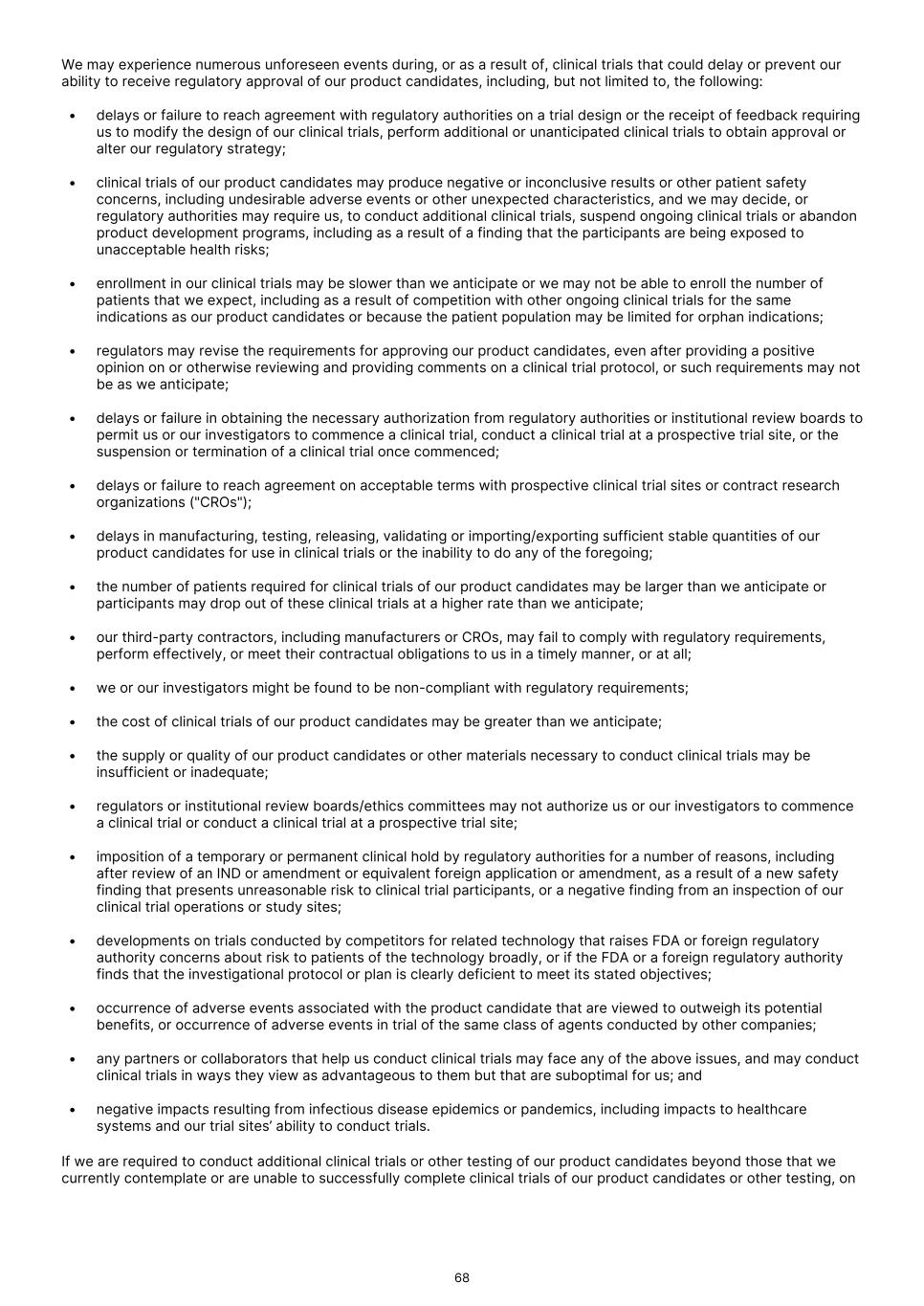 We may experience numerous unforeseen events during, or as a result of, clinical trials that could delay or prevent our ability to receive regulatory approval of our product candidates, including, but not limited to, the following: • delays or failure to reach agreement with regulatory authorities on a trial design or the receipt of feedback requiring us to modify the design of our clinical trials, perform additional or unanticipated clinical trials to obtain approval or alter our regulatory strategy; • clinical trials of our product candidates may produce negative or inconclusive results or other patient safety concerns, including undesirable adverse events or other unexpected characteristics, and we may decide, or regulatory authorities may require us, to conduct additional clinical trials, suspend ongoing clinical trials or abandon product development programs, including as a result of a finding that the participants are being exposed to unacceptable health risks; • enrollment in our clinical trials may be slower than we anticipate or we may not be able to enroll the number of patients that we expect, including as a result of competition with other ongoing clinical trials for the same indications as our product candidates or because the patient population may be limited for orphan indications; • regulators may revise the requirements for approving our product candidates, even after providing a positive opinion on or otherwise reviewing and providing comments on a clinical trial protocol, or such requirements may not be as we anticipate; • delays or failure in obtaining the necessary authorization from regulatory authorities or institutional review boards to permit us or our investigators to commence a clinical trial, conduct a clinical trial at a prospective trial site, or the suspension or termination of a clinical trial once commenced; • delays or failure to reach agreement on acceptable terms with prospective clinical trial sites or contract research organizations ("CROs"); • delays in manufacturing, testing, releasing, validating or importing/exporting sufficient stable quantities of our product candidates for use in clinical trials or the inability to do any of the foregoing; • the number of patients required for clinical trials of our product candidates may be larger than we anticipate or participants may drop out of these clinical trials at a higher rate than we anticipate; • our third-party contractors, including manufacturers or CROs, may fail to comply with regulatory requirements, perform effectively, or meet their contractual obligations to us in a timely manner, or at all; • we or our investigators might be found to be non-compliant with regulatory requirements; • the cost of clinical trials of our product candidates may be greater than we anticipate; • the supply or quality of our product candidates or other materials necessary to conduct clinical trials may be insufficient or inadequate; • regulators or institutional review boards/ethics committees may not authorize us or our investigators to commence a clinical trial or conduct a clinical trial at a prospective trial site; • imposition of a temporary or permanent clinical hold by regulatory authorities for a number of reasons, including after review of an IND or amendment or equivalent foreign application or amendment, as a result of a new safety finding that presents unreasonable risk to clinical trial participants, or a negative finding from an inspection of our clinical trial operations or study sites; • developments on trials conducted by competitors for related technology that raises FDA or foreign regulatory authority concerns about risk to patients of the technology broadly, or if the FDA or a foreign regulatory authority finds that the investigational protocol or plan is clearly deficient to meet its stated objectives; • occurrence of adverse events associated with the product candidate that are viewed to outweigh its potential benefits, or occurrence of adverse events in trial of the same class of agents conducted by other companies; • any partners or collaborators that help us conduct clinical trials may face any of the above issues, and may conduct clinical trials in ways they view as advantageous to them but that are suboptimal for us; and • negative impacts resulting from infectious disease epidemics or pandemics, including impacts to healthcare systems and our trial sites’ ability to conduct trials. If we are required to conduct additional clinical trials or other testing of our product candidates beyond those that we currently contemplate or are unable to successfully complete clinical trials of our product candidates or other testing, on 68