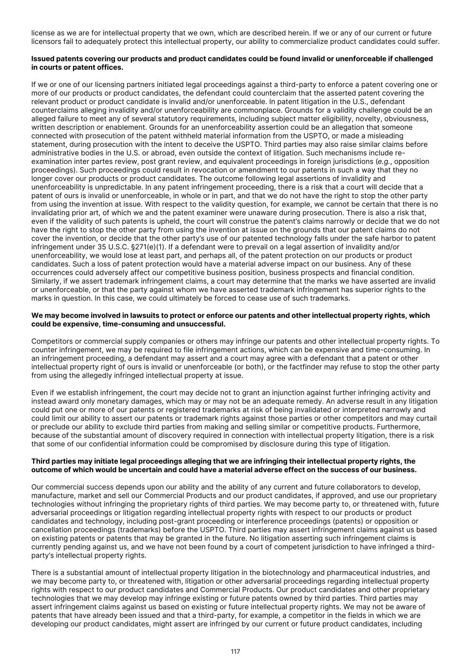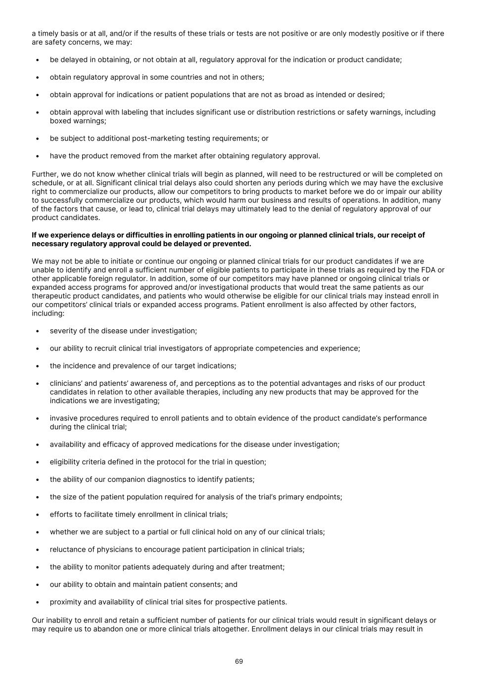 a timely basis or at all, and/or if the results of these trials or tests are not positive or are only modestly positive or if there are safety concerns, we may: • be delayed in obtaining, or not obtain at all, regulatory approval for the indication or product candidate; • obtain regulatory approval in some countries and not in others; • obtain approval for indications or patient populations that are not as broad as intended or desired; • obtain approval with labeling that includes significant use or distribution restrictions or safety warnings, including boxed warnings; • be subject to additional post-marketing testing requirements; or • have the product removed from the market after obtaining regulatory approval. Further, we do not know whether clinical trials will begin as planned, will need to be restructured or will be completed on schedule, or at all. Significant clinical trial delays also could shorten any periods during which we may have the exclusive right to commercialize our products, allow our competitors to bring products to market before we do or impair our ability to successfully commercialize our products, which would harm our business and results of operations. In addition, many of the factors that cause, or lead to, clinical trial delays may ultimately lead to the denial of regulatory approval of our product candidates. If we experience delays or difficulties in enrolling patients in our ongoing or planned clinical trials, our receipt of necessary regulatory approval could be delayed or prevented. We may not be able to initiate or continue our ongoing or planned clinical trials for our product candidates if we are unable to identify and enroll a sufficient number of eligible patients to participate in these trials as required by the FDA or other applicable foreign regulator. In addition, some of our competitors may have planned or ongoing clinical trials or expanded access programs for approved and/or investigational products that would treat the same patients as our therapeutic product candidates, and patients who would otherwise be eligible for our clinical trials may instead enroll in our competitors’ clinical trials or expanded access programs. Patient enrollment is also affected by other factors, including: • severity of the disease under investigation; • our ability to recruit clinical trial investigators of appropriate competencies and experience; • the incidence and prevalence of our target indications; • clinicians’ and patients’ awareness of, and perceptions as to the potential advantages and risks of our product candidates in relation to other available therapies, including any new products that may be approved for the indications we are investigating; • invasive procedures required to enroll patients and to obtain evidence of the product candidate’s performance during the clinical trial; • availability and efficacy of approved medications for the disease under investigation; • eligibility criteria defined in the protocol for the trial in question; • the ability of our companion diagnostics to identify patients; • the size of the patient population required for analysis of the trial’s primary endpoints; • efforts to facilitate timely enrollment in clinical trials; • whether we are subject to a partial or full clinical hold on any of our clinical trials; • reluctance of physicians to encourage patient participation in clinical trials; • the ability to monitor patients adequately during and after treatment; • our ability to obtain and maintain patient consents; and • proximity and availability of clinical trial sites for prospective patients. Our inability to enroll and retain a sufficient number of patients for our clinical trials would result in significant delays or may require us to abandon one or more clinical trials altogether. Enrollment delays in our clinical trials may result in 69
