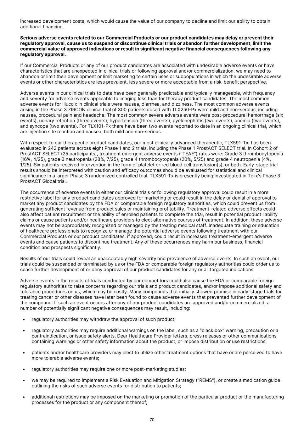 increased development costs, which would cause the value of our company to decline and limit our ability to obtain additional financing. Serious adverse events related to our Commercial Products or our product candidates may delay or prevent their regulatory approval, cause us to suspend or discontinue clinical trials or abandon further development, limit the commercial value of approved indications or result in significant negative financial consequences following any regulatory approval. If our Commercial Products or any of our product candidates are associated with undesirable adverse events or have characteristics that are unexpected in clinical trials or following approval and/or commercialization, we may need to abandon or limit their development or limit marketing to certain uses or subpopulations in which the undesirable adverse events or other characteristics are less prevalent, less severe or more acceptable from a risk-benefit perspective. Adverse events in our clinical trials to date have been generally predictable and typically manageable, with frequency and severity for adverse events applicable to imaging less than for therapy product candidates. The most common adverse events for Illuccix in clinical trials were nausea, diarrhea, and dizziness. The most common adverse events arising in the Phase 3 ZIRCON clinical trial of 300 patients dosed with TLX250-Px were mild and non-serious, including nausea, procedural pain and headache. The most common severe adverse events were post-procedural hemorrhage (six events), urinary retention (three events), hypertension (three events), pyelonephritis (two events), anemia (two events), and syncope (two events). For TLX101-Px there have been two events reported to date in an ongoing clinical trial, which are injection site reaction and nausea, both mild and non-serious. With respect to our therapeutic product candidates, our most clinically advanced therapeutic, TLX591-Tx, has been evaluated in 242 patients across eight Phase 1 and 2 trials, including the Phase 1 ProstACT SELECT trial. In Cohort 2 of ProstACT SELECT (25 participants), treatment emergent adverse events ("TEAE") rates were: Grade 3 thrombocytopenia (16%, 4/25), grade 3 neutropenia (28%, 7/25), grade 4 thrombocytopenia (20%, 5/25) and grade 4 neutropenia (4%, 1/25). Six patients received intervention in the form of platelet or red blood cell transfusion(s), or both. Early-stage trial results should be interpreted with caution and efficacy outcomes should be evaluated for statistical and clinical significance in a larger Phase 3 randomized controlled trial. TLX591-Tx is presently being investigated in Telix's Phase 3 ProstACT Global trial. The occurrence of adverse events in either our clinical trials or following regulatory approval could result in a more restrictive label for any product candidates approved for marketing or could result in the delay or denial of approval to market any product candidates by the FDA or comparable foreign regulatory authorities, which could prevent us from generating sufficient revenue from product sales or maintaining profitability. Treatment-related adverse effects could also affect patient recruitment or the ability of enrolled patients to complete the trial, result in potential product liability claims or cause patients and/or healthcare providers to elect alternative courses of treatment. In addition, these adverse events may not be appropriately recognized or managed by the treating medical staff. Inadequate training or education of healthcare professionals to recognize or manage the potential adverse events following treatment with our Commercial Products or our product candidates, if approved, could result in increased treatment-emergent adverse events and cause patients to discontinue treatment. Any of these occurrences may harm our business, financial condition and prospects significantly. Results of our trials could reveal an unacceptably high severity and prevalence of adverse events. In such an event, our trials could be suspended or terminated by us or the FDA or comparable foreign regulatory authorities could order us to cease further development of or deny approval of our product candidates for any or all targeted indications. Adverse events in the results of trials conducted by our competitors could also cause the FDA or comparable foreign regulatory authorities to raise concerns regarding our trials and product candidates, and/or impose additional safety and tolerance procedures on us, which may be costly. Many compounds that initially showed promise in early-stage trials for treating cancer or other diseases have later been found to cause adverse events that prevented further development of the compound. If such an event occurs after any of our product candidates are approved and/or commercialized, a number of potentially significant negative consequences may result, including: • regulatory authorities may withdraw the approval of such product; • regulatory authorities may require additional warnings on the label, such as a “black box” warning, precaution or a contraindication, or issue safety alerts, Dear Healthcare Provider letters, press releases or other communications containing warnings or other safety information about the product, or impose distribution or use restrictions; • patients and/or healthcare providers may elect to utilize other treatment options that have or are perceived to have more tolerable adverse events; • regulatory authorities may require one or more post-marketing studies; • we may be required to implement a Risk Evaluation and Mitigation Strategy ("REMS"), or create a medication guide outlining the risks of such adverse events for distribution to patients; • additional restrictions may be imposed on the marketing or promotion of the particular product or the manufacturing processes for the product or any component thereof; 70