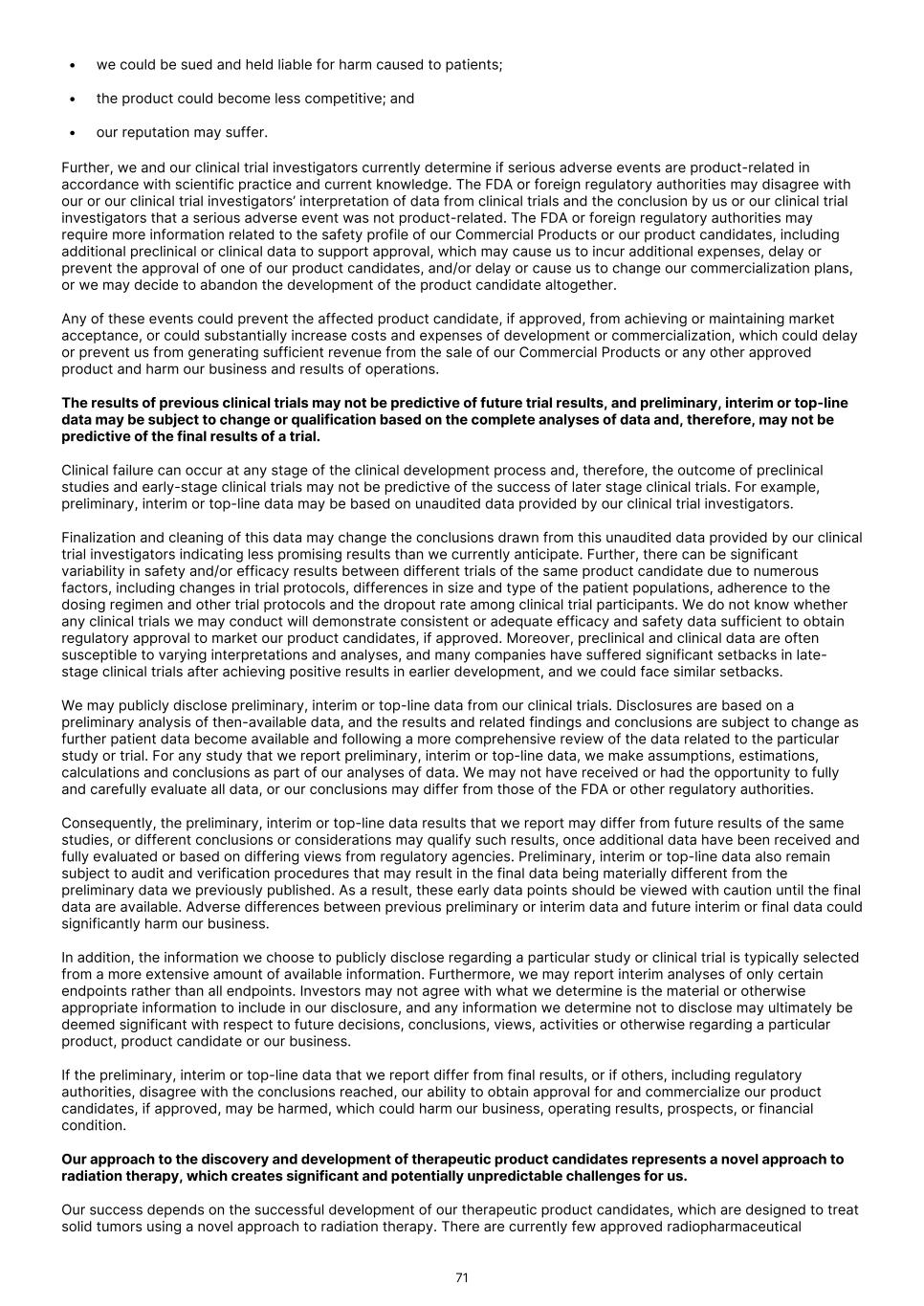 • we could be sued and held liable for harm caused to patients; • the product could become less competitive; and • our reputation may suffer. Further, we and our clinical trial investigators currently determine if serious adverse events are product-related in accordance with scientific practice and current knowledge. The FDA or foreign regulatory authorities may disagree with our or our clinical trial investigators’ interpretation of data from clinical trials and the conclusion by us or our clinical trial investigators that a serious adverse event was not product-related. The FDA or foreign regulatory authorities may require more information related to the safety profile of our Commercial Products or our product candidates, including additional preclinical or clinical data to support approval, which may cause us to incur additional expenses, delay or prevent the approval of one of our product candidates, and/or delay or cause us to change our commercialization plans, or we may decide to abandon the development of the product candidate altogether. Any of these events could prevent the affected product candidate, if approved, from achieving or maintaining market acceptance, or could substantially increase costs and expenses of development or commercialization, which could delay or prevent us from generating sufficient revenue from the sale of our Commercial Products or any other approved product and harm our business and results of operations. The results of previous clinical trials may not be predictive of future trial results, and preliminary, interim or top-line data may be subject to change or qualification based on the complete analyses of data and, therefore, may not be predictive of the final results of a trial. Clinical failure can occur at any stage of the clinical development process and, therefore, the outcome of preclinical studies and early-stage clinical trials may not be predictive of the success of later stage clinical trials. For example, preliminary, interim or top-line data may be based on unaudited data provided by our clinical trial investigators. Finalization and cleaning of this data may change the conclusions drawn from this unaudited data provided by our clinical trial investigators indicating less promising results than we currently anticipate. Further, there can be significant variability in safety and/or efficacy results between different trials of the same product candidate due to numerous factors, including changes in trial protocols, differences in size and type of the patient populations, adherence to the dosing regimen and other trial protocols and the dropout rate among clinical trial participants. We do not know whether any clinical trials we may conduct will demonstrate consistent or adequate efficacy and safety data sufficient to obtain regulatory approval to market our product candidates, if approved. Moreover, preclinical and clinical data are often susceptible to varying interpretations and analyses, and many companies have suffered significant setbacks in late- stage clinical trials after achieving positive results in earlier development, and we could face similar setbacks. We may publicly disclose preliminary, interim or top-line data from our clinical trials. Disclosures are based on a preliminary analysis of then-available data, and the results and related findings and conclusions are subject to change as further patient data become available and following a more comprehensive review of the data related to the particular study or trial. For any study that we report preliminary, interim or top-line data, we make assumptions, estimations, calculations and conclusions as part of our analyses of data. We may not have received or had the opportunity to fully and carefully evaluate all data, or our conclusions may differ from those of the FDA or other regulatory authorities. Consequently, the preliminary, interim or top-line data results that we report may differ from future results of the same studies, or different conclusions or considerations may qualify such results, once additional data have been received and fully evaluated or based on differing views from regulatory agencies. Preliminary, interim or top-line data also remain subject to audit and verification procedures that may result in the final data being materially different from the preliminary data we previously published. As a result, these early data points should be viewed with caution until the final data are available. Adverse differences between previous preliminary or interim data and future interim or final data could significantly harm our business. In addition, the information we choose to publicly disclose regarding a particular study or clinical trial is typically selected from a more extensive amount of available information. Furthermore, we may report interim analyses of only certain endpoints rather than all endpoints. Investors may not agree with what we determine is the material or otherwise appropriate information to include in our disclosure, and any information we determine not to disclose may ultimately be deemed significant with respect to future decisions, conclusions, views, activities or otherwise regarding a particular product, product candidate or our business. If the preliminary, interim or top-line data that we report differ from final results, or if others, including regulatory authorities, disagree with the conclusions reached, our ability to obtain approval for and commercialize our product candidates, if approved, may be harmed, which could harm our business, operating results, prospects, or financial condition. Our approach to the discovery and development of therapeutic product candidates represents a novel approach to radiation therapy, which creates significant and potentially unpredictable challenges for us. Our success depends on the successful development of our therapeutic product candidates, which are designed to treat solid tumors using a 