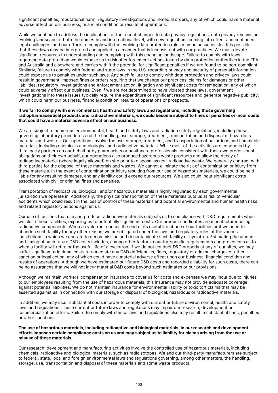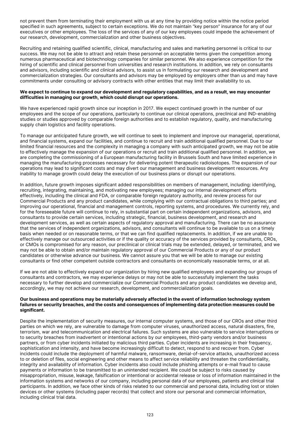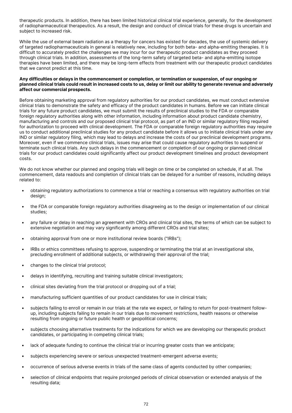 therapeutic products. In addition, there has been limited historical clinical trial experience, generally, for the development of radiopharmaceutical therapeutics. As a result, the design and conduct of clinical trials for these drugs is uncertain and subject to increased risk. While the use of external beam radiation as a therapy for cancers has existed for decades, the use of systemic delivery of targeted radiopharmaceuticals in general is relatively new, including for both beta- and alpha-emitting therapies. It is difficult to accurately predict the challenges we may incur for our therapeutic product candidates as they proceed through clinical trials. In addition, assessments of the long-term safety of targeted beta- and alpha-emitting isotope therapies have been limited, and there may be long-term effects from treatment with our therapeutic product candidates that we cannot predict at this time. Any difficulties or delays in the commencement or completion, or termination or suspension, of our ongoing or planned clinical trials could result in increased costs to us, delay or limit our ability to generate revenue and adversely affect our commercial prospects. Before obtaining marketing approval from regulatory authorities for our product candidates, we must conduct extensive clinical trials to demonstrate the safety and efficacy of the product candidates in humans. Before we can initiate clinical trials for any future product candidates, we must submit the results of preclinical studies to the FDA or comparable foreign regulatory authorities along with other information, including information about product candidate chemistry, manufacturing and controls and our proposed clinical trial protocol, as part of an IND or similar regulatory filing required for authorization to proceed with clinical development. The FDA or comparable foreign regulatory authorities may require us to conduct additional preclinical studies for any product candidate before it allows us to initiate clinical trials under any IND or similar regulatory filing, which may lead to delays and increase the costs of our preclinical development programs. Moreover, even if we commence clinical trials, issues may arise that could cause regulatory authorities to suspend or terminate such clinical trials. Any such delays in the commencement or completion of our ongoing or planned clinical trials for our product candidates could significantly affect our product development timelines and product development costs. We do not know whether our planned and ongoing trials will begin on time or be completed on schedule, if at all. The commencement, data readouts and completion of clinical trials can be delayed for a number of reasons, including delays related to: • obtaining regulatory authorizations to commence a trial or reaching a consensus with regulatory authorities on trial design; • the FDA or comparable foreign regulatory authorities disagreeing as to the design or implementation of our clinical studies; • any failure or delay in reaching an agreement with CROs and clinical trial sites, the terms of which can be subject to extensive negotiation and may vary significantly among different CROs and trial sites; • obtaining approval from one or more institutional review boards ("IRBs"); • IRBs or ethics committees refusing to approve, suspending or terminating the trial at an investigational site, precluding enrollment of additional subjects, or withdrawing their approval of the trial; • changes to the clinical trial protocol; • delays in identifying, recruiting and training suitable clinical investigators; • clinical sites deviating from the trial protocol or dropping out of a trial; • manufacturing sufficient quantities of our product candidates for use in clinical trials; • subjects failing to enroll or remain in our trials at the rate we expect, or failing to return for post-treatment follow- up, including subjects failing to remain in our trials due to movement restrictions, health reasons or otherwise resulting from ongoing or future public health or geopolitical concerns; • subjects choosing alternative treatments for the indications for which we are developing our therapeutic product candidates, or participating in competing clinical trials; • lack of adequate funding to continue the clinical trial or incurring greater costs than we anticipate; • subjects experiencing severe or serious unexpected treatment-emergent adverse events; • occurrence of serious adverse events in trials of the same class of agents conducted by other companies; • selection of clinical endpoints that require prolonged periods of clinical observation or extended analysis of the resulting data; 72