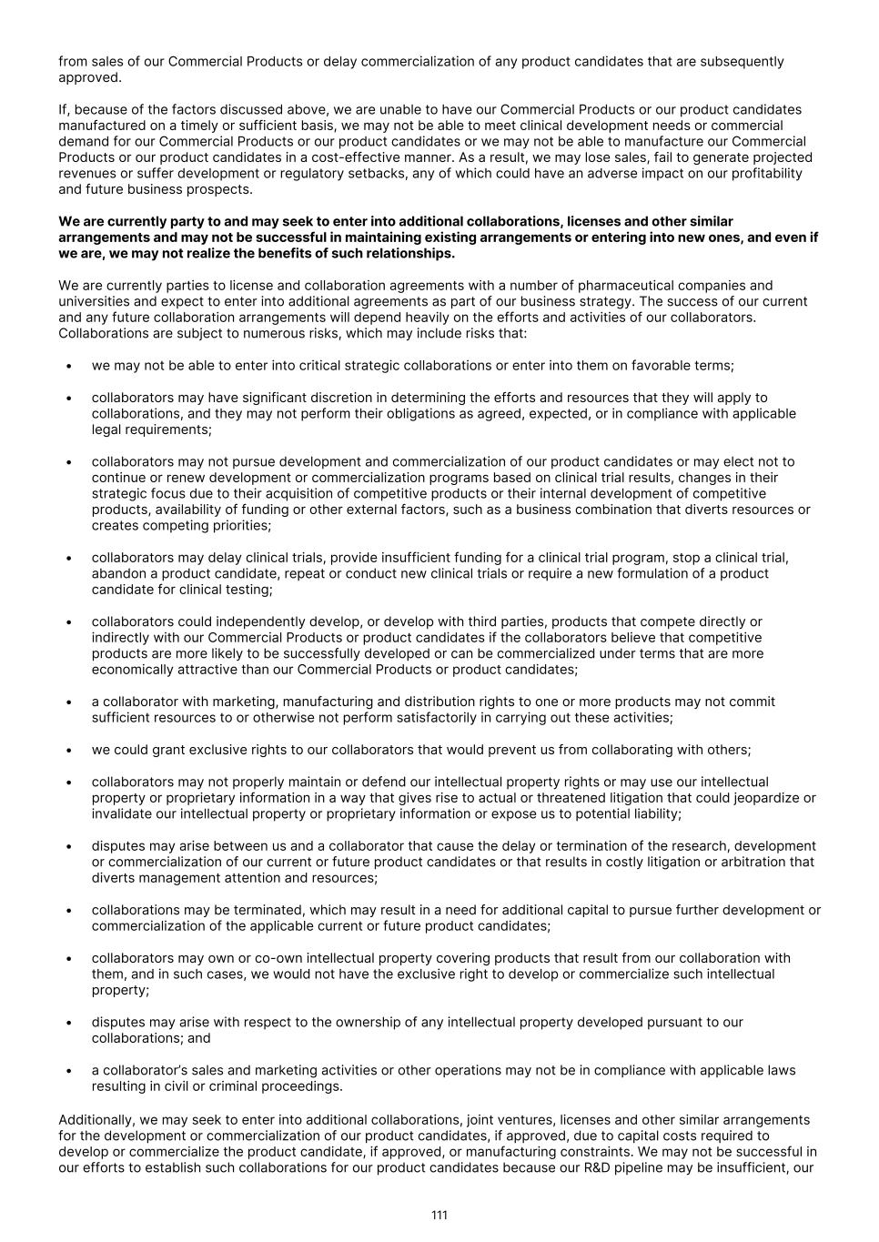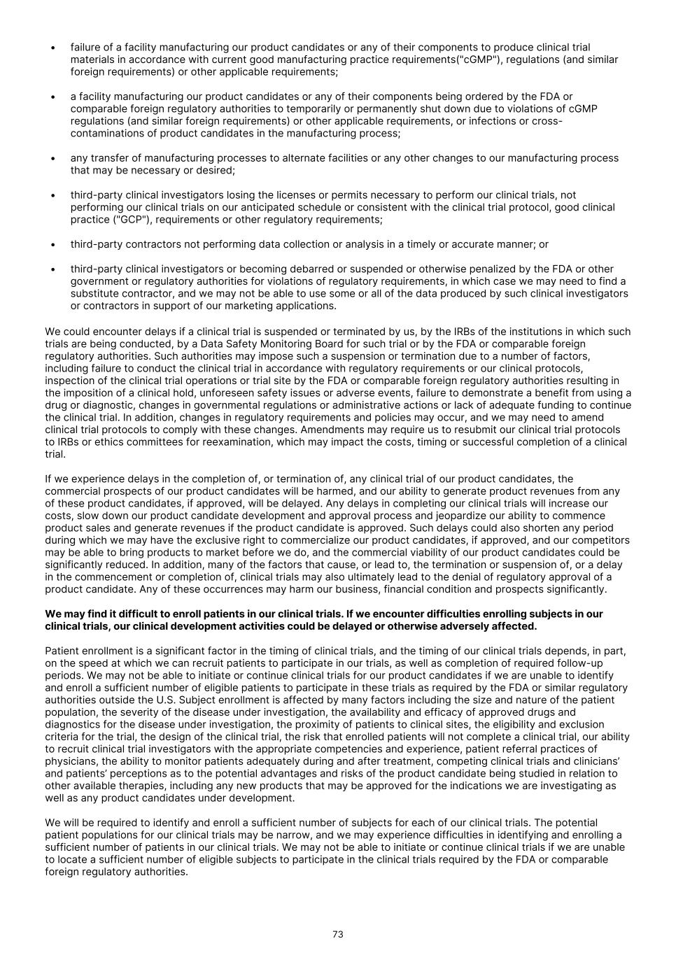 • failure of a facility manufacturing our product candidates or any of their components to produce clinical trial materials in accordance with current good manufacturing practice requirements("cGMP"), regulations (and similar foreign requirements) or other applicable requirements; • a facility manufacturing our product candidates or any of their components being ordered by the FDA or comparable foreign regulatory authorities to temporarily or permanently shut down due to violations of cGMP regulations (and similar foreign requirements) or other applicable requirements, or infections or cross- contaminations of product candidates in the manufacturing process; • any transfer of manufacturing processes to alternate facilities or any other changes to our manufacturing process that may be necessary or desired; • third-party clinical investigators losing the licenses or permits necessary to perform our clinical trials, not performing our clinical trials on our anticipated schedule or consistent with the clinical trial protocol, good clinical practice ("GCP"), requirements or other regulatory requirements; • third-party contractors not performing data collection or analysis in a timely or accurate manner; or • third-party clinical investigators or becoming debarred or suspended or otherwise penalized by the FDA or other government or regulatory authorities for violations of regulatory requirements, in which case we may need to find a substitute contractor, and we may not be able to use some or all of the data produced by such clinical investigators or contractors in support of our marketing applications. We could encounter delays if a clinical trial is suspended or terminated by us, by the IRBs of the institutions in which such trials are being conducted, by a Data Safety Monitoring Board for such trial or by the FDA or comparable foreign regulatory authorities. Such authorities may impose such a suspension or termination due to a number of factors, including failure to conduct the clinical trial in accordance with regulatory requirements or our clinical protocols, inspection of the clinical trial operations or trial site by the FDA or comparable foreign regulatory authorities resulting in the imposition of a clinical hold, unforeseen safety issues or adverse events, failure to demonstrate a benefit from using a drug or diagnostic, changes in governmental regulations or administrative actions or lack of adequate funding to continue the clinical trial. In addition, changes in regulatory requirements and policies may occur, and we may need to amend clinical trial protocols to comply with these changes. Amendments may require us to resubmit our clinical trial protocols to IRBs or ethics committees for reexamination, which may impact the costs, timing or successful completion of a clinical trial. If we experience delays in the completion of, or termination of, any clinical trial of our product candidates, the commercial prospects of our product candidates will be harmed, and our ability to generate product revenues from any of these product candidates, if approved, will be delayed. Any delays in completing our clinical trials will increase our costs, slow down our product candidate development and approval process and jeopardize our ability to commence product sales and generate revenues if the product candidate is approved. Such delays could also shorten any period during which we may have the exclusive right to commercialize our product candidates, if approved, and our competitors may be able to bring products to market before we do, and the commercial viability of our product candidates could be significantly reduced. In addition, many of the factors that cause, or lead to, the termination or suspension of, or a delay in the commencement or completion of, clinical trials may also ultimately lead to the denial of regulatory approval of a product candidate. Any of these occurrences may harm our business, financial condition and prospects significantly. We may find it difficult to enroll patients in our clinical trials. If we encounter difficulties enrolling subjects in our clinical trials, our clinical development activities could be delayed or otherwise adversely affected. Patient enrollment is a significant factor in the timing of clinical trials, and the timing of our clinical trials depends, in part, on the speed at which we can recruit patients to participate in our trials, as well as completion of required follow-up periods. We may not be able to initiate or continue clinical trials for our product candidates if we are unable to identify and enroll a sufficient number of eligible patients to participate in these trials as required by the FDA or similar regulatory authorities outside the U.S. Subject enrollment is affected by many factors including the size and nature of the patient population, the severity of the disease under investigation, the availability and efficacy of approved drugs and diagnostics for the disease under investigation, the proximity of patients to clinical sites, the eligibility and exclusion criteria for the trial, the design of the clinical trial, the risk that enrolled patients will not complete a clinical trial, our ability to recruit clinical trial investigators with the appropriate competencies and experience, patient referral practices of physicians, the ability to monitor patients adequately during and after treatment, competing clinical trials and clinicians’ and patients’ perceptions as to the potential advantages and risks of the product candidate being studied in relation to other available therapies, including any new products that may be approved for the indications we are investigating as well as any product candidates under development. We will be required to identify and enroll a sufficient number of subjects for each of our clinical trials. The potential patient populations for our clinical trials may be narrow, and we may experience di