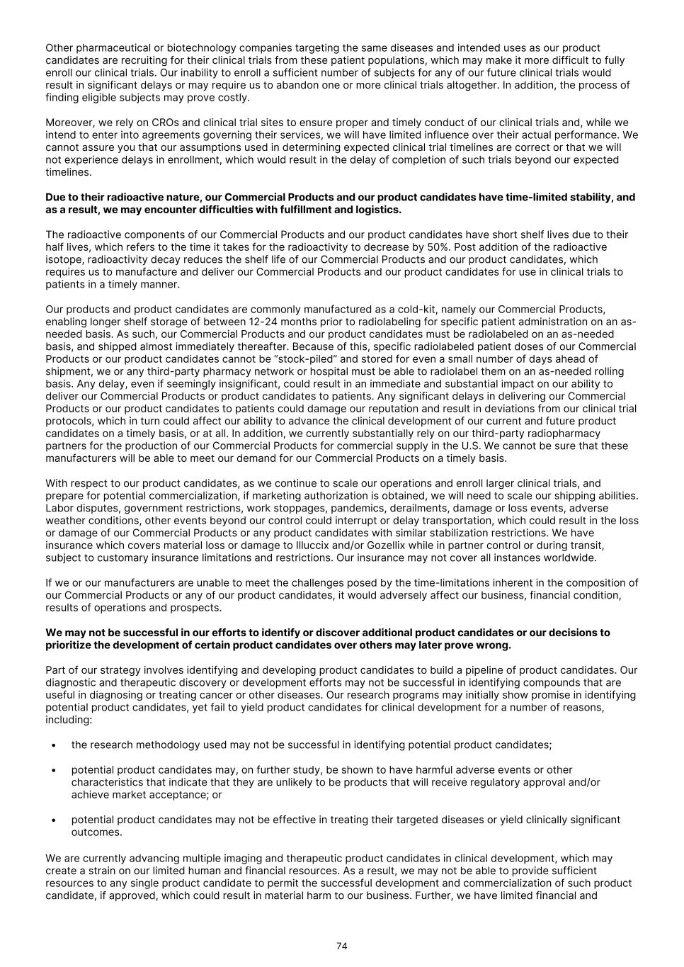 Other pharmaceutical or biotechnology companies targeting the same diseases and intended uses as our product candidates are recruiting for their clinical trials from these patient populations, which may make it more difficult to fully enroll our clinical trials. Our inability to enroll a sufficient number of subjects for any of our future clinical trials would result in significant delays or may require us to abandon one or more clinical trials altogether. In addition, the process of finding eligible subjects may prove costly. Moreover, we rely on CROs and clinical trial sites to ensure proper and timely conduct of our clinical trials and, while we intend to enter into agreements governing their services, we will have limited influence over their actual performance. We cannot assure you that our assumptions used in determining expected clinical trial timelines are correct or that we will not experience delays in enrollment, which would result in the delay of completion of such trials beyond our expected timelines. Due to their radioactive nature, our Commercial Products and our product candidates have time-limited stability, and as a result, we may encounter difficulties with fulfillment and logistics. The radioactive components of our Commercial Products and our product candidates have short shelf lives due to their half lives, which refers to the time it takes for the radioactivity to decrease by 50%. Post addition of the radioactive isotope, radioactivity decay reduces the shelf life of our Commercial Products and our product candidates, which requires us to manufacture and deliver our Commercial Products and our product candidates for use in clinical trials to patients in a timely manner. Our products and product candidates are commonly manufactured as a cold-kit, namely our Commercial Products, enabling longer shelf storage of between 12-24 months prior to radiolabeling for specific patient administration on an as- needed basis. As such, our Commercial Products and our product candidates must be radiolabeled on an as-needed basis, and shipped almost immediately thereafter. Because of this, specific radiolabeled patient doses of our Commercial Products or our product candidates cannot be “stock-piled” and stored for even a small number of days ahead of shipment, we or any third-party pharmacy network or hospital must be able to radiolabel them on an as-needed rolling basis. Any delay, even if seemingly insignificant, could result in an immediate and substantial impact on our ability to deliver our Commercial Products or product candidates to patients. Any significant delays in delivering our Commercial Products or our product candidates to patients could damage our reputation and result in deviations from our clinical trial protocols, which in turn could affect our ability to advance the clinical development of our current and future product candidates on a timely basis, or at all. In addition, we currently substantially rely on our third-party radiopharmacy partners for the production of our Commercial Products for commercial supply in the U.S. We cannot be sure that these manufacturers will be able to meet our demand for our Commercial Products on a timely basis. With respect to our product candidates, as we continue to scale our operations and enroll larger clinical trials, and prepare for potential commercialization, if marketing authorization is obtained, we will need to scale our shipping abilities. Labor disputes, government restrictions, work stoppages, pandemics, derailments, damage or loss events, adverse weather conditions, other events beyond our control could interrupt or delay transportation, which could result in the loss or damage of our Commercial Products or any product candidates with similar stabilization restrictions. We have insurance which covers material loss or damage to Illuccix and/or Gozellix while in partner control or during transit, subject to customary insurance limitations and restrictions. Our insurance may not cover all instances worldwide. If we or our manufacturers are unable to meet the challenges posed by the time-limitations inherent in the composition of our Commercial Products or any of our product candidates, it would adversely affect our business, financial condition, results of operations and prospects. We may not be successful in our efforts to identify or discover additional product candidates or our decisions to prioritize the development of certain product candidates over others may later prove wrong. Part of our strategy involves identifying and developing product candidates to build a pipeline of product candidates. Our diagnostic and therapeutic discovery or development efforts may not be successful in identifying compounds that are useful in diagnosing or treating cancer or other diseases. Our research programs may initially show promise in identifying potential product candidates, yet fail to yield product candidates for clinical development for a number of reasons, including: • the research methodology used may not be successful in identifying potential product candidates; • potential product candidates may, on further study, be shown to have harmful adverse events or other characteristics that indicate that they are unlikely to be products that will receive regulatory approval and/or achieve market acceptance; or • potential product candidates may not be effective in treating their targeted diseases or yield clinically significant outcomes. We are currently advancing multiple imaging and therapeutic product candidates in clinical development, which may create a strain on our limited human and financial resources. As a result, we may not be able to provide sufficient resources to any single product candidate to permit the successful development and commercialization of such product candidate, if approved, which could result in material harm to our business. Further, we have limited financial and 74