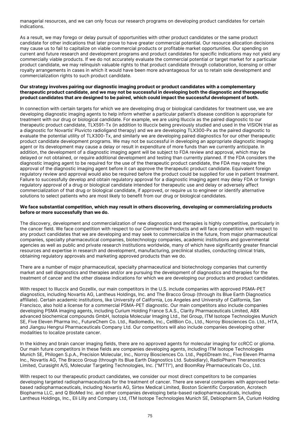 managerial resources, and we can only focus our research programs on developing product candidates for certain indications. As a result, we may forego or delay pursuit of opportunities with other product candidates or the same product candidate for other indications that later prove to have greater commercial potential. Our resource allocation decisions may cause us to fail to capitalize on viable commercial products or profitable market opportunities. Our spending on current and future research and development programs and product candidates for specific indications may not yield any commercially viable products. If we do not accurately evaluate the commercial potential or target market for a particular product candidate, we may relinquish valuable rights to that product candidate through collaboration, licensing or other royalty arrangements in cases in which it would have been more advantageous for us to retain sole development and commercialization rights to such product candidate. Our strategy involves pairing our diagnostic imaging product or product candidates with a complementary therapeutic product candidate, and we may not be successful in developing both the diagnostic and therapeutic product candidates that are designed to be paired, which could impact the successful development of both. In connection with certain targets for which we are developing drug or biological candidates for treatment use, we are developing diagnostic imaging agents to help inform whether a particular patient’s disease condition is appropriate for treatment with our drug or biological candidate. For example, we are using Illuccix as the paired diagnostic to our therapeutic product candidate, TLX591-Tx (in addition to Illuccix being previously studied and used in the VISION trial as a diagnostic for Novartis’ Pluvicto radioligand therapy) and we are developing TLX300-Px as the paired diagnostic to evaluate the potential utility of TLX300-Tx, and similarly we are developing paired diagnostics for our other therapeutic product candidate development programs. We may not be successful in developing an appropriate diagnostic imaging agent or its development may cause a delay or result in expenditure of more funds than we currently anticipate. In addition, the development of a diagnostic imaging agent will be subject to FDA review and approval, which may be delayed or not obtained, or require additional development and testing than currently planned. If the FDA considers the diagnostic imaging agent to be required for the use of the therapeutic product candidate, the FDA may require the approval of the diagnostic imaging agent before it can approve the therapeutic product candidate. Equivalent foreign regulatory review and approval would also be required before the product could be supplied for use in patient treatment. Failure to successfully develop and obtain regulatory approval for a diagnostic imaging agent may delay FDA or foreign regulatory approval of a drug or biological candidate intended for therapeutic use and delay or adversely affect commercialization of that drug or biological candidate, if approved, or require us to engineer or identify alternative solutions to select patients who are most likely to benefit from our drug or biological candidates. We face substantial competition, which may result in others discovering, developing or commercializing products before or more successfully than we do. The discovery, development and commercialization of new diagnostics and therapies is highly competitive, particularly in the cancer field. We face competition with respect to our Commercial Products and will face competition with respect to any product candidates that we are developing and may seek to commercialize in the future, from major pharmaceutical companies, specialty pharmaceutical companies, biotechnology companies, academic institutions and governmental agencies as well as public and private research institutions worldwide, many of which have significantly greater financial resources and expertise in research and development, manufacturing, preclinical studies, conducting clinical trials, obtaining regulatory approvals and marketing approved products than we do. There are a number of major pharmaceutical, specialty pharmaceutical and biotechnology companies that currently market and sell diagnostics and therapies and/or are pursuing the development of diagnostics and therapies for the treatment of cancer and the other disease indications for which we are developing our products and product candidates. With respect to Illuccix and Gozellix, our main competitors in the U.S. include companies with approved PSMA-PET diagnostics, including Novartis AG, Lantheus Holdings, Inc. and The Bracco Group (through its Blue Earth Diagnostics affiliate). Certain academic institutions, like University of California, Los Angeles and University of California, San Francisco, also hold a license for a commercial PSMA-PET diagnostic. Our main competitors also include companies developing PSMA imaging agents, including Curium Holding France S.A.S., Clarity Pharmaceuticals Limited, ABX advanced biochemical compounds GmbH, Isotopia Molecular Imaging Ltd., Itel Group, ITM Isotope Technologies Munich SE, Five Eleven Pharma Inc., FutureChem Co. Ltd., Radiomedix, Inc., CellBion Co., Ltd., Norroy Biosciences Co. Ltd., HTA, and Jiangsu Hengrui Pharmaceuticals Company Ltd. Our competitors will also include companies developing other modalities to localize prostate cancer. In the kidney and brain cancer imaging fields, there are no approved agents for molecular imaging for ccRCC or glioma. Our main future competitors in these fields are companies developing agents, including ITM Isotope Technologies Munich SE, Philogen S.p.A., Precision Molecular, Inc., Norroy Biosciences Co. Ltd., PeptiDream Inc., Five Eleven Pharma Inc., Novartis AG, The Bracco Group (through its Blue Earth Diagnostics Ltd. Subsidiary), RadioPharm Th