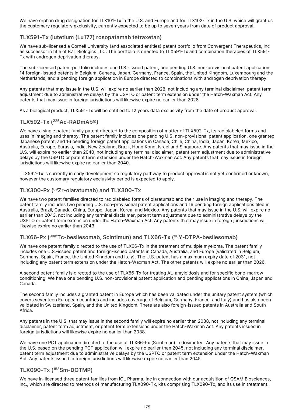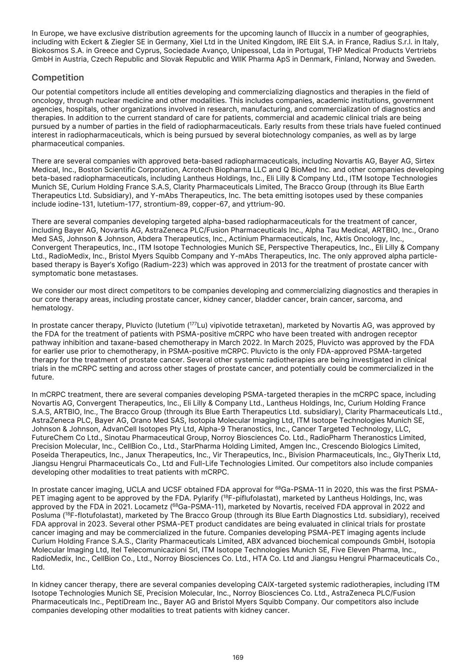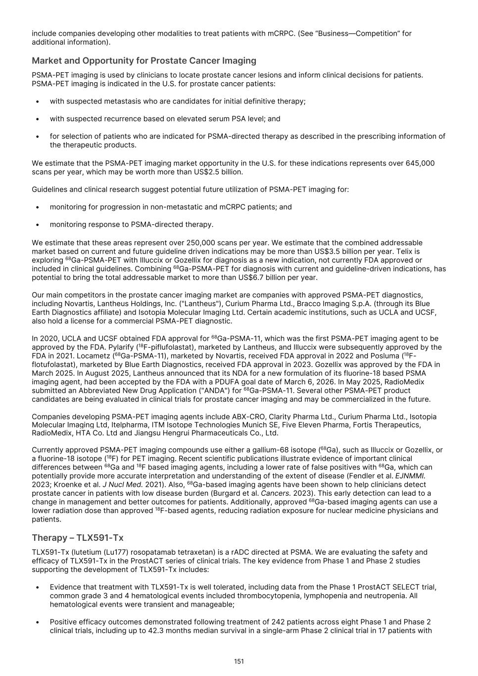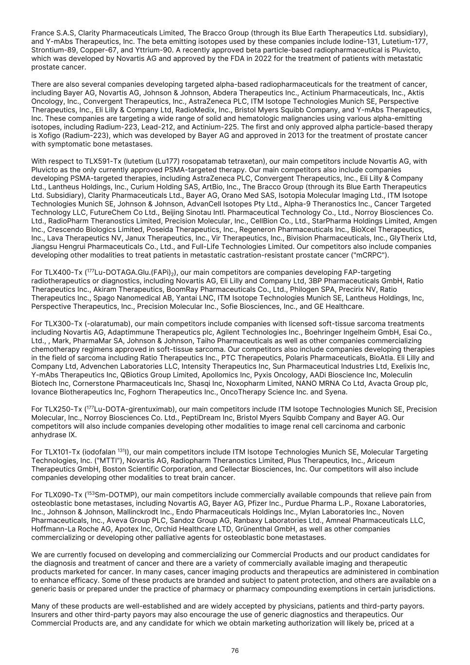 France S.A.S, Clarity Pharmaceuticals Limited, The Bracco Group (through its Blue Earth Therapeutics Ltd. subsidiary), and Y-mAbs Therapeutics, Inc. The beta emitting isotopes used by these companies include Iodine-131, Lutetium-177, Strontium-89, Copper-67, and Yttrium-90. A recently approved beta particle-based radiopharmaceutical is Pluvicto, which was developed by Novartis AG and approved by the FDA in 2022 for the treatment of patients with metastatic prostate cancer. There are also several companies developing targeted alpha-based radiopharmaceuticals for the treatment of cancer, including Bayer AG, Novartis AG, Johnson & Johnson, Abdera Therapeutics Inc., Actinium Pharmaceuticals, Inc., Aktis Oncology, Inc., Convergent Therapeutics, Inc., AstraZeneca PLC, ITM Isotope Technologies Munich SE, Perspective Therapeutics, Inc., Eli Lilly & Company Ltd, RadioMedix, Inc., Bristol Myers Squibb Company, and Y-mAbs Therapeutics, Inc. These companies are targeting a wide range of solid and hematologic malignancies using various alpha-emitting isotopes, including Radium-223, Lead-212, and Actinium-225. The first and only approved alpha particle-based therapy is Xofigo (Radium-223), which was developed by Bayer AG and approved in 2013 for the treatment of prostate cancer with symptomatic bone metastases. With respect to TLX591-Tx (lutetium (Lu177) rosopatamab tetraxetan), our main competitors include Novartis AG, with Pluvicto as the only currently approved PSMA-targeted therapy. Our main competitors also include companies developing PSMA-targeted therapies, including AstraZeneca PLC, Convergent Therapeutics, Inc., Eli Lilly & Company Ltd., Lantheus Holdings, Inc., Curium Holding SAS, ArtBio, Inc., The Bracco Group (through its Blue Earth Therapeutics Ltd. Subsidiary), Clarity Pharmaceuticals Ltd., Bayer AG, Orano Med SAS, Isotopia Molecular Imaging Ltd., ITM Isotope Technologies Munich SE, Johnson & Johnson, AdvanCell Isotopes Pty Ltd., Alpha-9 Theranostics Inc., Cancer Targeted Technology LLC, FutureChem Co Ltd., Beijing Sinotau Intl. Pharmaceutical Technology Co., Ltd., Norroy Biosciences Co. Ltd., RadioPharm Theranostics Limited, Precision Molecular, Inc., CellBion Co., Ltd., StarPharma Holdings Limited, Amgen Inc., Crescendo Biologics Limited, Poseida Therapeutics, Inc., Regeneron Pharmaceuticals Inc., BioXcel Therapeutics, Inc., Lava Therapeutics NV, Janux Therapeutics, Inc., Vir Therapeutics, Inc., Bivision Pharmaceuticals, Inc., GlyTherix Ltd, Jiangsu Hengrui Pharmaceuticals Co., Ltd., and Full-Life Technologies Limited. Our competitors also include companies developing other modalities to treat patients in metastatic castration-resistant prostate cancer ("mCRPC"). For TLX400-Tx (177Lu-DOTAGA.Glu.(FAPi)2), our main competitors are companies developing FAP-targeting radiotherapeutics or diagnostics, including Novartis AG, Eli Lilly and Company Ltd, 3BP Pharmaceuticals GmbH, Ratio Therapeutics Inc., Akiram Therapeutics, BoomRay Pharmaceuticals Co., Ltd., Philogen SPA, Precirix NV, Ratio Therapeutics Inc., Spago Nanomedical AB, Yantai LNC, ITM Isotope Technologies Munich SE, Lantheus Holdings, Inc, Perspective Therapeutics, Inc., Precision Molecular Inc., Sofie Biosciences, Inc., and GE Healthcare. For TLX300-Tx (-olaratumab), our main competitors include companies with licensed soft-tissue sarcoma treatments including Novartis AG, Adaptimmune Therapeutics plc, Agilent Technologies Inc., Boehringer Ingelheim GmbH, Esai Co., Ltd., , Mark, PharmaMar SA, Johnson & Johnson, Taiho Pharmaceuticals as well as other companies commercializing chemotherapy regimens approved in soft-tissue sarcoma. Our competitors also include companies developing therapies in the field of sarcoma including Ratio Therapeutics Inc., PTC Therapeutics, Polaris Pharmaceuticals, BioAtla. Eli Lilly and Company Ltd, Advenchen Laboratories LLC, Intensity Therapeutics Inc, Sun Pharmaceutical Industries Ltd, Exelixis Inc, Y-mAbs Therapeutics Inc, QBiotics Group Limited, Apollomics Inc, Pyxis Oncology, AADi Bioscience Inc, Moleculin Biotech Inc, Cornerstone Pharmaceuticals Inc, Shasqi Inc, Noxopharm Limited, NANO MRNA Co Ltd, Avacta Group plc, Iovance Biotherapeutics Inc, Foghorn Therapeutics Inc., OncoTherapy Science Inc. and Syena. For TLX250-Tx (177Lu-DOTA-girentuximab), our main competitors include ITM Isotope Technologies Munich SE, Precision Molecular, Inc., Norroy Biosciences Co. Ltd., PeptiDream Inc, Bristol Myers Squibb Company and Bayer AG. Our competitors will also include companies developing other modalities to image renal cell carcinoma and carbonic anhydrase IX. For TLX101-Tx (iodofalan 131I), our main competitors include ITM Isotope Technologies Munich SE, Molecular Targeting Technologies, Inc. ("MTTI"), Novartis AG, Radiopharm Theranostics Limited, Plus Therapeutics, Inc., Ariceum Therapeutics GmbH, Boston Scientific Corporation, and Cellectar Biosciences, Inc. Our competitors will also include companies developing other modalities to treat brain cancer. For TLX090-Tx (153Sm-DOTMP), our main competitors include commercially available compounds that relieve pain from osteoblastic bone metastases, including Novartis AG, Bayer AG, Pfizer Inc., Purdue Pharma L.P., Roxane Laboratories, Inc., Johnson & Johnson, Mallinckrodt Inc., Endo Pharmaceuticals Holdings Inc., Mylan Laboratories Inc., Noven Pharmaceuticals, Inc., Aveva Group PLC, Sandoz Group AG, Ranbaxy Laboratories Ltd., Amneal Pharmaceuticals LLC, Hoffmann-La Roche AG, Apotex Inc, Orchid Healthcare LTD, Grünenthal GmbH, as well as other companies commercializing or developing other palliative agents for osteoblastic bone metastases. We are currently focused on developing and commercializing our Commercial Products and our product candidates for the diagnosis and treatment of cancer and there are a variety of commercially available imaging and therapeutic products marketed for cancer. In many cases, cancer imaging products and therapeutics are administered in