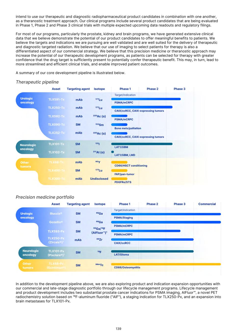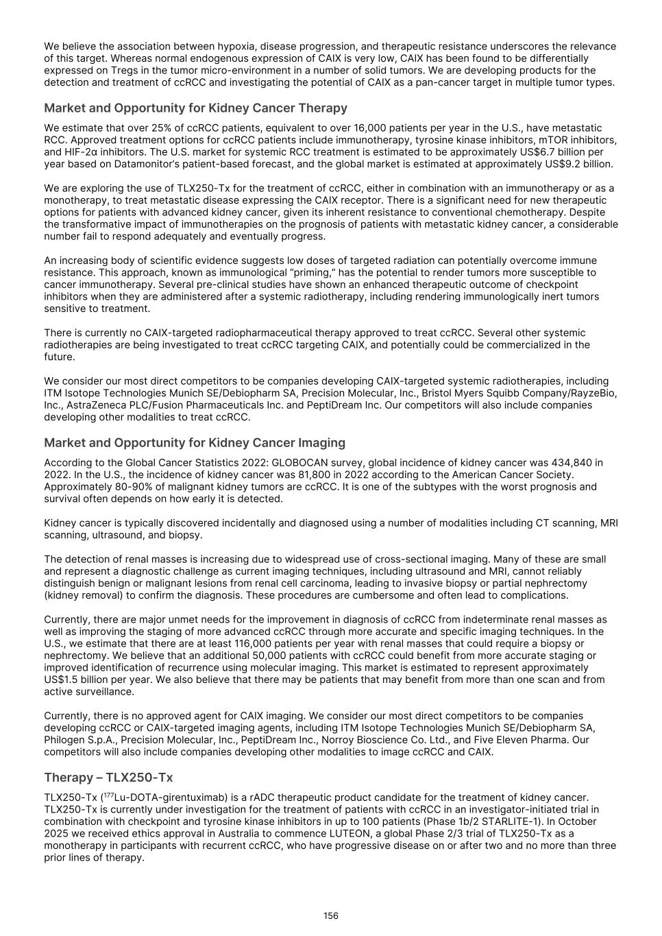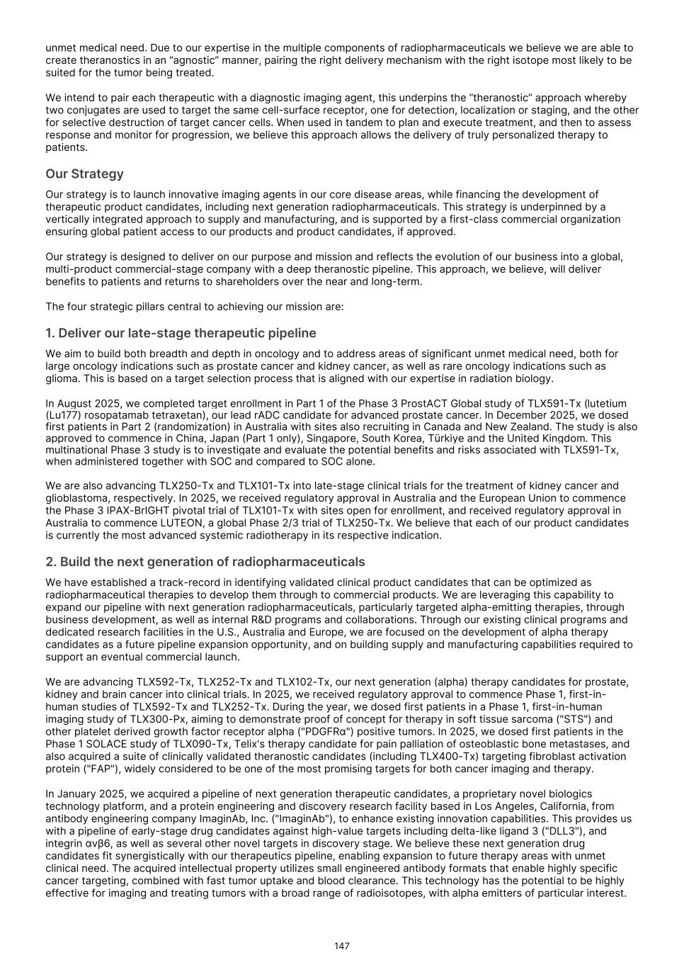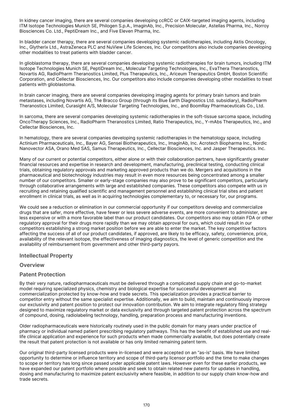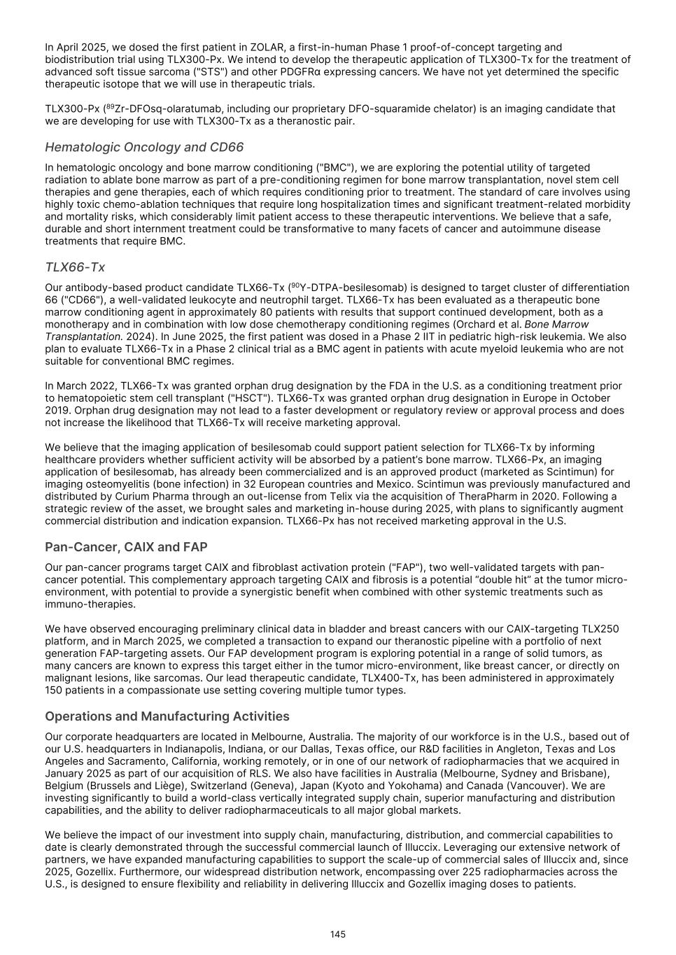 France S.A.S, Clarity Pharmaceuticals Limited, The Bracco Group (through its Blue Earth Therapeutics Ltd. subsidiary), and Y-mAbs Therapeutics, Inc. The beta emitting isotopes used by these companies include Iodine-131, Lutetium-177, Strontium-89, Copper-67, and Yttrium-90. A recently approved beta particle-based radiopharmaceutical is Pluvicto, which was developed by Novartis AG and approved by the FDA in 2022 for the treatment of patients with metastatic prostate cancer. There are also several companies developing targeted alpha-based radiopharmaceuticals for the treatment of cancer, including Bayer AG, Novartis AG, Johnson & Johnson, Abdera Therapeutics Inc., Actinium Pharmaceuticals, Inc., Aktis Oncology, Inc., Convergent Therapeutics, Inc., AstraZeneca PLC, ITM Isotope Technologies Munich SE, Perspective Therapeutics, Inc., Eli Lilly & Company Ltd, RadioMedix, Inc., Bristol Myers Squibb Company, and Y-mAbs Therapeutics, Inc. These companies are targeting a wide range of solid and hematologic malignancies using various alpha-emitting isotopes, including Radium-223, Lead-212, and Actinium-225. The first and only approved alpha particle-based therapy is Xofigo (Radium-223), which was developed by Bayer AG and approved in 2013 for the treatment of prostate cancer with symptomatic bone metastases. With respect to TLX591-Tx (lutetium (Lu177) rosopatamab tetraxetan), our main competitors include Novartis AG, with Pluvicto as the only currently approved PSMA-targeted therapy. Our main competitors also include companies developing PSMA-targeted therapies, including AstraZeneca PLC, Convergent Therapeutics, Inc., Eli Lilly & Company Ltd., Lantheus Holdings, Inc., Curium Holding SAS, ArtBio, Inc., The Bracco Group (through its Blue Earth Therapeutics Ltd. Subsidiary), Clarity Pharmaceuticals Ltd., Bayer AG, Orano Med SAS, Isotopia Molecular Imaging Ltd., ITM Isotope Technologies Munich SE, Johnson & Johnson, AdvanCell Isotopes Pty Ltd., Alpha-9 Theranostics Inc., Cancer Targeted Technology LLC, FutureChem Co Ltd., Beijing Sinotau Intl. Pharmaceutical Technology Co., Ltd., Norroy Biosciences Co. Ltd., RadioPharm Theranostics Limited, Precision Molecular, Inc., CellBion Co., Ltd., StarPharma Holdings Limited, Amgen Inc., Crescendo Biologics Limited, Poseida Therapeutics, Inc., Regeneron Pharmaceuticals Inc., BioXcel Therapeutics, Inc., Lava Therapeutics NV, Janux Therapeutics, Inc., Vir Therapeutics, Inc., Bivision Pharmaceuticals, Inc., GlyTherix Ltd, Jiangsu Hengrui Pharmaceuticals Co., Ltd., and Full-Life Technologies Limited. Our competitors also include companies developing other modalities to treat patients in metastatic castration-resistant prostate cancer ("mCRPC"). For TLX400-Tx (177Lu-DOTAGA.Glu.(FAPi)2), our main competitors are companies developing FAP-targeting radiotherapeutics or diagnostics, including Novartis AG, Eli Lilly and Company Ltd, 3BP Pharmaceuticals GmbH, Ratio Therapeutics Inc., Akiram Therapeutics, BoomRay Pharmaceuticals Co., Ltd., Philogen SPA, Precirix NV, Ratio Therapeutics Inc., Spago Nanomedical AB, Yantai LNC, ITM Isotope Technologies Munich SE, Lantheus Holdings, Inc, Perspective Therapeutics, Inc., Precision Molecular Inc., Sofie Biosciences, Inc., and GE Healthcare. For TLX300-Tx (-olaratumab), our main competitors include companies with licensed soft-tissue sarcoma treatments including Novartis AG, Adaptimmune Therapeutics plc, Agilent Technologies Inc., Boehringer Ingelheim GmbH, Esai Co., Ltd., , Mark, PharmaMar SA, Johnson & Johnson, Taiho Pharmaceuticals as well as other companies commercializing chemotherapy regimens approved in soft-tissue sarcoma. Our competitors also include companies developing therapies in the field of sarcoma including Ratio Therapeutics Inc., PTC Therapeutics, Polaris Pharmaceuticals, BioAtla. Eli Lilly and Company Ltd, Advenchen Laboratories LLC, Intensity Therapeutics Inc, Sun Pharmaceutical Industries Ltd, Exelixis Inc, Y-mAbs Therapeutics Inc, QBiotics Group Limited, Apollomics Inc, Pyxis Oncology, AADi Bioscience Inc, Moleculin Biotech Inc, Cornerstone Pharmaceuticals Inc, Shasqi Inc, Noxopharm Limited, NANO MRNA Co Ltd, Avacta Group plc, Iovance Biotherapeutics Inc, Foghorn Therapeutics Inc., OncoTherapy Science Inc. and Syena. For TLX250-Tx (177Lu-DOTA-girentuximab), our main competitors include ITM Isotope Technologies Munich SE, Precision Molecular, Inc., Norroy Biosciences Co. Ltd., PeptiDream Inc, Bristol Myers Squibb Company and Bayer AG. Our competitors will also include companies developing other modalities to image renal cell carcinoma and carbonic anhydrase IX. For TLX101-Tx (iodofalan 131I), our main competitors include ITM Isotope Technologies Munich SE, Molecular Targeting Technologies, Inc. ("MTTI"), Novartis AG, Radiopharm Theranostics Limited, Plus Therapeutics, Inc., Ariceum Therapeutics GmbH, Boston Scientific Corporation, and Cellectar Biosciences, Inc. Our competitors will also include companies developing other modalities to treat brain cancer. For TLX090-Tx (153Sm-DOTMP), our main competitors include commercially available compounds that relieve pain from osteoblastic bone metastases, including Novartis AG, Bayer AG, Pfizer Inc., Purdue Pharma L.P., Roxane Laboratories, Inc., Johnson & Johnson, Mallinckrodt Inc., Endo Pharmaceuticals Holdings Inc., Mylan Laboratories Inc., Noven Pharmaceuticals, Inc., Aveva Group PLC, Sandoz Group AG, Ranbaxy Laboratories Ltd., Amneal Pharmaceuticals LLC, Hoffmann-La Roche AG, Apotex Inc, Orchid Healthcare LTD, Grünenthal GmbH, as well as other companies commercializing or developing other palliative agents for osteoblastic bone metastases. We are currently focused on developing and commercializing our Commercial Products and our product candidates for the diagnosis and treatment of cancer and there are a variety of commercially available imaging and therapeutic products marketed for cancer. In many cases, cancer imaging products and therapeutics are administered in