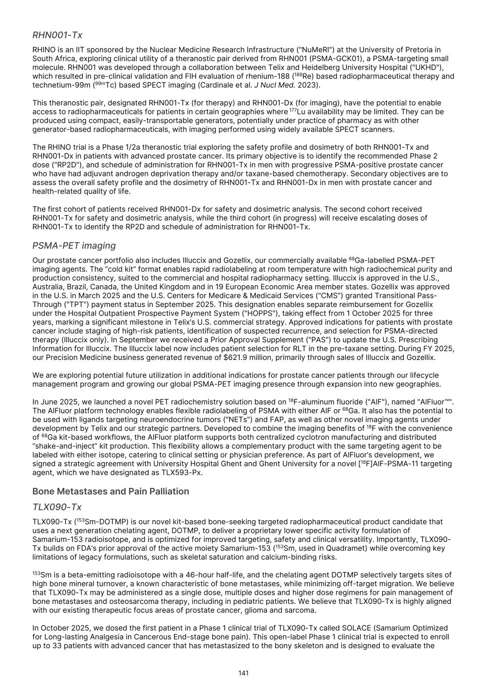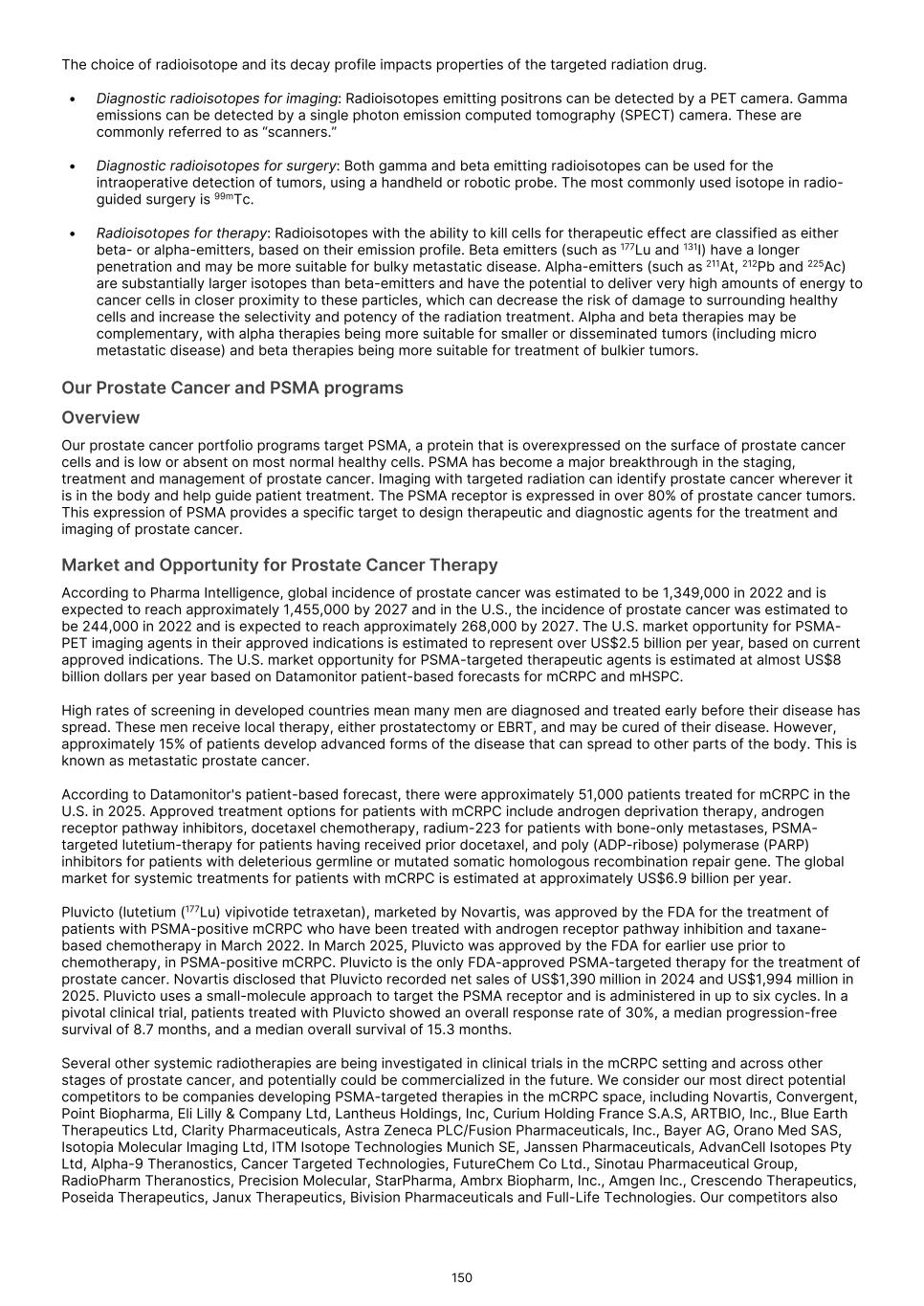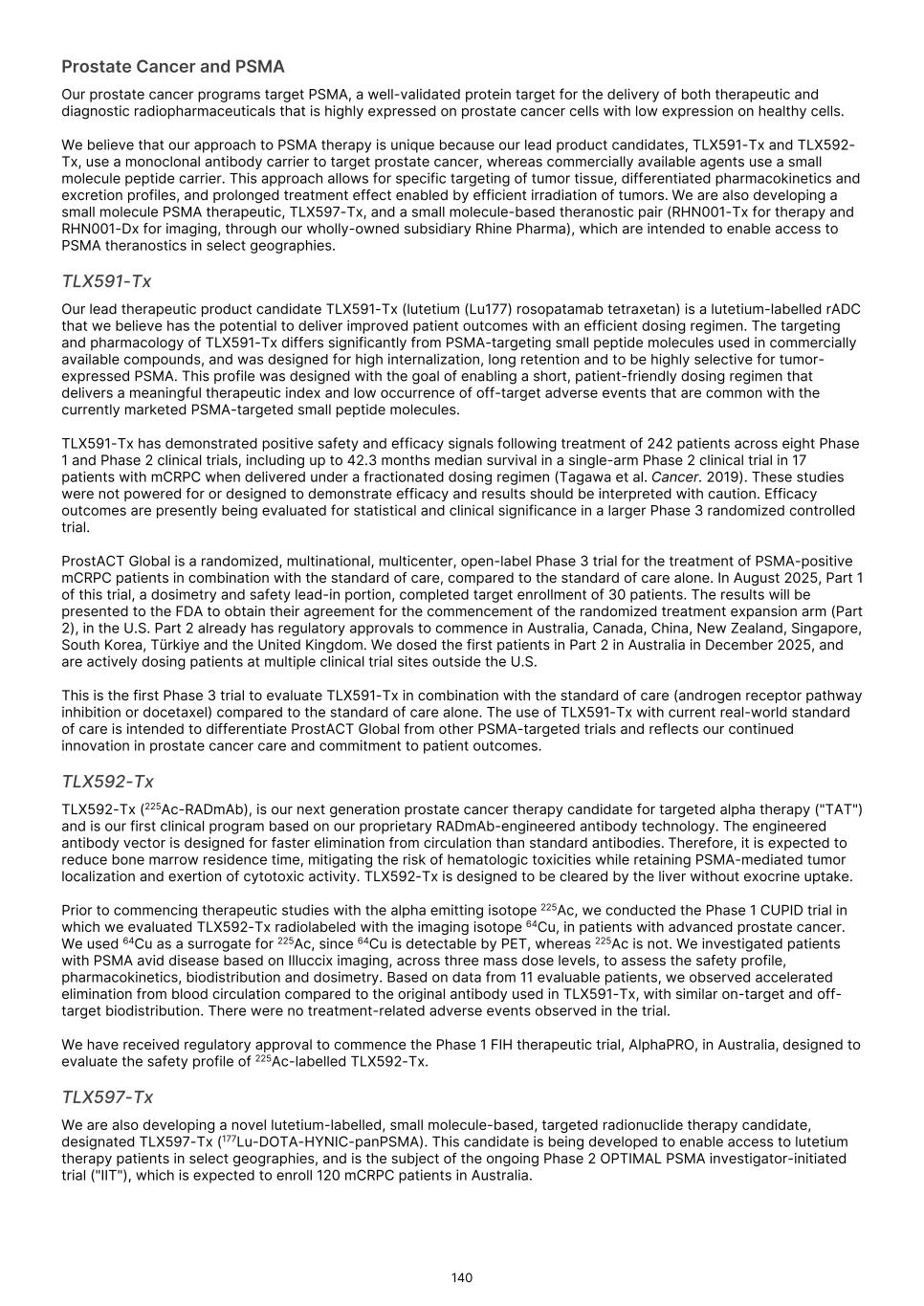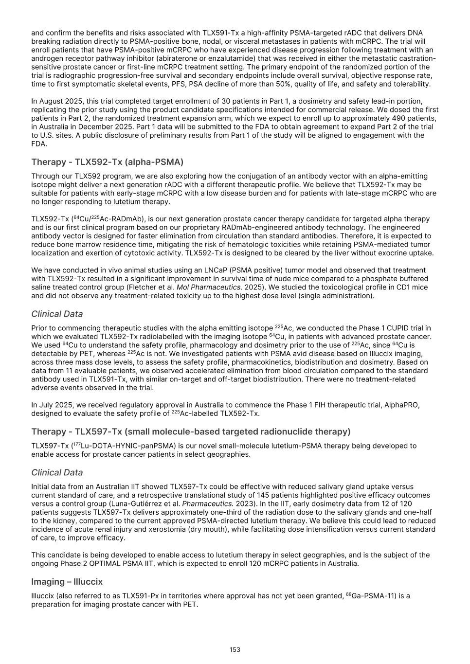 France S.A.S, Clarity Pharmaceuticals Limited, The Bracco Group (through its Blue Earth Therapeutics Ltd. subsidiary), and Y-mAbs Therapeutics, Inc. The beta emitting isotopes used by these companies include Iodine-131, Lutetium-177, Strontium-89, Copper-67, and Yttrium-90. A recently approved beta particle-based radiopharmaceutical is Pluvicto, which was developed by Novartis AG and approved by the FDA in 2022 for the treatment of patients with metastatic prostate cancer. There are also several companies developing targeted alpha-based radiopharmaceuticals for the treatment of cancer, including Bayer AG, Novartis AG, Johnson & Johnson, Abdera Therapeutics Inc., Actinium Pharmaceuticals, Inc., Aktis Oncology, Inc., Convergent Therapeutics, Inc., AstraZeneca PLC, ITM Isotope Technologies Munich SE, Perspective Therapeutics, Inc., Eli Lilly & Company Ltd, RadioMedix, Inc., Bristol Myers Squibb Company, and Y-mAbs Therapeutics, Inc. These companies are targeting a wide range of solid and hematologic malignancies using various alpha-emitting isotopes, including Radium-223, Lead-212, and Actinium-225. The first and only approved alpha particle-based therapy is Xofigo (Radium-223), which was developed by Bayer AG and approved in 2013 for the treatment of prostate cancer with symptomatic bone metastases. With respect to TLX591-Tx (lutetium (Lu177) rosopatamab tetraxetan), our main competitors include Novartis AG, with Pluvicto as the only currently approved PSMA-targeted therapy. Our main competitors also include companies developing PSMA-targeted therapies, including AstraZeneca PLC, Convergent Therapeutics, Inc., Eli Lilly & Company Ltd., Lantheus Holdings, Inc., Curium Holding SAS, ArtBio, Inc., The Bracco Group (through its Blue Earth Therapeutics Ltd. Subsidiary), Clarity Pharmaceuticals Ltd., Bayer AG, Orano Med SAS, Isotopia Molecular Imaging Ltd., ITM Isotope Technologies Munich SE, Johnson & Johnson, AdvanCell Isotopes Pty Ltd., Alpha-9 Theranostics Inc., Cancer Targeted Technology LLC, FutureChem Co Ltd., Beijing Sinotau Intl. Pharmaceutical Technology Co., Ltd., Norroy Biosciences Co. Ltd., RadioPharm Theranostics Limited, Precision Molecular, Inc., CellBion Co., Ltd., StarPharma Holdings Limited, Amgen Inc., Crescendo Biologics Limited, Poseida Therapeutics, Inc., Regeneron Pharmaceuticals Inc., BioXcel Therapeutics, Inc., Lava Therapeutics NV, Janux Therapeutics, Inc., Vir Therapeutics, Inc., Bivision Pharmaceuticals, Inc., GlyTherix Ltd, Jiangsu Hengrui Pharmaceuticals Co., Ltd., and Full-Life Technologies Limited. Our competitors also include companies developing other modalities to treat patients in metastatic castration-resistant prostate cancer ("mCRPC"). For TLX400-Tx (177Lu-DOTAGA.Glu.(FAPi)2), our main competitors are companies developing FAP-targeting radiotherapeutics or diagnostics, including Novartis AG, Eli Lilly and Company Ltd, 3BP Pharmaceuticals GmbH, Ratio Therapeutics Inc., Akiram Therapeutics, BoomRay Pharmaceuticals Co., Ltd., Philogen SPA, Precirix NV, Ratio Therapeutics Inc., Spago Nanomedical AB, Yantai LNC, ITM Isotope Technologies Munich SE, Lantheus Holdings, Inc, Perspective Therapeutics, Inc., Precision Molecular Inc., Sofie Biosciences, Inc., and GE Healthcare. For TLX300-Tx (-olaratumab), our main competitors include companies with licensed soft-tissue sarcoma treatments including Novartis AG, Adaptimmune Therapeutics plc, Agilent Technologies Inc., Boehringer Ingelheim GmbH, Esai Co., Ltd., , Mark, PharmaMar SA, Johnson & Johnson, Taiho Pharmaceuticals as well as other companies commercializing chemotherapy regimens approved in soft-tissue sarcoma. Our competitors also include companies developing therapies in the field of sarcoma including Ratio Therapeutics Inc., PTC Therapeutics, Polaris Pharmaceuticals, BioAtla. Eli Lilly and Company Ltd, Advenchen Laboratories LLC, Intensity Therapeutics Inc, Sun Pharmaceutical Industries Ltd, Exelixis Inc, Y-mAbs Therapeutics Inc, QBiotics Group Limited, Apollomics Inc, Pyxis Oncology, AADi Bioscience Inc, Moleculin Biotech Inc, Cornerstone Pharmaceuticals Inc, Shasqi Inc, Noxopharm Limited, NANO MRNA Co Ltd, Avacta Group plc, Iovance Biotherapeutics Inc, Foghorn Therapeutics Inc., OncoTherapy Science Inc. and Syena. For TLX250-Tx (177Lu-DOTA-girentuximab), our main competitors include ITM Isotope Technologies Munich SE, Precision Molecular, Inc., Norroy Biosciences Co. Ltd., PeptiDream Inc, Bristol Myers Squibb Company and Bayer AG. Our competitors will also include companies developing other modalities to image renal cell carcinoma and carbonic anhydrase IX. For TLX101-Tx (iodofalan 131I), our main competitors include ITM Isotope Technologies Munich SE, Molecular Targeting Technologies, Inc. ("MTTI"), Novartis AG, Radiopharm Theranostics Limited, Plus Therapeutics, Inc., Ariceum Therapeutics GmbH, Boston Scientific Corporation, and Cellectar Biosciences, Inc. Our competitors will also include companies developing other modalities to treat brain cancer. For TLX090-Tx (153Sm-DOTMP), our main competitors include commercially available compounds that relieve pain from osteoblastic bone metastases, including Novartis AG, Bayer AG, Pfizer Inc., Purdue Pharma L.P., Roxane Laboratories, Inc., Johnson & Johnson, Mallinckrodt Inc., Endo Pharmaceuticals Holdings Inc., Mylan Laboratories Inc., Noven Pharmaceuticals, Inc., Aveva Group PLC, Sandoz Group AG, Ranbaxy Laboratories Ltd., Amneal Pharmaceuticals LLC, Hoffmann-La Roche AG, Apotex Inc, Orchid Healthcare LTD, Grünenthal GmbH, as well as other companies commercializing or developing other palliative agents for osteoblastic bone metastases. We are currently focused on developing and commercializing our Commercial Products and our product candidates for the diagnosis and treatment of cancer and there are a variety of commercially available imaging and therapeutic products marketed for cancer. In many cases, cancer imaging products and therapeutics are administered in