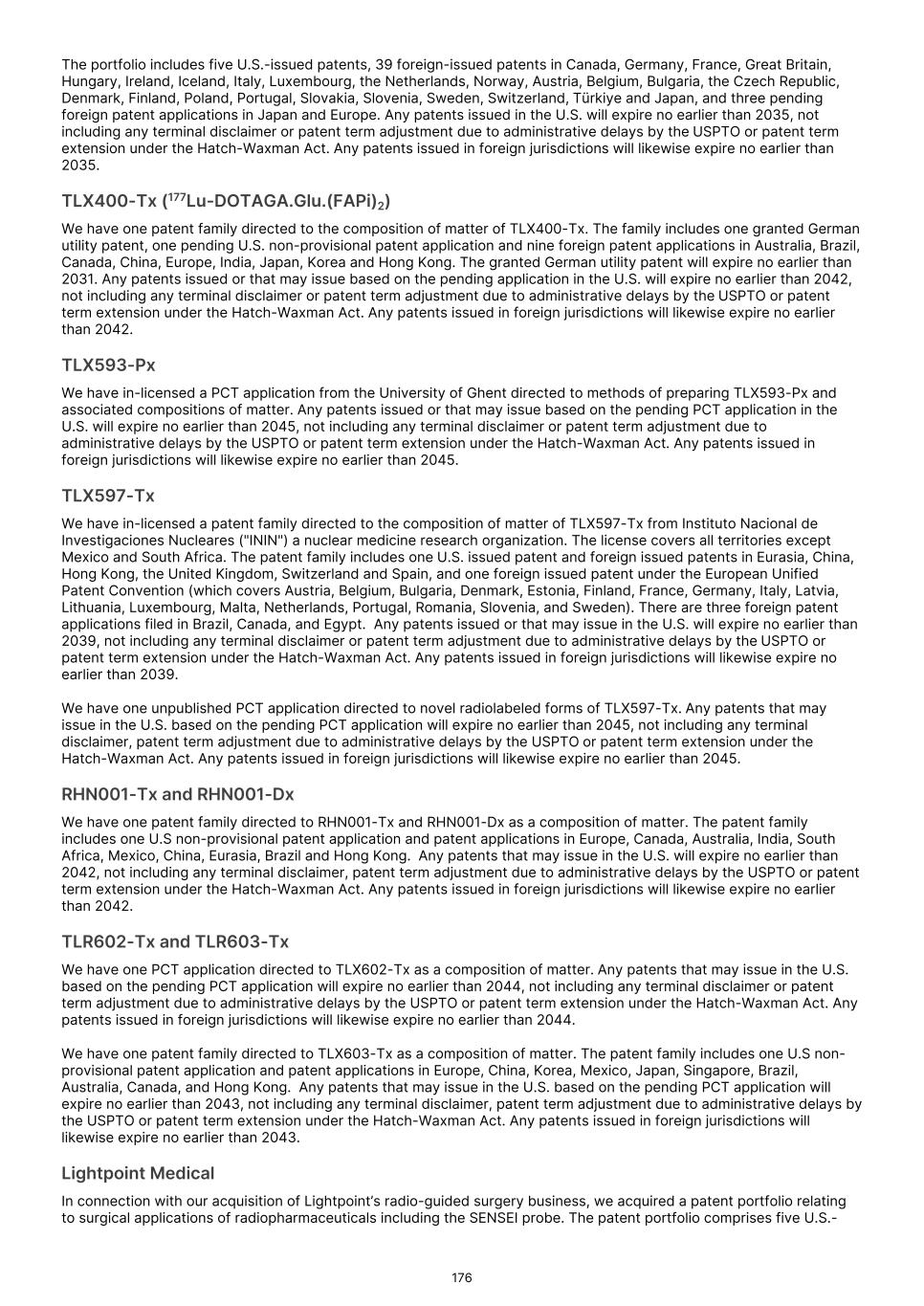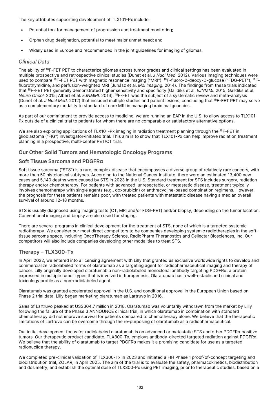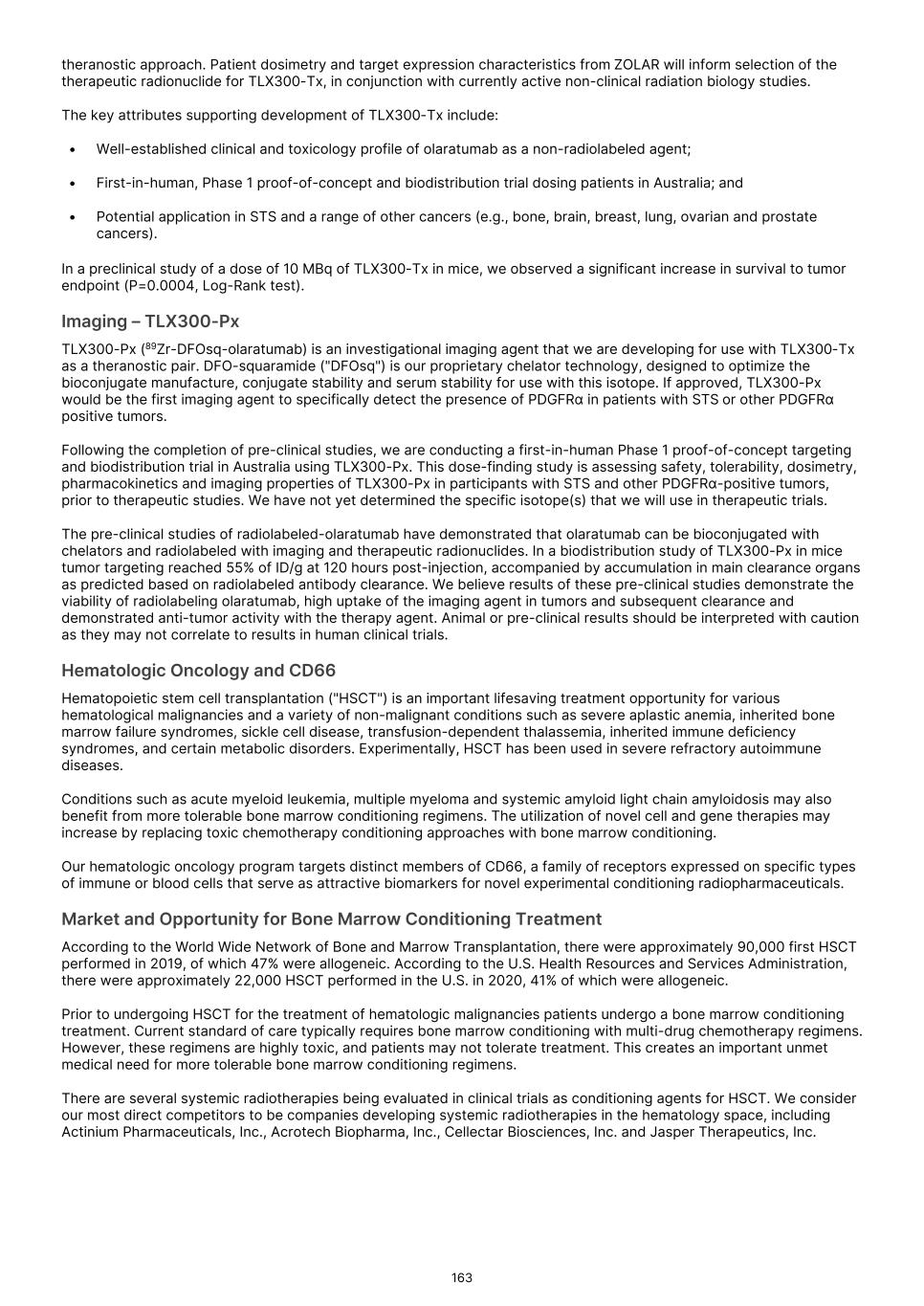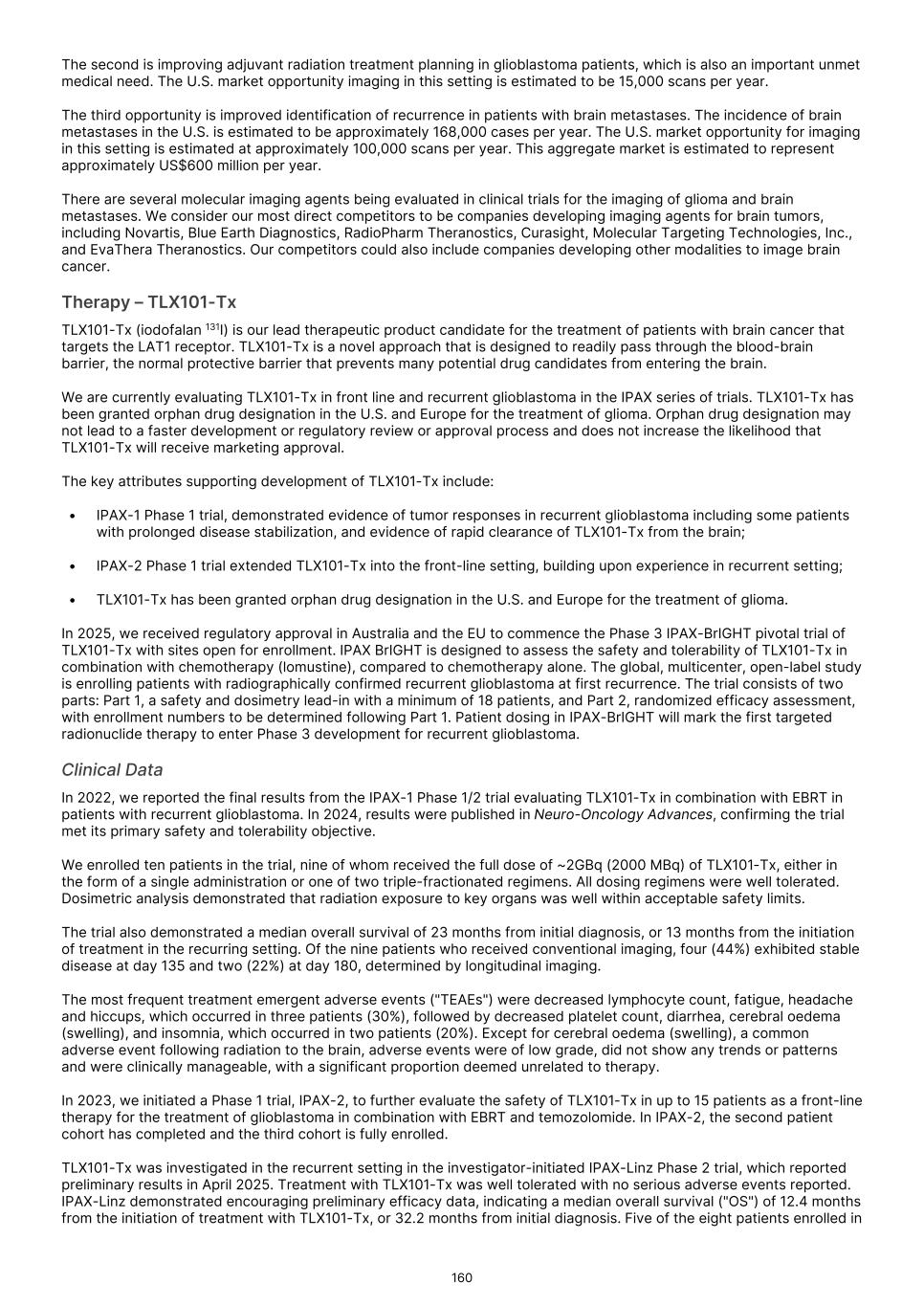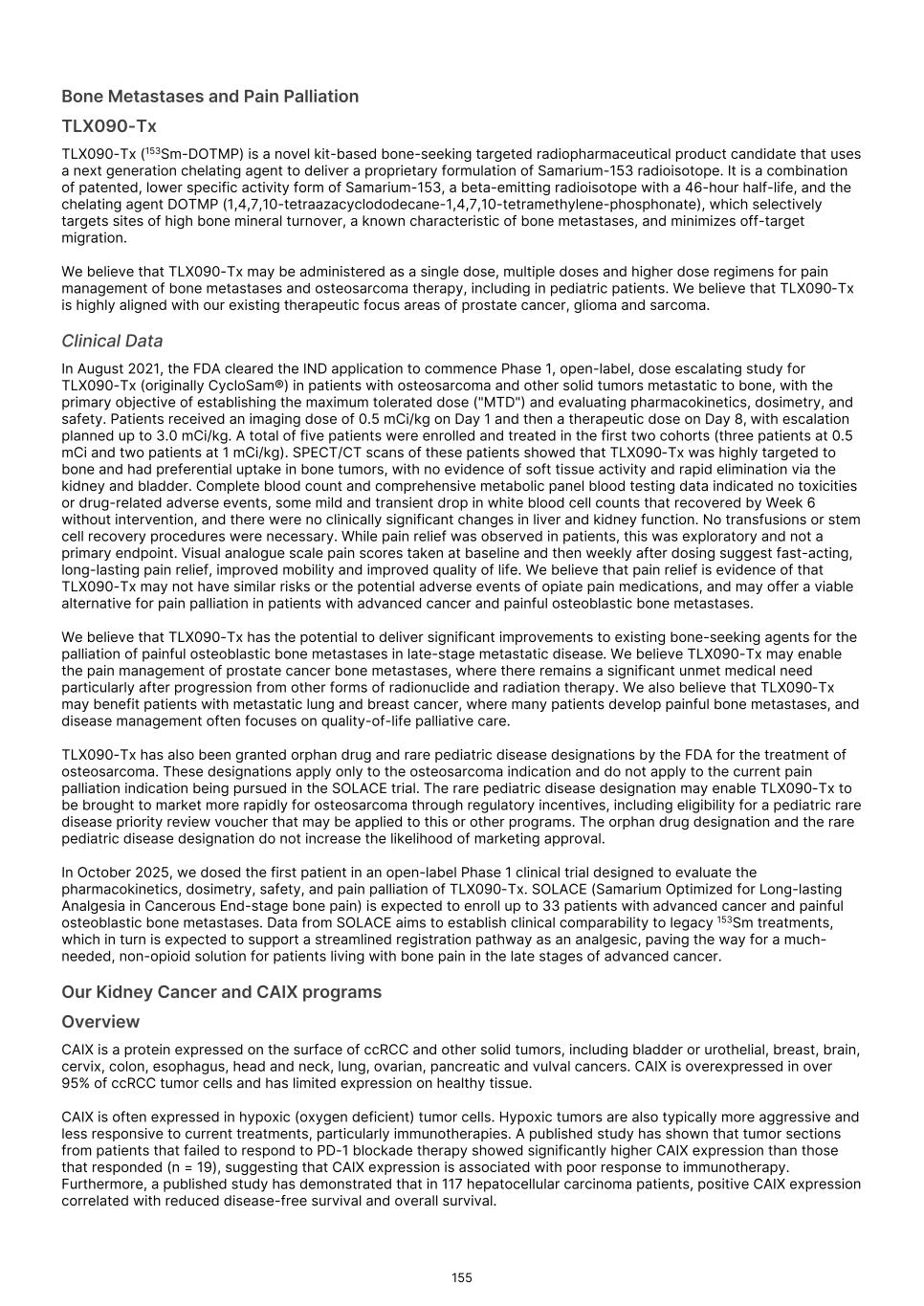 France S.A.S, Clarity Pharmaceuticals Limited, The Bracco Group (through its Blue Earth Therapeutics Ltd. subsidiary), and Y-mAbs Therapeutics, Inc. The beta emitting isotopes used by these companies include Iodine-131, Lutetium-177, Strontium-89, Copper-67, and Yttrium-90. A recently approved beta particle-based radiopharmaceutical is Pluvicto, which was developed by Novartis AG and approved by the FDA in 2022 for the treatment of patients with metastatic prostate cancer. There are also several companies developing targeted alpha-based radiopharmaceuticals for the treatment of cancer, including Bayer AG, Novartis AG, Johnson & Johnson, Abdera Therapeutics Inc., Actinium Pharmaceuticals, Inc., Aktis Oncology, Inc., Convergent Therapeutics, Inc., AstraZeneca PLC, ITM Isotope Technologies Munich SE, Perspective Therapeutics, Inc., Eli Lilly & Company Ltd, RadioMedix, Inc., Bristol Myers Squibb Company, and Y-mAbs Therapeutics, Inc. These companies are targeting a wide range of solid and hematologic malignancies using various alpha-emitting isotopes, including Radium-223, Lead-212, and Actinium-225. The first and only approved alpha particle-based therapy is Xofigo (Radium-223), which was developed by Bayer AG and approved in 2013 for the treatment of prostate cancer with symptomatic bone metastases. With respect to TLX591-Tx (lutetium (Lu177) rosopatamab tetraxetan), our main competitors include Novartis AG, with Pluvicto as the only currently approved PSMA-targeted therapy. Our main competitors also include companies developing PSMA-targeted therapies, including AstraZeneca PLC, Convergent Therapeutics, Inc., Eli Lilly & Company Ltd., Lantheus Holdings, Inc., Curium Holding SAS, ArtBio, Inc., The Bracco Group (through its Blue Earth Therapeutics Ltd. Subsidiary), Clarity Pharmaceuticals Ltd., Bayer AG, Orano Med SAS, Isotopia Molecular Imaging Ltd., ITM Isotope Technologies Munich SE, Johnson & Johnson, AdvanCell Isotopes Pty Ltd., Alpha-9 Theranostics Inc., Cancer Targeted Technology LLC, FutureChem Co Ltd., Beijing Sinotau Intl. Pharmaceutical Technology Co., Ltd., Norroy Biosciences Co. Ltd., RadioPharm Theranostics Limited, Precision Molecular, Inc., CellBion Co., Ltd., StarPharma Holdings Limited, Amgen Inc., Crescendo Biologics Limited, Poseida Therapeutics, Inc., Regeneron Pharmaceuticals Inc., BioXcel Therapeutics, Inc., Lava Therapeutics NV, Janux Therapeutics, Inc., Vir Therapeutics, Inc., Bivision Pharmaceuticals, Inc., GlyTherix Ltd, Jiangsu Hengrui Pharmaceuticals Co., Ltd., and Full-Life Technologies Limited. Our competitors also include companies developing other modalities to treat patients in metastatic castration-resistant prostate cancer ("mCRPC"). For TLX400-Tx (177Lu-DOTAGA.Glu.(FAPi)2), our main competitors are companies developing FAP-targeting radiotherapeutics or diagnostics, including Novartis AG, Eli Lilly and Company Ltd, 3BP Pharmaceuticals GmbH, Ratio Therapeutics Inc., Akiram Therapeutics, BoomRay Pharmaceuticals Co., Ltd., Philogen SPA, Precirix NV, Ratio Therapeutics Inc., Spago Nanomedical AB, Yantai LNC, ITM Isotope Technologies Munich SE, Lantheus Holdings, Inc, Perspective Therapeutics, Inc., Precision Molecular Inc., Sofie Biosciences, Inc., and GE Healthcare. For TLX300-Tx (-olaratumab), our main competitors include companies with licensed soft-tissue sarcoma treatments including Novartis AG, Adaptimmune Therapeutics plc, Agilent Technologies Inc., Boehringer Ingelheim GmbH, Esai Co., Ltd., , Mark, PharmaMar SA, Johnson & Johnson, Taiho Pharmaceuticals as well as other companies commercializing chemotherapy regimens approved in soft-tissue sarcoma. Our competitors also include companies developing therapies in the field of sarcoma including Ratio Therapeutics Inc., PTC Therapeutics, Polaris Pharmaceuticals, BioAtla. Eli Lilly and Company Ltd, Advenchen Laboratories LLC, Intensity Therapeutics Inc, Sun Pharmaceutical Industries Ltd, Exelixis Inc, Y-mAbs Therapeutics Inc, QBiotics Group Limited, Apollomics Inc, Pyxis Oncology, AADi Bioscience Inc, Moleculin Biotech Inc, Cornerstone Pharmaceuticals Inc, Shasqi Inc, Noxopharm Limited, NANO MRNA Co Ltd, Avacta Group plc, Iovance Biotherapeutics Inc, Foghorn Therapeutics Inc., OncoTherapy Science Inc. and Syena. For TLX250-Tx (177Lu-DOTA-girentuximab), our main competitors include ITM Isotope Technologies Munich SE, Precision Molecular, Inc., Norroy Biosciences Co. Ltd., PeptiDream Inc, Bristol Myers Squibb Company and Bayer AG. Our competitors will also include companies developing other modalities to image renal cell carcinoma and carbonic anhydrase IX. For TLX101-Tx (iodofalan 131I), our main competitors include ITM Isotope Technologies Munich SE, Molecular Targeting Technologies, Inc. ("MTTI"), Novartis AG, Radiopharm Theranostics Limited, Plus Therapeutics, Inc., Ariceum Therapeutics GmbH, Boston Scientific Corporation, and Cellectar Biosciences, Inc. Our competitors will also include companies developing other modalities to treat brain cancer. For TLX090-Tx (153Sm-DOTMP), our main competitors include commercially available compounds that relieve pain from osteoblastic bone metastases, including Novartis AG, Bayer AG, Pfizer Inc., Purdue Pharma L.P., Roxane Laboratories, Inc., Johnson & Johnson, Mallinckrodt Inc., Endo Pharmaceuticals Holdings Inc., Mylan Laboratories Inc., Noven Pharmaceuticals, Inc., Aveva Group PLC, Sandoz Group AG, Ranbaxy Laboratories Ltd., Amneal Pharmaceuticals LLC, Hoffmann-La Roche AG, Apotex Inc, Orchid Healthcare LTD, Grünenthal GmbH, as well as other companies commercializing or developing other palliative agents for osteoblastic bone metastases. We are currently focused on developing and commercializing our Commercial Products and our product candidates for the diagnosis and treatment of cancer and there are a variety of commercially available imaging and therapeutic products marketed for cancer. In many cases, cancer imaging products and therapeutics are administered in