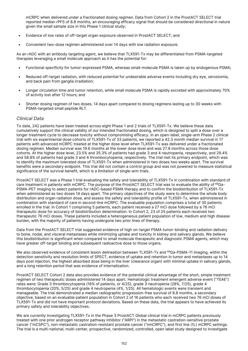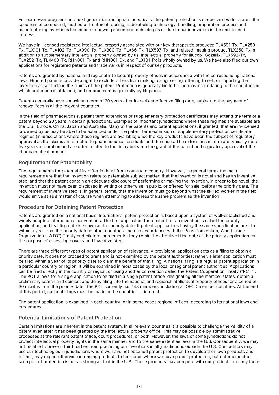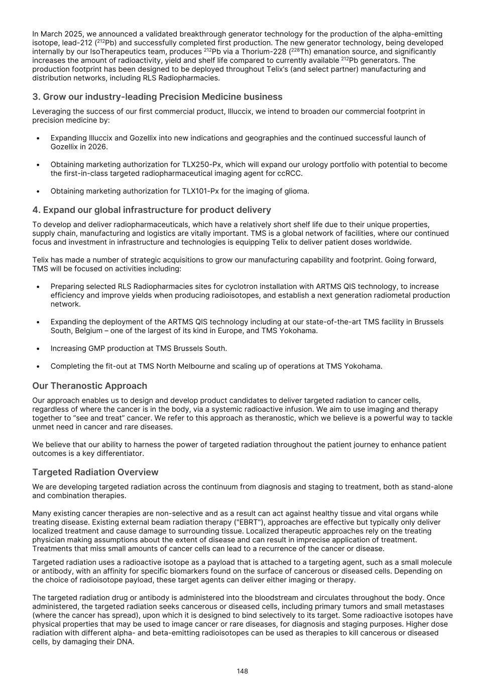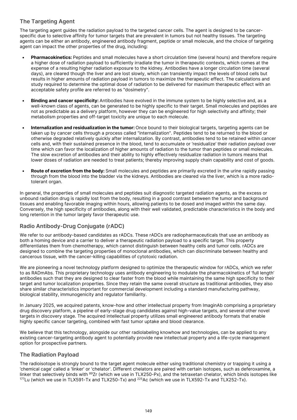 France S.A.S, Clarity Pharmaceuticals Limited, The Bracco Group (through its Blue Earth Therapeutics Ltd. subsidiary), and Y-mAbs Therapeutics, Inc. The beta emitting isotopes used by these companies include Iodine-131, Lutetium-177, Strontium-89, Copper-67, and Yttrium-90. A recently approved beta particle-based radiopharmaceutical is Pluvicto, which was developed by Novartis AG and approved by the FDA in 2022 for the treatment of patients with metastatic prostate cancer. There are also several companies developing targeted alpha-based radiopharmaceuticals for the treatment of cancer, including Bayer AG, Novartis AG, Johnson & Johnson, Abdera Therapeutics Inc., Actinium Pharmaceuticals, Inc., Aktis Oncology, Inc., Convergent Therapeutics, Inc., AstraZeneca PLC, ITM Isotope Technologies Munich SE, Perspective Therapeutics, Inc., Eli Lilly & Company Ltd, RadioMedix, Inc., Bristol Myers Squibb Company, and Y-mAbs Therapeutics, Inc. These companies are targeting a wide range of solid and hematologic malignancies using various alpha-emitting isotopes, including Radium-223, Lead-212, and Actinium-225. The first and only approved alpha particle-based therapy is Xofigo (Radium-223), which was developed by Bayer AG and approved in 2013 for the treatment of prostate cancer with symptomatic bone metastases. With respect to TLX591-Tx (lutetium (Lu177) rosopatamab tetraxetan), our main competitors include Novartis AG, with Pluvicto as the only currently approved PSMA-targeted therapy. Our main competitors also include companies developing PSMA-targeted therapies, including AstraZeneca PLC, Convergent Therapeutics, Inc., Eli Lilly & Company Ltd., Lantheus Holdings, Inc., Curium Holding SAS, ArtBio, Inc., The Bracco Group (through its Blue Earth Therapeutics Ltd. Subsidiary), Clarity Pharmaceuticals Ltd., Bayer AG, Orano Med SAS, Isotopia Molecular Imaging Ltd., ITM Isotope Technologies Munich SE, Johnson & Johnson, AdvanCell Isotopes Pty Ltd., Alpha-9 Theranostics Inc., Cancer Targeted Technology LLC, FutureChem Co Ltd., Beijing Sinotau Intl. Pharmaceutical Technology Co., Ltd., Norroy Biosciences Co. Ltd., RadioPharm Theranostics Limited, Precision Molecular, Inc., CellBion Co., Ltd., StarPharma Holdings Limited, Amgen Inc., Crescendo Biologics Limited, Poseida Therapeutics, Inc., Regeneron Pharmaceuticals Inc., BioXcel Therapeutics, Inc., Lava Therapeutics NV, Janux Therapeutics, Inc., Vir Therapeutics, Inc., Bivision Pharmaceuticals, Inc., GlyTherix Ltd, Jiangsu Hengrui Pharmaceuticals Co., Ltd., and Full-Life Technologies Limited. Our competitors also include companies developing other modalities to treat patients in metastatic castration-resistant prostate cancer ("mCRPC"). For TLX400-Tx (177Lu-DOTAGA.Glu.(FAPi)2), our main competitors are companies developing FAP-targeting radiotherapeutics or diagnostics, including Novartis AG, Eli Lilly and Company Ltd, 3BP Pharmaceuticals GmbH, Ratio Therapeutics Inc., Akiram Therapeutics, BoomRay Pharmaceuticals Co., Ltd., Philogen SPA, Precirix NV, Ratio Therapeutics Inc., Spago Nanomedical AB, Yantai LNC, ITM Isotope Technologies Munich SE, Lantheus Holdings, Inc, Perspective Therapeutics, Inc., Precision Molecular Inc., Sofie Biosciences, Inc., and GE Healthcare. For TLX300-Tx (-olaratumab), our main competitors include companies with licensed soft-tissue sarcoma treatments including Novartis AG, Adaptimmune Therapeutics plc, Agilent Technologies Inc., Boehringer Ingelheim GmbH, Esai Co., Ltd., , Mark, PharmaMar SA, Johnson & Johnson, Taiho Pharmaceuticals as well as other companies commercializing chemotherapy regimens approved in soft-tissue sarcoma. Our competitors also include companies developing therapies in the field of sarcoma including Ratio Therapeutics Inc., PTC Therapeutics, Polaris Pharmaceuticals, BioAtla. Eli Lilly and Company Ltd, Advenchen Laboratories LLC, Intensity Therapeutics Inc, Sun Pharmaceutical Industries Ltd, Exelixis Inc, Y-mAbs Therapeutics Inc, QBiotics Group Limited, Apollomics Inc, Pyxis Oncology, AADi Bioscience Inc, Moleculin Biotech Inc, Cornerstone Pharmaceuticals Inc, Shasqi Inc, Noxopharm Limited, NANO MRNA Co Ltd, Avacta Group plc, Iovance Biotherapeutics Inc, Foghorn Therapeutics Inc., OncoTherapy Science Inc. and Syena. For TLX250-Tx (177Lu-DOTA-girentuximab), our main competitors include ITM Isotope Technologies Munich SE, Precision Molecular, Inc., Norroy Biosciences Co. Ltd., PeptiDream Inc, Bristol Myers Squibb Company and Bayer AG. Our competitors will also include companies developing other modalities to image renal cell carcinoma and carbonic anhydrase IX. For TLX101-Tx (iodofalan 131I), our main competitors include ITM Isotope Technologies Munich SE, Molecular Targeting Technologies, Inc. ("MTTI"), Novartis AG, Radiopharm Theranostics Limited, Plus Therapeutics, Inc., Ariceum Therapeutics GmbH, Boston Scientific Corporation, and Cellectar Biosciences, Inc. Our competitors will also include companies developing other modalities to treat brain cancer. For TLX090-Tx (153Sm-DOTMP), our main competitors include commercially available compounds that relieve pain from osteoblastic bone metastases, including Novartis AG, Bayer AG, Pfizer Inc., Purdue Pharma L.P., Roxane Laboratories, Inc., Johnson & Johnson, Mallinckrodt Inc., Endo Pharmaceuticals Holdings Inc., Mylan Laboratories Inc., Noven Pharmaceuticals, Inc., Aveva Group PLC, Sandoz Group AG, Ranbaxy Laboratories Ltd., Amneal Pharmaceuticals LLC, Hoffmann-La Roche AG, Apotex Inc, Orchid Healthcare LTD, Grünenthal GmbH, as well as other companies commercializing or developing other palliative agents for osteoblastic bone metastases. We are currently focused on developing and commercializing our Commercial Products and our product candidates for the diagnosis and treatment of cancer and there are a variety of commercially available imaging and therapeutic products marketed for cancer. In many cases, cancer imaging products and therapeutics are administered in