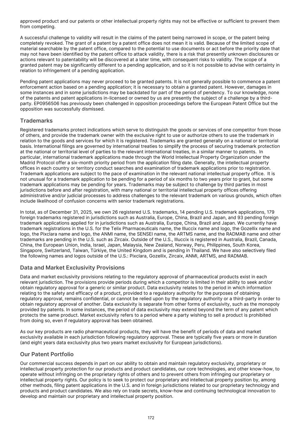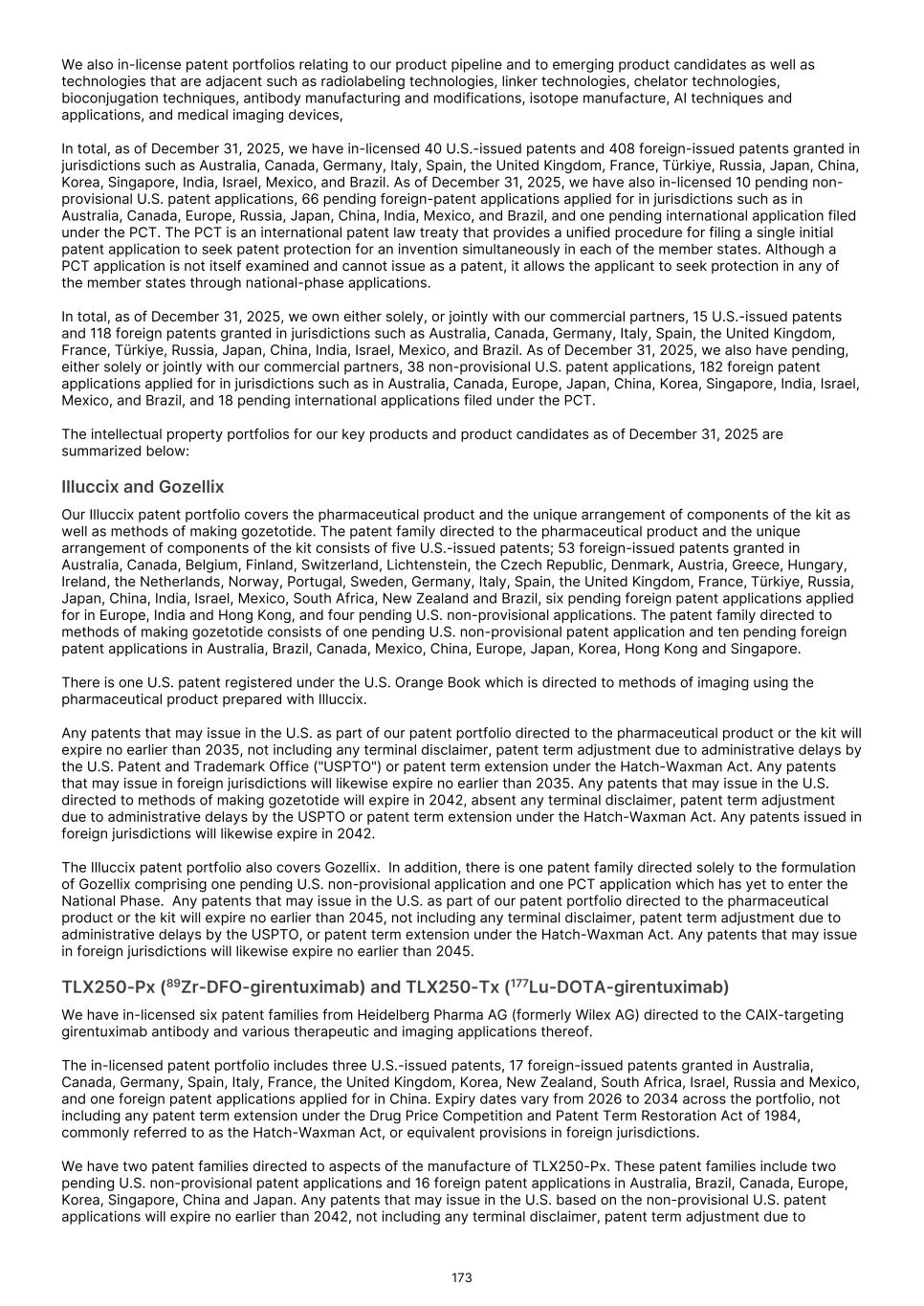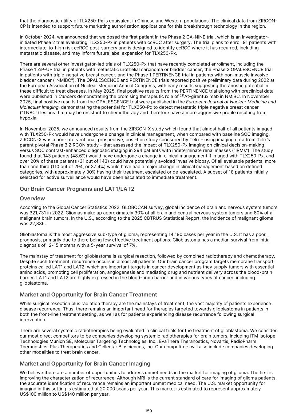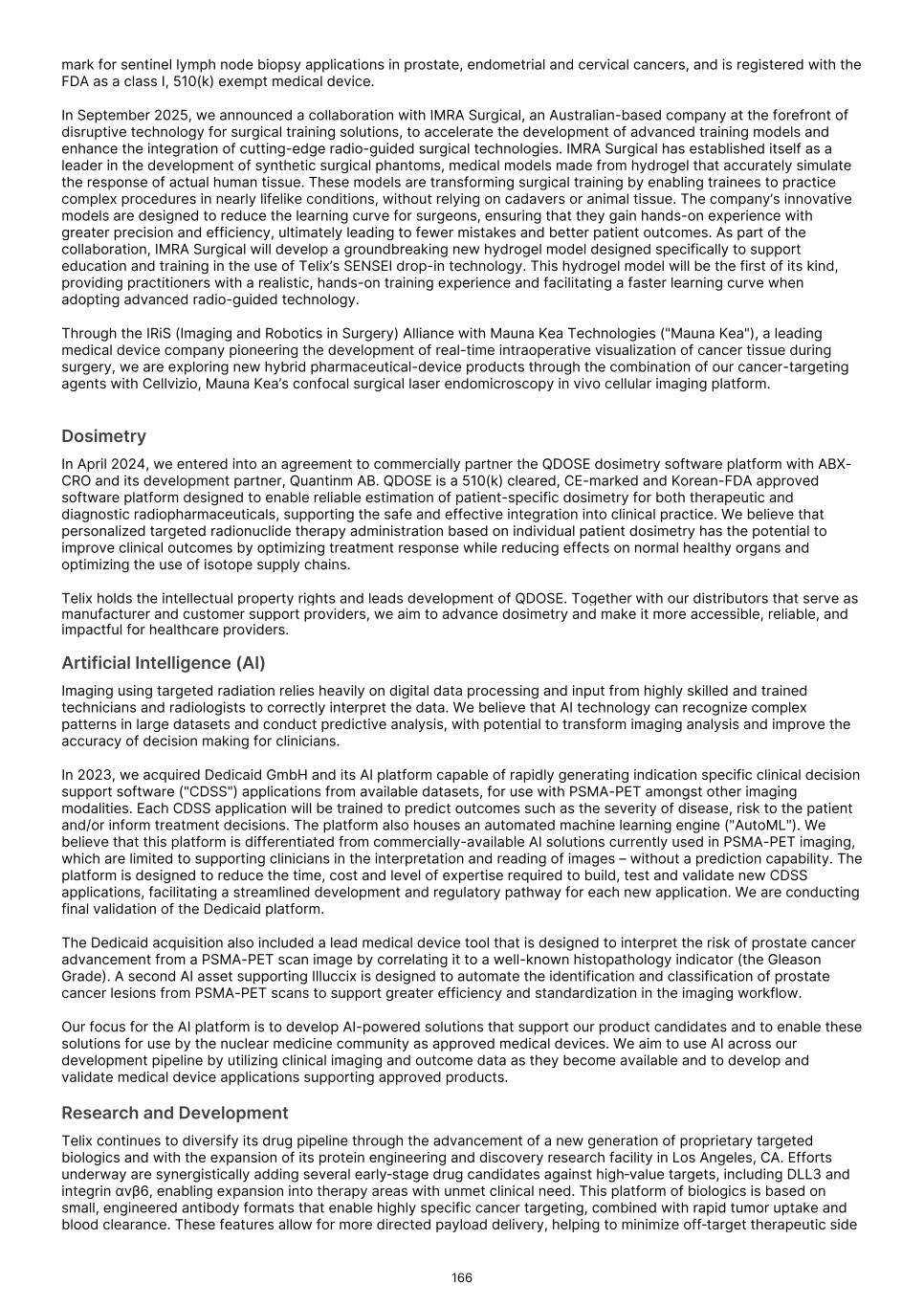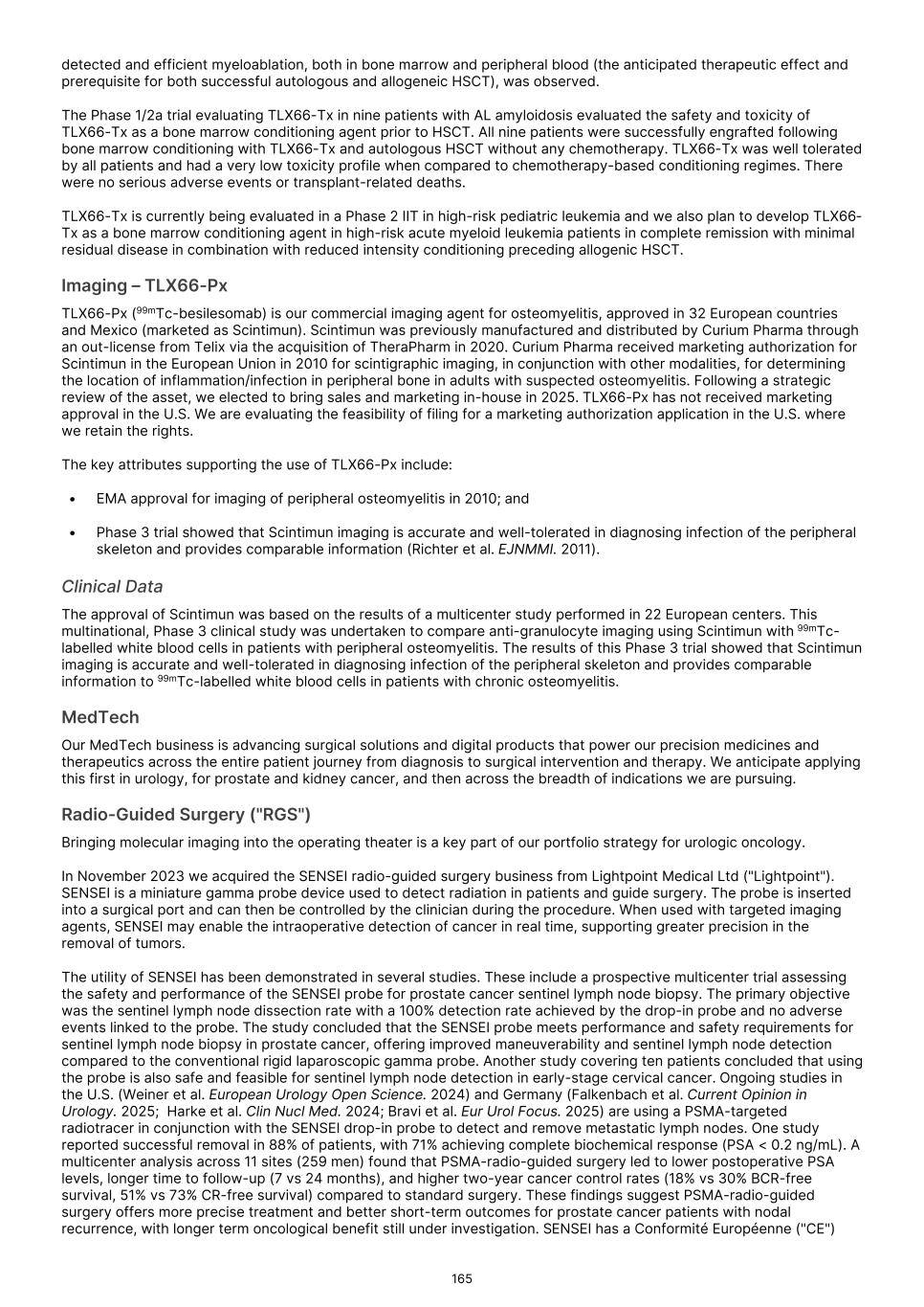 France S.A.S, Clarity Pharmaceuticals Limited, The Bracco Group (through its Blue Earth Therapeutics Ltd. subsidiary), and Y-mAbs Therapeutics, Inc. The beta emitting isotopes used by these companies include Iodine-131, Lutetium-177, Strontium-89, Copper-67, and Yttrium-90. A recently approved beta particle-based radiopharmaceutical is Pluvicto, which was developed by Novartis AG and approved by the FDA in 2022 for the treatment of patients with metastatic prostate cancer. There are also several companies developing targeted alpha-based radiopharmaceuticals for the treatment of cancer, including Bayer AG, Novartis AG, Johnson & Johnson, Abdera Therapeutics Inc., Actinium Pharmaceuticals, Inc., Aktis Oncology, Inc., Convergent Therapeutics, Inc., AstraZeneca PLC, ITM Isotope Technologies Munich SE, Perspective Therapeutics, Inc., Eli Lilly & Company Ltd, RadioMedix, Inc., Bristol Myers Squibb Company, and Y-mAbs Therapeutics, Inc. These companies are targeting a wide range of solid and hematologic malignancies using various alpha-emitting isotopes, including Radium-223, Lead-212, and Actinium-225. The first and only approved alpha particle-based therapy is Xofigo (Radium-223), which was developed by Bayer AG and approved in 2013 for the treatment of prostate cancer with symptomatic bone metastases. With respect to TLX591-Tx (lutetium (Lu177) rosopatamab tetraxetan), our main competitors include Novartis AG, with Pluvicto as the only currently approved PSMA-targeted therapy. Our main competitors also include companies developing PSMA-targeted therapies, including AstraZeneca PLC, Convergent Therapeutics, Inc., Eli Lilly & Company Ltd., Lantheus Holdings, Inc., Curium Holding SAS, ArtBio, Inc., The Bracco Group (through its Blue Earth Therapeutics Ltd. Subsidiary), Clarity Pharmaceuticals Ltd., Bayer AG, Orano Med SAS, Isotopia Molecular Imaging Ltd., ITM Isotope Technologies Munich SE, Johnson & Johnson, AdvanCell Isotopes Pty Ltd., Alpha-9 Theranostics Inc., Cancer Targeted Technology LLC, FutureChem Co Ltd., Beijing Sinotau Intl. Pharmaceutical Technology Co., Ltd., Norroy Biosciences Co. Ltd., RadioPharm Theranostics Limited, Precision Molecular, Inc., CellBion Co., Ltd., StarPharma Holdings Limited, Amgen Inc., Crescendo Biologics Limited, Poseida Therapeutics, Inc., Regeneron Pharmaceuticals Inc., BioXcel Therapeutics, Inc., Lava Therapeutics NV, Janux Therapeutics, Inc., Vir Therapeutics, Inc., Bivision Pharmaceuticals, Inc., GlyTherix Ltd, Jiangsu Hengrui Pharmaceuticals Co., Ltd., and Full-Life Technologies Limited. Our competitors also include companies developing other modalities to treat patients in metastatic castration-resistant prostate cancer ("mCRPC"). For TLX400-Tx (177Lu-DOTAGA.Glu.(FAPi)2), our main competitors are companies developing FAP-targeting radiotherapeutics or diagnostics, including Novartis AG, Eli Lilly and Company Ltd, 3BP Pharmaceuticals GmbH, Ratio Therapeutics Inc., Akiram Therapeutics, BoomRay Pharmaceuticals Co., Ltd., Philogen SPA, Precirix NV, Ratio Therapeutics Inc., Spago Nanomedical AB, Yantai LNC, ITM Isotope Technologies Munich SE, Lantheus Holdings, Inc, Perspective Therapeutics, Inc., Precision Molecular Inc., Sofie Biosciences, Inc., and GE Healthcare. For TLX300-Tx (-olaratumab), our main competitors include companies with licensed soft-tissue sarcoma treatments including Novartis AG, Adaptimmune Therapeutics plc, Agilent Technologies Inc., Boehringer Ingelheim GmbH, Esai Co., Ltd., , Mark, PharmaMar SA, Johnson & Johnson, Taiho Pharmaceuticals as well as other companies commercializing chemotherapy regimens approved in soft-tissue sarcoma. Our competitors also include companies developing therapies in the field of sarcoma including Ratio Therapeutics Inc., PTC Therapeutics, Polaris Pharmaceuticals, BioAtla. Eli Lilly and Company Ltd, Advenchen Laboratories LLC, Intensity Therapeutics Inc, Sun Pharmaceutical Industries Ltd, Exelixis Inc, Y-mAbs Therapeutics Inc, QBiotics Group Limited, Apollomics Inc, Pyxis Oncology, AADi Bioscience Inc, Moleculin Biotech Inc, Cornerstone Pharmaceuticals Inc, Shasqi Inc, Noxopharm Limited, NANO MRNA Co Ltd, Avacta Group plc, Iovance Biotherapeutics Inc, Foghorn Therapeutics Inc., OncoTherapy Science Inc. and Syena. For TLX250-Tx (177Lu-DOTA-girentuximab), our main competitors include ITM Isotope Technologies Munich SE, Precision Molecular, Inc., Norroy Biosciences Co. Ltd., PeptiDream Inc, Bristol Myers Squibb Company and Bayer AG. Our competitors will also include companies developing other modalities to image renal cell carcinoma and carbonic anhydrase IX. For TLX101-Tx (iodofalan 131I), our main competitors include ITM Isotope Technologies Munich SE, Molecular Targeting Technologies, Inc. ("MTTI"), Novartis AG, Radiopharm Theranostics Limited, Plus Therapeutics, Inc., Ariceum Therapeutics GmbH, Boston Scientific Corporation, and Cellectar Biosciences, Inc. Our competitors will also include companies developing other modalities to treat brain cancer. For TLX090-Tx (153Sm-DOTMP), our main competitors include commercially available compounds that relieve pain from osteoblastic bone metastases, including Novartis AG, Bayer AG, Pfizer Inc., Purdue Pharma L.P., Roxane Laboratories, Inc., Johnson & Johnson, Mallinckrodt Inc., Endo Pharmaceuticals Holdings Inc., Mylan Laboratories Inc., Noven Pharmaceuticals, Inc., Aveva Group PLC, Sandoz Group AG, Ranbaxy Laboratories Ltd., Amneal Pharmaceuticals LLC, Hoffmann-La Roche AG, Apotex Inc, Orchid Healthcare LTD, Grünenthal GmbH, as well as other companies commercializing or developing other palliative agents for osteoblastic bone metastases. We are currently focused on developing and commercializing our Commercial Products and our product candidates for the diagnosis and treatment of cancer and there are a variety of commercially available imaging and therapeutic products marketed for cancer. In many cases, cancer imaging products and therapeutics are administered in