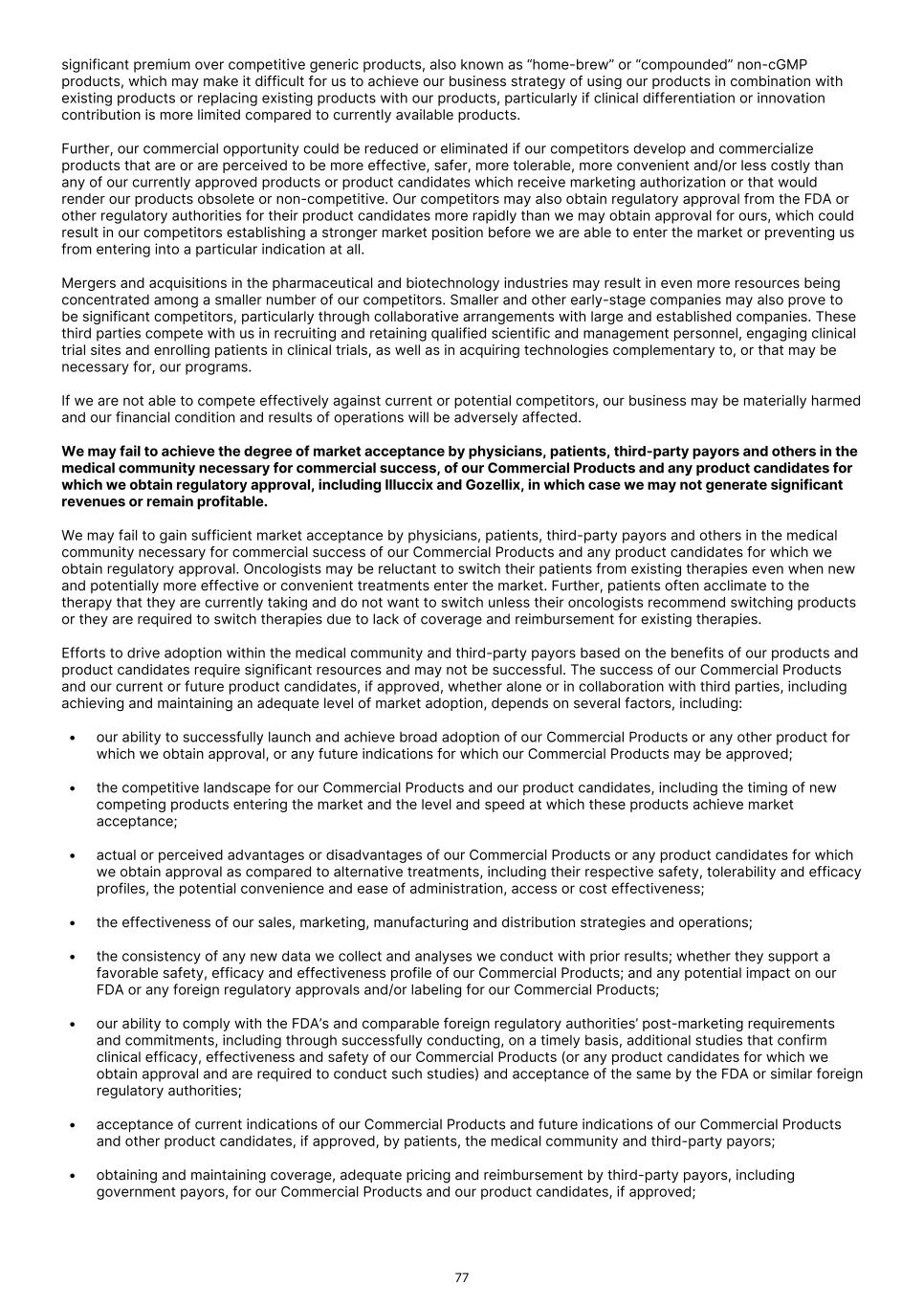 significant premium over competitive generic products, also known as “home-brew” or “compounded” non-cGMP products, which may make it difficult for us to achieve our business strategy of using our products in combination with existing products or replacing existing products with our products, particularly if clinical differentiation or innovation contribution is more limited compared to currently available products. Further, our commercial opportunity could be reduced or eliminated if our competitors develop and commercialize products that are or are perceived to be more effective, safer, more tolerable, more convenient and/or less costly than any of our currently approved products or product candidates which receive marketing authorization or that would render our products obsolete or non-competitive. Our competitors may also obtain regulatory approval from the FDA or other regulatory authorities for their product candidates more rapidly than we may obtain approval for ours, which could result in our competitors establishing a stronger market position before we are able to enter the market or preventing us from entering into a particular indication at all. Mergers and acquisitions in the pharmaceutical and biotechnology industries may result in even more resources being concentrated among a smaller number of our competitors. Smaller and other early-stage companies may also prove to be significant competitors, particularly through collaborative arrangements with large and established companies. These third parties compete with us in recruiting and retaining qualified scientific and management personnel, engaging clinical trial sites and enrolling patients in clinical trials, as well as in acquiring technologies complementary to, or that may be necessary for, our programs. If we are not able to compete effectively against current or potential competitors, our business may be materially harmed and our financial condition and results of operations will be adversely affected. We may fail to achieve the degree of market acceptance by physicians, patients, third-party payors and others in the medical community necessary for commercial success, of our Commercial Products and any product candidates for which we obtain regulatory approval, including Illuccix and Gozellix, in which case we may not generate significant revenues or remain profitable. We may fail to gain sufficient market acceptance by physicians, patients, third-party payors and others in the medical community necessary for commercial success of our Commercial Products and any product candidates for which we obtain regulatory approval. Oncologists may be reluctant to switch their patients from existing therapies even when new and potentially more effective or convenient treatments enter the market. Further, patients often acclimate to the therapy that they are currently taking and do not want to switch unless their oncologists recommend switching products or they are required to switch therapies due to lack of coverage and reimbursement for existing therapies. Efforts to drive adoption within the medical community and third-party payors based on the benefits of our products and product candidates require significant resources and may not be successful. The success of our Commercial Products and our current or future product candidates, if approved, whether alone or in collaboration with third parties, including achieving and maintaining an adequate level of market adoption, depends on several factors, including: • our ability to successfully launch and achieve broad adoption of our Commercial Products or any other product for which we obtain approval, or any future indications for which our Commercial Products may be approved; • the competitive landscape for our Commercial Products and our product candidates, including the timing of new competing products entering the market and the level and speed at which these products achieve market acceptance; • actual or perceived advantages or disadvantages of our Commercial Products or any product candidates for which we obtain approval as compared to alternative treatments, including their respective safety, tolerability and efficacy profiles, the potential convenience and ease of administration, access or cost effectiveness; • the effectiveness of our sales, marketing, manufacturing and distribution strategies and operations; • the consistency of any new data we collect and analyses we conduct with prior results; whether they support a favorable safety, efficacy and effectiveness profile of our Commercial Products; and any potential impact on our FDA or any foreign regulatory approvals and/or labeling for our Commercial Products; • our ability to comply with the FDA’s and comparable foreign regulatory authorities’ post-marketing requirements and commitments, including through successfully conducting, on a timely basis, additional studies that confirm clinical efficacy, effectiveness and safety of our Commercial Products (or any product candidates for which we obtain approval and are required to conduct such studies) and acceptance of the same by the FDA or similar foreign regulatory authorities; • acceptance of current indications of our Commercial Products and future indications of our Commercial Products and other product candidates, if approved, by patients, the medical community and third-party payors; • obtaining and maintaining coverage, adequate pricing and reimbursement by third-party payors, including government payors, for our Commercial Products and our product candidates, if approved; 77