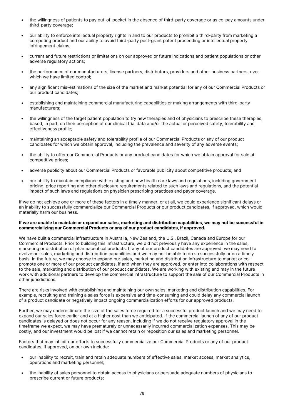 • the willingness of patients to pay out-of-pocket in the absence of third-party coverage or as co-pay amounts under third-party coverage; • our ability to enforce intellectual property rights in and to our products to prohibit a third-party from marketing a competing product and our ability to avoid third-party post-grant patent proceeding or intellectual property infringement claims; • current and future restrictions or limitations on our approved or future indications and patient populations or other adverse regulatory actions; • the performance of our manufacturers, license partners, distributors, providers and other business partners, over which we have limited control; • any significant mis-estimations of the size of the market and market potential for any of our Commercial Products or our product candidates; • establishing and maintaining commercial manufacturing capabilities or making arrangements with third-party manufacturers; • the willingness of the target patient population to try new therapies and of physicians to prescribe these therapies, based, in part, on their perception of our clinical trial data and/or the actual or perceived safety, tolerability and effectiveness profile; • maintaining an acceptable safety and tolerability profile of our Commercial Products or any of our product candidates for which we obtain approval, including the prevalence and severity of any adverse events; • the ability to offer our Commercial Products or any product candidates for which we obtain approval for sale at competitive prices; • adverse publicity about our Commercial Products or favorable publicity about competitive products; and • our ability to maintain compliance with existing and new health care laws and regulations, including government pricing, price reporting and other disclosure requirements related to such laws and regulations, and the potential impact of such laws and regulations on physician prescribing practices and payor coverage. If we do not achieve one or more of these factors in a timely manner, or at all, we could experience significant delays or an inability to successfully commercialize our Commercial Products or our product candidates, if approved, which would materially harm our business. If we are unable to maintain or expand our sales, marketing and distribution capabilities, we may not be successful in commercializing our Commercial Products or any of our product candidates, if approved. We have built a commercial infrastructure in Australia, New Zealand, the U.S., Brazil, Canada and Europe for our Commercial Products. Prior to building this infrastructure, we did not previously have any experience in the sales, marketing or distribution of pharmaceutical products. If any of our product candidates are approved, we may need to evolve our sales, marketing and distribution capabilities and we may not be able to do so successfully or on a timely basis. In the future, we may choose to expand our sales, marketing and distribution infrastructure to market or co- promote one or more of our product candidates, if and when they are approved, or enter into collaborations with respect to the sale, marketing and distribution of our product candidates. We are working with existing and may in the future work with additional partners to develop the commercial infrastructure to support the sale of our Commercial Products in other jurisdictions. There are risks involved with establishing and maintaining our own sales, marketing and distribution capabilities. For example, recruiting and training a sales force is expensive and time-consuming and could delay any commercial launch of a product candidate or negatively impact ongoing commercialization efforts for our approved products. Further, we may underestimate the size of the sales force required for a successful product launch and we may need to expand our sales force earlier and at a higher cost than we anticipated. If the commercial launch of any of our product candidates is delayed or does not occur for any reason, including if we do not receive regulatory approval in the timeframe we expect, we may have prematurely or unnecessarily incurred commercialization expenses. This may be costly, and our investment would be lost if we cannot retain or reposition our sales and marketing personnel. Factors that may inhibit our efforts to successfully commercialize our Commercial Products or any of our product candidates, if approved, on our own include: • our inability to recruit, train and retain adequate numbers of effective sales, market access, market analytics, operations and marketing personnel; • the inability of sales personnel to obtain access to physicians or persuade adequate numbers of physicians to prescribe current or future products; 78
