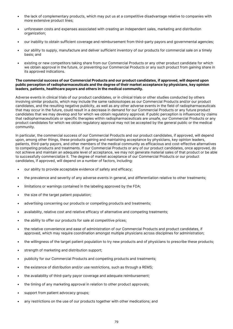 • the lack of complementary products, which may put us at a competitive disadvantage relative to companies with more extensive product lines; • unforeseen costs and expenses associated with creating an independent sales, marketing and distribution organization; • our inability to obtain sufficient coverage and reimbursement from third-party payors and governmental agencies; • our ability to supply, manufacture and deliver sufficient inventory of our products for commercial sale on a timely basis; and • existing or new competitors taking share from our Commercial Products or any other product candidate for which we obtain approval in the future, or preventing our Commercial Products or any such product from gaining share in its approved indications. The commercial success of our Commercial Products and our product candidates, if approved, will depend upon public perception of radiopharmaceuticals and the degree of their market acceptance by physicians, key opinion leaders, patients, healthcare payors and others in the medical community. Adverse events in clinical trials of our product candidates, or in clinical trials or other studies conducted by others involving similar products, which may include the same radioisotopes as our Commercial Products and/or our product candidates, and the resulting negative publicity, as well as any other adverse events in the field of radiopharmaceuticals that may occur in the future, could result in a decrease in demand for our Commercial Products or any future product candidates that we may develop and for which we obtain regulatory approval. If public perception is influenced by claims that radiopharmaceuticals or specific therapies within radiopharmaceuticals are unsafe, our Commercial Products or any product candidates for which we obtain regulatory approval may not be accepted by the general public or the medical community. In particular, the commercial success of our Commercial Products and our product candidates, if approved, will depend upon, among other things, these products gaining and maintaining acceptance by physicians, key opinion leaders, patients, third-party payors, and other members of the medical community as efficacious and cost-effective alternatives to competing products and treatments. If our Commercial Products or any of our product candidates, once approved, do not achieve and maintain an adequate level of acceptance, we may not generate material sales of that product or be able to successfully commercialize it. The degree of market acceptance of our Commercial Products or our product candidates, if approved, will depend on a number of factors, including: • our ability to provide acceptable evidence of safety and efficacy; • the prevalence and severity of any adverse events in general, and differentiation relative to other treatments; • limitations or warnings contained in the labeling approved by the FDA; • the size of the target patient population; • advertising concerning our products or competing products and treatments; • availability, relative cost and relative efficacy of alternative and competing treatments; • the ability to offer our products for sale at competitive prices; • the relative convenience and ease of administration of our Commercial Products and product candidates, if approved, which may require coordination amongst multiple physicians across disciplines for administration; • the willingness of the target patient population to try new products and of physicians to prescribe these products; • strength of marketing and distribution support; • publicity for our Commercial Products and competing products and treatments; • the existence of distribution and/or use restrictions, such as through a REMS; • the availability of third-party payor coverage and adequate reimbursement; • the timing of any marketing approval in relation to other product approvals; • support from patient advocacy groups; • any restrictions on the use of our products together with other medications; and 79