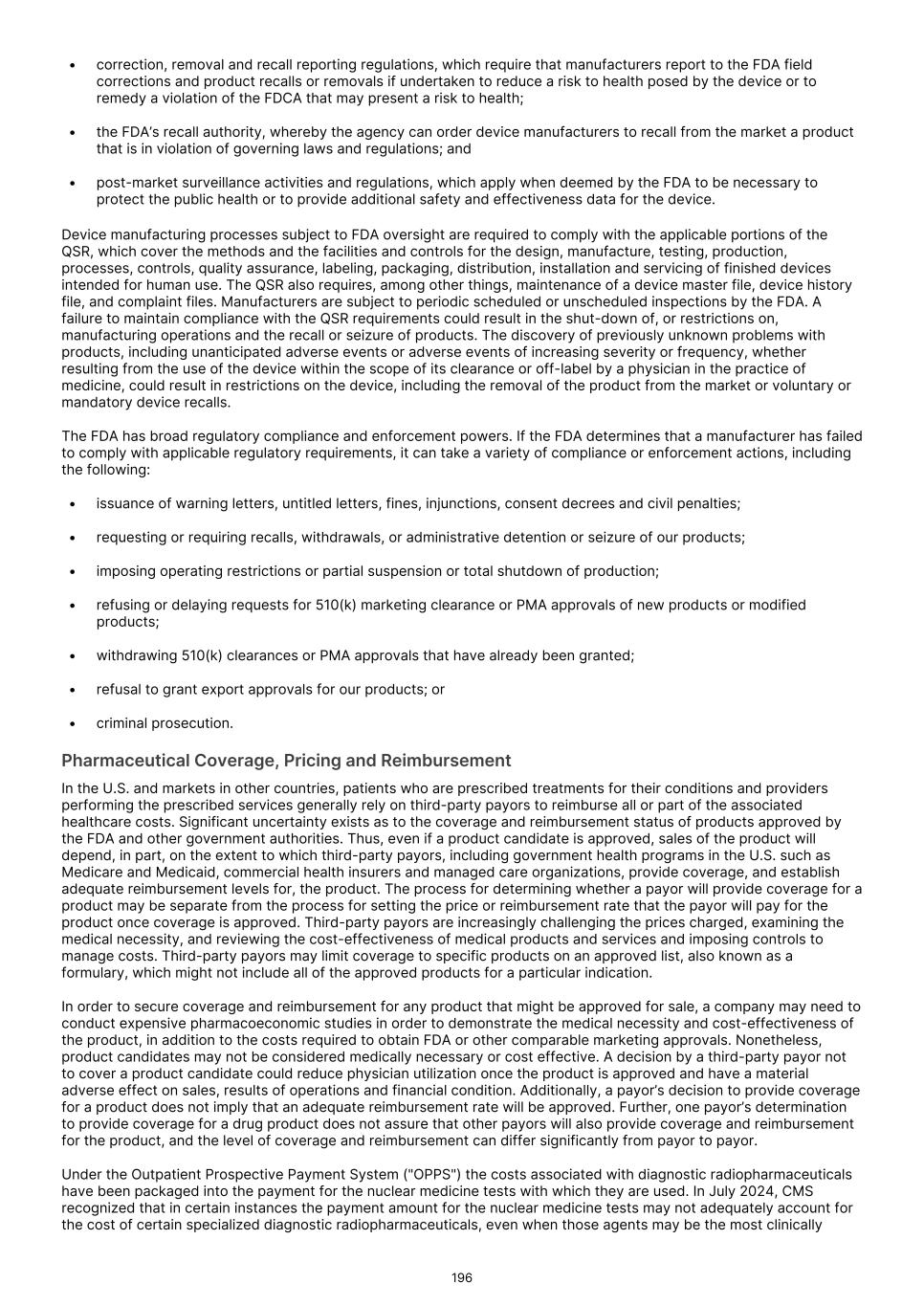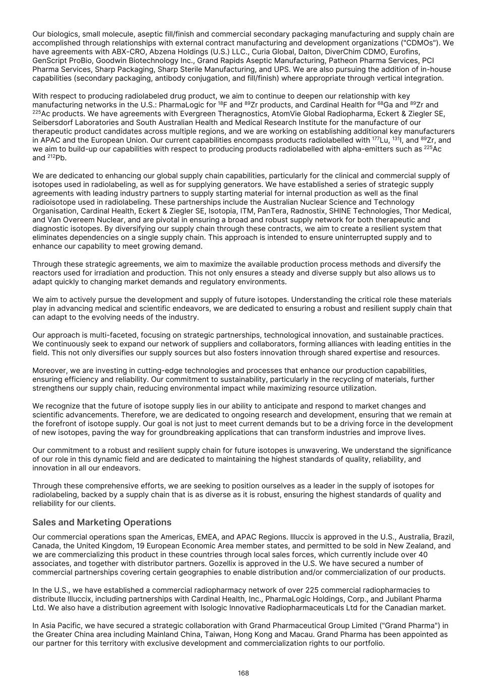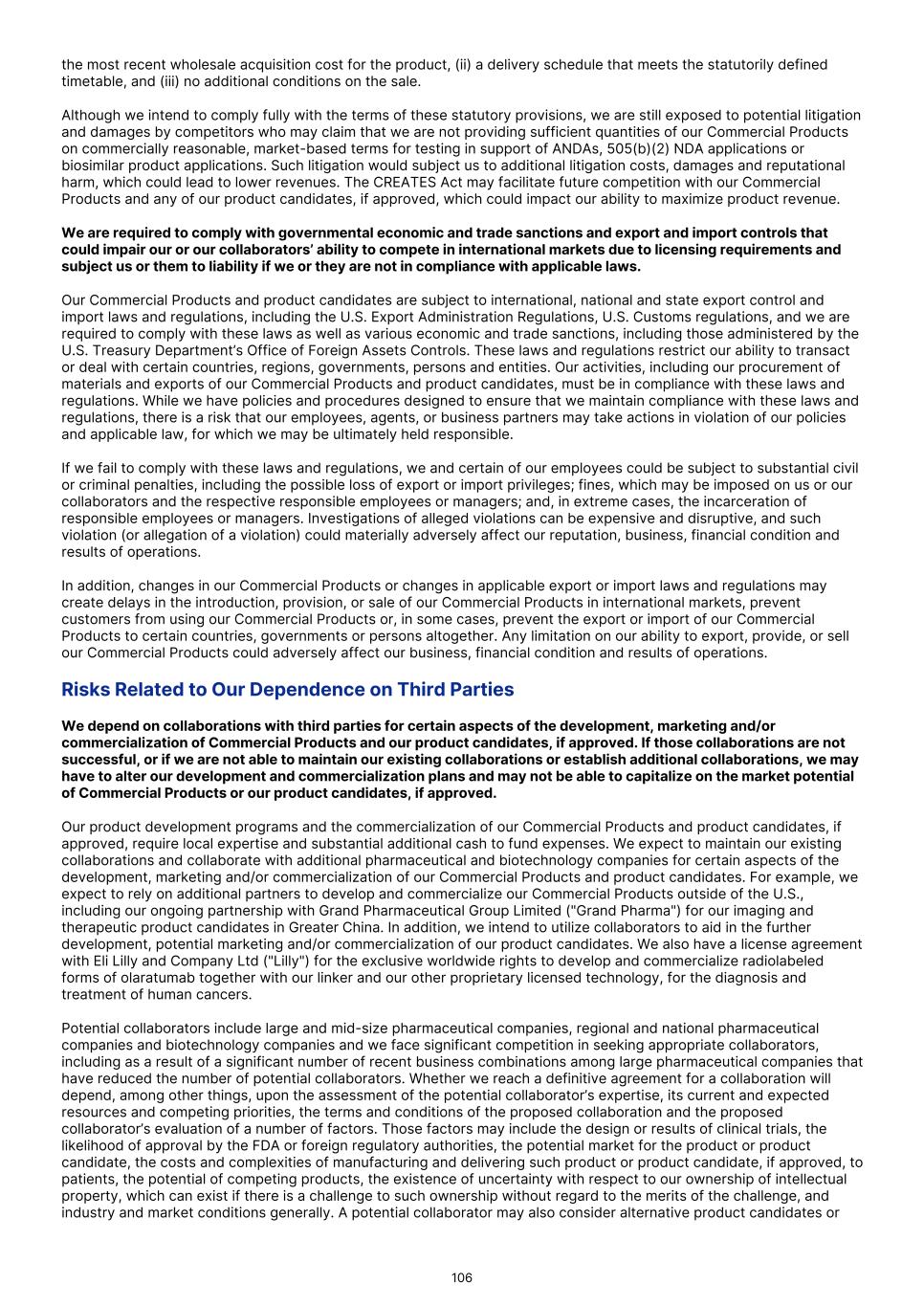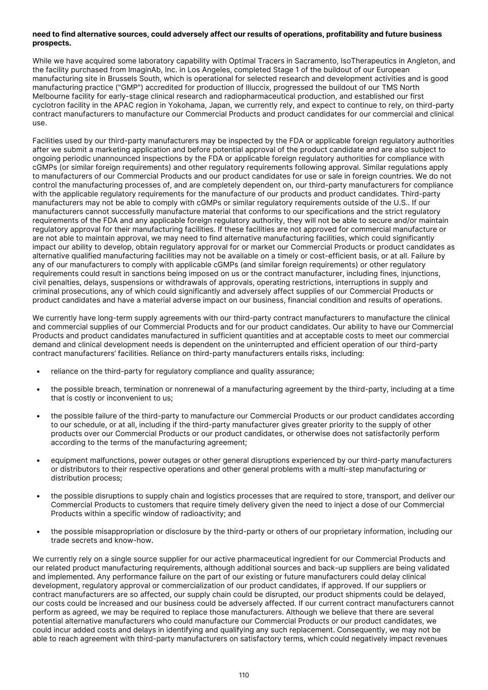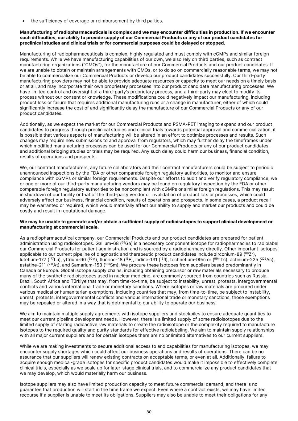 • the sufficiency of coverage or reimbursement by third parties. Manufacturing of radiopharmaceuticals is complex and we may encounter difficulties in production. If we encounter such difficulties, our ability to provide supply of our Commercial Products or any of our product candidates for preclinical studies and clinical trials or for commercial purposes could be delayed or stopped. Manufacturing of radiopharmaceuticals is complex, highly regulated and must comply with cGMPs and similar foreign requirements. While we have manufacturing capabilities of our own, we also rely on third parties, such as contract manufacturing organizations ("CMOs"), for the manufacture of our Commercial Products and our product candidates. If we are unable to obtain or maintain arrangements with CMOs, or to do so on commercially reasonable terms, we may not be able to commercialize our Commercial Products or develop our product candidates successfully. Our third-party manufacturing providers may not be able to provide adequate resources or capacity to meet our needs on a timely basis or at all, and may incorporate their own proprietary processes into our product candidate manufacturing processes. We have limited control and oversight of a third-party’s proprietary process, and a third-party may elect to modify its process without our consent or knowledge. These modifications could negatively impact our manufacturing, including product loss or failure that requires additional manufacturing runs or a change in manufacturer, either of which could significantly increase the cost of and significantly delay the manufacture of our Commercial Products or any of our product candidates. Additionally, as we expect the market for our Commercial Products and PSMA-PET imaging to expand and our product candidates to progress through preclinical studies and clinical trials towards potential approval and commercialization, it is possible that various aspects of manufacturing will be altered in an effort to optimize processes and results. Such changes may require new submissions to and approval from regulators, which may further delay the timeframes under which modified manufacturing processes can be used for our Commercial Products or any of our product candidates, and additional bridging studies or trials may be required. Any such delay could harm our business, financial condition, results of operations and prospects. We, our contract manufacturers, any future collaborators and their contract manufacturers could be subject to periodic unannounced inspections by the FDA or other comparable foreign regulatory authorities, to monitor and ensure compliance with cGMPs or similar foreign requirements. Despite our efforts to audit and verify regulatory compliance, we or one or more of our third-party manufacturing vendors may be found on regulatory inspection by the FDA or other comparable foreign regulatory authorities to be noncompliant with cGMPs or similar foreign regulations. This may result in shutdown of our facility or that of the third-party vendor or invalidation of product lots or processes, which could adversely affect our business, financial condition, results of operations and prospects. In some cases, a product recall may be warranted or required, which would materially affect our ability to supply and market our products and could be costly and result in reputational damage. We may be unable to generate and/or obtain a sufficient supply of radioisotopes to support clinical development or manufacturing at commercial scale. As a radiopharmaceutical company, our Commercial Products and our product candidates are prepared for patient administration using radioisotopes. Gallium-68 (68Ga) is a necessary component isotope for radiopharmacies to radiolabel our Commercial Products for patient administration and is sourced by a radiopharmacy directly. Other important isotopes applicable to our current pipeline of diagnostic and therapeutic product candidates include zirconium-89 (89Zr), lutetium-177 (177Lu), yttrium-90 (90Y), fluorine-18 (18F), iodine-131 (131I), technetium-99m or (99mTc), actinium-225 (225Ac), astatine-211 (211At), and Samarium-153 (153Sm). We procure these isotopes from suppliers based predominantly in Canada or Europe. Global isotope supply chains, including obtaining precursor or raw materials necessary to produce many of the synthetic radioisotopes used in nuclear medicine, are commonly sourced from countries such as Russia, Brazil, South Africa and Türkiye that may, from time-to-time, be subject to instability, unrest, protests, intergovernmental conflicts and various international trade or monetary sanctions. Where isotopes or raw materials are procured under various medical or humanitarian exemptions, including countries that may, from time-to-time, be subject to instability, unrest, protests, intergovernmental conflicts and various international trade or monetary sanctions, those exemptions may be repealed or altered in a way that is detrimental to our ability to operate our business. We aim to maintain multiple supply agreements with isotope suppliers and stockpiles to ensure adequate quantities to meet our current pipeline development needs. However, there is a limited supply of some radioisotopes due to the limited supply of starting radioactive raw materials to create the radioisotope or the complexity required to manufacture isotopes to the required quality and purity standards for effective radiolabeling. We aim to maintain supply relationships with all major current suppliers and for certain isotopes there are no or limited alternatives to our current suppliers. While we are making investments to secure additional access to and capabilities for manufacturing isotopes, we may encounter supply shortages which could affect our business operations and results of operations. There can be no assurance that our suppliers will renew existing contracts on acceptable terms, or even at all. Additi