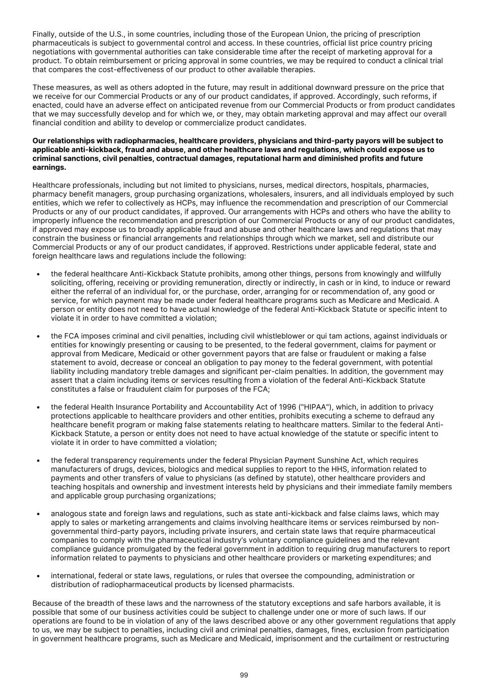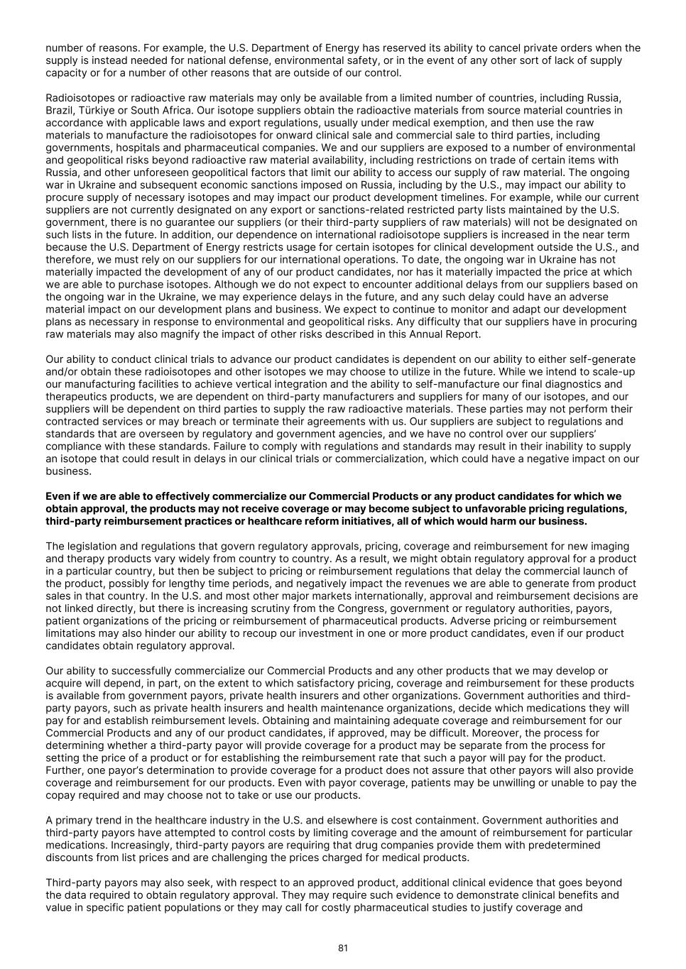 number of reasons. For example, the U.S. Department of Energy has reserved its ability to cancel private orders when the supply is instead needed for national defense, environmental safety, or in the event of any other sort of lack of supply capacity or for a number of other reasons that are outside of our control. Radioisotopes or radioactive raw materials may only be available from a limited number of countries, including Russia, Brazil, Türkiye or South Africa. Our isotope suppliers obtain the radioactive materials from source material countries in accordance with applicable laws and export regulations, usually under medical exemption, and then use the raw materials to manufacture the radioisotopes for onward clinical sale and commercial sale to third parties, including governments, hospitals and pharmaceutical companies. We and our suppliers are exposed to a number of environmental and geopolitical risks beyond radioactive raw material availability, including restrictions on trade of certain items with Russia, and other unforeseen geopolitical factors that limit our ability to access our supply of raw material. The ongoing war in Ukraine and subsequent economic sanctions imposed on Russia, including by the U.S., may impact our ability to procure supply of necessary isotopes and may impact our product development timelines. For example, while our current suppliers are not currently designated on any export or sanctions-related restricted party lists maintained by the U.S. government, there is no guarantee our suppliers (or their third-party suppliers of raw materials) will not be designated on such lists in the future. In addition, our dependence on international radioisotope suppliers is increased in the near term because the U.S. Department of Energy restricts usage for certain isotopes for clinical development outside the U.S., and therefore, we must rely on our suppliers for our international operations. To date, the ongoing war in Ukraine has not materially impacted the development of any of our product candidates, nor has it materially impacted the price at which we are able to purchase isotopes. Although we do not expect to encounter additional delays from our suppliers based on the ongoing war in the Ukraine, we may experience delays in the future, and any such delay could have an adverse material impact on our development plans and business. We expect to continue to monitor and adapt our development plans as necessary in response to environmental and geopolitical risks. Any difficulty that our suppliers have in procuring raw materials may also magnify the impact of other risks described in this Annual Report. Our ability to conduct clinical trials to advance our product candidates is dependent on our ability to either self-generate and/or obtain these radioisotopes and other isotopes we may choose to utilize in the future. While we intend to scale-up our manufacturing facilities to achieve vertical integration and the ability to self-manufacture our final diagnostics and therapeutics products, we are dependent on third-party manufacturers and suppliers for many of our isotopes, and our suppliers will be dependent on third parties to supply the raw radioactive materials. These parties may not perform their contracted services or may breach or terminate their agreements with us. Our suppliers are subject to regulations and standards that are overseen by regulatory and government agencies, and we have no control over our suppliers’ compliance with these standards. Failure to comply with regulations and standards may result in their inability to supply an isotope that could result in delays in our clinical trials or commercialization, which could have a negative impact on our business. Even if we are able to effectively commercialize our Commercial Products or any product candidates for which we obtain approval, the products may not receive coverage or may become subject to unfavorable pricing regulations, third-party reimbursement practices or healthcare reform initiatives, all of which would harm our business. The legislation and regulations that govern regulatory approvals, pricing, coverage and reimbursement for new imaging and therapy products vary widely from country to country. As a result, we might obtain regulatory approval for a product in a particular country, but then be subject to pricing or reimbursement regulations that delay the commercial launch of the product, possibly for lengthy time periods, and negatively impact the revenues we are able to generate from product sales in that country. In the U.S. and most other major markets internationally, approval and reimbursement decisions are not linked directly, but there is increasing scrutiny from the Congress, government or regulatory authorities, payors, patient organizations of the pricing or reimbursement of pharmaceutical products. Adverse pricing or reimbursement limitations may also hinder our ability to recoup our investment in one or more product candidates, even if our product candidates obtain regulatory approval. Our ability to successfully commercialize our Commercial Products and any other products that we may develop or acquire will depend, in part, on the extent to which satisfactory pricing, coverage and reimbursement for these products is available from government payors, private health insurers and other organizations. Government authorities and third- party payors, such as private health insurers and health maintenance organizations, decide which medications they will pay for and establish reimbursement levels. Obtaining and maintaining adequate coverage and reimbursement for our Commercial Products and any of our product candidates, if approved, may be difficult. Moreover, the process for determining whether a third-party payor will provide coverage for a product may be separate from the process for setting the price of a product or for establishing the reimbursement rate that such a payor wil