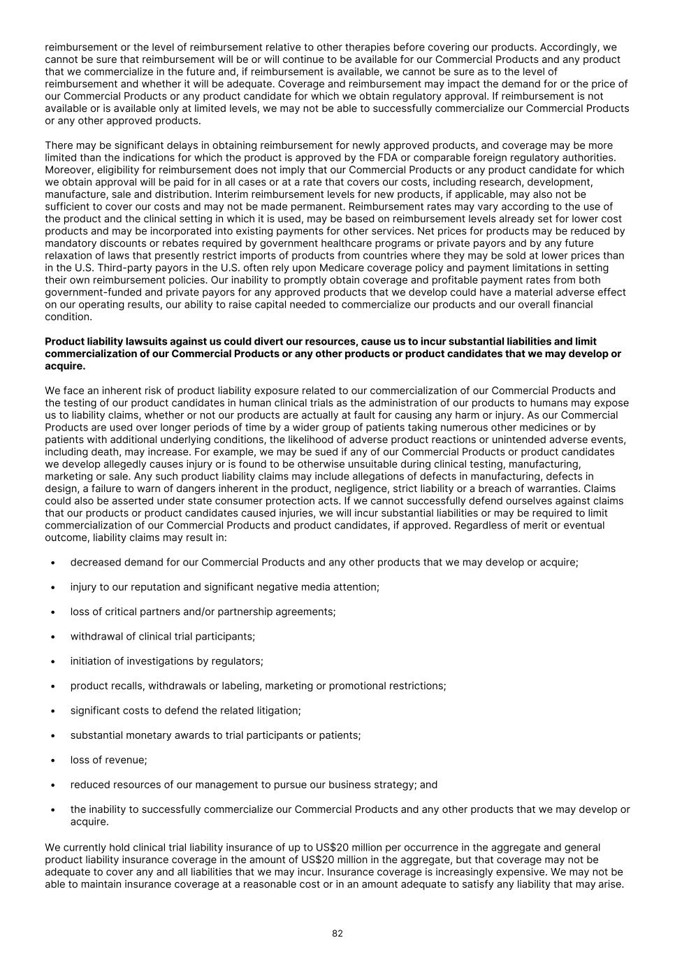 reimbursement or the level of reimbursement relative to other therapies before covering our products. Accordingly, we cannot be sure that reimbursement will be or will continue to be available for our Commercial Products and any product that we commercialize in the future and, if reimbursement is available, we cannot be sure as to the level of reimbursement and whether it will be adequate. Coverage and reimbursement may impact the demand for or the price of our Commercial Products or any product candidate for which we obtain regulatory approval. If reimbursement is not available or is available only at limited levels, we may not be able to successfully commercialize our Commercial Products or any other approved products. There may be significant delays in obtaining reimbursement for newly approved products, and coverage may be more limited than the indications for which the product is approved by the FDA or comparable foreign regulatory authorities. Moreover, eligibility for reimbursement does not imply that our Commercial Products or any product candidate for which we obtain approval will be paid for in all cases or at a rate that covers our costs, including research, development, manufacture, sale and distribution. Interim reimbursement levels for new products, if applicable, may also not be sufficient to cover our costs and may not be made permanent. Reimbursement rates may vary according to the use of the product and the clinical setting in which it is used, may be based on reimbursement levels already set for lower cost products and may be incorporated into existing payments for other services. Net prices for products may be reduced by mandatory discounts or rebates required by government healthcare programs or private payors and by any future relaxation of laws that presently restrict imports of products from countries where they may be sold at lower prices than in the U.S. Third-party payors in the U.S. often rely upon Medicare coverage policy and payment limitations in setting their own reimbursement policies. Our inability to promptly obtain coverage and profitable payment rates from both government-funded and private payors for any approved products that we develop could have a material adverse effect on our operating results, our ability to raise capital needed to commercialize our products and our overall financial condition. Product liability lawsuits against us could divert our resources, cause us to incur substantial liabilities and limit commercialization of our Commercial Products or any other products or product candidates that we may develop or acquire. We face an inherent risk of product liability exposure related to our commercialization of our Commercial Products and the testing of our product candidates in human clinical trials as the administration of our products to humans may expose us to liability claims, whether or not our products are actually at fault for causing any harm or injury. As our Commercial Products are used over longer periods of time by a wider group of patients taking numerous other medicines or by patients with additional underlying conditions, the likelihood of adverse product reactions or unintended adverse events, including death, may increase. For example, we may be sued if any of our Commercial Products or product candidates we develop allegedly causes injury or is found to be otherwise unsuitable during clinical testing, manufacturing, marketing or sale. Any such product liability claims may include allegations of defects in manufacturing, defects in design, a failure to warn of dangers inherent in the product, negligence, strict liability or a breach of warranties. Claims could also be asserted under state consumer protection acts. If we cannot successfully defend ourselves against claims that our products or product candidates caused injuries, we will incur substantial liabilities or may be required to limit commercialization of our Commercial Products and product candidates, if approved. Regardless of merit or eventual outcome, liability claims may result in: • decreased demand for our Commercial Products and any other products that we may develop or acquire; • injury to our reputation and significant negative media attention; • loss of critical partners and/or partnership agreements; • withdrawal of clinical trial participants; • initiation of investigations by regulators; • product recalls, withdrawals or labeling, marketing or promotional restrictions; • significant costs to defend the related litigation; • substantial monetary awards to trial participants or patients; • loss of revenue; • reduced resources of our management to pursue our business strategy; and • the inability to successfully commercialize our Commercial Products and any other products that we may develop or acquire. We currently hold clinical trial liability insurance of up to US$20 million per occurrence in the aggregate and general product liability insurance coverage in the amount of US$20 million in the aggregate, but that coverage may not be adequate to cover any and all liabilities that we may incur. Insurance coverage is increasingly expensive. We may not be able to maintain insurance coverage at a reasonable cost or in an amount adequate to satisfy any liability that may arise. 82