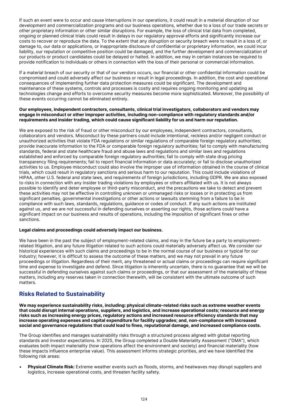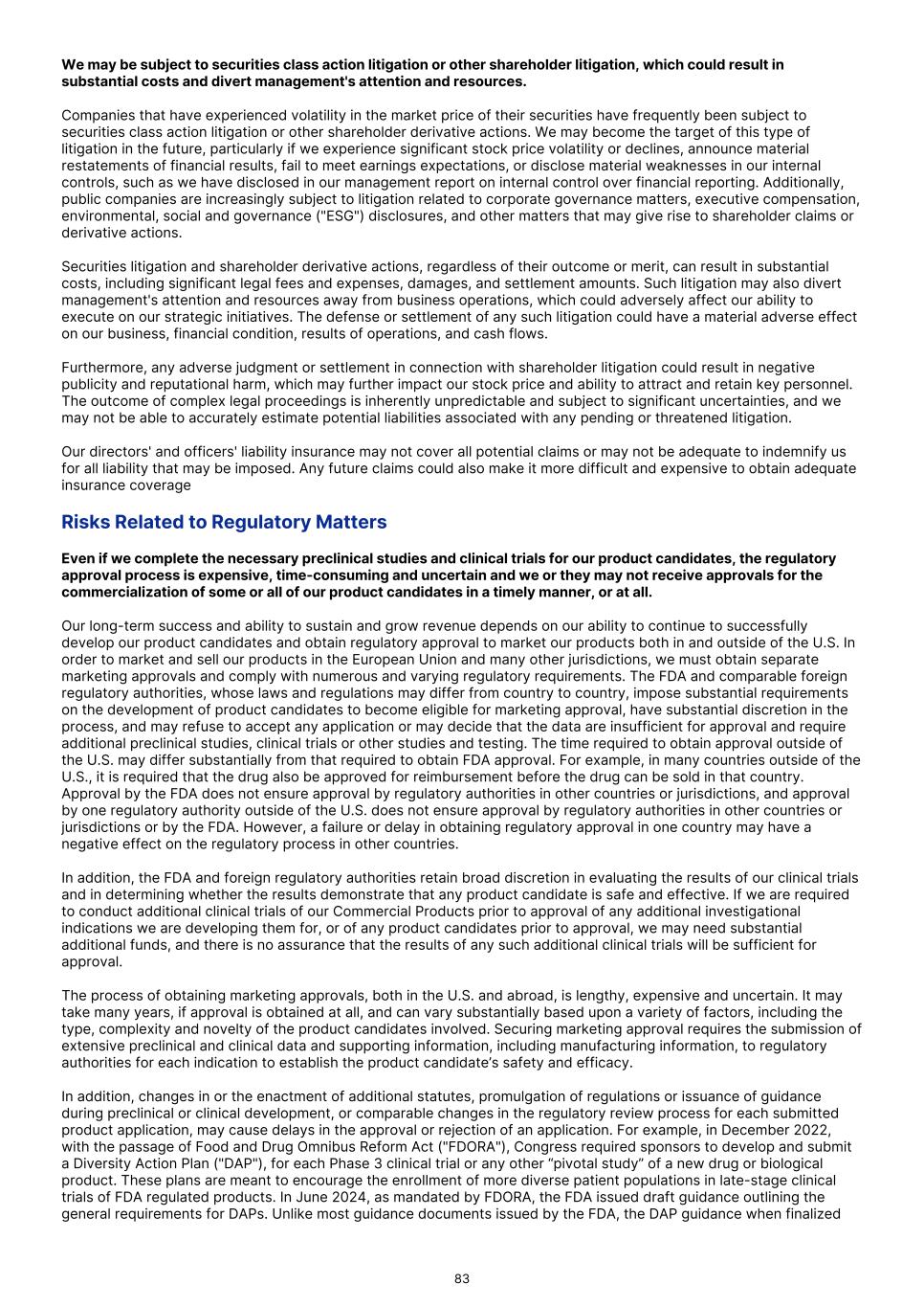 We may be subject to securities class action litigation or other shareholder litigation, which could result in substantial costs and divert management's attention and resources. Companies that have experienced volatility in the market price of their securities have frequently been subject to securities class action litigation or other shareholder derivative actions. We may become the target of this type of litigation in the future, particularly if we experience significant stock price volatility or declines, announce material restatements of financial results, fail to meet earnings expectations, or disclose material weaknesses in our internal controls, such as we have disclosed in our management report on internal control over financial reporting. Additionally, public companies are increasingly subject to litigation related to corporate governance matters, executive compensation, environmental, social and governance ("ESG") disclosures, and other matters that may give rise to shareholder claims or derivative actions. Securities litigation and shareholder derivative actions, regardless of their outcome or merit, can result in substantial costs, including significant legal fees and expenses, damages, and settlement amounts. Such litigation may also divert management's attention and resources away from business operations, which could adversely affect our ability to execute on our strategic initiatives. The defense or settlement of any such litigation could have a material adverse effect on our business, financial condition, results of operations, and cash flows. Furthermore, any adverse judgment or settlement in connection with shareholder litigation could result in negative publicity and reputational harm, which may further impact our stock price and ability to attract and retain key personnel. The outcome of complex legal proceedings is inherently unpredictable and subject to significant uncertainties, and we may not be able to accurately estimate potential liabilities associated with any pending or threatened litigation. Our directors' and officers' liability insurance may not cover all potential claims or may not be adequate to indemnify us for all liability that may be imposed. Any future claims could also make it more difficult and expensive to obtain adequate insurance coverage Risks Related to Regulatory Matters Even if we complete the necessary preclinical studies and clinical trials for our product candidates, the regulatory approval process is expensive, time-consuming and uncertain and we or they may not receive approvals for the commercialization of some or all of our product candidates in a timely manner, or at all. Our long-term success and ability to sustain and grow revenue depends on our ability to continue to successfully develop our product candidates and obtain regulatory approval to market our products both in and outside of the U.S. In order to market and sell our products in the European Union and many other jurisdictions, we must obtain separate marketing approvals and comply with numerous and varying regulatory requirements. The FDA and comparable foreign regulatory authorities, whose laws and regulations may differ from country to country, impose substantial requirements on the development of product candidates to become eligible for marketing approval, have substantial discretion in the process, and may refuse to accept any application or may decide that the data are insufficient for approval and require additional preclinical studies, clinical trials or other studies and testing. The time required to obtain approval outside of the U.S. may differ substantially from that required to obtain FDA approval. For example, in many countries outside of the U.S., it is required that the drug also be approved for reimbursement before the drug can be sold in that country. Approval by the FDA does not ensure approval by regulatory authorities in other countries or jurisdictions, and approval by one regulatory authority outside of the U.S. does not ensure approval by regulatory authorities in other countries or jurisdictions or by the FDA. However, a failure or delay in obtaining regulatory approval in one country may have a negative effect on the regulatory process in other countries. In addition, the FDA and foreign regulatory authorities retain broad discretion in evaluating the results of our clinical trials and in determining whether the results demonstrate that any product candidate is safe and effective. If we are required to conduct additional clinical trials of our Commercial Products prior to approval of any additional investigational indications we are developing them for, or of any product candidates prior to approval, we may need substantial additional funds, and there is no assurance that the results of any such additional clinical trials will be sufficient for approval. The process of obtaining marketing approvals, both in the U.S. and abroad, is lengthy, expensive and uncertain. It may take many years, if approval is obtained at all, and can vary substantially based upon a variety of factors, including the type, complexity and novelty of the product candidates involved. Securing marketing approval requires the submission of extensive preclinical and clinical data and supporting information, including manufacturing information, to regulatory authorities for each indication to establish the product candidate’s safety and efficacy. In addition, changes in or the enactment of additional statutes, promulgation of regulations or issuance of guidance during preclinical or clinical development, or comparable changes in the regulatory review process for each submitted product application, may cause delays in the approval or rejection of an application. For example, in December 2022, with the passage of Food and Drug Omnibus Reform Act ("FDORA"), Congress required sponsors to develop and submit a Diversity Action Plan ("DAP"), for each Phase 3 clinical trial or any o
