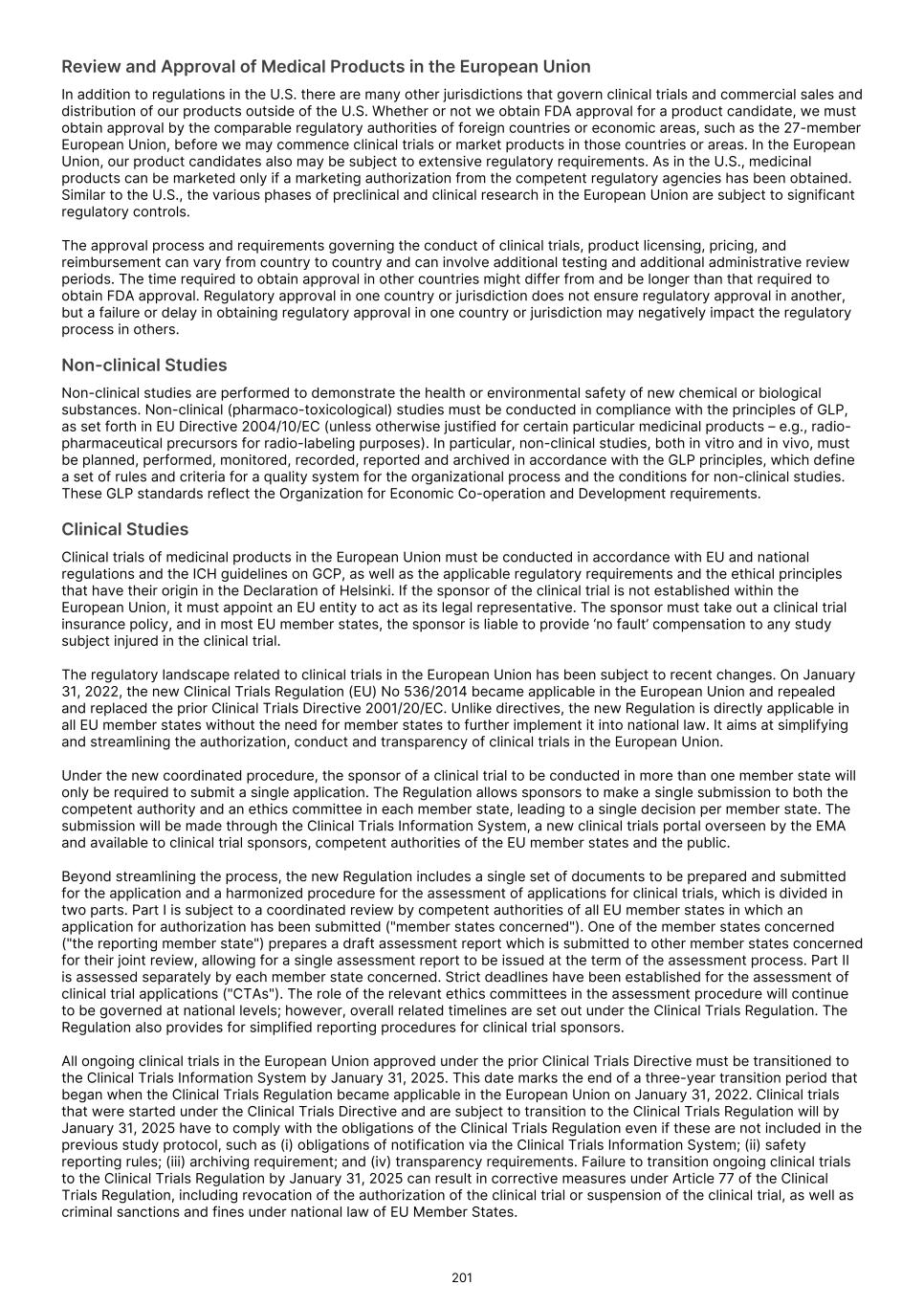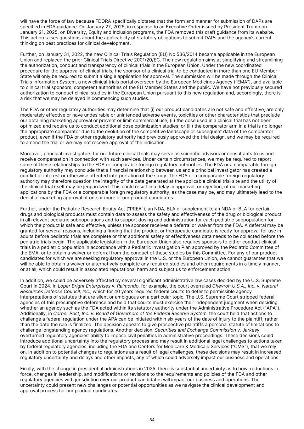 will have the force of law because FDORA specifically dictates that the form and manner for submission of DAPs are specified in FDA guidance. On January 27, 2025, in response to an Executive Order issued by President Trump on January 21, 2025, on Diversity, Equity and Inclusion programs, the FDA removed this draft guidance from its website. This action raises questions about the applicability of statutory obligations to submit DAPs and the agency’s current thinking on best practices for clinical development. Further, on January 31, 2022, the new Clinical Trials Regulation (EU) No 536/2014 became applicable in the European Union and replaced the prior Clinical Trials Directive 2001/20/EC. The new regulation aims at simplifying and streamlining the authorization, conduct and transparency of clinical trials in the European Union. Under the new coordinated procedure for the approval of clinical trials, the sponsor of a clinical trial to be conducted in more than one EU Member State will only be required to submit a single application for approval. The submission will be made through the Clinical Trials Information System, a new clinical trials portal overseen by the European Medicines Agency ("EMA"), and available to clinical trial sponsors, competent authorities of the EU Member States and the public. We have not previously secured authorization to conduct clinical studies in the European Union pursuant to this new regulation and, accordingly, there is a risk that we may be delayed in commencing such studies. The FDA or other regulatory authorities may determine that (i) our product candidates are not safe and effective, are only moderately effective or have undesirable or unintended adverse events, toxicities or other characteristics that preclude our obtaining marketing approval or prevent or limit commercial use; (ii) the dose used in a clinical trial has not been optimized and require us to conduct additional dose optimization studies; or (iii) the comparator arm in a trial is no longer the appropriate comparator due to the evolution of the competitive landscape or subsequent data of the comparator product, even if the FDA or other regulatory authority had previously approved the trial design, and we may be required to amend the trial or we may not receive approval of the indication. Moreover, principal investigators for our future clinical trials may serve as scientific advisors or consultants to us and receive compensation in connection with such services. Under certain circumstances, we may be required to report some of these relationships to the FDA or comparable foreign regulatory authorities. The FDA or a comparable foreign regulatory authority may conclude that a financial relationship between us and a principal investigator has created a conflict of interest or otherwise affected interpretation of the study. The FDA or a comparable foreign regulatory authority may therefore question the integrity of the data generated at the applicable clinical trial site and the utility of the clinical trial itself may be jeopardized. This could result in a delay in approval, or rejection, of our marketing applications by the FDA or a comparable foreign regulatory authority, as the case may be, and may ultimately lead to the denial of marketing approval of one or more of our product candidates. Further, under the Pediatric Research Equity Act ("PREA"), an NDA, BLA or supplement to an NDA or BLA for certain drugs and biological products must contain data to assess the safety and effectiveness of the drug or biological product in all relevant pediatric subpopulations and to support dosing and administration for each pediatric subpopulation for which the product is safe and effective, unless the sponsor receives a deferral or waiver from the FDA. A deferral may be granted for several reasons, including a finding that the product or therapeutic candidate is ready for approval for use in adults before pediatric trials are complete or that additional safety or effectiveness data needs to be collected before the pediatric trials begin. The applicable legislation in the European Union also requires sponsors to either conduct clinical trials in a pediatric population in accordance with a Pediatric Investigation Plan approved by the Pediatric Committee of the EMA, or to obtain a waiver or deferral from the conduct of these studies by this Committee. For any of our product candidates for which we are seeking regulatory approval in the U.S. or the European Union, we cannot guarantee that we will be able to obtain a waiver or alternatively complete any required studies and other requirements in a timely manner, or at all, which could result in associated reputational harm and subject us to enforcement action. In addition, we could be adversely affected by several significant administrative law cases decided by the U.S. Supreme Court in 2024. In Loper Bright Enterprises v. Raimondo, for example, the court overruled Chevron U.S.A., Inc. v. Natural Resources Defense Council, Inc., which for 40 years required federal courts to defer to permissible agency interpretations of statutes that are silent or ambiguous on a particular topic. The U.S. Supreme Court stripped federal agencies of this presumptive deference and held that courts must exercise their independent judgment when deciding whether an agency such as the FDA acted within its statutory authority under the Administrative Procedure Act ("APA"). Additionally, in Corner Post, Inc. v. Board of Governors of the Federal Reserve System, the court held that actions to challenge a federal regulation under the APA can be initiated within six years of the date of injury to the plaintiff, rather than the date the rule is finalized. The decision appears to give prospective plaintiffs a personal statute of limitations to challenge longstanding agency regulations. Another decision, Securities and Exchange Commission v. Jarkesy, overturned regulatory agencies’ abil