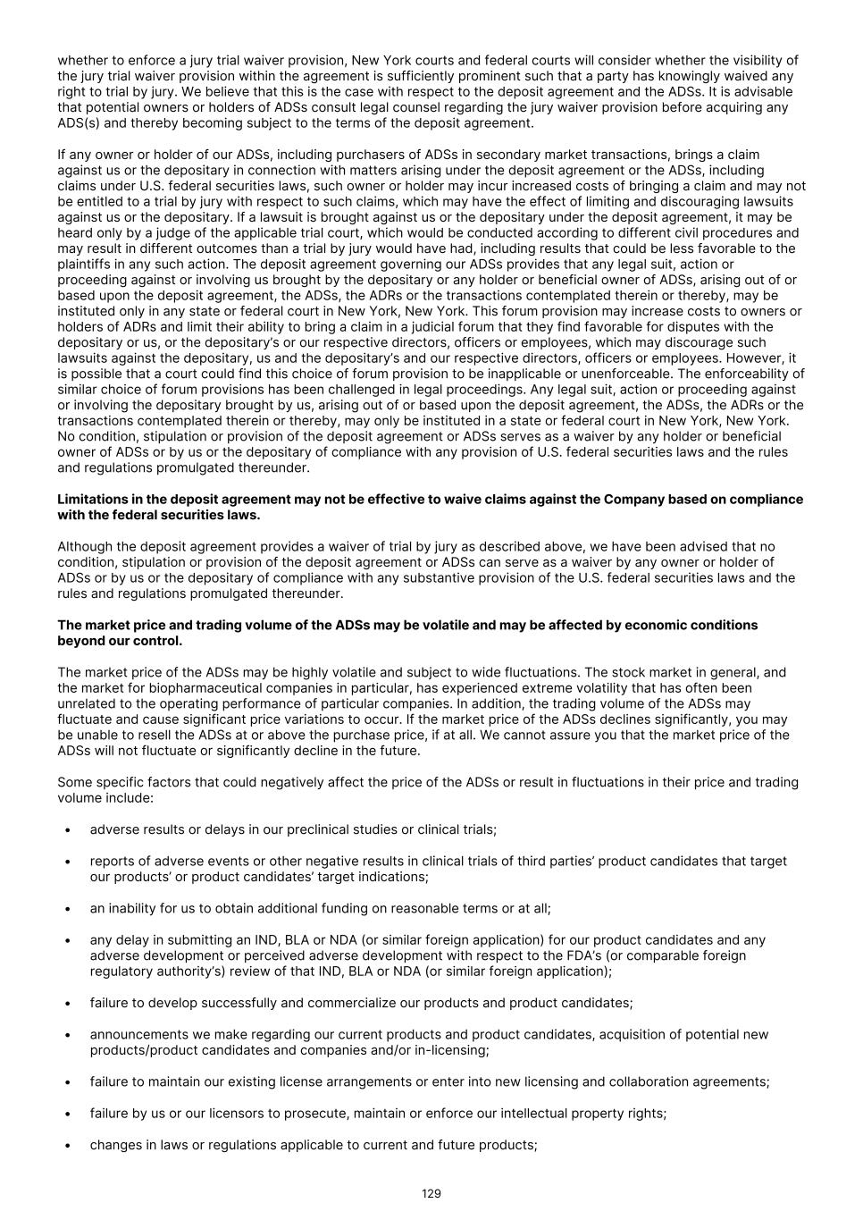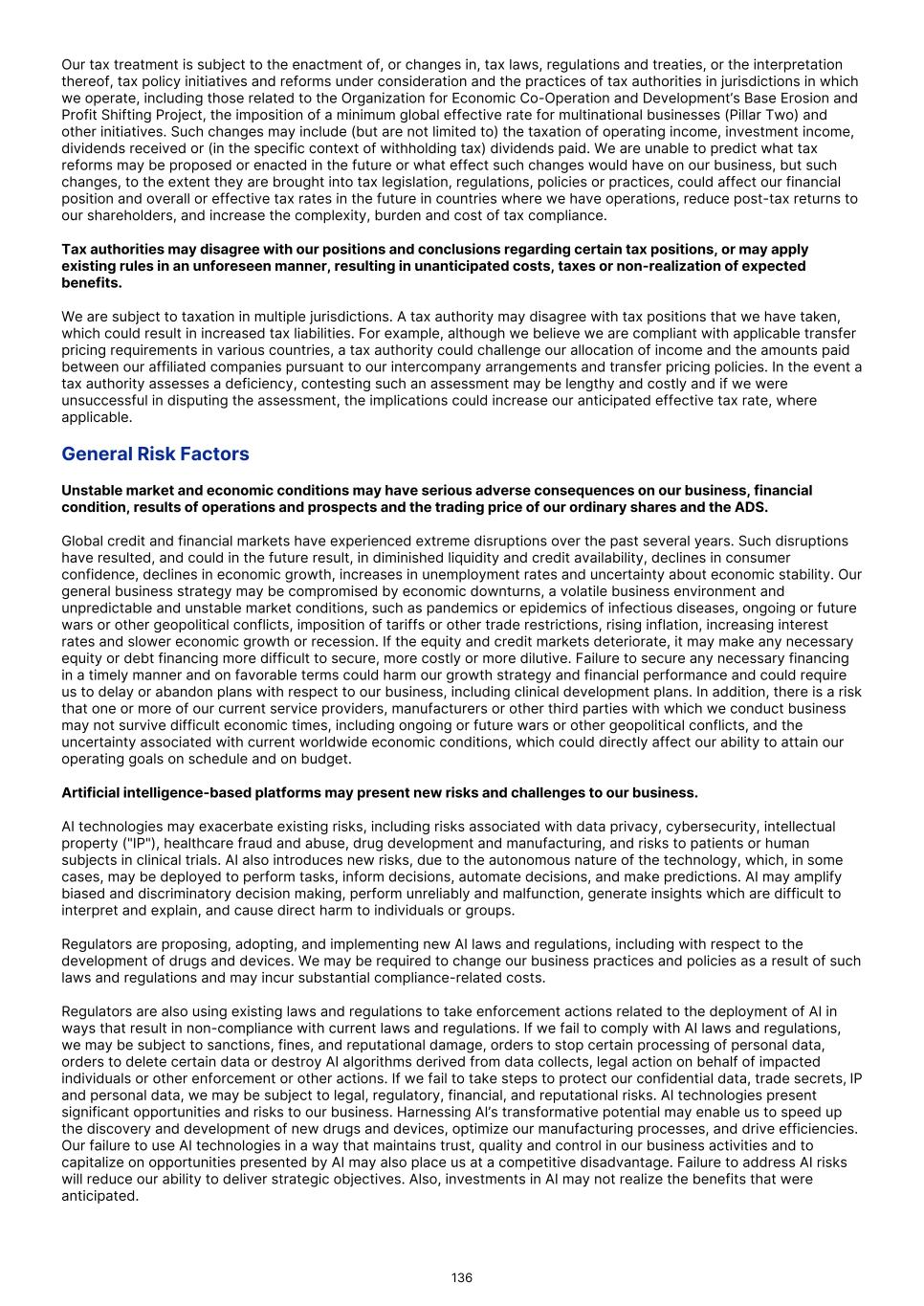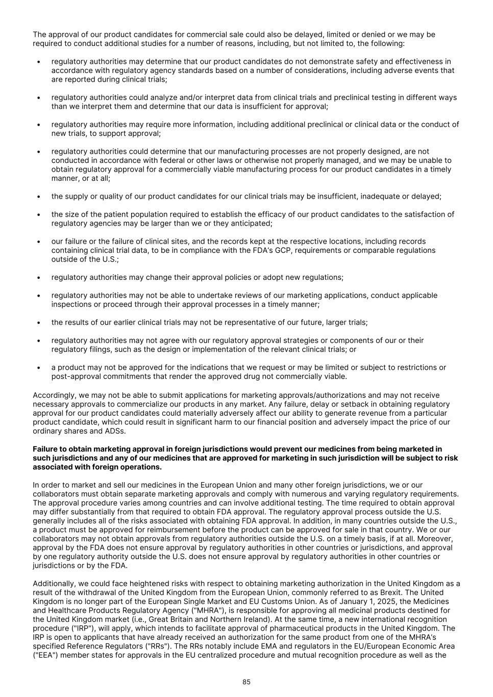 The approval of our product candidates for commercial sale could also be delayed, limited or denied or we may be required to conduct additional studies for a number of reasons, including, but not limited to, the following: • regulatory authorities may determine that our product candidates do not demonstrate safety and effectiveness in accordance with regulatory agency standards based on a number of considerations, including adverse events that are reported during clinical trials; • regulatory authorities could analyze and/or interpret data from clinical trials and preclinical testing in different ways than we interpret them and determine that our data is insufficient for approval; • regulatory authorities may require more information, including additional preclinical or clinical data or the conduct of new trials, to support approval; • regulatory authorities could determine that our manufacturing processes are not properly designed, are not conducted in accordance with federal or other laws or otherwise not properly managed, and we may be unable to obtain regulatory approval for a commercially viable manufacturing process for our product candidates in a timely manner, or at all; • the supply or quality of our product candidates for our clinical trials may be insufficient, inadequate or delayed; • the size of the patient population required to establish the efficacy of our product candidates to the satisfaction of regulatory agencies may be larger than we or they anticipated; • our failure or the failure of clinical sites, and the records kept at the respective locations, including records containing clinical trial data, to be in compliance with the FDA’s GCP, requirements or comparable regulations outside of the U.S.; • regulatory authorities may change their approval policies or adopt new regulations; • regulatory authorities may not be able to undertake reviews of our marketing applications, conduct applicable inspections or proceed through their approval processes in a timely manner; • the results of our earlier clinical trials may not be representative of our future, larger trials; • regulatory authorities may not agree with our regulatory approval strategies or components of our or their regulatory filings, such as the design or implementation of the relevant clinical trials; or • a product may not be approved for the indications that we request or may be limited or subject to restrictions or post-approval commitments that render the approved drug not commercially viable. Accordingly, we may not be able to submit applications for marketing approvals/authorizations and may not receive necessary approvals to commercialize our products in any market. Any failure, delay or setback in obtaining regulatory approval for our product candidates could materially adversely affect our ability to generate revenue from a particular product candidate, which could result in significant harm to our financial position and adversely impact the price of our ordinary shares and ADSs. Failure to obtain marketing approval in foreign jurisdictions would prevent our medicines from being marketed in such jurisdictions and any of our medicines that are approved for marketing in such jurisdiction will be subject to risk associated with foreign operations. In order to market and sell our medicines in the European Union and many other foreign jurisdictions, we or our collaborators must obtain separate marketing approvals and comply with numerous and varying regulatory requirements. The approval procedure varies among countries and can involve additional testing. The time required to obtain approval may differ substantially from that required to obtain FDA approval. The regulatory approval process outside the U.S. generally includes all of the risks associated with obtaining FDA approval. In addition, in many countries outside the U.S., a product must be approved for reimbursement before the product can be approved for sale in that country. We or our collaborators may not obtain approvals from regulatory authorities outside the U.S. on a timely basis, if at all. Moreover, approval by the FDA does not ensure approval by regulatory authorities in other countries or jurisdictions, and approval by one regulatory authority outside the U.S. does not ensure approval by regulatory authorities in other countries or jurisdictions or by the FDA. Additionally, we could face heightened risks with respect to obtaining marketing authorization in the United Kingdom as a result of the withdrawal of the United Kingdom from the European Union, commonly referred to as Brexit. The United Kingdom is no longer part of the European Single Market and EU Customs Union. As of January 1, 2025, the Medicines and Healthcare Products Regulatory Agency ("MHRA"), is responsible for approving all medicinal products destined for the United Kingdom market (i.e., Great Britain and Northern Ireland). At the same time, a new international recognition procedure ("IRP"), will apply, which intends to facilitate approval of pharmaceutical products in the United Kingdom. The IRP is open to applicants that have already received an authorization for the same product from one of the MHRA’s specified Reference Regulators ("RRs"). The RRs notably include EMA and regulators in the EU/European Economic Area ("EEA") member states for approvals in the EU centralized procedure and mutual recognition procedure as well as the 85