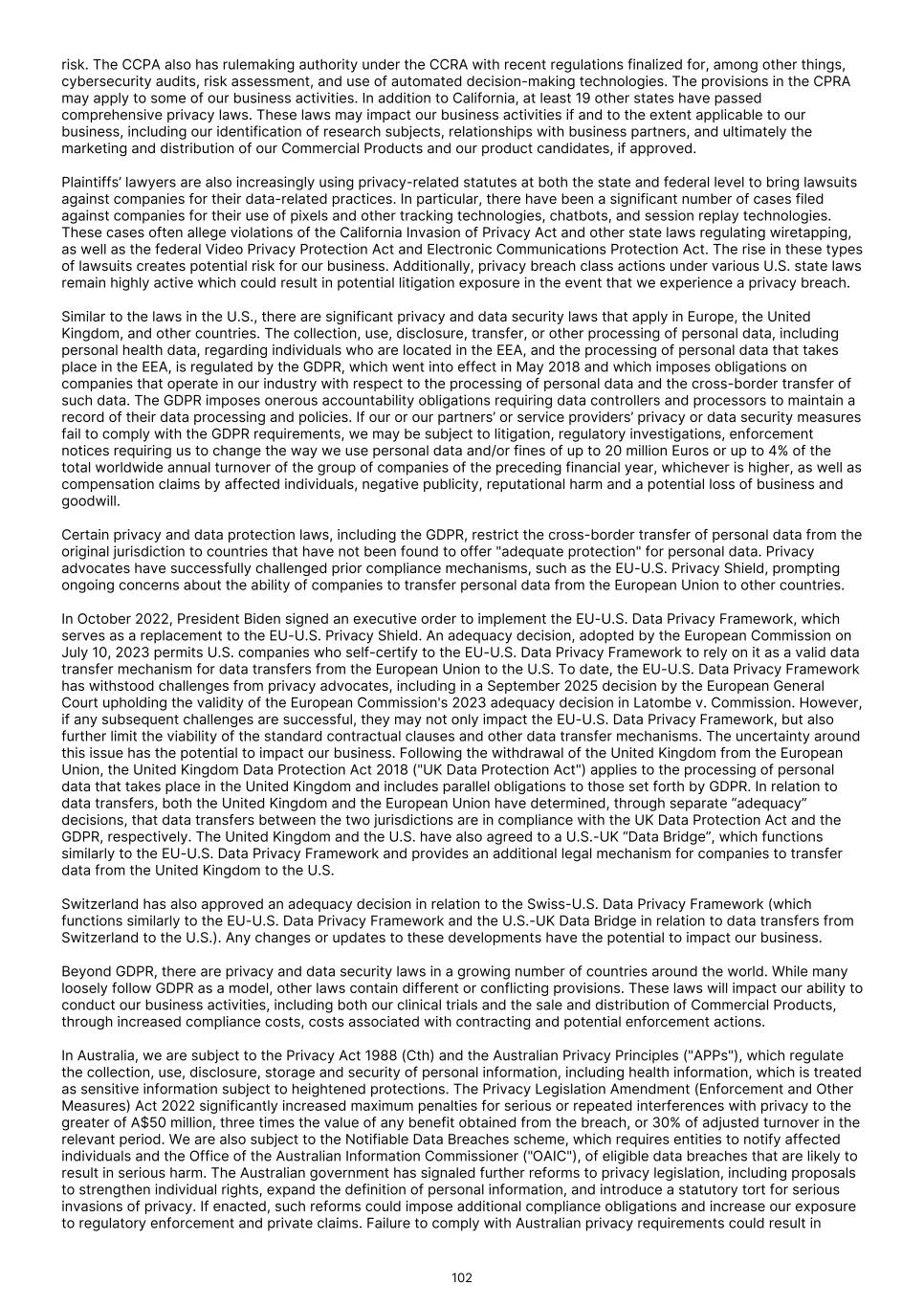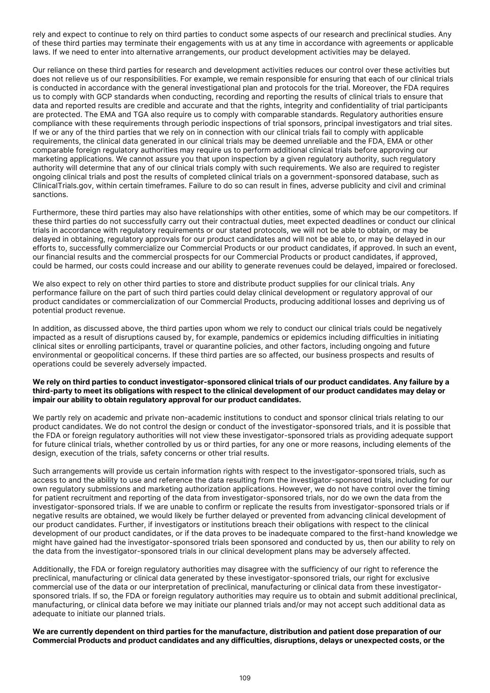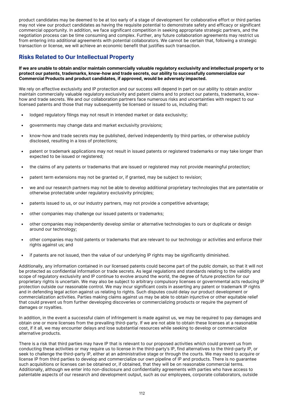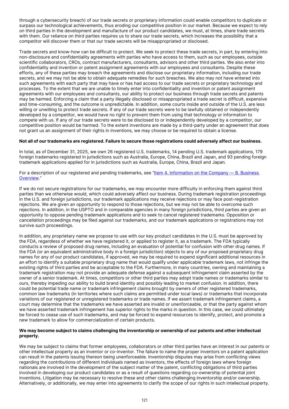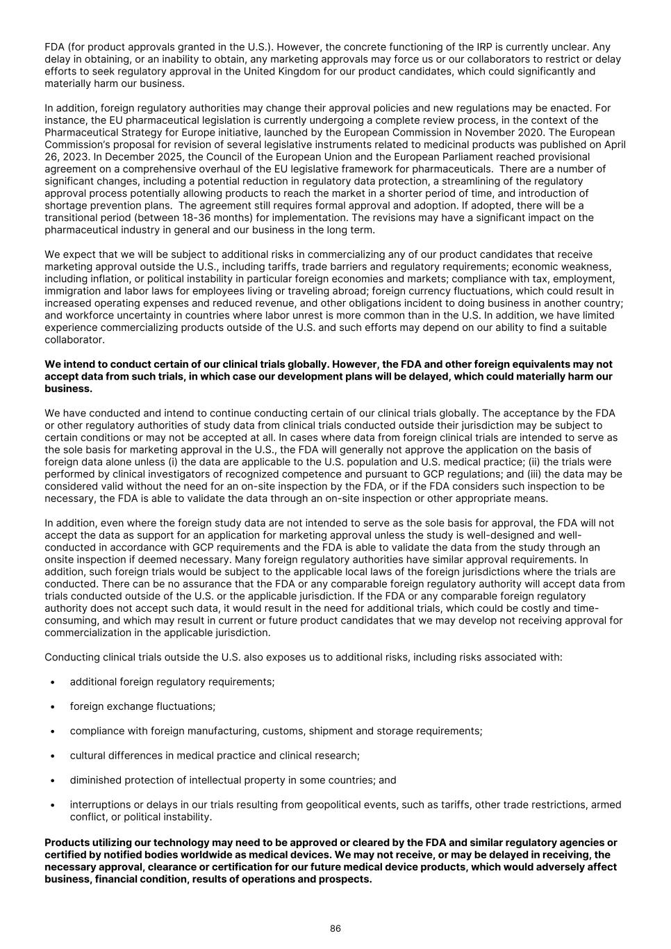 FDA (for product approvals granted in the U.S.). However, the concrete functioning of the IRP is currently unclear. Any delay in obtaining, or an inability to obtain, any marketing approvals may force us or our collaborators to restrict or delay efforts to seek regulatory approval in the United Kingdom for our product candidates, which could significantly and materially harm our business. In addition, foreign regulatory authorities may change their approval policies and new regulations may be enacted. For instance, the EU pharmaceutical legislation is currently undergoing a complete review process, in the context of the Pharmaceutical Strategy for Europe initiative, launched by the European Commission in November 2020. The European Commission’s proposal for revision of several legislative instruments related to medicinal products was published on April 26, 2023. In December 2025, the Council of the European Union and the European Parliament reached provisional agreement on a comprehensive overhaul of the EU legislative framework for pharmaceuticals. There are a number of significant changes, including a potential reduction in regulatory data protection, a streamlining of the regulatory approval process potentially allowing products to reach the market in a shorter period of time, and introduction of shortage prevention plans. The agreement still requires formal approval and adoption. If adopted, there will be a transitional period (between 18-36 months) for implementation. The revisions may have a significant impact on the pharmaceutical industry in general and our business in the long term. We expect that we will be subject to additional risks in commercializing any of our product candidates that receive marketing approval outside the U.S., including tariffs, trade barriers and regulatory requirements; economic weakness, including inflation, or political instability in particular foreign economies and markets; compliance with tax, employment, immigration and labor laws for employees living or traveling abroad; foreign currency fluctuations, which could result in increased operating expenses and reduced revenue, and other obligations incident to doing business in another country; and workforce uncertainty in countries where labor unrest is more common than in the U.S. In addition, we have limited experience commercializing products outside of the U.S. and such efforts may depend on our ability to find a suitable collaborator. We intend to conduct certain of our clinical trials globally. However, the FDA and other foreign equivalents may not accept data from such trials, in which case our development plans will be delayed, which could materially harm our business. We have conducted and intend to continue conducting certain of our clinical trials globally. The acceptance by the FDA or other regulatory authorities of study data from clinical trials conducted outside their jurisdiction may be subject to certain conditions or may not be accepted at all. In cases where data from foreign clinical trials are intended to serve as the sole basis for marketing approval in the U.S., the FDA will generally not approve the application on the basis of foreign data alone unless (i) the data are applicable to the U.S. population and U.S. medical practice; (ii) the trials were performed by clinical investigators of recognized competence and pursuant to GCP regulations; and (iii) the data may be considered valid without the need for an on-site inspection by the FDA, or if the FDA considers such inspection to be necessary, the FDA is able to validate the data through an on-site inspection or other appropriate means. In addition, even where the foreign study data are not intended to serve as the sole basis for approval, the FDA will not accept the data as support for an application for marketing approval unless the study is well-designed and well- conducted in accordance with GCP requirements and the FDA is able to validate the data from the study through an onsite inspection if deemed necessary. Many foreign regulatory authorities have similar approval requirements. In addition, such foreign trials would be subject to the applicable local laws of the foreign jurisdictions where the trials are conducted. There can be no assurance that the FDA or any comparable foreign regulatory authority will accept data from trials conducted outside of the U.S. or the applicable jurisdiction. If the FDA or any comparable foreign regulatory authority does not accept such data, it would result in the need for additional trials, which could be costly and time- consuming, and which may result in current or future product candidates that we may develop not receiving approval for commercialization in the applicable jurisdiction. Conducting clinical trials outside the U.S. also exposes us to additional risks, including risks associated with: • additional foreign regulatory requirements; • foreign exchange fluctuations; • compliance with foreign manufacturing, customs, shipment and storage requirements; • cultural differences in medical practice and clinical research; • diminished protection of intellectual property in some countries; and • interruptions or delays in our trials resulting from geopolitical events, such as tariffs, other trade restrictions, armed conflict, or political instability. Products utilizing our technology may need to be approved or cleared by the FDA and similar regulatory agencies or certified by notified bodies worldwide as medical devices. We may not receive, or may be delayed in receiving, the necessary approval, clearance or certification for our future medical device products, which would adversely affect business, financial condition, results of operations and prospects. 86