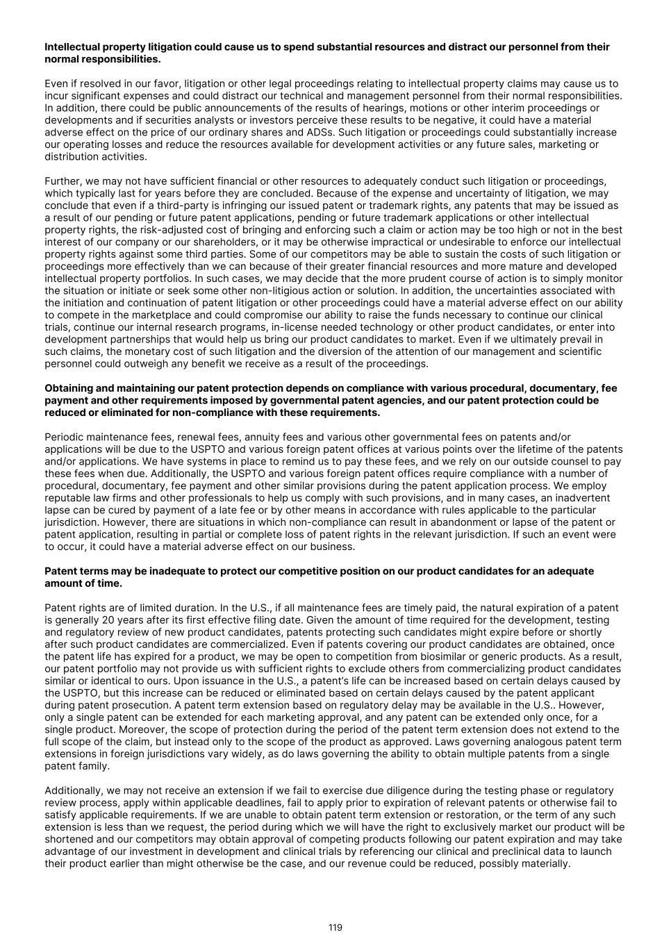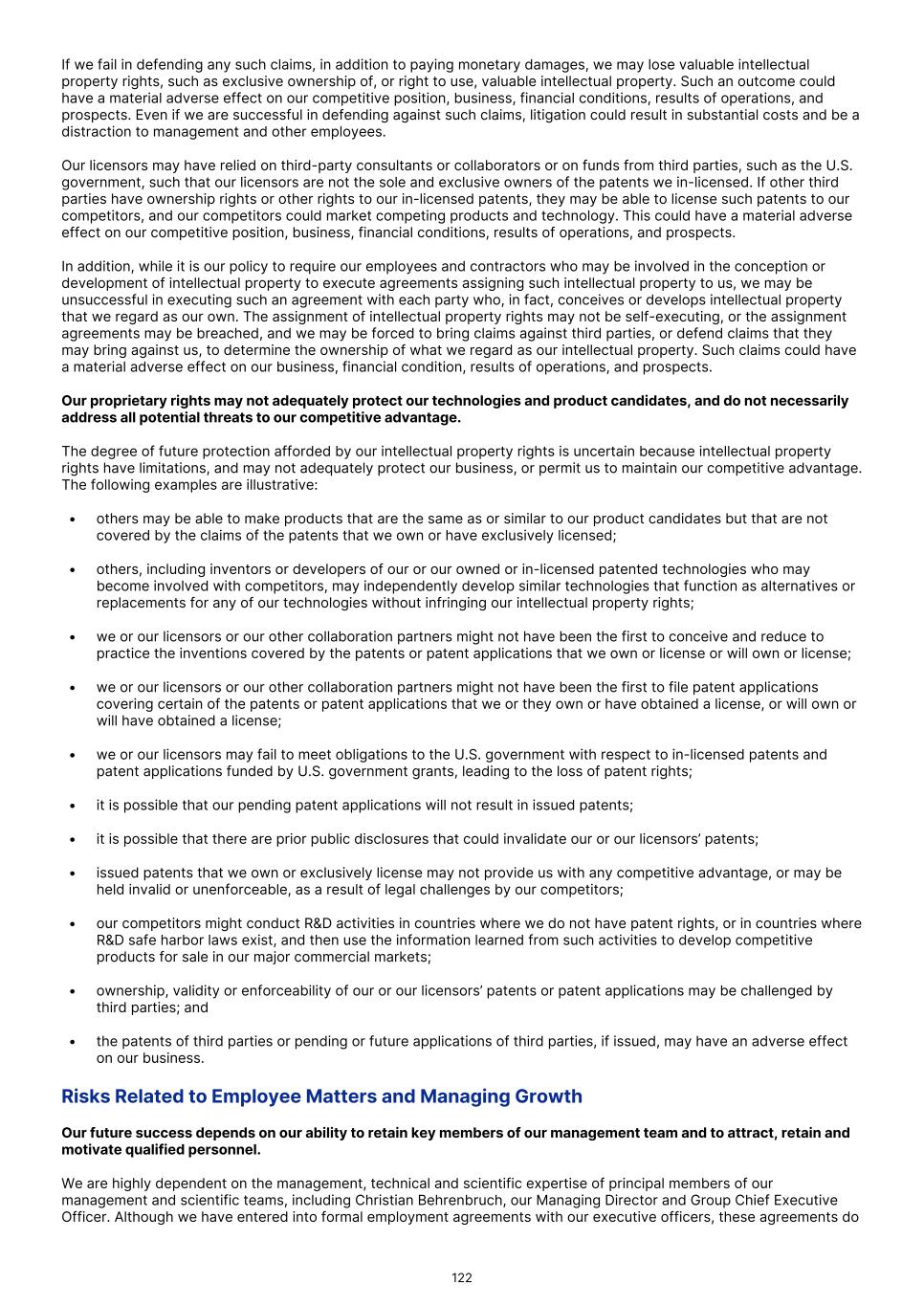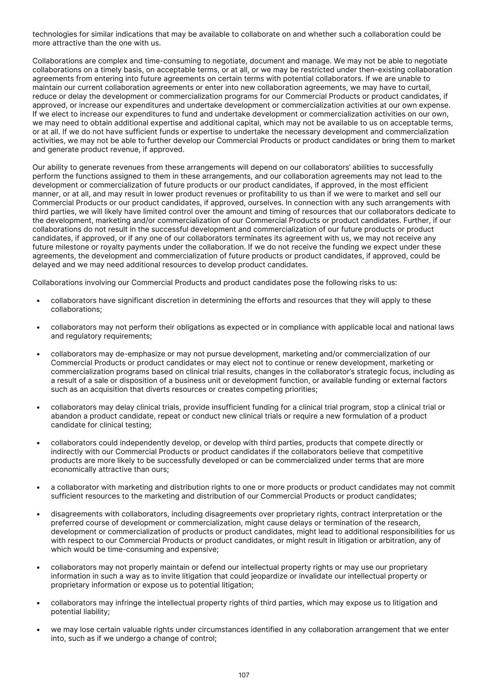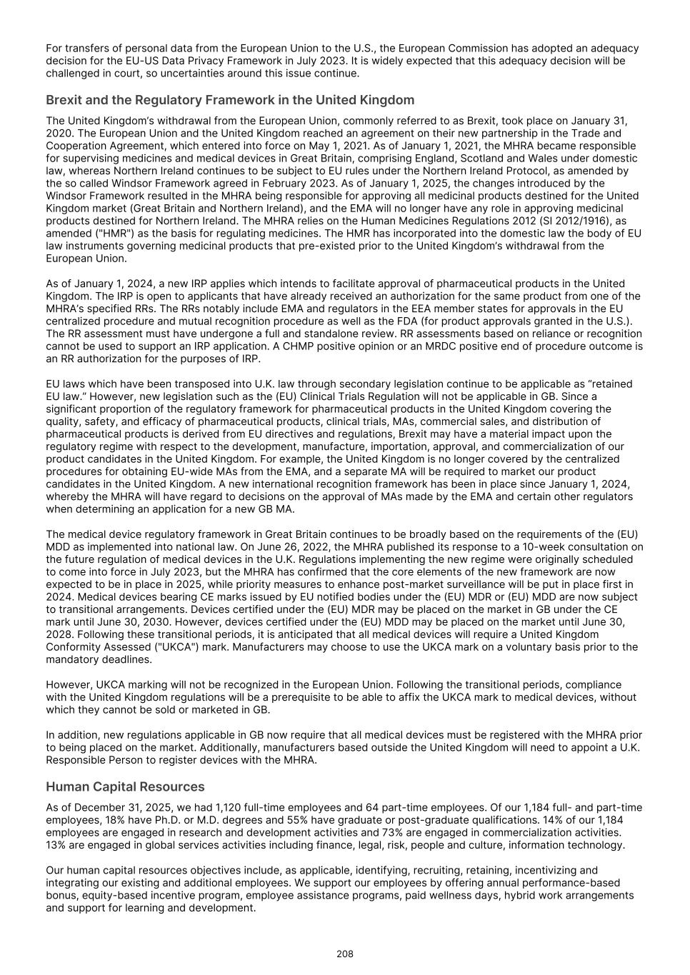 FDA (for product approvals granted in the U.S.). However, the concrete functioning of the IRP is currently unclear. Any delay in obtaining, or an inability to obtain, any marketing approvals may force us or our collaborators to restrict or delay efforts to seek regulatory approval in the United Kingdom for our product candidates, which could significantly and materially harm our business. In addition, foreign regulatory authorities may change their approval policies and new regulations may be enacted. For instance, the EU pharmaceutical legislation is currently undergoing a complete review process, in the context of the Pharmaceutical Strategy for Europe initiative, launched by the European Commission in November 2020. The European Commission’s proposal for revision of several legislative instruments related to medicinal products was published on April 26, 2023. In December 2025, the Council of the European Union and the European Parliament reached provisional agreement on a comprehensive overhaul of the EU legislative framework for pharmaceuticals. There are a number of significant changes, including a potential reduction in regulatory data protection, a streamlining of the regulatory approval process potentially allowing products to reach the market in a shorter period of time, and introduction of shortage prevention plans. The agreement still requires formal approval and adoption. If adopted, there will be a transitional period (between 18-36 months) for implementation. The revisions may have a significant impact on the pharmaceutical industry in general and our business in the long term. We expect that we will be subject to additional risks in commercializing any of our product candidates that receive marketing approval outside the U.S., including tariffs, trade barriers and regulatory requirements; economic weakness, including inflation, or political instability in particular foreign economies and markets; compliance with tax, employment, immigration and labor laws for employees living or traveling abroad; foreign currency fluctuations, which could result in increased operating expenses and reduced revenue, and other obligations incident to doing business in another country; and workforce uncertainty in countries where labor unrest is more common than in the U.S. In addition, we have limited experience commercializing products outside of the U.S. and such efforts may depend on our ability to find a suitable collaborator. We intend to conduct certain of our clinical trials globally. However, the FDA and other foreign equivalents may not accept data from such trials, in which case our development plans will be delayed, which could materially harm our business. We have conducted and intend to continue conducting certain of our clinical trials globally. The acceptance by the FDA or other regulatory authorities of study data from clinical trials conducted outside their jurisdiction may be subject to certain conditions or may not be accepted at all. In cases where data from foreign clinical trials are intended to serve as the sole basis for marketing approval in the U.S., the FDA will generally not approve the application on the basis of foreign data alone unless (i) the data are applicable to the U.S. population and U.S. medical practice; (ii) the trials were performed by clinical investigators of recognized competence and pursuant to GCP regulations; and (iii) the data may be considered valid without the need for an on-site inspection by the FDA, or if the FDA considers such inspection to be necessary, the FDA is able to validate the data through an on-site inspection or other appropriate means. In addition, even where the foreign study data are not intended to serve as the sole basis for approval, the FDA will not accept the data as support for an application for marketing approval unless the study is well-designed and well- conducted in accordance with GCP requirements and the FDA is able to validate the data from the study through an onsite inspection if deemed necessary. Many foreign regulatory authorities have similar approval requirements. In addition, such foreign trials would be subject to the applicable local laws of the foreign jurisdictions where the trials are conducted. There can be no assurance that the FDA or any comparable foreign regulatory authority will accept data from trials conducted outside of the U.S. or the applicable jurisdiction. If the FDA or any comparable foreign regulatory authority does not accept such data, it would result in the need for additional trials, which could be costly and time- consuming, and which may result in current or future product candidates that we may develop not receiving approval for commercialization in the applicable jurisdiction. Conducting clinical trials outside the U.S. also exposes us to additional risks, including risks associated with: • additional foreign regulatory requirements; • foreign exchange fluctuations; • compliance with foreign manufacturing, customs, shipment and storage requirements; • cultural differences in medical practice and clinical research; • diminished protection of intellectual property in some countries; and • interruptions or delays in our trials resulting from geopolitical events, such as tariffs, other trade restrictions, armed conflict, or political instability. Products utilizing our technology may need to be approved or cleared by the FDA and similar regulatory agencies or certified by notified bodies worldwide as medical devices. We may not receive, or may be delayed in receiving, the necessary approval, clearance or certification for our future medical device products, which would adversely affect business, financial condition, results of operations and prospects. 86