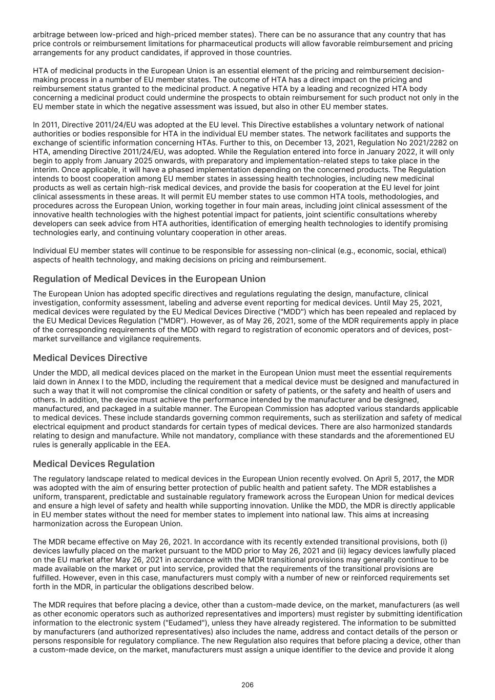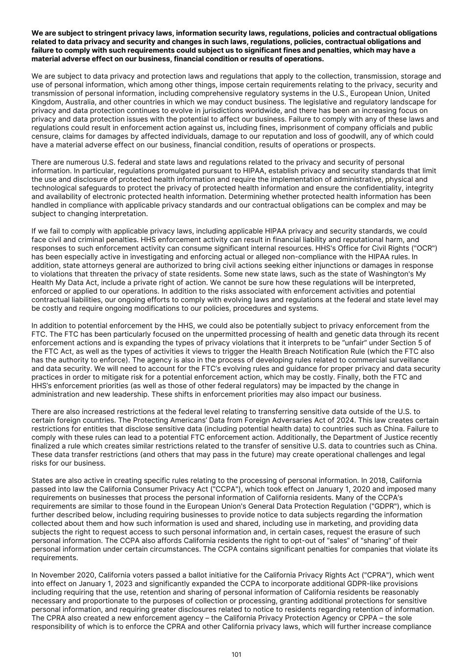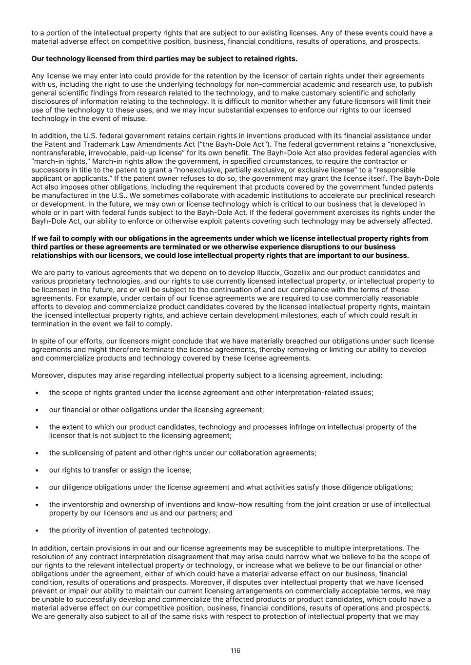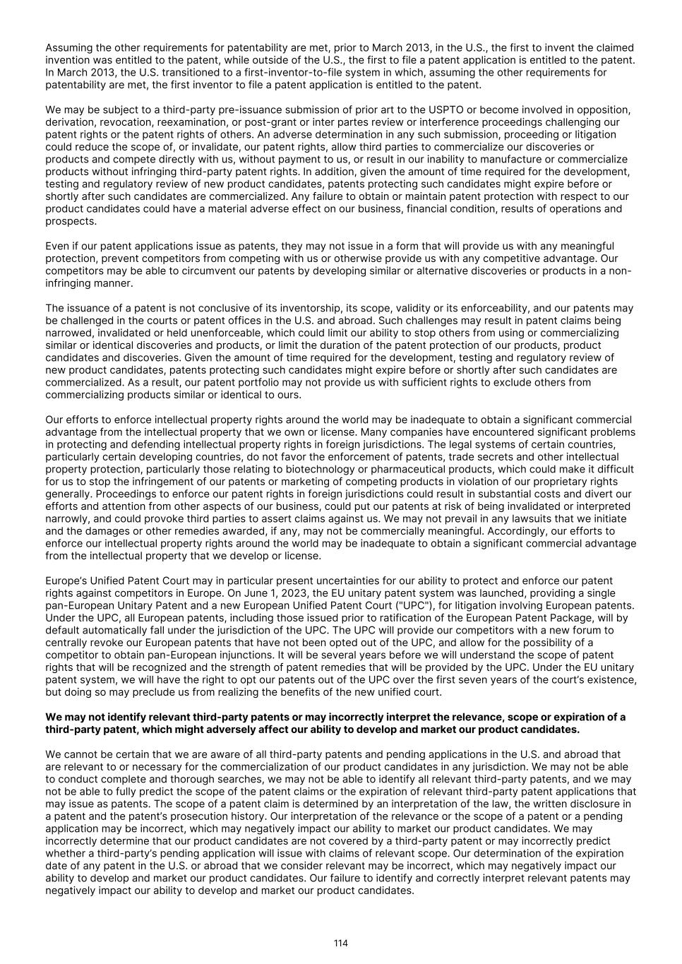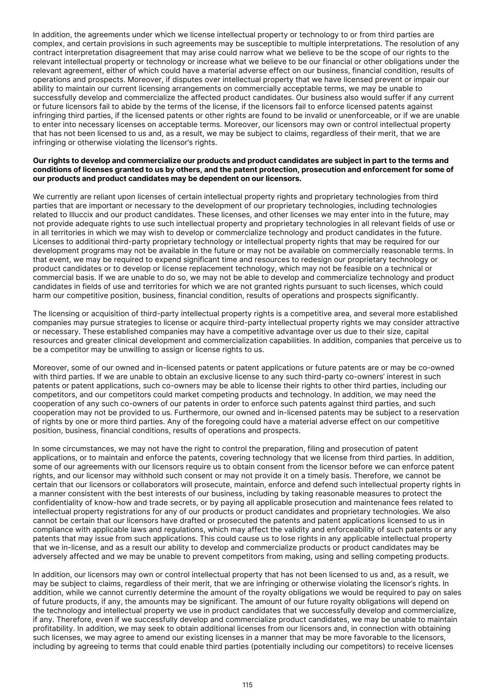 FDA (for product approvals granted in the U.S.). However, the concrete functioning of the IRP is currently unclear. Any delay in obtaining, or an inability to obtain, any marketing approvals may force us or our collaborators to restrict or delay efforts to seek regulatory approval in the United Kingdom for our product candidates, which could significantly and materially harm our business. In addition, foreign regulatory authorities may change their approval policies and new regulations may be enacted. For instance, the EU pharmaceutical legislation is currently undergoing a complete review process, in the context of the Pharmaceutical Strategy for Europe initiative, launched by the European Commission in November 2020. The European Commission’s proposal for revision of several legislative instruments related to medicinal products was published on April 26, 2023. In December 2025, the Council of the European Union and the European Parliament reached provisional agreement on a comprehensive overhaul of the EU legislative framework for pharmaceuticals. There are a number of significant changes, including a potential reduction in regulatory data protection, a streamlining of the regulatory approval process potentially allowing products to reach the market in a shorter period of time, and introduction of shortage prevention plans. The agreement still requires formal approval and adoption. If adopted, there will be a transitional period (between 18-36 months) for implementation. The revisions may have a significant impact on the pharmaceutical industry in general and our business in the long term. We expect that we will be subject to additional risks in commercializing any of our product candidates that receive marketing approval outside the U.S., including tariffs, trade barriers and regulatory requirements; economic weakness, including inflation, or political instability in particular foreign economies and markets; compliance with tax, employment, immigration and labor laws for employees living or traveling abroad; foreign currency fluctuations, which could result in increased operating expenses and reduced revenue, and other obligations incident to doing business in another country; and workforce uncertainty in countries where labor unrest is more common than in the U.S. In addition, we have limited experience commercializing products outside of the U.S. and such efforts may depend on our ability to find a suitable collaborator. We intend to conduct certain of our clinical trials globally. However, the FDA and other foreign equivalents may not accept data from such trials, in which case our development plans will be delayed, which could materially harm our business. We have conducted and intend to continue conducting certain of our clinical trials globally. The acceptance by the FDA or other regulatory authorities of study data from clinical trials conducted outside their jurisdiction may be subject to certain conditions or may not be accepted at all. In cases where data from foreign clinical trials are intended to serve as the sole basis for marketing approval in the U.S., the FDA will generally not approve the application on the basis of foreign data alone unless (i) the data are applicable to the U.S. population and U.S. medical practice; (ii) the trials were performed by clinical investigators of recognized competence and pursuant to GCP regulations; and (iii) the data may be considered valid without the need for an on-site inspection by the FDA, or if the FDA considers such inspection to be necessary, the FDA is able to validate the data through an on-site inspection or other appropriate means. In addition, even where the foreign study data are not intended to serve as the sole basis for approval, the FDA will not accept the data as support for an application for marketing approval unless the study is well-designed and well- conducted in accordance with GCP requirements and the FDA is able to validate the data from the study through an onsite inspection if deemed necessary. Many foreign regulatory authorities have similar approval requirements. In addition, such foreign trials would be subject to the applicable local laws of the foreign jurisdictions where the trials are conducted. There can be no assurance that the FDA or any comparable foreign regulatory authority will accept data from trials conducted outside of the U.S. or the applicable jurisdiction. If the FDA or any comparable foreign regulatory authority does not accept such data, it would result in the need for additional trials, which could be costly and time- consuming, and which may result in current or future product candidates that we may develop not receiving approval for commercialization in the applicable jurisdiction. Conducting clinical trials outside the U.S. also exposes us to additional risks, including risks associated with: • additional foreign regulatory requirements; • foreign exchange fluctuations; • compliance with foreign manufacturing, customs, shipment and storage requirements; • cultural differences in medical practice and clinical research; • diminished protection of intellectual property in some countries; and • interruptions or delays in our trials resulting from geopolitical events, such as tariffs, other trade restrictions, armed conflict, or political instability. Products utilizing our technology may need to be approved or cleared by the FDA and similar regulatory agencies or certified by notified bodies worldwide as medical devices. We may not receive, or may be delayed in receiving, the necessary approval, clearance or certification for our future medical device products, which would adversely affect business, financial condition, results of operations and prospects. 86