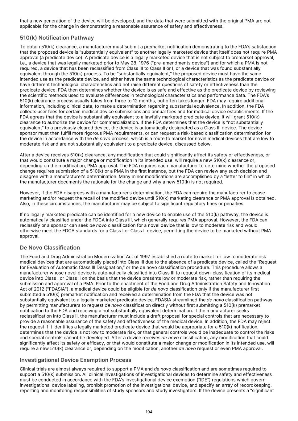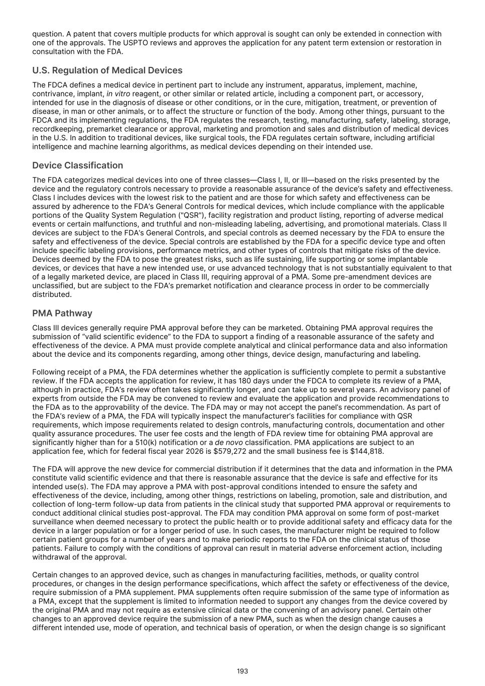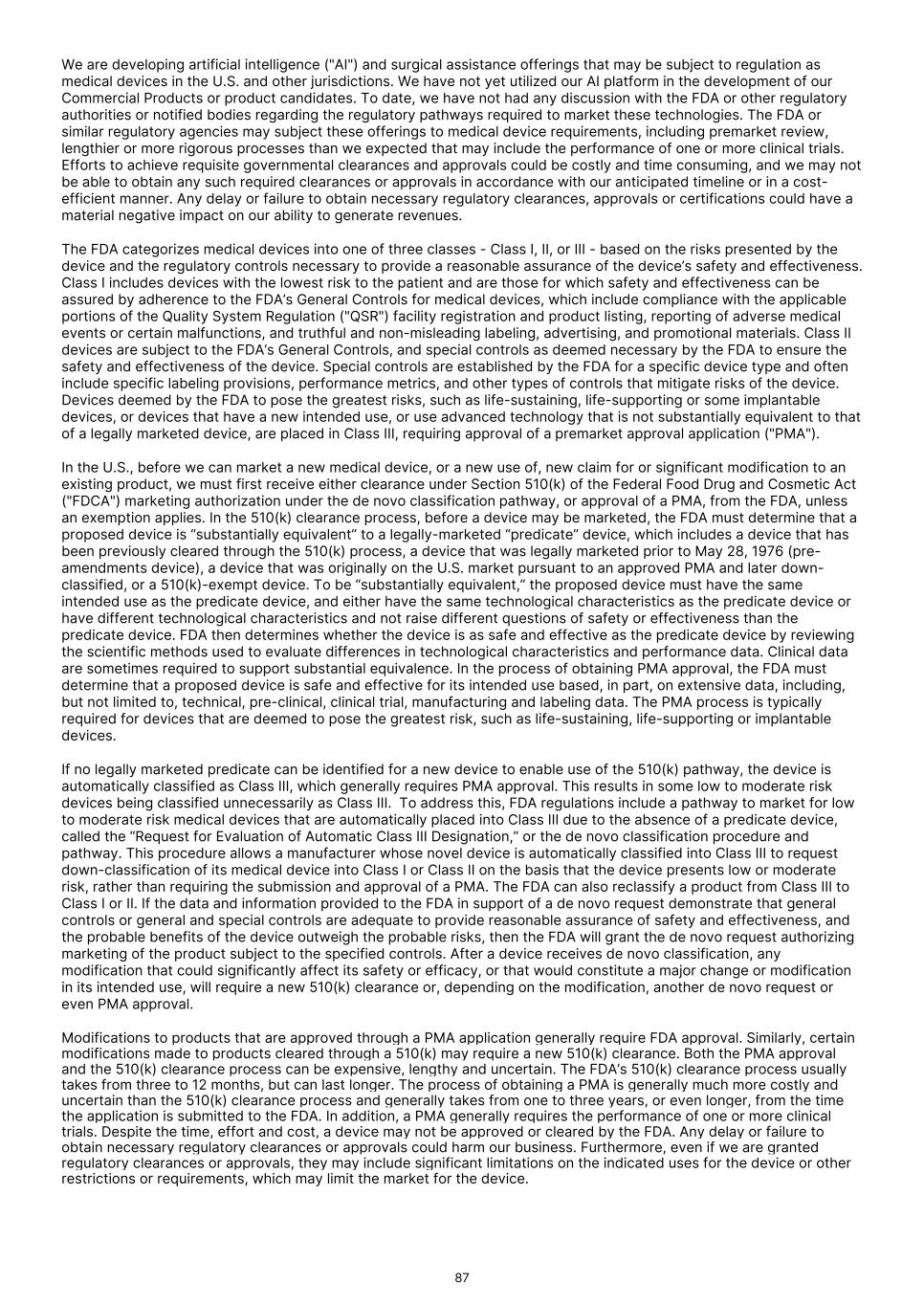 We are developing artificial intelligence ("AI") and surgical assistance offerings that may be subject to regulation as medical devices in the U.S. and other jurisdictions. We have not yet utilized our AI platform in the development of our Commercial Products or product candidates. To date, we have not had any discussion with the FDA or other regulatory authorities or notified bodies regarding the regulatory pathways required to market these technologies. The FDA or similar regulatory agencies may subject these offerings to medical device requirements, including premarket review, lengthier or more rigorous processes than we expected that may include the performance of one or more clinical trials. Efforts to achieve requisite governmental clearances and approvals could be costly and time consuming, and we may not be able to obtain any such required clearances or approvals in accordance with our anticipated timeline or in a cost- efficient manner. Any delay or failure to obtain necessary regulatory clearances, approvals or certifications could have a material negative impact on our ability to generate revenues. The FDA categorizes medical devices into one of three classes - Class I, II, or III - based on the risks presented by the device and the regulatory controls necessary to provide a reasonable assurance of the device’s safety and effectiveness. Class I includes devices with the lowest risk to the patient and are those for which safety and effectiveness can be assured by adherence to the FDA’s General Controls for medical devices, which include compliance with the applicable portions of the Quality System Regulation ("QSR") facility registration and product listing, reporting of adverse medical events or certain malfunctions, and truthful and non-misleading labeling, advertising, and promotional materials. Class II devices are subject to the FDA’s General Controls, and special controls as deemed necessary by the FDA to ensure the safety and effectiveness of the device. Special controls are established by the FDA for a specific device type and often include specific labeling provisions, performance metrics, and other types of controls that mitigate risks of the device. Devices deemed by the FDA to pose the greatest risks, such as life-sustaining, life-supporting or some implantable devices, or devices that have a new intended use, or use advanced technology that is not substantially equivalent to that of a legally marketed device, are placed in Class III, requiring approval of a premarket approval application ("PMA"). In the U.S., before we can market a new medical device, or a new use of, new claim for or significant modification to an existing product, we must first receive either clearance under Section 510(k) of the Federal Food Drug and Cosmetic Act ("FDCA") marketing authorization under the de novo classification pathway, or approval of a PMA, from the FDA, unless an exemption applies. In the 510(k) clearance process, before a device may be marketed, the FDA must determine that a proposed device is “substantially equivalent” to a legally-marketed “predicate” device, which includes a device that has been previously cleared through the 510(k) process, a device that was legally marketed prior to May 28, 1976 (pre- amendments device), a device that was originally on the U.S. market pursuant to an approved PMA and later down- classified, or a 510(k)-exempt device. To be “substantially equivalent,” the proposed device must have the same intended use as the predicate device, and either have the same technological characteristics as the predicate device or have different technological characteristics and not raise different questions of safety or effectiveness than the predicate device. FDA then determines whether the device is as safe and effective as the predicate device by reviewing the scientific methods used to evaluate differences in technological characteristics and performance data. Clinical data are sometimes required to support substantial equivalence. In the process of obtaining PMA approval, the FDA must determine that a proposed device is safe and effective for its intended use based, in part, on extensive data, including, but not limited to, technical, pre-clinical, clinical trial, manufacturing and labeling data. The PMA process is typically required for devices that are deemed to pose the greatest risk, such as life-sustaining, life-supporting or implantable devices. If no legally marketed predicate can be identified for a new device to enable use of the 510(k) pathway, the device is automatically classified as Class III, which generally requires PMA approval. This results in some low to moderate risk devices being classified unnecessarily as Class III. To address this, FDA regulations include a pathway to market for low to moderate risk medical devices that are automatically placed into Class III due to the absence of a predicate device, called the “Request for Evaluation of Automatic Class III Designation,” or the de novo classification procedure and pathway. This procedure allows a manufacturer whose novel device is automatically classified into Class III to request down-classification of its medical device into Class I or Class II on the basis that the device presents low or moderate risk, rather than requiring the submission and approval of a PMA. The FDA can also reclassify a product from Class III to Class I or II. If the data and information provided to the FDA in support of a de novo request demonstrate that general controls or general and special controls are adequate to provide reasonable assurance of safety and effectiveness, and the probable benefits of the device outweigh the probable risks, then the FDA will grant the de novo request authorizing marketing of the product subject to the specified controls. After a device receives de novo classification, any modification that could significantly affect its safety or efficacy, or that would