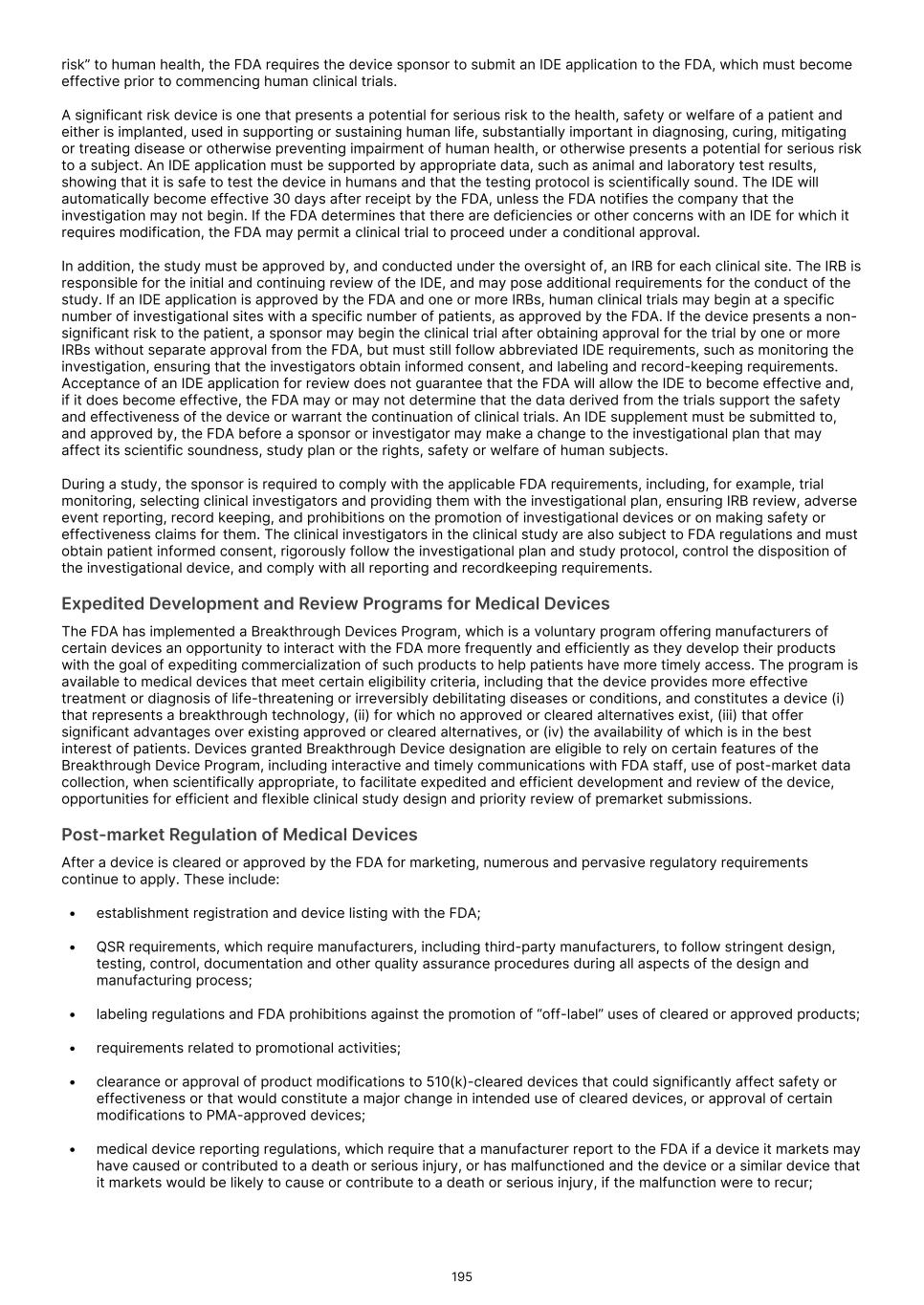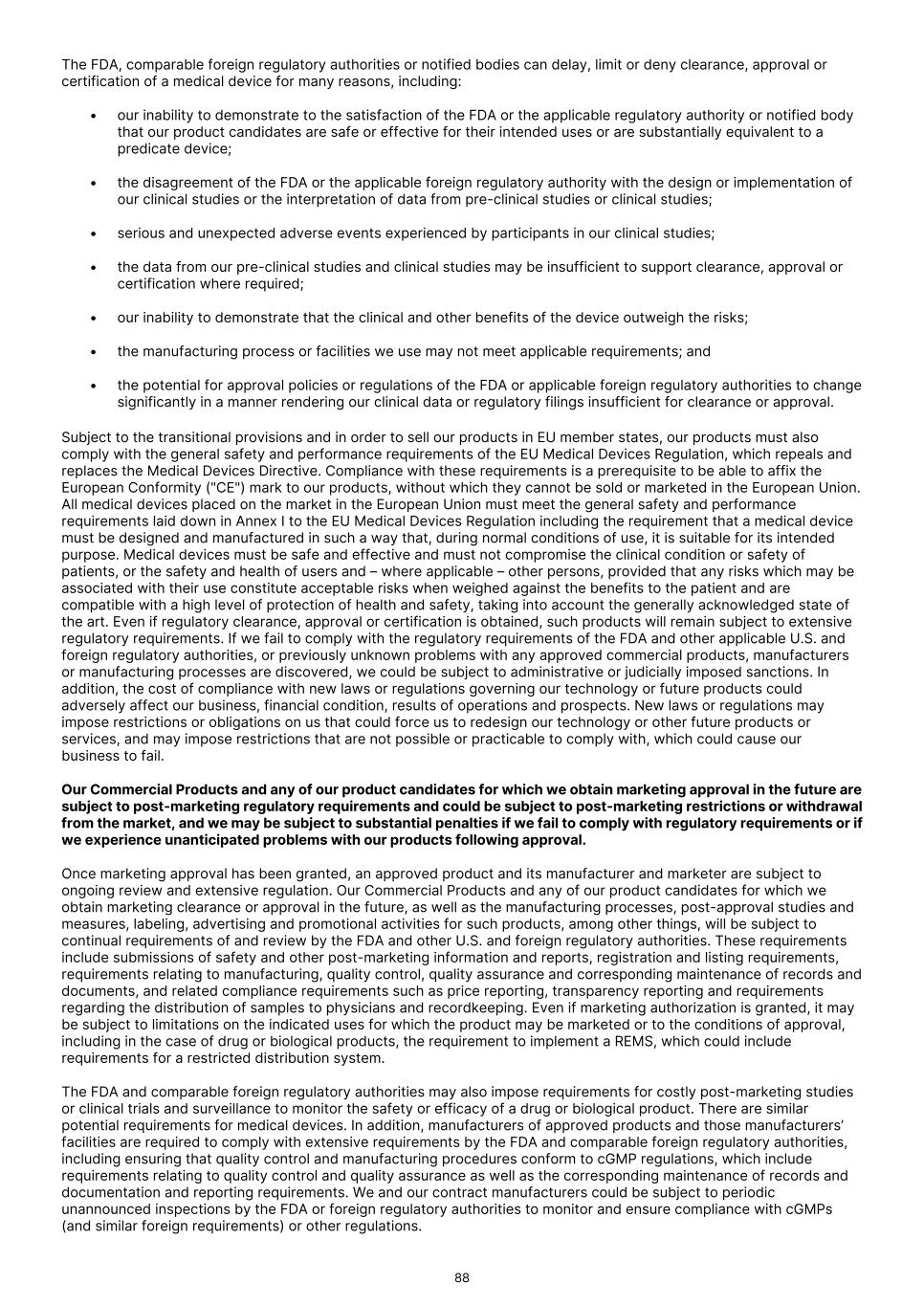 The FDA, comparable foreign regulatory authorities or notified bodies can delay, limit or deny clearance, approval or certification of a medical device for many reasons, including: • our inability to demonstrate to the satisfaction of the FDA or the applicable regulatory authority or notified body that our product candidates are safe or effective for their intended uses or are substantially equivalent to a predicate device; • the disagreement of the FDA or the applicable foreign regulatory authority with the design or implementation of our clinical studies or the interpretation of data from pre-clinical studies or clinical studies; • serious and unexpected adverse events experienced by participants in our clinical studies; • the data from our pre-clinical studies and clinical studies may be insufficient to support clearance, approval or certification where required; • our inability to demonstrate that the clinical and other benefits of the device outweigh the risks; • the manufacturing process or facilities we use may not meet applicable requirements; and • the potential for approval policies or regulations of the FDA or applicable foreign regulatory authorities to change significantly in a manner rendering our clinical data or regulatory filings insufficient for clearance or approval. Subject to the transitional provisions and in order to sell our products in EU member states, our products must also comply with the general safety and performance requirements of the EU Medical Devices Regulation, which repeals and replaces the Medical Devices Directive. Compliance with these requirements is a prerequisite to be able to affix the European Conformity ("CE") mark to our products, without which they cannot be sold or marketed in the European Union. All medical devices placed on the market in the European Union must meet the general safety and performance requirements laid down in Annex I to the EU Medical Devices Regulation including the requirement that a medical device must be designed and manufactured in such a way that, during normal conditions of use, it is suitable for its intended purpose. Medical devices must be safe and effective and must not compromise the clinical condition or safety of patients, or the safety and health of users and – where applicable – other persons, provided that any risks which may be associated with their use constitute acceptable risks when weighed against the benefits to the patient and are compatible with a high level of protection of health and safety, taking into account the generally acknowledged state of the art. Even if regulatory clearance, approval or certification is obtained, such products will remain subject to extensive regulatory requirements. If we fail to comply with the regulatory requirements of the FDA and other applicable U.S. and foreign regulatory authorities, or previously unknown problems with any approved commercial products, manufacturers or manufacturing processes are discovered, we could be subject to administrative or judicially imposed sanctions. In addition, the cost of compliance with new laws or regulations governing our technology or future products could adversely affect our business, financial condition, results of operations and prospects. New laws or regulations may impose restrictions or obligations on us that could force us to redesign our technology or other future products or services, and may impose restrictions that are not possible or practicable to comply with, which could cause our business to fail. Our Commercial Products and any of our product candidates for which we obtain marketing approval in the future are subject to post-marketing regulatory requirements and could be subject to post-marketing restrictions or withdrawal from the market, and we may be subject to substantial penalties if we fail to comply with regulatory requirements or if we experience unanticipated problems with our products following approval. Once marketing approval has been granted, an approved product and its manufacturer and marketer are subject to ongoing review and extensive regulation. Our Commercial Products and any of our product candidates for which we obtain marketing clearance or approval in the future, as well as the manufacturing processes, post-approval studies and measures, labeling, advertising and promotional activities for such products, among other things, will be subject to continual requirements of and review by the FDA and other U.S. and foreign regulatory authorities. These requirements include submissions of safety and other post-marketing information and reports, registration and listing requirements, requirements relating to manufacturing, quality control, quality assurance and corresponding maintenance of records and documents, and related compliance requirements such as price reporting, transparency reporting and requirements regarding the distribution of samples to physicians and recordkeeping. Even if marketing authorization is granted, it may be subject to limitations on the indicated uses for which the product may be marketed or to the conditions of approval, including in the case of drug or biological products, the requirement to implement a REMS, which could include requirements for a restricted distribution system. The FDA and comparable foreign regulatory authorities may also impose requirements for costly post-marketing studies or clinical trials and surveillance to monitor the safety or efficacy of a drug or biological product. There are similar potential requirements for medical devices. In addition, manufacturers of approved products and those manufacturers’ facilities are required to comply with extensive requirements by the FDA and comparable foreign regulatory authorities, including ensuring that quality control and manufacturing procedures conform to cGMP regulations, which include requirements relating to quality control and quality assurance as well as the corresponding ma