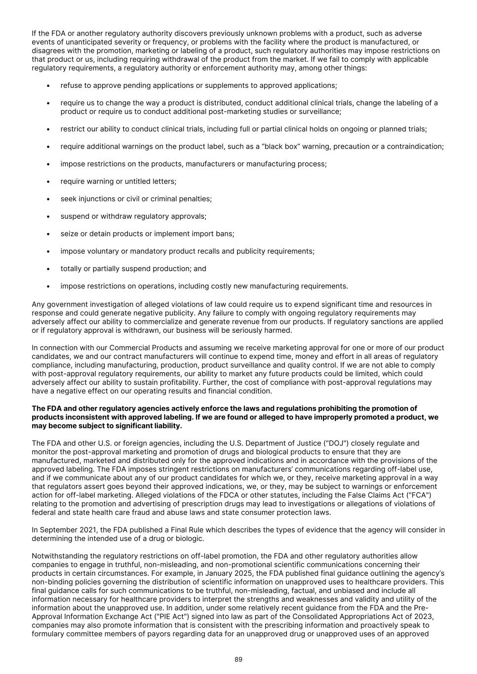 If the FDA or another regulatory authority discovers previously unknown problems with a product, such as adverse events of unanticipated severity or frequency, or problems with the facility where the product is manufactured, or disagrees with the promotion, marketing or labeling of a product, such regulatory authorities may impose restrictions on that product or us, including requiring withdrawal of the product from the market. If we fail to comply with applicable regulatory requirements, a regulatory authority or enforcement authority may, among other things: • refuse to approve pending applications or supplements to approved applications; • require us to change the way a product is distributed, conduct additional clinical trials, change the labeling of a product or require us to conduct additional post-marketing studies or surveillance; • restrict our ability to conduct clinical trials, including full or partial clinical holds on ongoing or planned trials; • require additional warnings on the product label, such as a “black box” warning, precaution or a contraindication; • impose restrictions on the products, manufacturers or manufacturing process; • require warning or untitled letters; • seek injunctions or civil or criminal penalties; • suspend or withdraw regulatory approvals; • seize or detain products or implement import bans; • impose voluntary or mandatory product recalls and publicity requirements; • totally or partially suspend production; and • impose restrictions on operations, including costly new manufacturing requirements. Any government investigation of alleged violations of law could require us to expend significant time and resources in response and could generate negative publicity. Any failure to comply with ongoing regulatory requirements may adversely affect our ability to commercialize and generate revenue from our products. If regulatory sanctions are applied or if regulatory approval is withdrawn, our business will be seriously harmed. In connection with our Commercial Products and assuming we receive marketing approval for one or more of our product candidates, we and our contract manufacturers will continue to expend time, money and effort in all areas of regulatory compliance, including manufacturing, production, product surveillance and quality control. If we are not able to comply with post-approval regulatory requirements, our ability to market any future products could be limited, which could adversely affect our ability to sustain profitability. Further, the cost of compliance with post-approval regulations may have a negative effect on our operating results and financial condition. The FDA and other regulatory agencies actively enforce the laws and regulations prohibiting the promotion of products inconsistent with approved labeling. If we are found or alleged to have improperly promoted a product, we may become subject to significant liability. The FDA and other U.S. or foreign agencies, including the U.S. Department of Justice ("DOJ") closely regulate and monitor the post-approval marketing and promotion of drugs and biological products to ensure that they are manufactured, marketed and distributed only for the approved indications and in accordance with the provisions of the approved labeling. The FDA imposes stringent restrictions on manufacturers’ communications regarding off-label use, and if we communicate about any of our product candidates for which we, or they, receive marketing approval in a way that regulators assert goes beyond their approved indications, we, or they, may be subject to warnings or enforcement action for off-label marketing. Alleged violations of the FDCA or other statutes, including the False Claims Act ("FCA") relating to the promotion and advertising of prescription drugs may lead to investigations or allegations of violations of federal and state health care fraud and abuse laws and state consumer protection laws. In September 2021, the FDA published a Final Rule which describes the types of evidence that the agency will consider in determining the intended use of a drug or biologic. Notwithstanding the regulatory restrictions on off-label promotion, the FDA and other regulatory authorities allow companies to engage in truthful, non-misleading, and non-promotional scientific communications concerning their products in certain circumstances. For example, in January 2025, the FDA published final guidance outlining the agency’s non-binding policies governing the distribution of scientific information on unapproved uses to healthcare providers. This final guidance calls for such communications to be truthful, non-misleading, factual, and unbiased and include all information necessary for healthcare providers to interpret the strengths and weaknesses and validity and utility of the information about the unapproved use. In addition, under some relatively recent guidance from the FDA and the Pre- Approval Information Exchange Act ("PIE Act") signed into law as part of the Consolidated Appropriations Act of 2023, companies may also promote information that is consistent with the prescribing information and proactively speak to formulary committee members of payors regarding data for an unapproved drug or unapproved uses of an approved 89