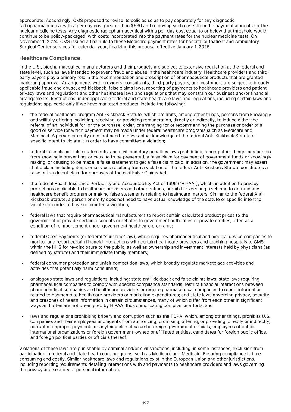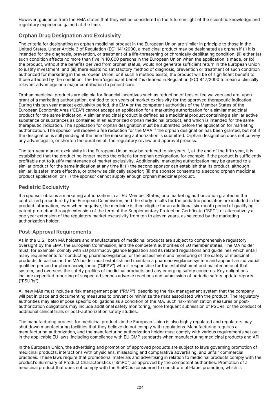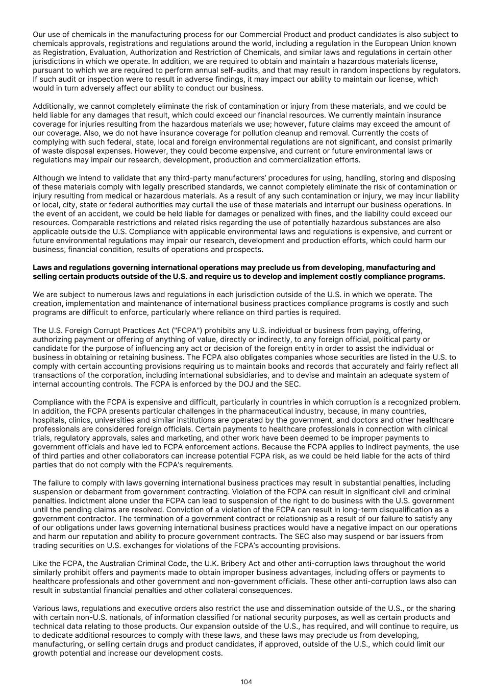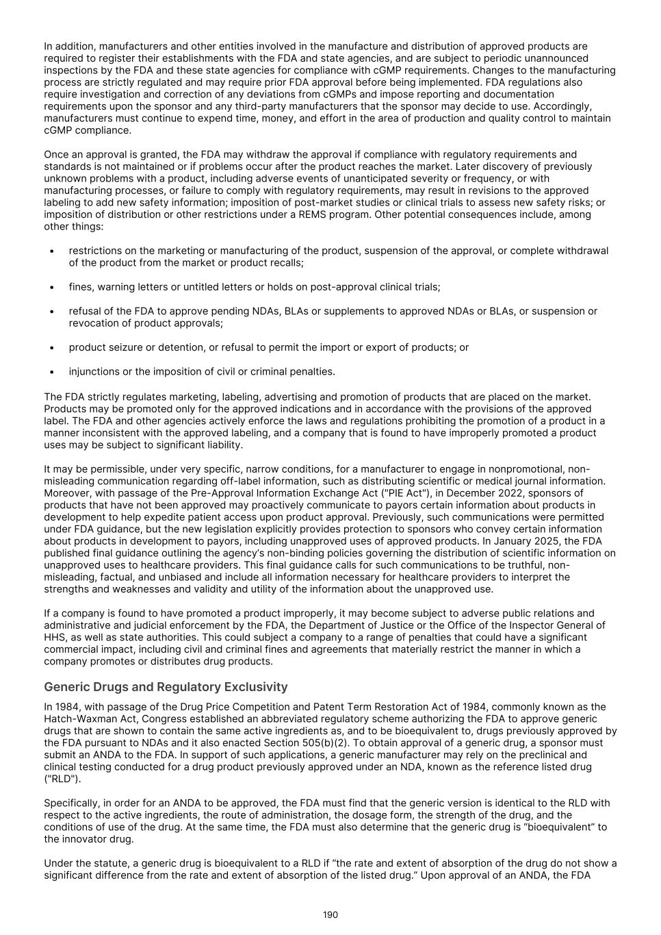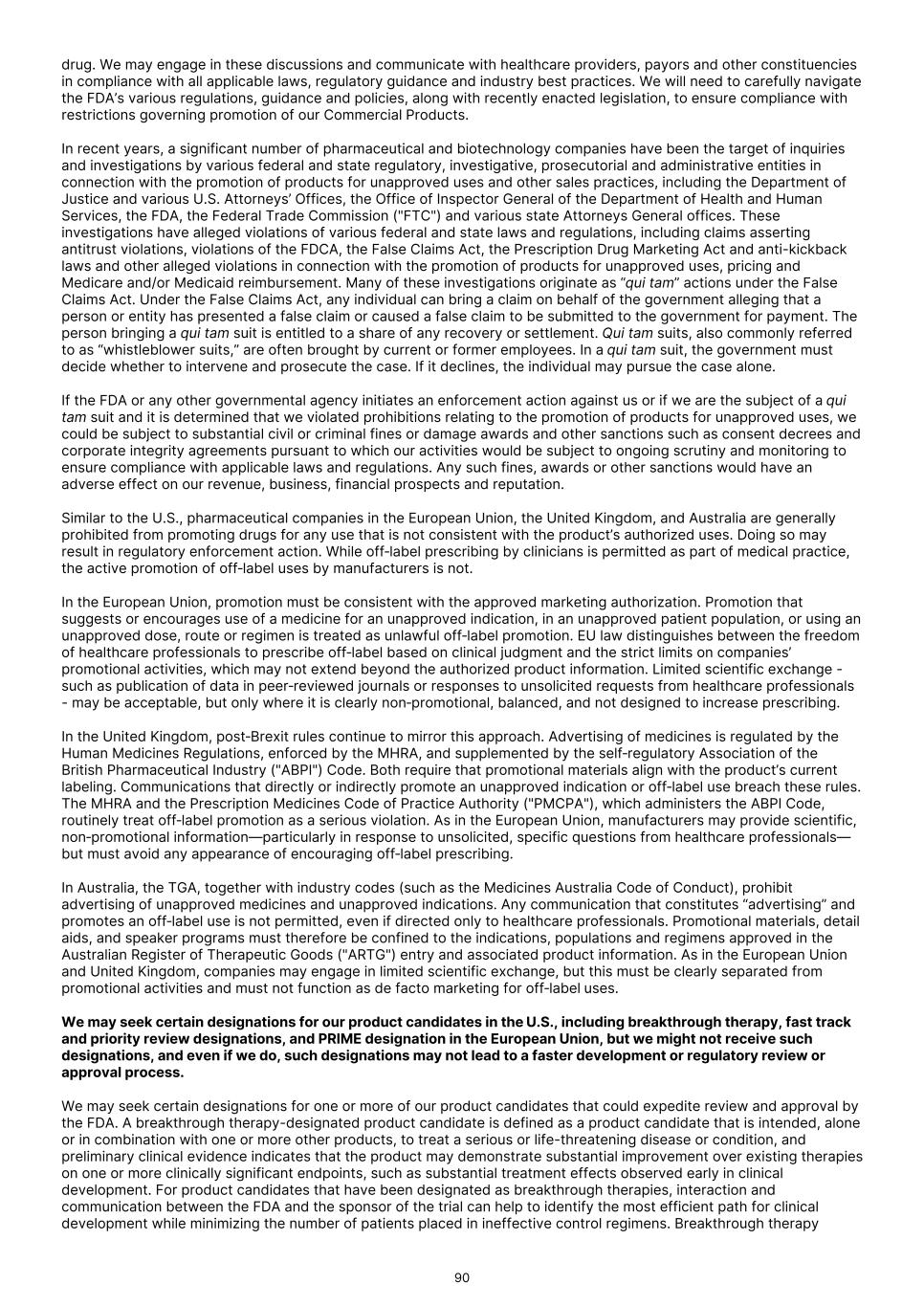 drug. We may engage in these discussions and communicate with healthcare providers, payors and other constituencies in compliance with all applicable laws, regulatory guidance and industry best practices. We will need to carefully navigate the FDA’s various regulations, guidance and policies, along with recently enacted legislation, to ensure compliance with restrictions governing promotion of our Commercial Products. In recent years, a significant number of pharmaceutical and biotechnology companies have been the target of inquiries and investigations by various federal and state regulatory, investigative, prosecutorial and administrative entities in connection with the promotion of products for unapproved uses and other sales practices, including the Department of Justice and various U.S. Attorneys’ Offices, the Office of Inspector General of the Department of Health and Human Services, the FDA, the Federal Trade Commission ("FTC") and various state Attorneys General offices. These investigations have alleged violations of various federal and state laws and regulations, including claims asserting antitrust violations, violations of the FDCA, the False Claims Act, the Prescription Drug Marketing Act and anti-kickback laws and other alleged violations in connection with the promotion of products for unapproved uses, pricing and Medicare and/or Medicaid reimbursement. Many of these investigations originate as “qui tam” actions under the False Claims Act. Under the False Claims Act, any individual can bring a claim on behalf of the government alleging that a person or entity has presented a false claim or caused a false claim to be submitted to the government for payment. The person bringing a qui tam suit is entitled to a share of any recovery or settlement. Qui tam suits, also commonly referred to as “whistleblower suits,” are often brought by current or former employees. In a qui tam suit, the government must decide whether to intervene and prosecute the case. If it declines, the individual may pursue the case alone. If the FDA or any other governmental agency initiates an enforcement action against us or if we are the subject of a qui tam suit and it is determined that we violated prohibitions relating to the promotion of products for unapproved uses, we could be subject to substantial civil or criminal fines or damage awards and other sanctions such as consent decrees and corporate integrity agreements pursuant to which our activities would be subject to ongoing scrutiny and monitoring to ensure compliance with applicable laws and regulations. Any such fines, awards or other sanctions would have an adverse effect on our revenue, business, financial prospects and reputation. Similar to the U.S., pharmaceutical companies in the European Union, the United Kingdom, and Australia are generally prohibited from promoting drugs for any use that is not consistent with the product’s authorized uses. Doing so may result in regulatory enforcement action. While off‑label prescribing by clinicians is permitted as part of medical practice, the active promotion of off‑label uses by manufacturers is not. In the European Union, promotion must be consistent with the approved marketing authorization. Promotion that suggests or encourages use of a medicine for an unapproved indication, in an unapproved patient population, or using an unapproved dose, route or regimen is treated as unlawful off‑label promotion. EU law distinguishes between the freedom of healthcare professionals to prescribe off‑label based on clinical judgment and the strict limits on companies’ promotional activities, which may not extend beyond the authorized product information. Limited scientific exchange - such as publication of data in peer‑reviewed journals or responses to unsolicited requests from healthcare professionals - may be acceptable, but only where it is clearly non‑promotional, balanced, and not designed to increase prescribing. In the United Kingdom, post‑Brexit rules continue to mirror this approach. Advertising of medicines is regulated by the Human Medicines Regulations, enforced by the MHRA, and supplemented by the self‑regulatory Association of the British Pharmaceutical Industry ("ABPI") Code. Both require that promotional materials align with the product’s current labeling. Communications that directly or indirectly promote an unapproved indication or off‑label use breach these rules. The MHRA and the Prescription Medicines Code of Practice Authority ("PMCPA"), which administers the ABPI Code, routinely treat off‑label promotion as a serious violation. As in the European Union, manufacturers may provide scientific, non‑promotional information—particularly in response to unsolicited, specific questions from healthcare professionals— but must avoid any appearance of encouraging off‑label prescribing. In Australia, the TGA, together with industry codes (such as the Medicines Australia Code of Conduct), prohibit advertising of unapproved medicines and unapproved indications. Any communication that constitutes “advertising” and promotes an off‑label use is not permitted, even if directed only to healthcare professionals. Promotional materials, detail aids, and speaker programs must therefore be confined to the indications, populations and regimens approved in the Australian Register of Therapeutic Goods ("ARTG") entry and associated product information. As in the European Union and United Kingdom, companies may engage in limited scientific exchange, but this must be clearly separated from promotional activities and must not function as de facto marketing for off‑label uses. We may seek certain designations for our product candidates in the U.S., including breakthrough therapy, fast track and priority review designations, and PRIME designation in the European Union, but we might not receive such designations, and even if we do, such designations may not lead to a fa