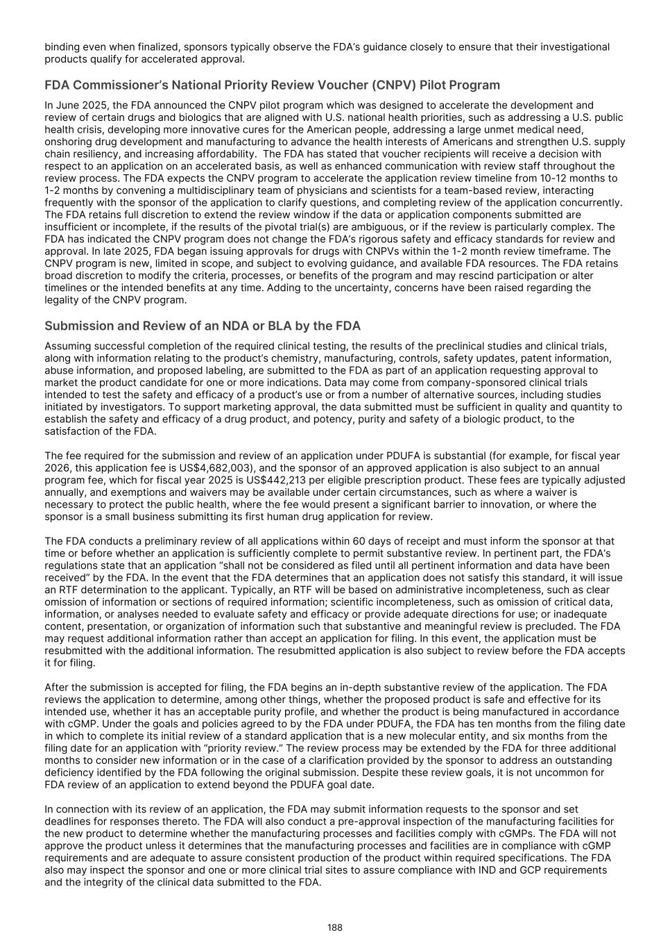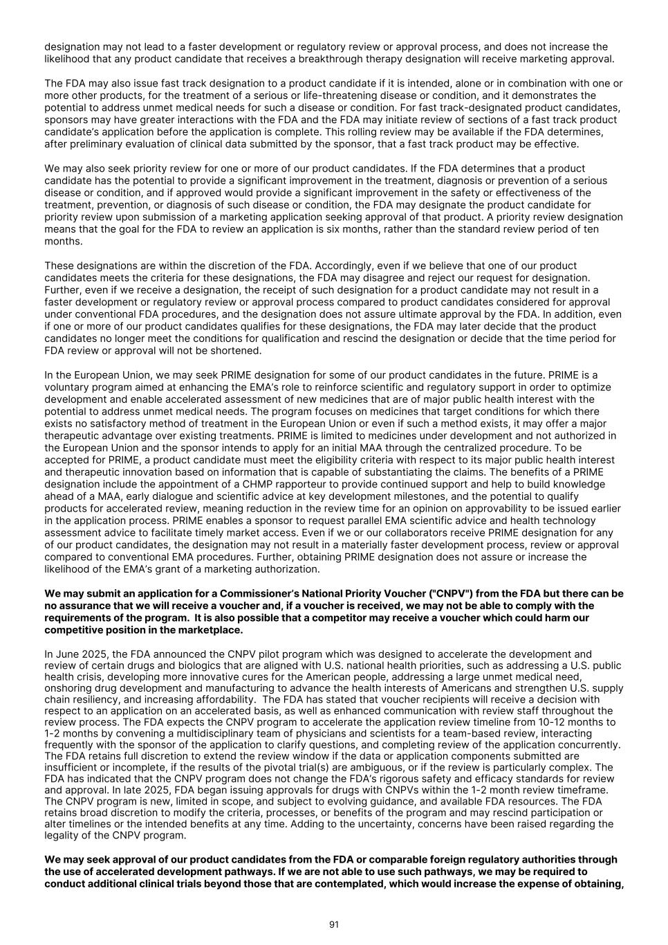 designation may not lead to a faster development or regulatory review or approval process, and does not increase the likelihood that any product candidate that receives a breakthrough therapy designation will receive marketing approval. The FDA may also issue fast track designation to a product candidate if it is intended, alone or in combination with one or more other products, for the treatment of a serious or life-threatening disease or condition, and it demonstrates the potential to address unmet medical needs for such a disease or condition. For fast track-designated product candidates, sponsors may have greater interactions with the FDA and the FDA may initiate review of sections of a fast track product candidate’s application before the application is complete. This rolling review may be available if the FDA determines, after preliminary evaluation of clinical data submitted by the sponsor, that a fast track product may be effective. We may also seek priority review for one or more of our product candidates. If the FDA determines that a product candidate has the potential to provide a significant improvement in the treatment, diagnosis or prevention of a serious disease or condition, and if approved would provide a significant improvement in the safety or effectiveness of the treatment, prevention, or diagnosis of such disease or condition, the FDA may designate the product candidate for priority review upon submission of a marketing application seeking approval of that product. A priority review designation means that the goal for the FDA to review an application is six months, rather than the standard review period of ten months. These designations are within the discretion of the FDA. Accordingly, even if we believe that one of our product candidates meets the criteria for these designations, the FDA may disagree and reject our request for designation. Further, even if we receive a designation, the receipt of such designation for a product candidate may not result in a faster development or regulatory review or approval process compared to product candidates considered for approval under conventional FDA procedures, and the designation does not assure ultimate approval by the FDA. In addition, even if one or more of our product candidates qualifies for these designations, the FDA may later decide that the product candidates no longer meet the conditions for qualification and rescind the designation or decide that the time period for FDA review or approval will not be shortened. In the European Union, we may seek PRIME designation for some of our product candidates in the future. PRIME is a voluntary program aimed at enhancing the EMA’s role to reinforce scientific and regulatory support in order to optimize development and enable accelerated assessment of new medicines that are of major public health interest with the potential to address unmet medical needs. The program focuses on medicines that target conditions for which there exists no satisfactory method of treatment in the European Union or even if such a method exists, it may offer a major therapeutic advantage over existing treatments. PRIME is limited to medicines under development and not authorized in the European Union and the sponsor intends to apply for an initial MAA through the centralized procedure. To be accepted for PRIME, a product candidate must meet the eligibility criteria with respect to its major public health interest and therapeutic innovation based on information that is capable of substantiating the claims. The benefits of a PRIME designation include the appointment of a CHMP rapporteur to provide continued support and help to build knowledge ahead of a MAA, early dialogue and scientific advice at key development milestones, and the potential to qualify products for accelerated review, meaning reduction in the review time for an opinion on approvability to be issued earlier in the application process. PRIME enables a sponsor to request parallel EMA scientific advice and health technology assessment advice to facilitate timely market access. Even if we or our collaborators receive PRIME designation for any of our product candidates, the designation may not result in a materially faster development process, review or approval compared to conventional EMA procedures. Further, obtaining PRIME designation does not assure or increase the likelihood of the EMA’s grant of a marketing authorization. We may submit an application for a Commissioner’s National Priority Voucher ("CNPV") from the FDA but there can be no assurance that we will receive a voucher and, if a voucher is received, we may not be able to comply with the requirements of the program. It is also possible that a competitor may receive a voucher which could harm our competitive position in the marketplace. In June 2025, the FDA announced the CNPV pilot program which was designed to accelerate the development and review of certain drugs and biologics that are aligned with U.S. national health priorities, such as addressing a U.S. public health crisis, developing more innovative cures for the American people, addressing a large unmet medical need, onshoring drug development and manufacturing to advance the health interests of Americans and strengthen U.S. supply chain resiliency, and increasing affordability. The FDA has stated that voucher recipients will receive a decision with respect to an application on an accelerated basis, as well as enhanced communication with review staff throughout the review process. The FDA expects the CNPV program to accelerate the application review timeline from 10-12 months to 1-2 months by convening a multidisciplinary team of physicians and scientists for a team-based review, interacting frequently with the sponsor of the application to clarify questions, and completing review of the application concurrently. The FDA retains full discretion to extend the review window if the data or application componen