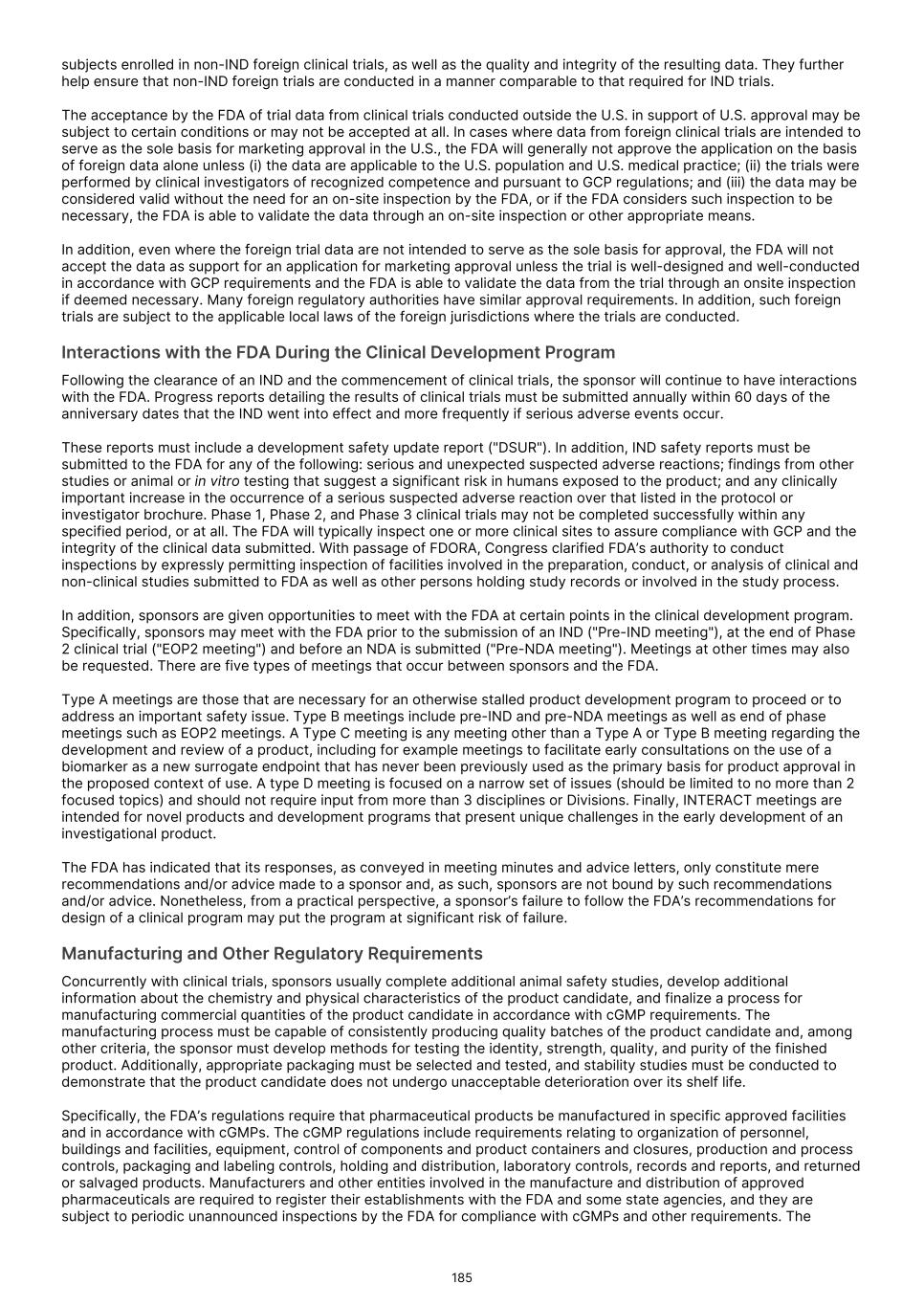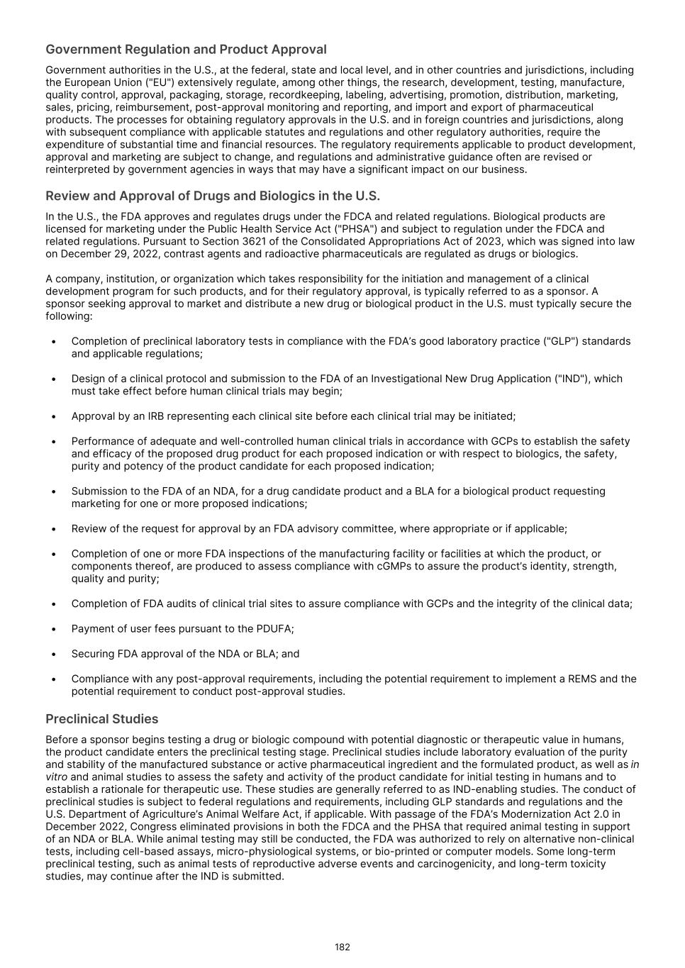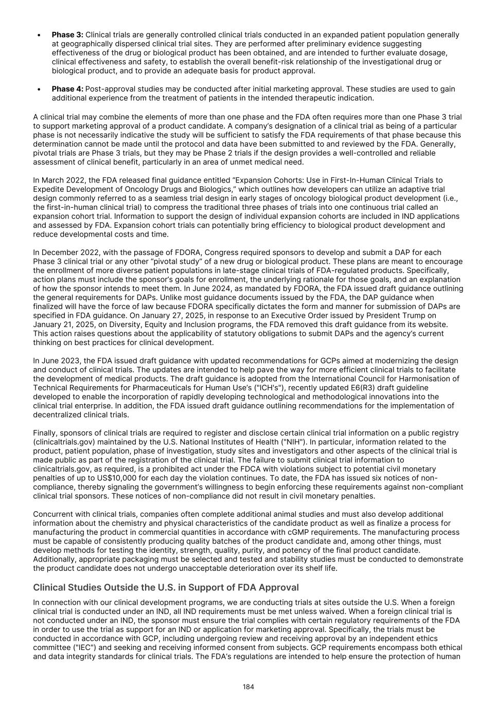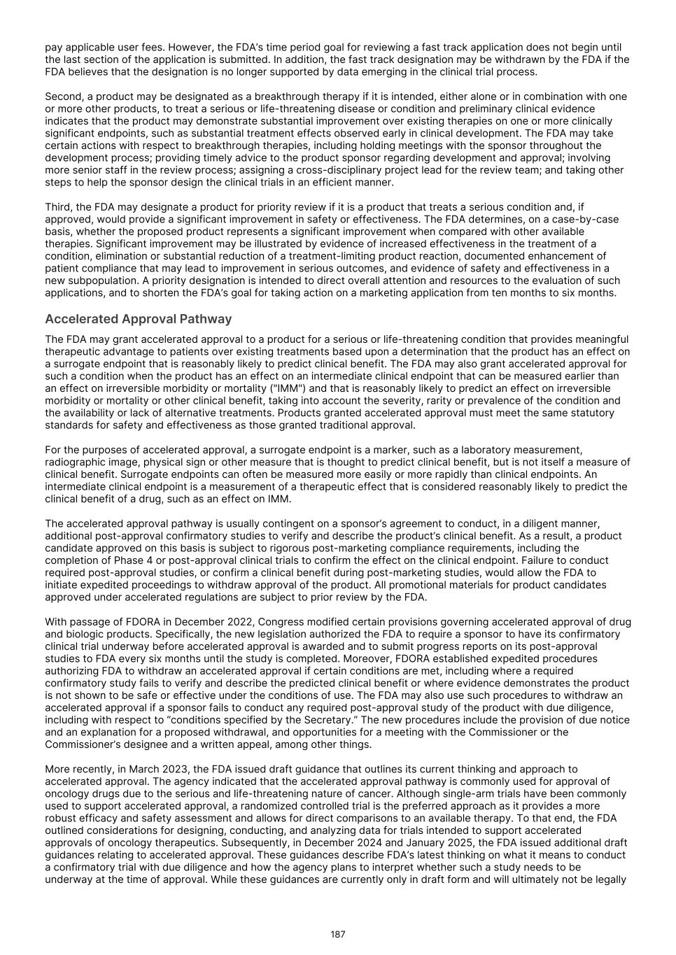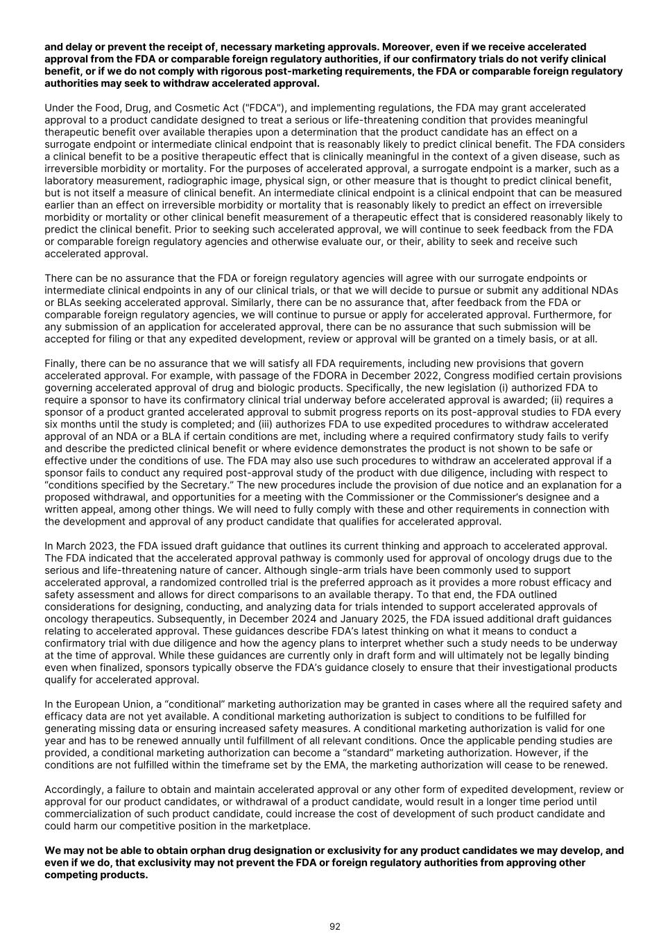 and delay or prevent the receipt of, necessary marketing approvals. Moreover, even if we receive accelerated approval from the FDA or comparable foreign regulatory authorities, if our confirmatory trials do not verify clinical benefit, or if we do not comply with rigorous post-marketing requirements, the FDA or comparable foreign regulatory authorities may seek to withdraw accelerated approval. Under the Food, Drug, and Cosmetic Act ("FDCA"), and implementing regulations, the FDA may grant accelerated approval to a product candidate designed to treat a serious or life-threatening condition that provides meaningful therapeutic benefit over available therapies upon a determination that the product candidate has an effect on a surrogate endpoint or intermediate clinical endpoint that is reasonably likely to predict clinical benefit. The FDA considers a clinical benefit to be a positive therapeutic effect that is clinically meaningful in the context of a given disease, such as irreversible morbidity or mortality. For the purposes of accelerated approval, a surrogate endpoint is a marker, such as a laboratory measurement, radiographic image, physical sign, or other measure that is thought to predict clinical benefit, but is not itself a measure of clinical benefit. An intermediate clinical endpoint is a clinical endpoint that can be measured earlier than an effect on irreversible morbidity or mortality that is reasonably likely to predict an effect on irreversible morbidity or mortality or other clinical benefit measurement of a therapeutic effect that is considered reasonably likely to predict the clinical benefit. Prior to seeking such accelerated approval, we will continue to seek feedback from the FDA or comparable foreign regulatory agencies and otherwise evaluate our, or their, ability to seek and receive such accelerated approval. There can be no assurance that the FDA or foreign regulatory agencies will agree with our surrogate endpoints or intermediate clinical endpoints in any of our clinical trials, or that we will decide to pursue or submit any additional NDAs or BLAs seeking accelerated approval. Similarly, there can be no assurance that, after feedback from the FDA or comparable foreign regulatory agencies, we will continue to pursue or apply for accelerated approval. Furthermore, for any submission of an application for accelerated approval, there can be no assurance that such submission will be accepted for filing or that any expedited development, review or approval will be granted on a timely basis, or at all. Finally, there can be no assurance that we will satisfy all FDA requirements, including new provisions that govern accelerated approval. For example, with passage of the FDORA in December 2022, Congress modified certain provisions governing accelerated approval of drug and biologic products. Specifically, the new legislation (i) authorized FDA to require a sponsor to have its confirmatory clinical trial underway before accelerated approval is awarded; (ii) requires a sponsor of a product granted accelerated approval to submit progress reports on its post-approval studies to FDA every six months until the study is completed; and (iii) authorizes FDA to use expedited procedures to withdraw accelerated approval of an NDA or a BLA if certain conditions are met, including where a required confirmatory study fails to verify and describe the predicted clinical benefit or where evidence demonstrates the product is not shown to be safe or effective under the conditions of use. The FDA may also use such procedures to withdraw an accelerated approval if a sponsor fails to conduct any required post-approval study of the product with due diligence, including with respect to “conditions specified by the Secretary.” The new procedures include the provision of due notice and an explanation for a proposed withdrawal, and opportunities for a meeting with the Commissioner or the Commissioner’s designee and a written appeal, among other things. We will need to fully comply with these and other requirements in connection with the development and approval of any product candidate that qualifies for accelerated approval. In March 2023, the FDA issued draft guidance that outlines its current thinking and approach to accelerated approval. The FDA indicated that the accelerated approval pathway is commonly used for approval of oncology drugs due to the serious and life-threatening nature of cancer. Although single-arm trials have been commonly used to support accelerated approval, a randomized controlled trial is the preferred approach as it provides a more robust efficacy and safety assessment and allows for direct comparisons to an available therapy. To that end, the FDA outlined considerations for designing, conducting, and analyzing data for trials intended to support accelerated approvals of oncology therapeutics. Subsequently, in December 2024 and January 2025, the FDA issued additional draft guidances relating to accelerated approval. These guidances describe FDA’s latest thinking on what it means to conduct a confirmatory trial with due diligence and how the agency plans to interpret whether such a study needs to be underway at the time of approval. While these guidances are currently only in draft form and will ultimately not be legally binding even when finalized, sponsors typically observe the FDA’s guidance closely to ensure that their investigational products qualify for accelerated approval. In the European Union, a “conditional” marketing authorization may be granted in cases where all the required safety and efficacy data are not yet available. A conditional marketing authorization is subject to conditions to be fulfilled for generating missing data or ensuring increased safety measures. A conditional marketing authorization is valid for one year and has to be renewed annually until fulfillment of all relevant conditions. Once the applicable pending studies are pro