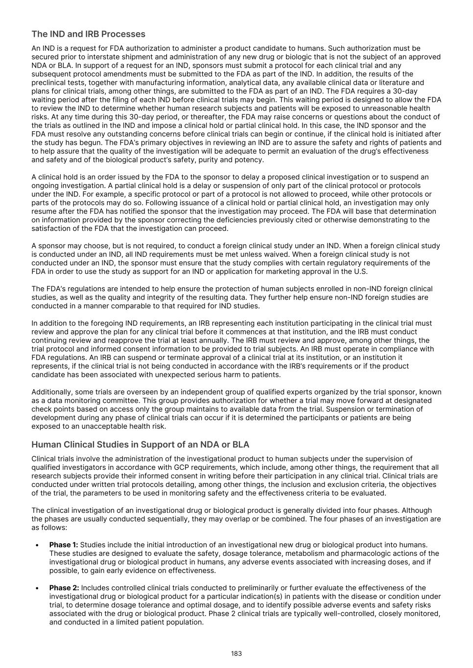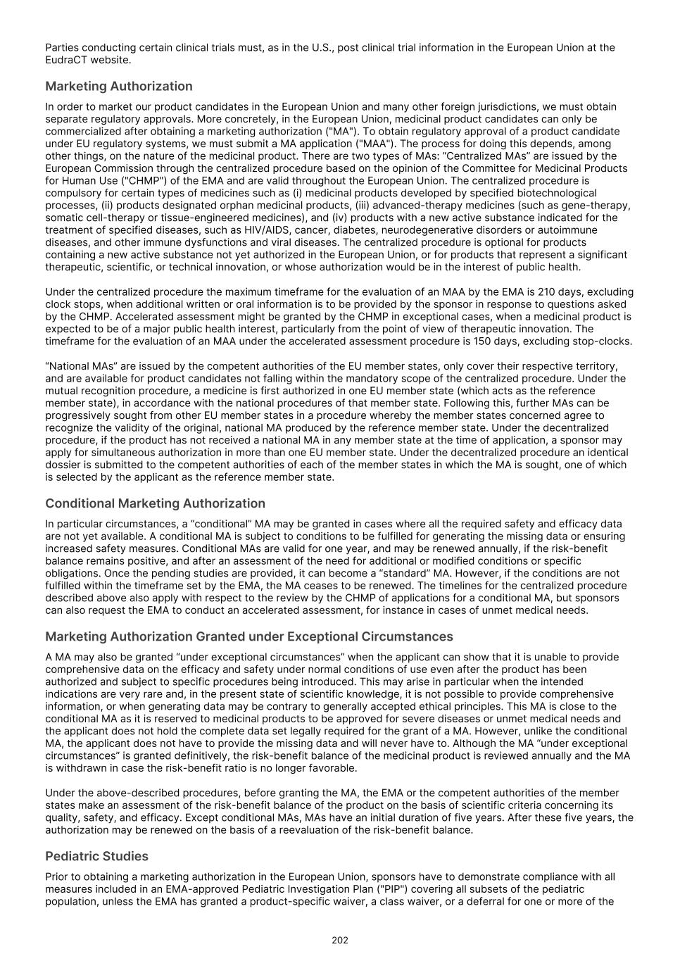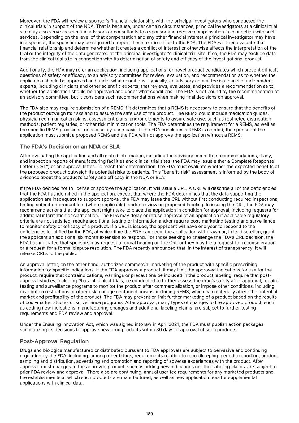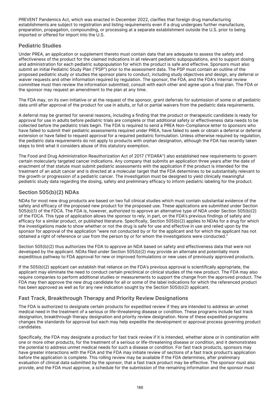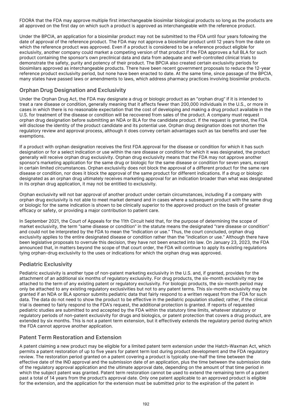 and delay or prevent the receipt of, necessary marketing approvals. Moreover, even if we receive accelerated approval from the FDA or comparable foreign regulatory authorities, if our confirmatory trials do not verify clinical benefit, or if we do not comply with rigorous post-marketing requirements, the FDA or comparable foreign regulatory authorities may seek to withdraw accelerated approval. Under the Food, Drug, and Cosmetic Act ("FDCA"), and implementing regulations, the FDA may grant accelerated approval to a product candidate designed to treat a serious or life-threatening condition that provides meaningful therapeutic benefit over available therapies upon a determination that the product candidate has an effect on a surrogate endpoint or intermediate clinical endpoint that is reasonably likely to predict clinical benefit. The FDA considers a clinical benefit to be a positive therapeutic effect that is clinically meaningful in the context of a given disease, such as irreversible morbidity or mortality. For the purposes of accelerated approval, a surrogate endpoint is a marker, such as a laboratory measurement, radiographic image, physical sign, or other measure that is thought to predict clinical benefit, but is not itself a measure of clinical benefit. An intermediate clinical endpoint is a clinical endpoint that can be measured earlier than an effect on irreversible morbidity or mortality that is reasonably likely to predict an effect on irreversible morbidity or mortality or other clinical benefit measurement of a therapeutic effect that is considered reasonably likely to predict the clinical benefit. Prior to seeking such accelerated approval, we will continue to seek feedback from the FDA or comparable foreign regulatory agencies and otherwise evaluate our, or their, ability to seek and receive such accelerated approval. There can be no assurance that the FDA or foreign regulatory agencies will agree with our surrogate endpoints or intermediate clinical endpoints in any of our clinical trials, or that we will decide to pursue or submit any additional NDAs or BLAs seeking accelerated approval. Similarly, there can be no assurance that, after feedback from the FDA or comparable foreign regulatory agencies, we will continue to pursue or apply for accelerated approval. Furthermore, for any submission of an application for accelerated approval, there can be no assurance that such submission will be accepted for filing or that any expedited development, review or approval will be granted on a timely basis, or at all. Finally, there can be no assurance that we will satisfy all FDA requirements, including new provisions that govern accelerated approval. For example, with passage of the FDORA in December 2022, Congress modified certain provisions governing accelerated approval of drug and biologic products. Specifically, the new legislation (i) authorized FDA to require a sponsor to have its confirmatory clinical trial underway before accelerated approval is awarded; (ii) requires a sponsor of a product granted accelerated approval to submit progress reports on its post-approval studies to FDA every six months until the study is completed; and (iii) authorizes FDA to use expedited procedures to withdraw accelerated approval of an NDA or a BLA if certain conditions are met, including where a required confirmatory study fails to verify and describe the predicted clinical benefit or where evidence demonstrates the product is not shown to be safe or effective under the conditions of use. The FDA may also use such procedures to withdraw an accelerated approval if a sponsor fails to conduct any required post-approval study of the product with due diligence, including with respect to “conditions specified by the Secretary.” The new procedures include the provision of due notice and an explanation for a proposed withdrawal, and opportunities for a meeting with the Commissioner or the Commissioner’s designee and a written appeal, among other things. We will need to fully comply with these and other requirements in connection with the development and approval of any product candidate that qualifies for accelerated approval. In March 2023, the FDA issued draft guidance that outlines its current thinking and approach to accelerated approval. The FDA indicated that the accelerated approval pathway is commonly used for approval of oncology drugs due to the serious and life-threatening nature of cancer. Although single-arm trials have been commonly used to support accelerated approval, a randomized controlled trial is the preferred approach as it provides a more robust efficacy and safety assessment and allows for direct comparisons to an available therapy. To that end, the FDA outlined considerations for designing, conducting, and analyzing data for trials intended to support accelerated approvals of oncology therapeutics. Subsequently, in December 2024 and January 2025, the FDA issued additional draft guidances relating to accelerated approval. These guidances describe FDA’s latest thinking on what it means to conduct a confirmatory trial with due diligence and how the agency plans to interpret whether such a study needs to be underway at the time of approval. While these guidances are currently only in draft form and will ultimately not be legally binding even when finalized, sponsors typically observe the FDA’s guidance closely to ensure that their investigational products qualify for accelerated approval. In the European Union, a “conditional” marketing authorization may be granted in cases where all the required safety and efficacy data are not yet available. A conditional marketing authorization is subject to conditions to be fulfilled for generating missing data or ensuring increased safety measures. A conditional marketing authorization is valid for one year and has to be renewed annually until fulfillment of all relevant conditions. Once the applicable pending studies are pro