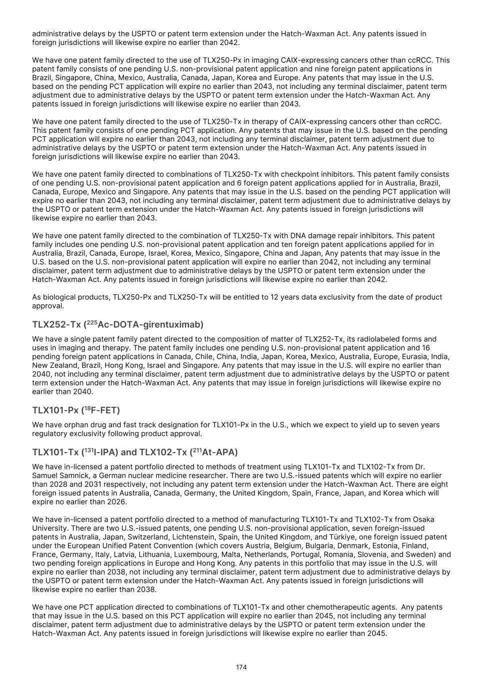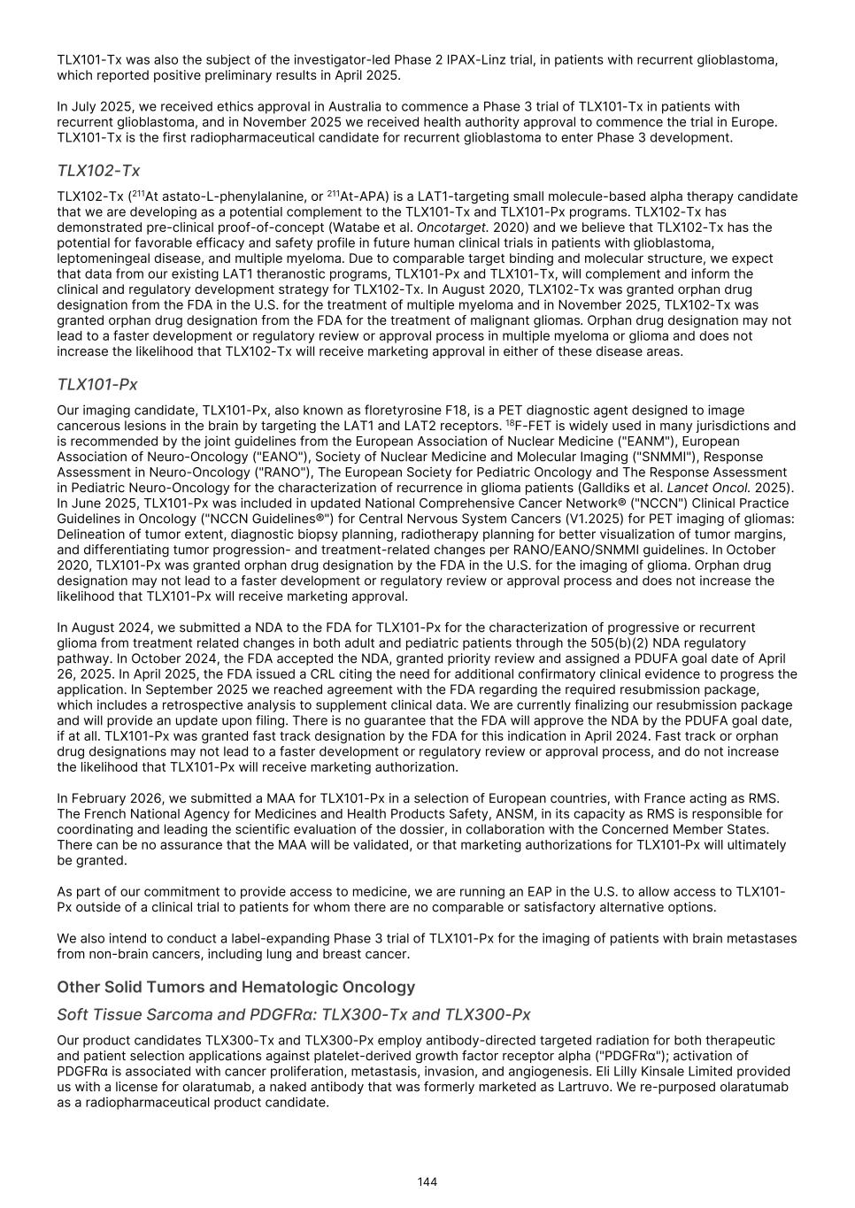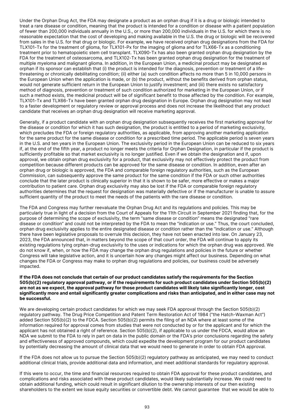 Under the Orphan Drug Act, the FDA may designate a product as an orphan drug if it is a drug or biologic intended to treat a rare disease or condition, meaning that the product is intended for a condition or disease with a patient population of fewer than 200,000 individuals annually in the U.S., or more than 200,000 individuals in the U.S. for which there is no reasonable expectation that the cost of developing and making available in the U.S. the drug or biologic will be recovered from sales in the U.S. for that drug or biologic. For example, we have received orphan drug designations from the FDA for TLX101-Tx for the treatment of glioma, for TLX101-Px for the imaging of glioma and for TLX66-Tx as a conditioning treatment prior to hematopoietic stem cell transplant. TLX090-Tx has also been granted orphan drug designation by the FDA for the treatment of osteosarcoma, and TLX102-Tx has been granted orphan drug designation for the treatment of multiple myeloma and malignant glioma. In addition, in the European Union, a medicinal product may be designated as orphan if its sponsor can establish that (i) the product is intended for the diagnosis, prevention or treatment of a life- threatening or chronically debilitating condition; (ii) either (a) such condition affects no more than 5 in 10,000 persons in the European Union when the application is made, or (b) the product, without the benefits derived from orphan status, would not generate sufficient return in the European Union to justify investment; and (iii) there exists no satisfactory method of diagnosis, prevention or treatment of such condition authorized for marketing in the European Union, or if such a method exists, the medicinal product will be of significant benefit to those affected by the condition. For example, TLX101-Tx and TLX66-Tx have been granted orphan drug designation in Europe. Orphan drug designation may not lead to a faster development or regulatory review or approval process and does not increase the likelihood that any product candidate that receives an orphan drug designation will receive marketing approval. Generally, if a product candidate with an orphan drug designation subsequently receives the first marketing approval for the disease or condition for which it has such designation, the product is entitled to a period of marketing exclusivity, which precludes the FDA or foreign regulatory authorities, as applicable, from approving another marketing application for the same product for the same disease or condition for a prescribed time period. The applicable period is seven years in the U.S. and ten years in the European Union. The exclusivity period in the European Union can be reduced to six years if, at the end of the fifth year, a product no longer meets the criteria for Orphan Designation, in particular if the product is sufficiently profitable so that market exclusivity is no longer justified. Even if we obtain the designation and if, upon approval, we obtain orphan drug exclusivity for a product, that exclusivity may not effectively protect the product from competition because different products can be approved for the same disease or condition. In addition, even after an orphan drug or biologic is approved, the FDA and comparable foreign regulatory authorities, such as the European Commission, can subsequently approve the same product for the same condition if the FDA or such other authorities conclude that the later product is clinically superior in that it is shown to be safer, more effective or makes a major contribution to patient care. Orphan drug exclusivity may also be lost if the FDA or comparable foreign regulatory authorities determines that the request for designation was materially defective or if the manufacturer is unable to assure sufficient quantity of the product to meet the needs of the patients with the rare disease or condition. The FDA and Congress may further reevaluate the Orphan Drug Act and its regulations and policies. This may be particularly true in light of a decision from the Court of Appeals for the 11th Circuit in September 2021 finding that, for the purpose of determining the scope of exclusivity, the term “same disease or condition” means the designated “rare disease or condition” and could not be interpreted by the FDA to mean the “indication or use.” Thus, the court concluded, orphan drug exclusivity applies to the entire designated disease or condition rather than the “indication or use.” Although there have been legislative proposals to overrule this decision, they have not been enacted into law. On January 23, 2023, the FDA announced that, in matters beyond the scope of that court order, the FDA will continue to apply its existing regulations tying orphan-drug exclusivity to the uses or indications for which the orphan drug was approved. We do not know if, when, or how the FDA may change the orphan drug regulations and policies in the future or whether Congress will take legislative action, and it is uncertain how any changes might affect our business. Depending on what changes the FDA or Congress may make to orphan drug regulations and policies, our business could be adversely impacted. If the FDA does not conclude that certain of our product candidates satisfy the requirements for the Section 505(b)(2) regulatory approval pathway, or if the requirements for such product candidates under Section 505(b)(2) are not as we expect, the approval pathway for those product candidates will likely take significantly longer, cost significantly more and entail significantly greater complications and risks than anticipated, and in either case may not be successful. We are developing certain product candidates for which we may seek FDA approval through the Section 505(b)(2) regulatory pathway. The Drug Price Competition and Patent Term Restoration Act of 1984 ("the Hatch-Waxman Act") added Section 505(b)(2) to the FDCA. Section 505(b)(2) permits the filing of an 