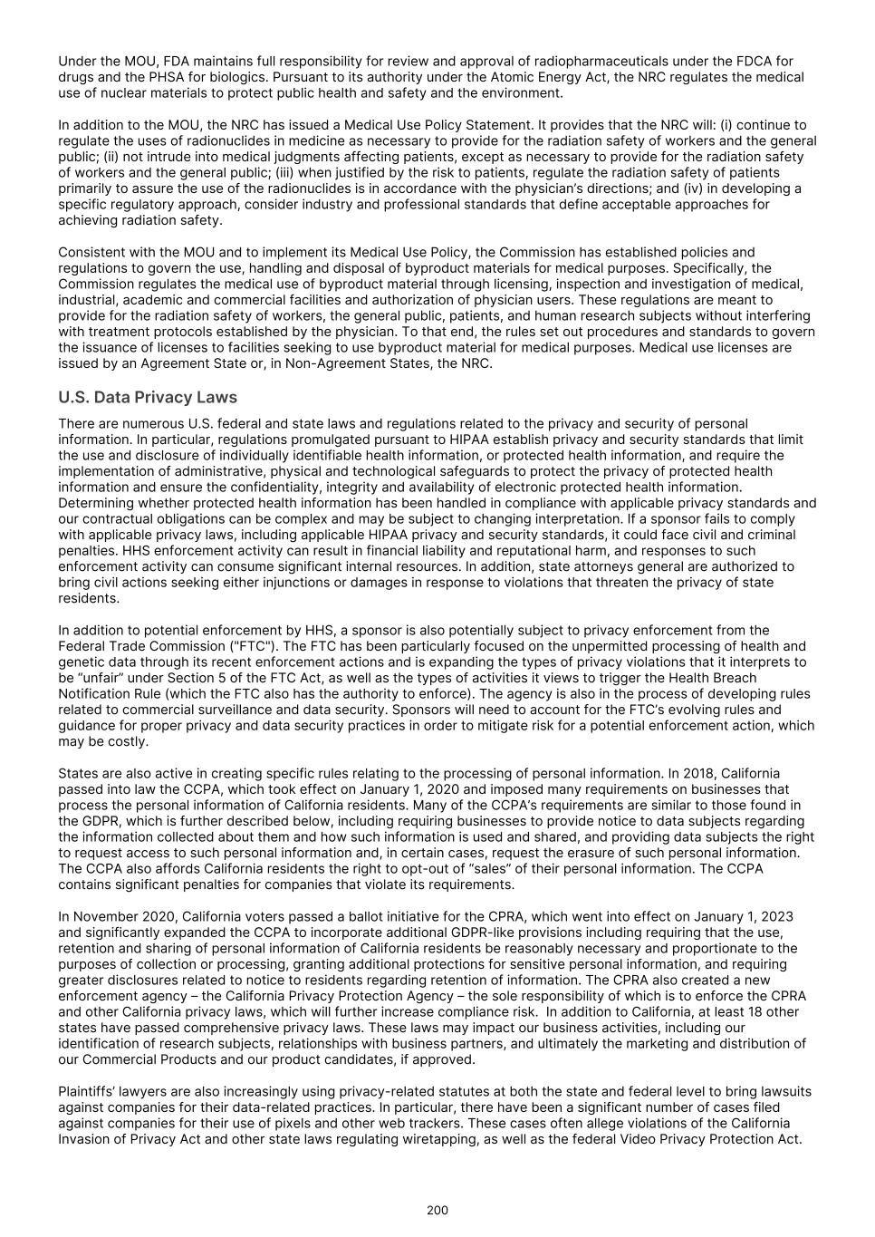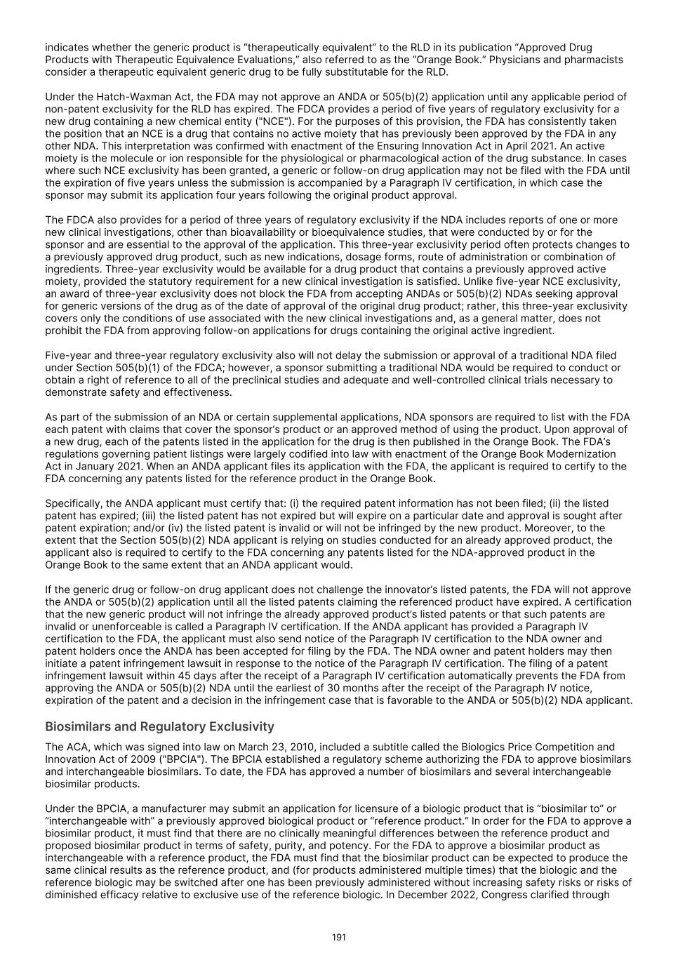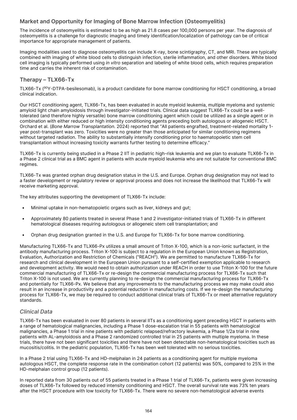Under the Orphan Drug Act, the FDA may designate a product as an orphan drug if it is a drug or biologic intended to treat a rare disease or condition, meaning that the product is intended for a condition or disease with a patient population of fewer than 200,000 individuals annually in the U.S., or more than 200,000 individuals in the U.S. for which there is no reasonable expectation that the cost of developing and making available in the U.S. the drug or biologic will be recovered from sales in the U.S. for that drug or biologic. For example, we have received orphan drug designations from the FDA for TLX101-Tx for the treatment of glioma, for TLX101-Px for the imaging of glioma and for TLX66-Tx as a conditioning treatment prior to hematopoietic stem cell transplant. TLX090-Tx has also been granted orphan drug designation by the FDA for the treatment of osteosarcoma, and TLX102-Tx has been granted orphan drug designation for the treatment of multiple myeloma and malignant glioma. In addition, in the European Union, a medicinal product may be designated as orphan if its sponsor can establish that (i) the product is intended for the diagnosis, prevention or treatment of a life- threatening or chronically debilitating condition; (ii) either (a) such condition affects no more than 5 in 10,000 persons in the European Union when the application is made, or (b) the product, without the benefits derived from orphan status, would not generate sufficient return in the European Union to justify investment; and (iii) there exists no satisfactory method of diagnosis, prevention or treatment of such condition authorized for marketing in the European Union, or if such a method exists, the medicinal product will be of significant benefit to those affected by the condition. For example, TLX101-Tx and TLX66-Tx have been granted orphan drug designation in Europe. Orphan drug designation may not lead to a faster development or regulatory review or approval process and does not increase the likelihood that any product candidate that receives an orphan drug designation will receive marketing approval. Generally, if a product candidate with an orphan drug designation subsequently receives the first marketing approval for the disease or condition for which it has such designation, the product is entitled to a period of marketing exclusivity, which precludes the FDA or foreign regulatory authorities, as applicable, from approving another marketing application for the same product for the same disease or condition for a prescribed time period. The applicable period is seven years in the U.S. and ten years in the European Union. The exclusivity period in the European Union can be reduced to six years if, at the end of the fifth year, a product no longer meets the criteria for Orphan Designation, in particular if the product is sufficiently profitable so that market exclusivity is no longer justified. Even if we obtain the designation and if, upon approval, we obtain orphan drug exclusivity for a product, that exclusivity may not effectively protect the product from competition because different products can be approved for the same disease or condition. In addition, even after an orphan drug or biologic is approved, the FDA and comparable foreign regulatory authorities, such as the European Commission, can subsequently approve the same product for the same condition if the FDA or such other authorities conclude that the later product is clinically superior in that it is shown to be safer, more effective or makes a major contribution to patient care. Orphan drug exclusivity may also be lost if the FDA or comparable foreign regulatory authorities determines that the request for designation was materially defective or if the manufacturer is unable to assure sufficient quantity of the product to meet the needs of the patients with the rare disease or condition. The FDA and Congress may further reevaluate the Orphan Drug Act and its regulations and policies. This may be particularly true in light of a decision from the Court of Appeals for the 11th Circuit in September 2021 finding that, for the purpose of determining the scope of exclusivity, the term “same disease or condition” means the designated “rare disease or condition” and could not be interpreted by the FDA to mean the “indication or use.” Thus, the court concluded, orphan drug exclusivity applies to the entire designated disease or condition rather than the “indication or use.” Although there have been legislative proposals to overrule this decision, they have not been enacted into law. On January 23, 2023, the FDA announced that, in matters beyond the scope of that court order, the FDA will continue to apply its existing regulations tying orphan-drug exclusivity to the uses or indications for which the orphan drug was approved. We do not know if, when, or how the FDA may change the orphan drug regulations and policies in the future or whether Congress will take legislative action, and it is uncertain how any changes might affect our business. Depending on what changes the FDA or Congress may make to orphan drug regulations and policies, our business could be adversely impacted. If the FDA does not conclude that certain of our product candidates satisfy the requirements for the Section 505(b)(2) regulatory approval pathway, or if the requirements for such product candidates under Section 505(b)(2) are not as we expect, the approval pathway for those product candidates will likely take significantly longer, cost significantly more and entail significantly greater complications and risks than anticipated, and in either case may not be successful. We are developing certain product candidates for which we may seek FDA approval through the Section 505(b)(2) regulatory pathway. The Drug Price Competition and Patent Term Restoration Act of 1984 ("the Hatch-Waxman Act") added Section 505(b)(2) to the FDCA. Section 505(b)(2) permits the filing of an 