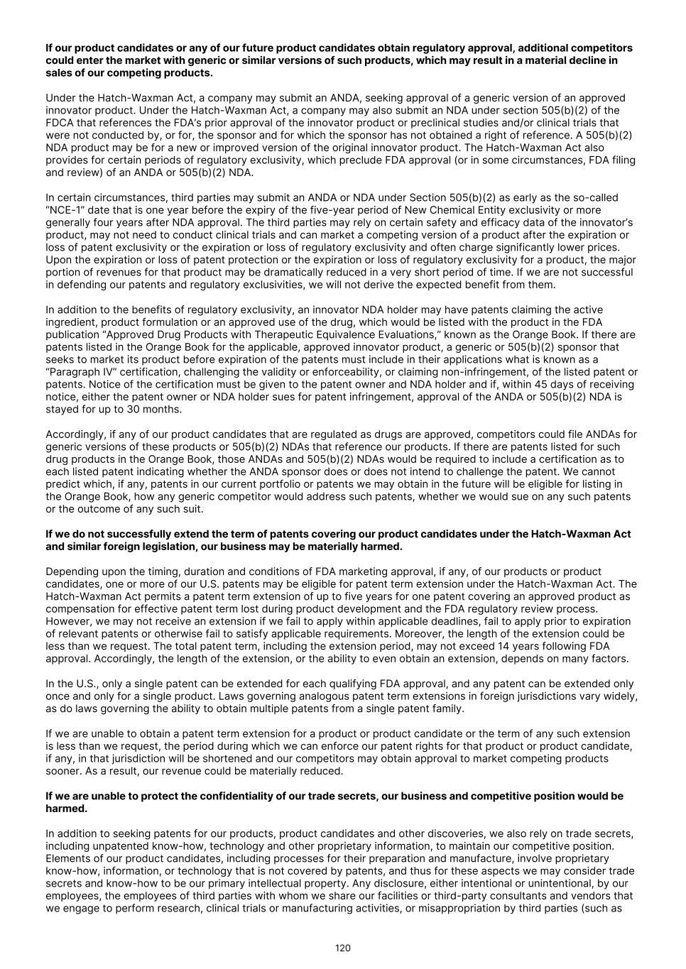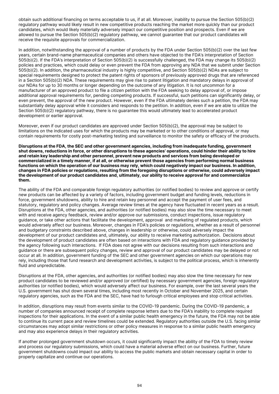 obtain such additional financing on terms acceptable to us, if at all. Moreover, inability to pursue the Section 505(b)(2) regulatory pathway would likely result in new competitive products reaching the market more quickly than our product candidates, which would likely materially adversely impact our competitive position and prospects. Even if we are allowed to pursue the Section 505(b)(2) regulatory pathway, we cannot guarantee that our product candidates will receive the requisite approvals for commercialization. In addition, notwithstanding the approval of a number of products by the FDA under Section 505(b)(2) over the last few years, certain brand-name pharmaceutical companies and others have objected to the FDA’s interpretation of Section 505(b)(2). If the FDA’s interpretation of Section 505(b)(2) is successfully challenged, the FDA may change its 505(b)(2) policies and practices, which could delay or even prevent the FDA from approving any NDA that we submit under Section 505(b)(2). In addition, the pharmaceutical industry is highly competitive, and Section 505(b)(2) NDAs are subject to special requirements designed to protect the patent rights of sponsors of previously approved drugs that are referenced in a Section 505(b)(2) NDA. These requirements may give rise to patent litigation and mandatory delays in approval of our NDAs for up to 30 months or longer depending on the outcome of any litigation. It is not uncommon for a manufacturer of an approved product to file a citizen petition with the FDA seeking to delay approval of, or impose additional approval requirements for, pending competing products. If successful, such petitions can significantly delay, or even prevent, the approval of the new product. However, even if the FDA ultimately denies such a petition, the FDA may substantially delay approval while it considers and responds to the petition. In addition, even if we are able to utilize the Section 505(b)(2) regulatory pathway, there is no guarantee this would ultimately lead to accelerated product development or earlier approval. Moreover, even if our product candidates are approved under Section 505(b)(2), the approval may be subject to limitations on the indicated uses for which the products may be marketed or to other conditions of approval, or may contain requirements for costly post-marketing testing and surveillance to monitor the safety or efficacy of the products. Disruptions at the FDA, the SEC and other government agencies, including from inadequate funding, government shut downs, reductions in force, or other disruptions to these agencies’ operations, could hinder their ability to hire and retain key leadership and other personnel, prevent new products and services from being developed or commercialized in a timely manner, if at all, or otherwise prevent those agencies from performing normal business functions on which the operation of our business may rely, which could negatively impact our business. In addition, changes in FDA policies or regulations, resulting from the foregoing disruptions or otherwise, could adversely impact the development of our product candidates and, ultimately, our ability to receive approval for and commercialize them. The ability of the FDA and comparable foreign regulatory authorities (or notified bodies) to review and approve or certify new products can be affected by a variety of factors, including government budget and funding levels, reductions in force, government shutdowns, ability to hire and retain key personnel and accept the payment of user fees, and statutory, regulatory and policy changes. Average review times at the agency have fluctuated in recent years as a result. Disruptions at the FDA, other agencies, and authorities (or notified bodies) may also slow the time necessary to meet with and receive agency feedback, review and/or approve our submissions, conduct inspections, issue regulatory guidance, or take other actions that facilitate the development, approval and marketing of regulated products, which would adversely affect our business. Moreover, changes in FDA’s policies or regulations, whether as a result of personnel and budgetary constraints described above, changes in leadership or otherwise, could adversely impact the development of our product candidates and, ultimately, our ability to receive marketing authorization. Decisions about the development of product candidates are often based on interactions with FDA and regulatory guidance provided by the agency following such interactions. If FDA does not agree with our decisions resulting from such interactions and guidance or there are subsequent policy changes, review and approval of our product candidates may be delayed or not occur at all. In addition, government funding of the SEC and other government agencies on which our operations may rely, including those that fund research and development activities, is subject to the political process, which is inherently fluid and unpredictable. Disruptions at the FDA, other agencies, and authorities (or notified bodies) may also slow the time necessary for new product candidates to be reviewed and/or approved (or certified) by necessary government agencies, foreign regulatory authorities (or notified bodies), which would adversely affect our business. For example, over the last several years the U.S. government has shut down several times, including most recently in October and November 2025, and certain regulatory agencies, such as the FDA and the SEC, have had to furlough critical employees and stop critical activities. In addition, disruptions may result from events similar to the COVID-19 pandemic. During the COVID-19 pandemic, a number of companies announced receipt of complete response letters due to the FDA’s inability to complete required inspections for their applications. In the event of a similar public health emergency in the future, the FDA may not be able to continue its current pace a